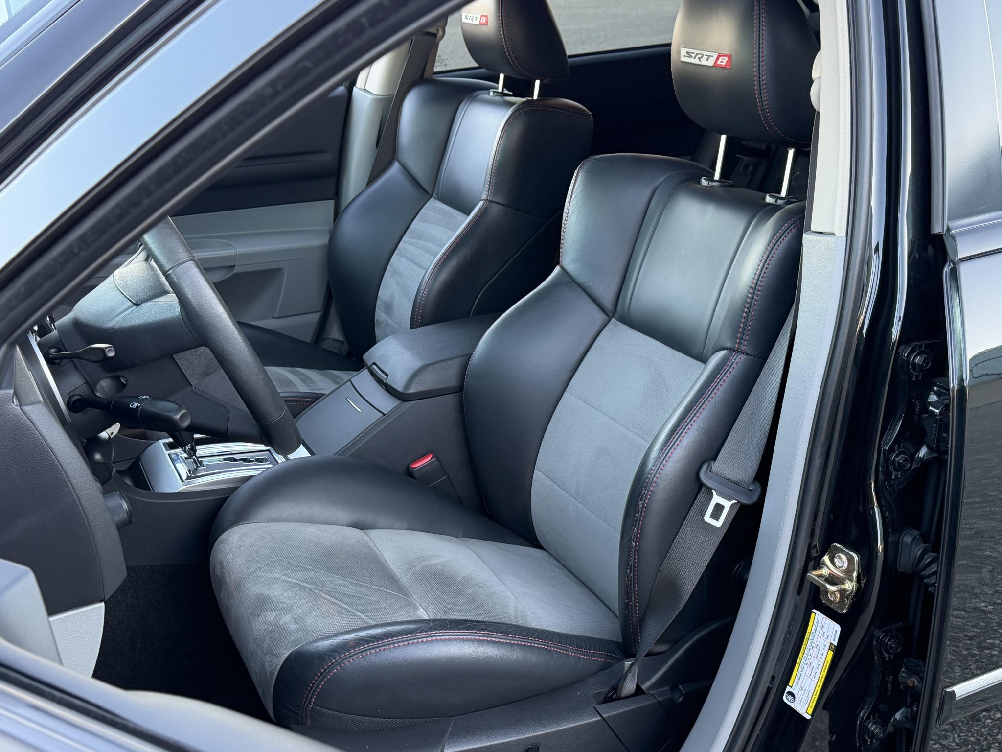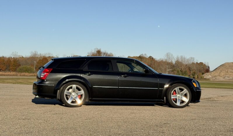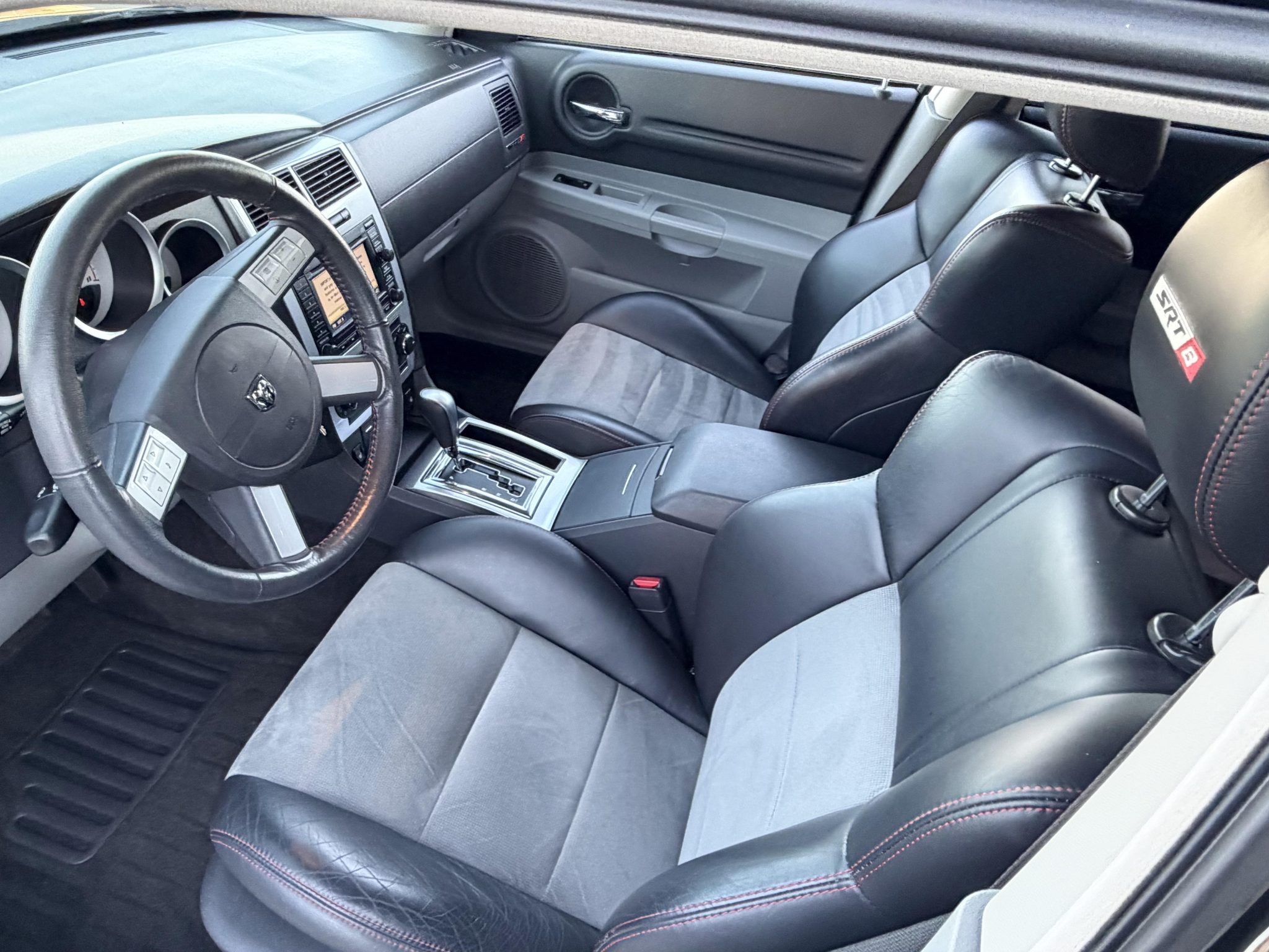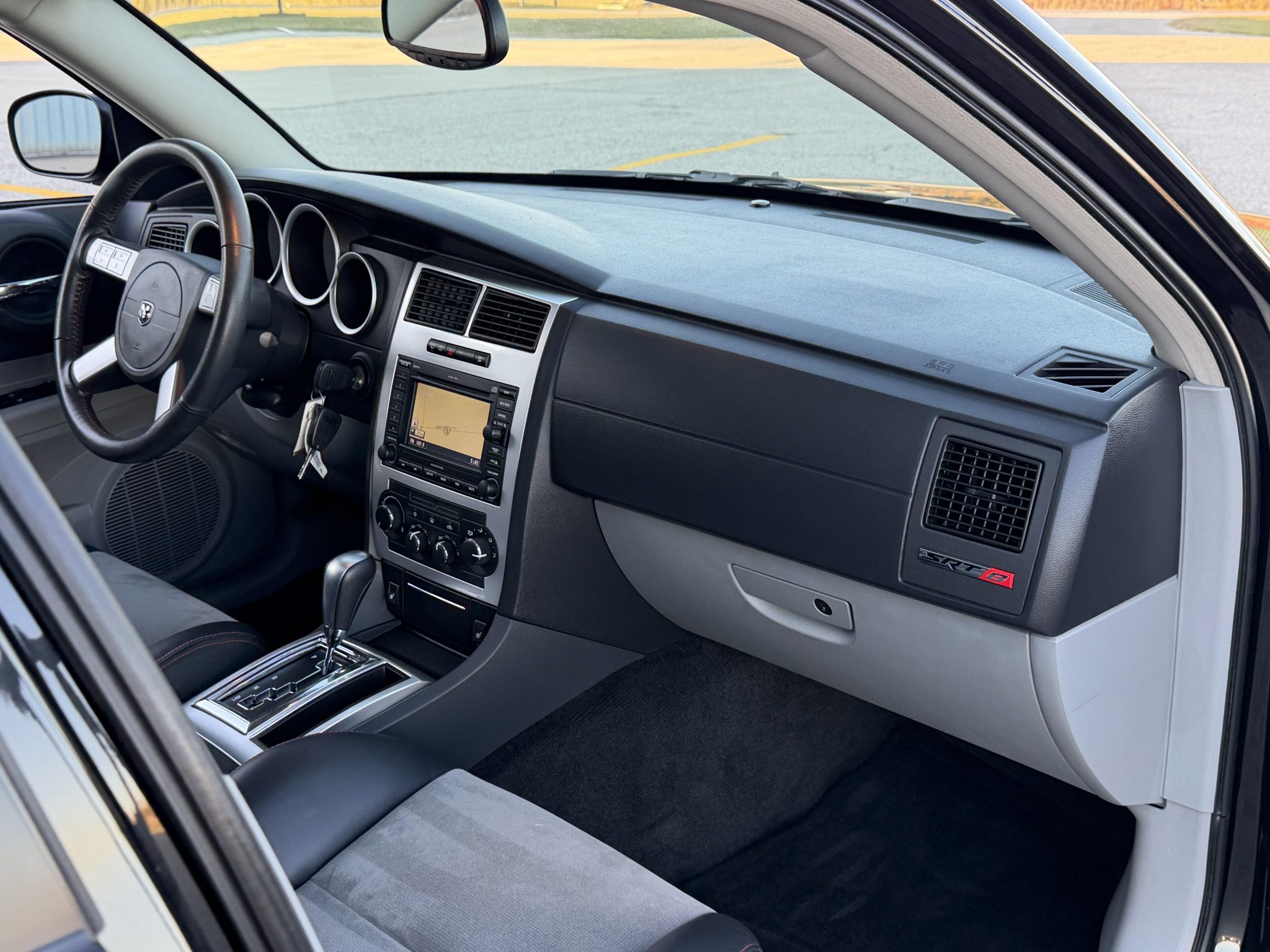 Indicating 15k miles, the car is powered by a 6.1-liter Hemi V8 linked with a five-speed automatic transmission and a limited-slip differential, and it is finished in Brilliant Black Crystal Pearl over Dark Slate Gray leather and microsuede. Equipment includes the SRT Option Group III, a sunroof, 20″ five-spoke alloy wheels, heated power-adjustable front seats, a navigation system, and dual-zone automatic climate control.