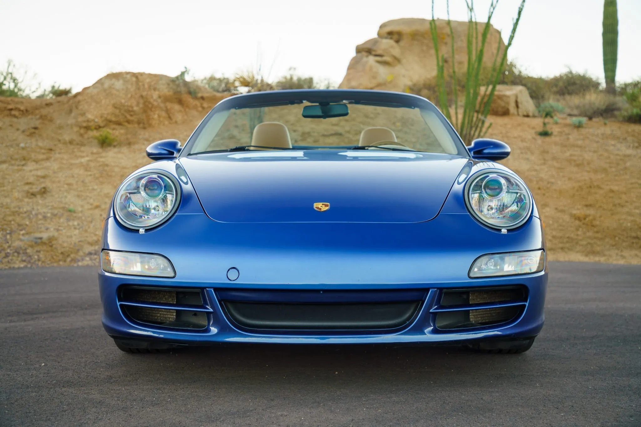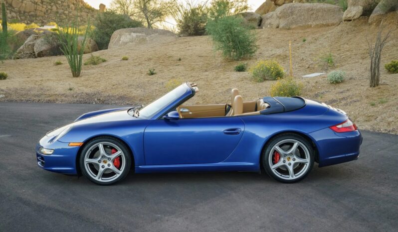 This 2006 Porsche 911 Carrera S cabriolet is finished in Cobalt Blue Metallic over Sand Beige leather upholstery and is powered by a 3.8-liter flat-six paired with a six-speed manual transaxle. Equipment includes a blue soft top, 19″ Carrera Classic wheels, a deployable rear spoiler, bi-xenon headlights, and Porsche Communication Management with navigation, as well as heated power-adjustable front seats, a Bose sound system, automatic climate control, and cruise control.