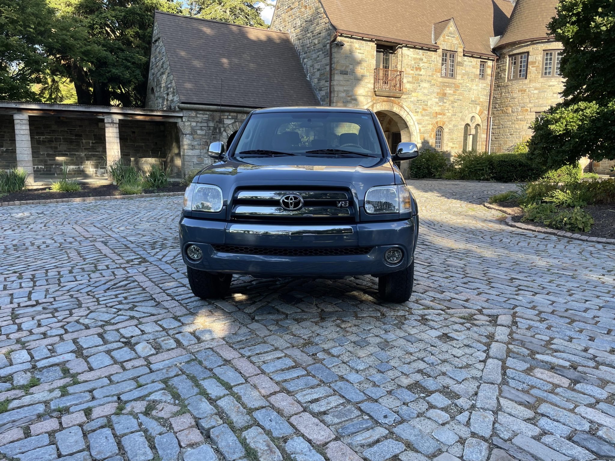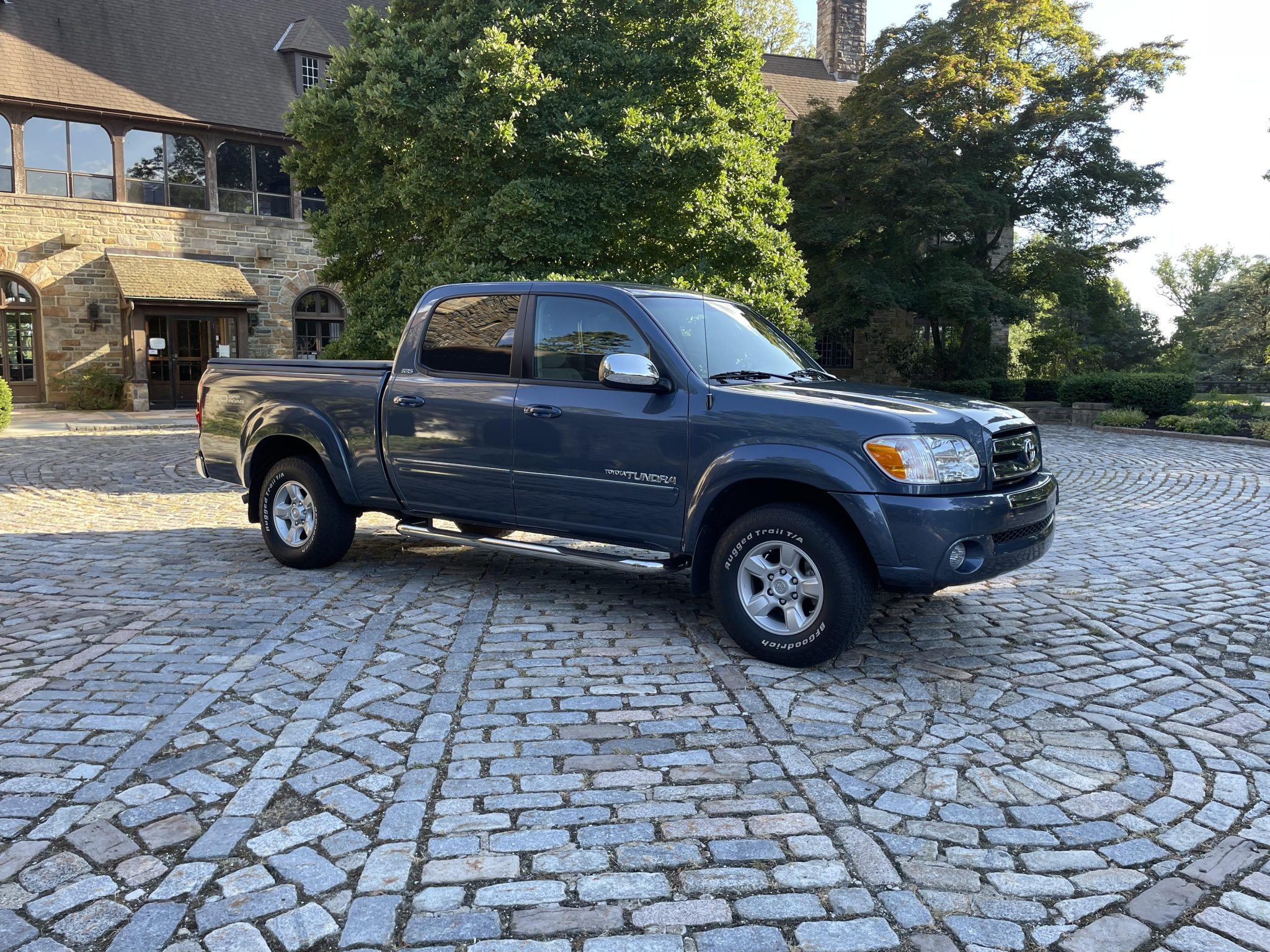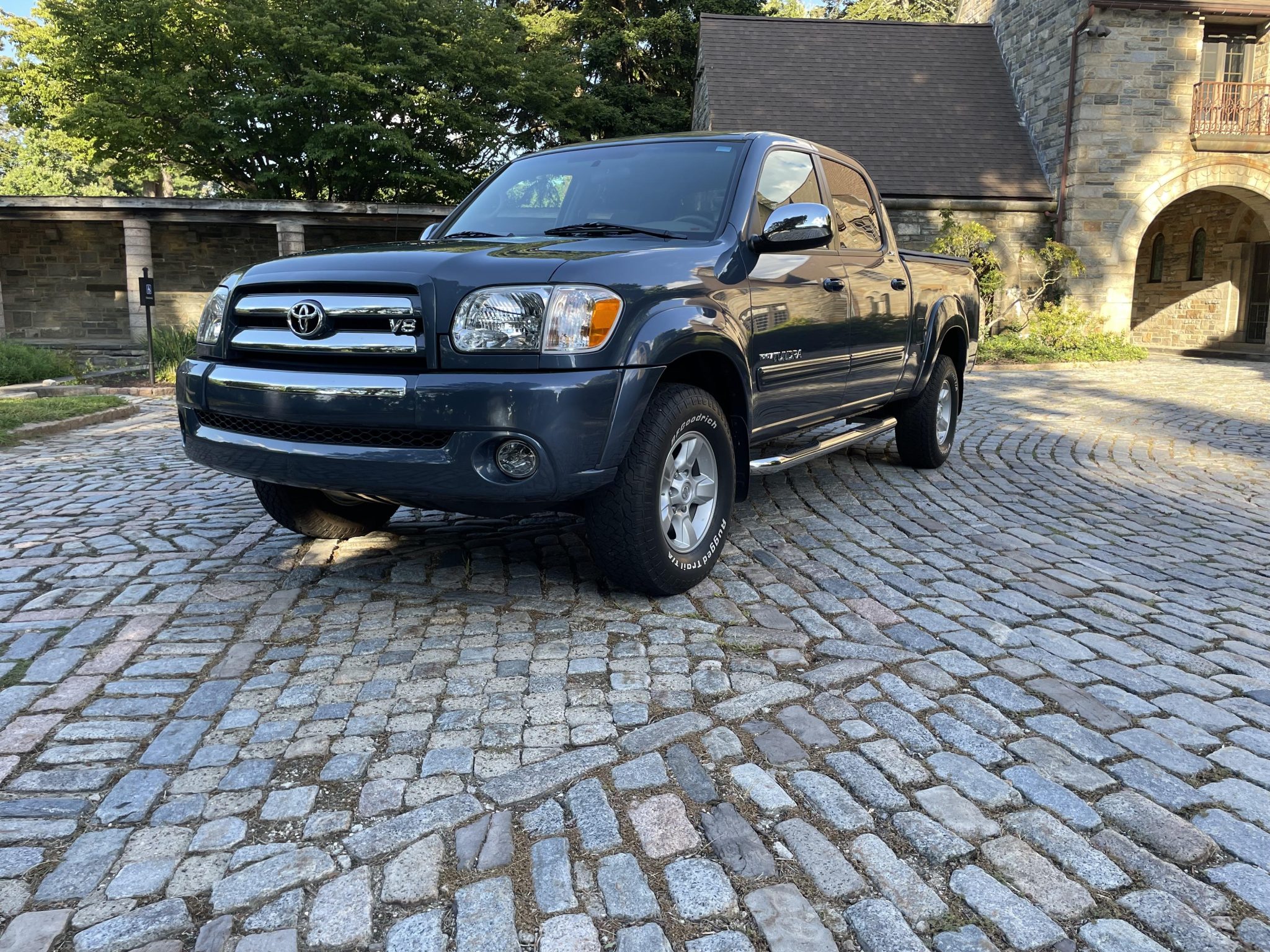 This 2006 Toyota Tundra SR5 TRD is a Double Cab pickup that is finished in Bluesteel Mica over taupe fabric and powered by a 4.7-liter V8 linked to a five-speed automatic transmission and an electronically shifted dual-range transfer case. Factory equipment includes the SR5 and TRD Off-Road packages as well as a CD stereo, cruise control, air conditioning, and power windows and locks.