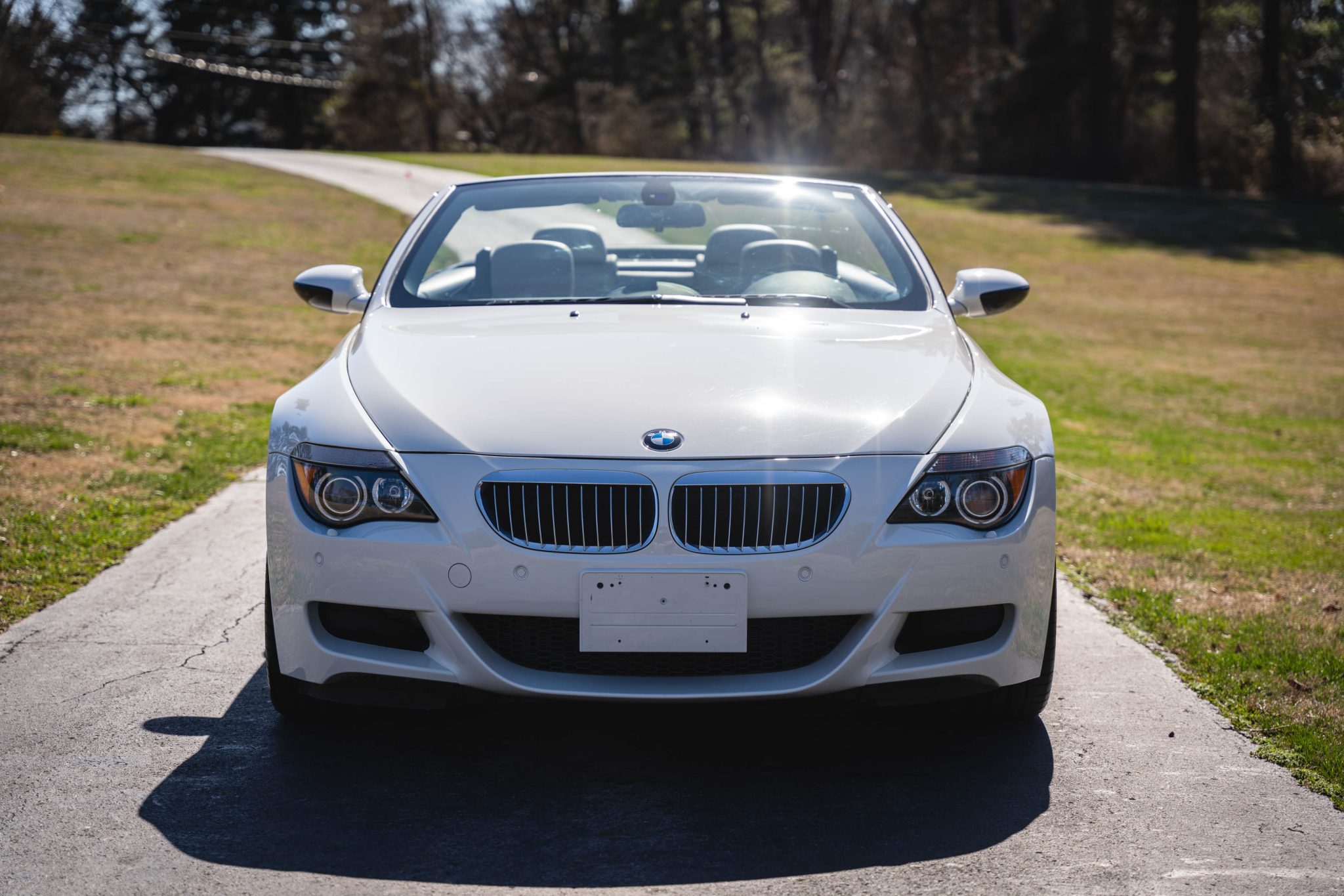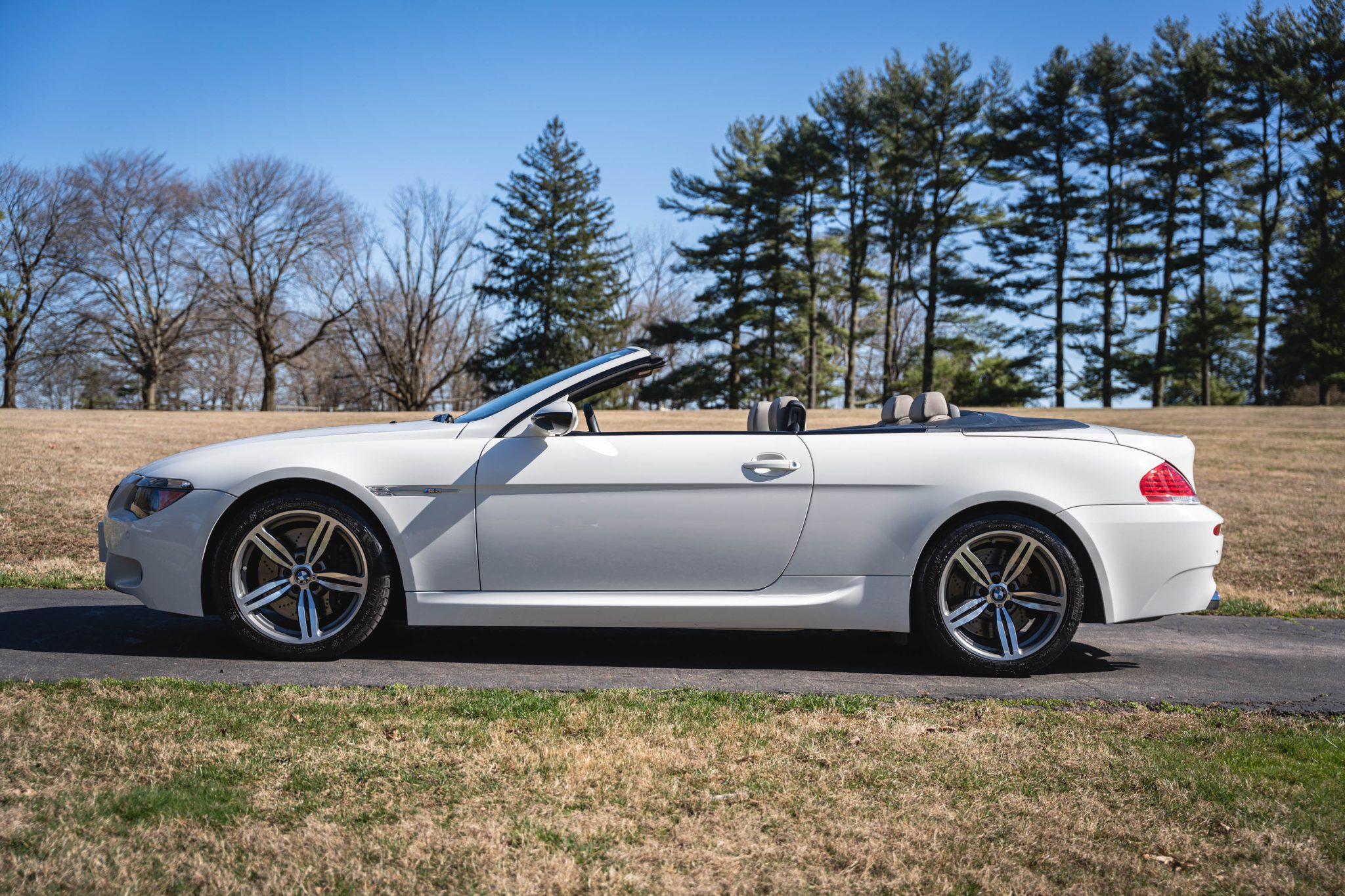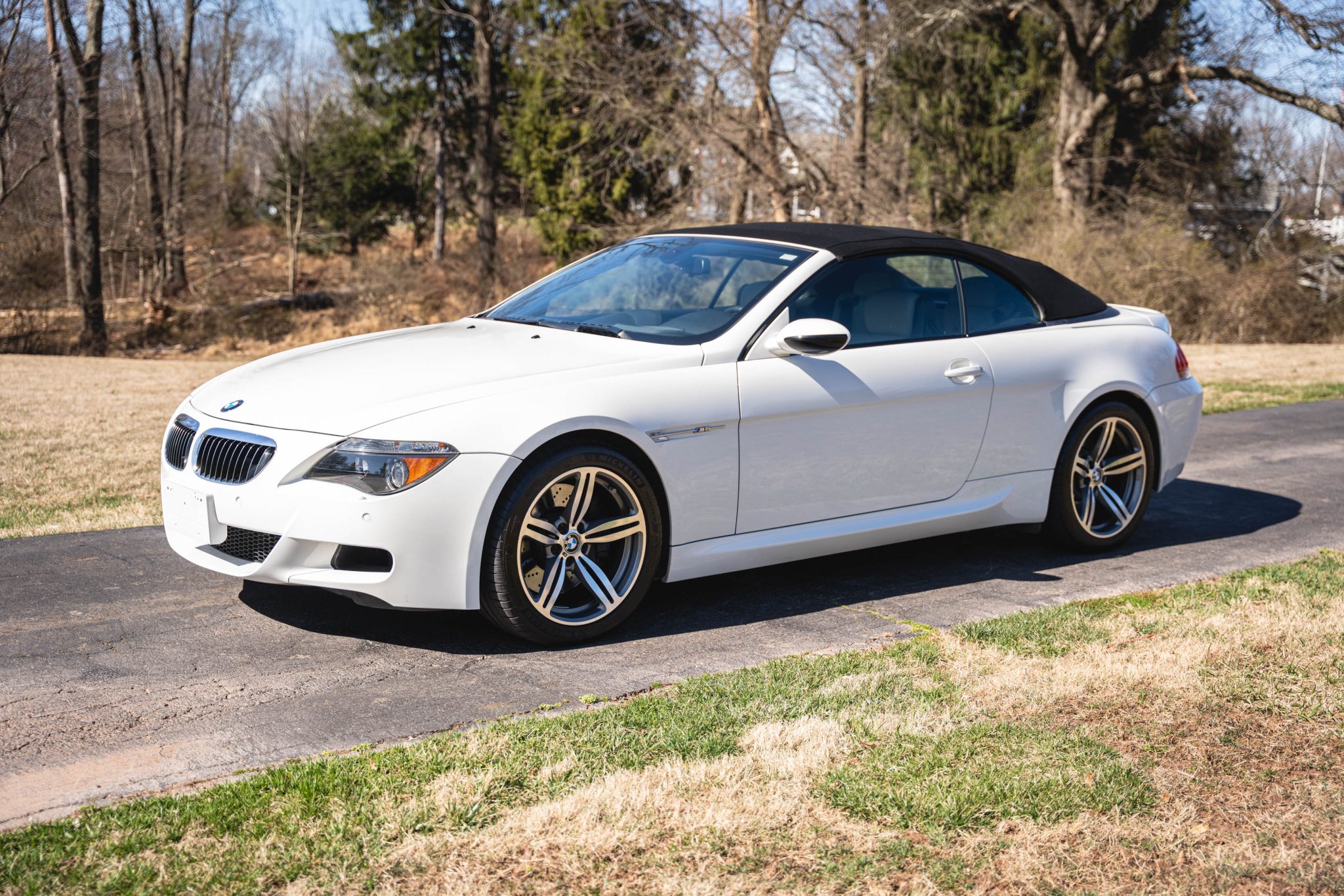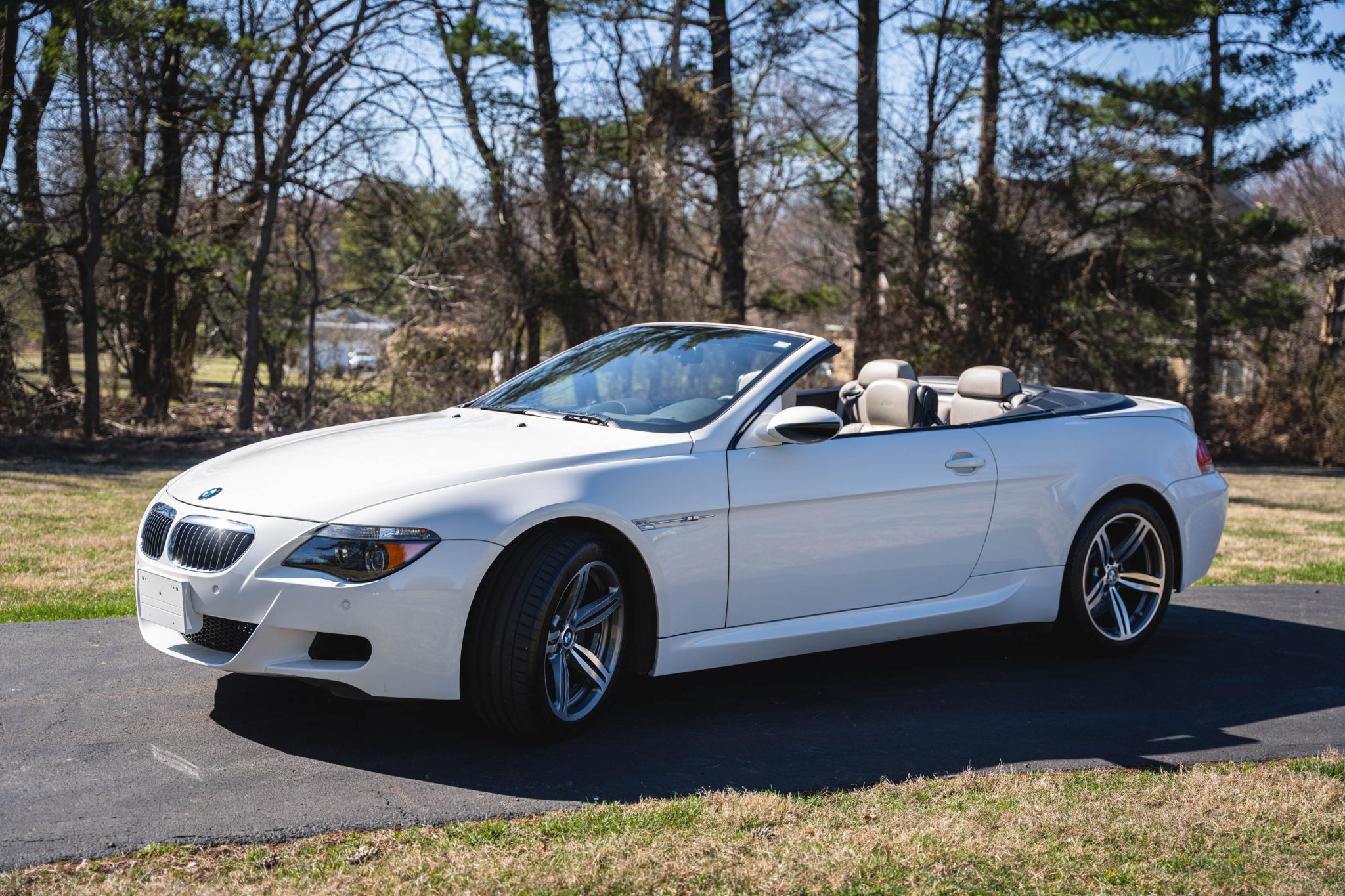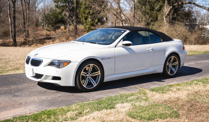 Finished in Alpine White over Sepang Merino leather, the car is powered by a 5.0-liter V10 paired with a six-speed manual transmission. Equipment includes a black convertible soft top, 19″ Style 167M alloy wheels, Dynamic Stability Control with M Dynamic Mode, Park Distance Control, xenon headlights, heated power-adjustable front seats, Comfort Access, a head-up display, iDrive with navigation, dual-zone automatic climate control, and cruise control.