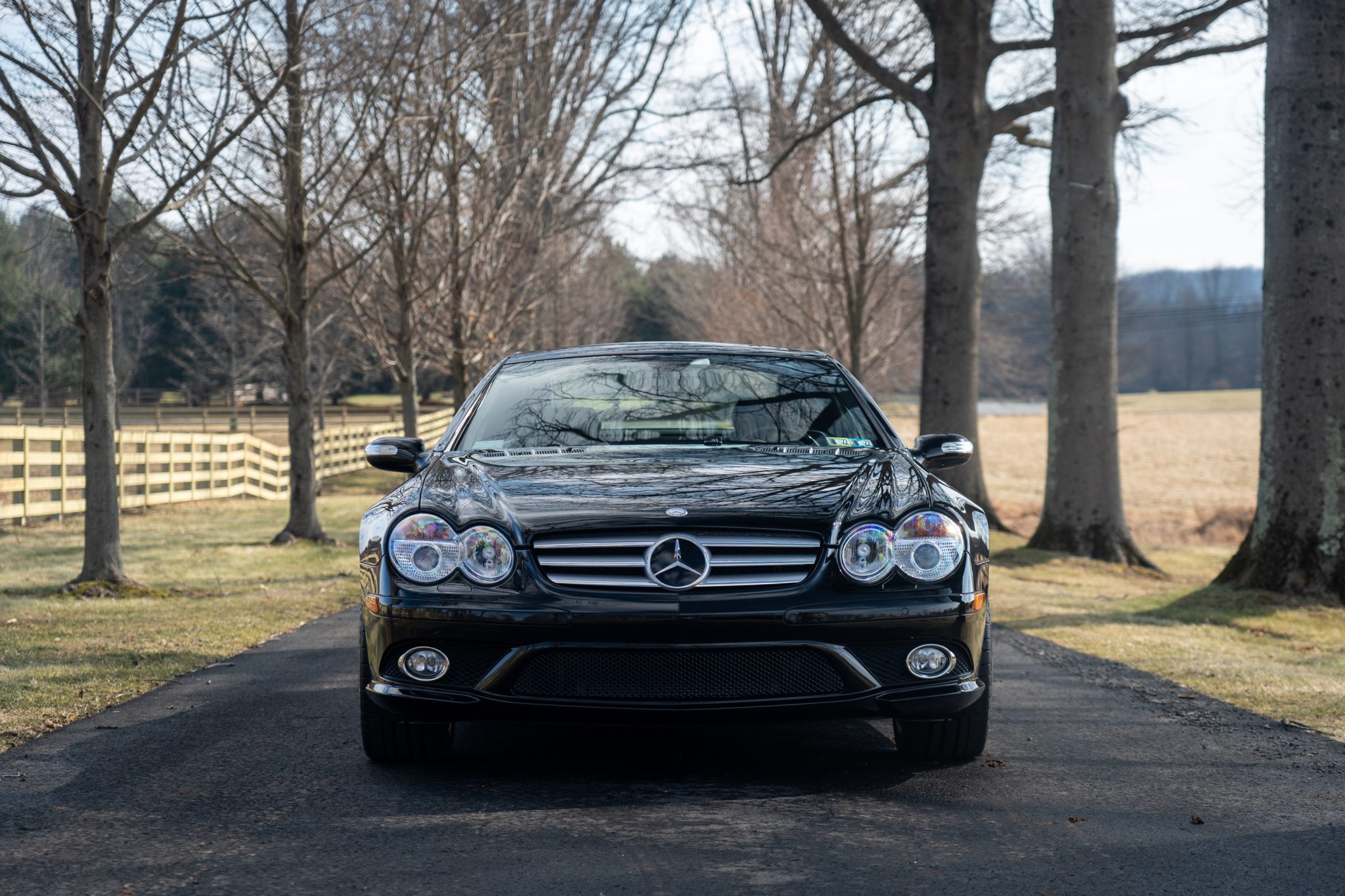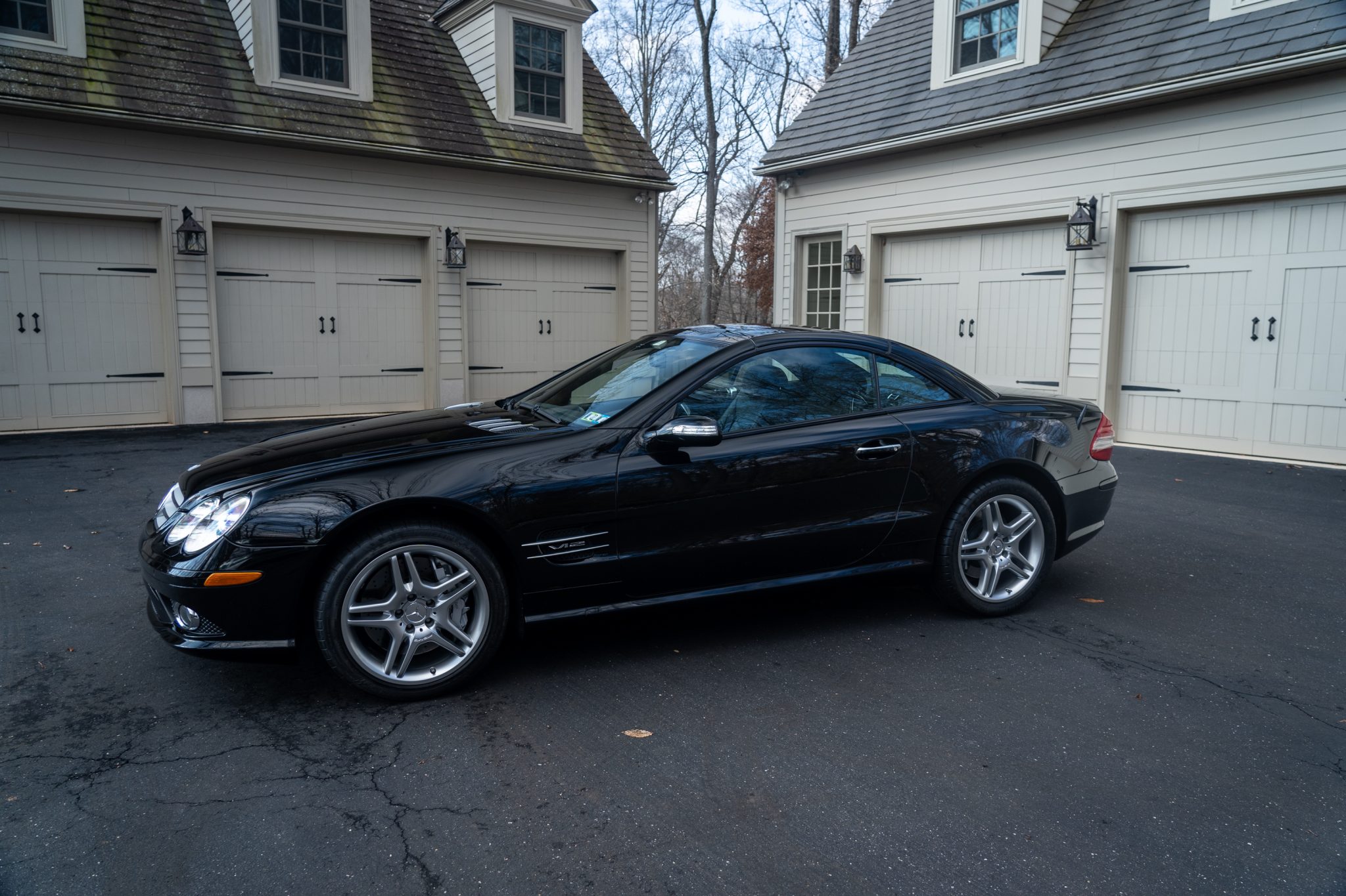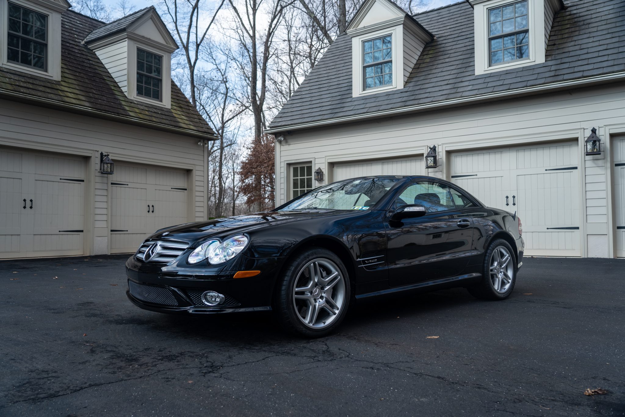 This 2007 Mercedes-Benz SL600 is finished in black over matching Exclusive Nappa leather and special-order black ash wood trim, and it is powered by a twin-turbocharged 5.5-liter V12 paired with a five-speed automatic transmission. Optional equipment includes the AMG Sport Package as well as Distronic cruise control, Parktronic, Voice Control, and a panoramic glass roof with a sunshade. The car was purchased new by the current owner at Keenan Motors in Doylestown, Pennsylvania, and it now has 34k miles.