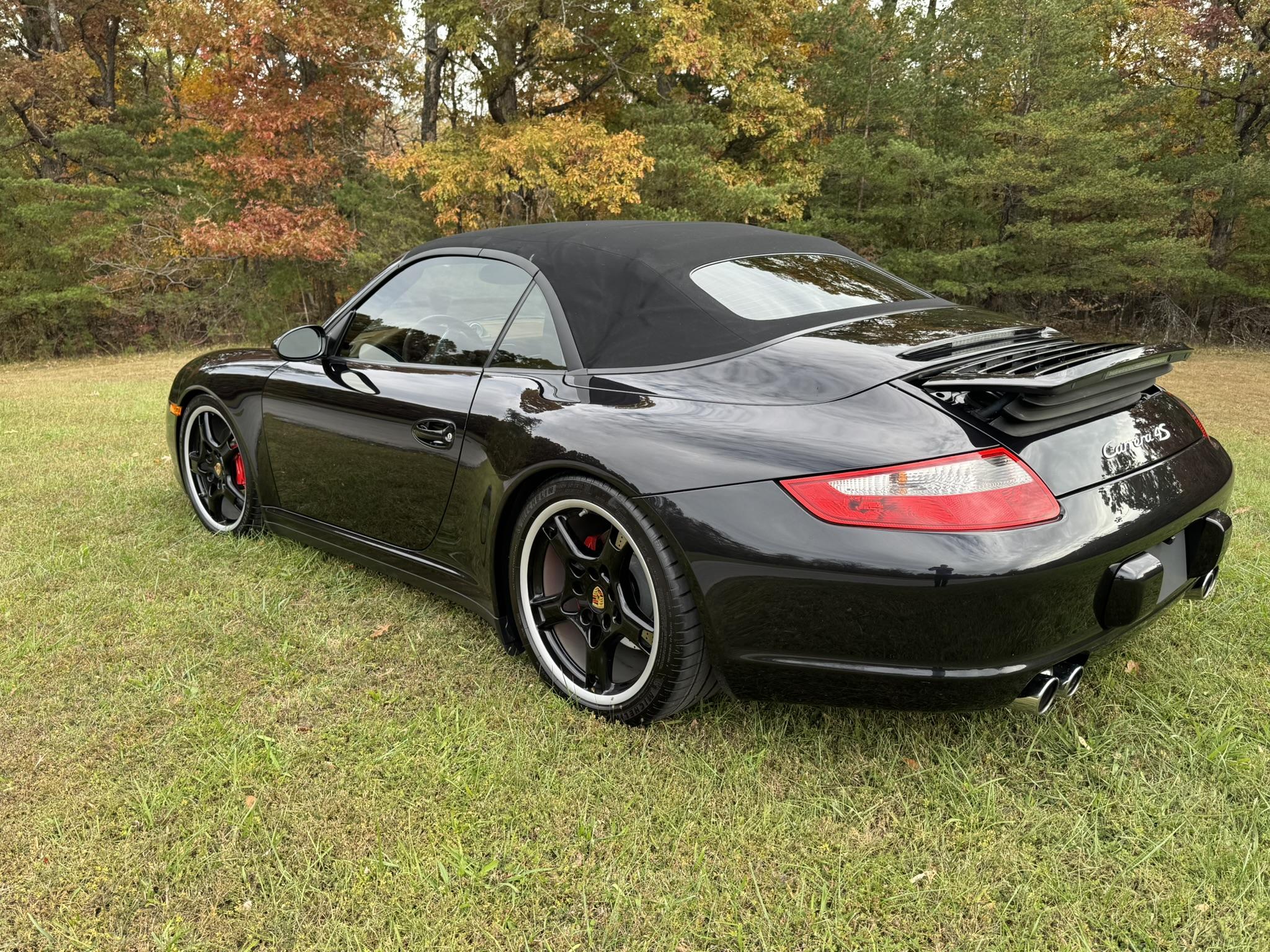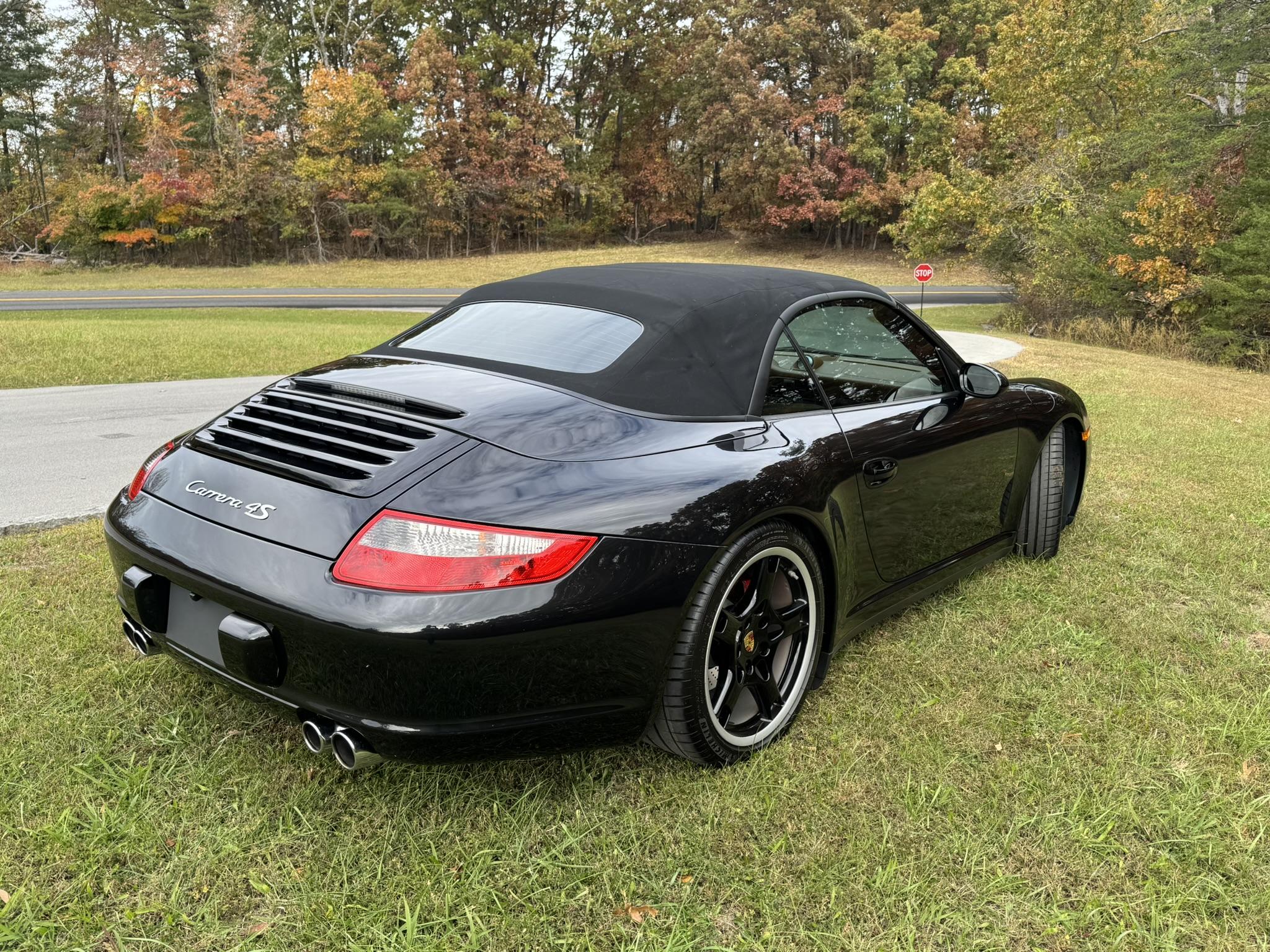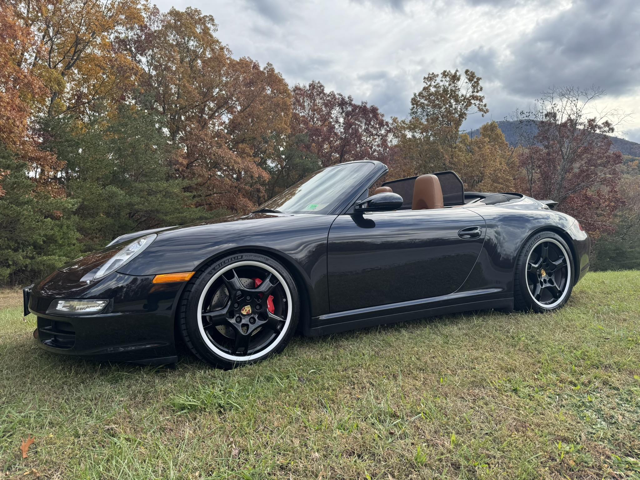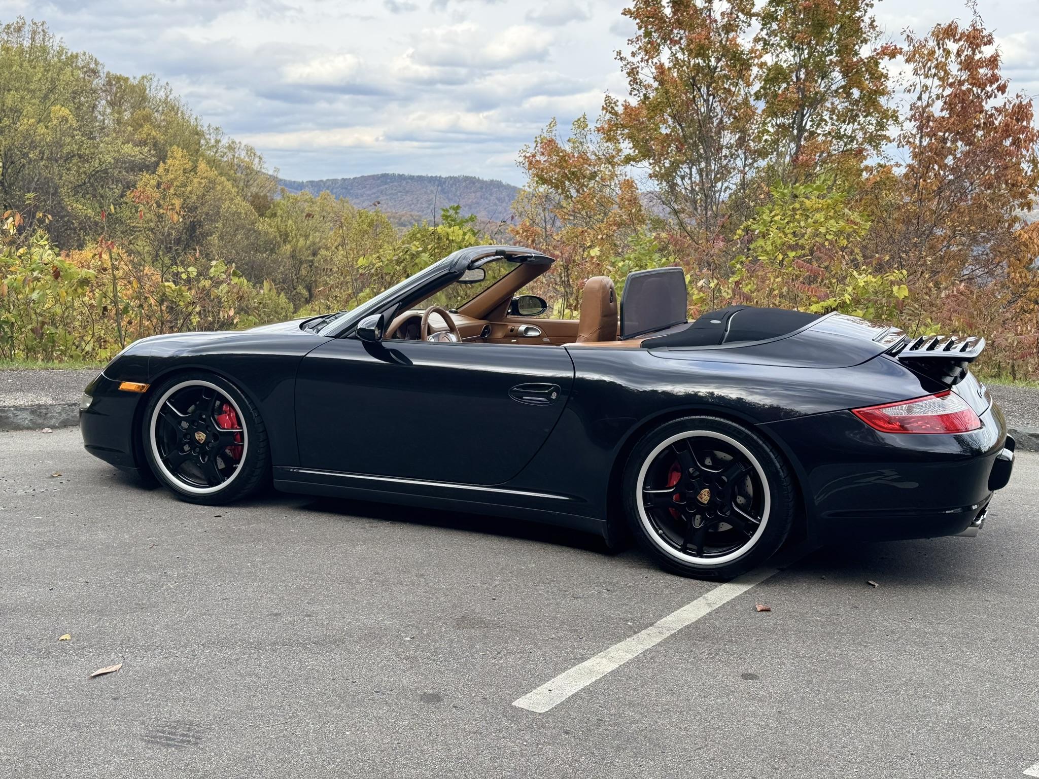 This 2008 Porsche 911 Carrera 4S cabriolet is finished in Basalt Black Metallic over Natural Brown Supple leather and is powered by a 3.8-liter flat-six that drives all four wheels through a six-speed manual transaxle. Equipment includes the Sport Chrono Plus, Bose High-End Sound, and Power Seat packages as well as H&R lowering springs, 19″ Carrera S wheels, PASM dampers, a Black soft top, heated front seats, and an Alpine touchscreen infotainment system with front and rear cameras. This 997.1 C4S cabriolet