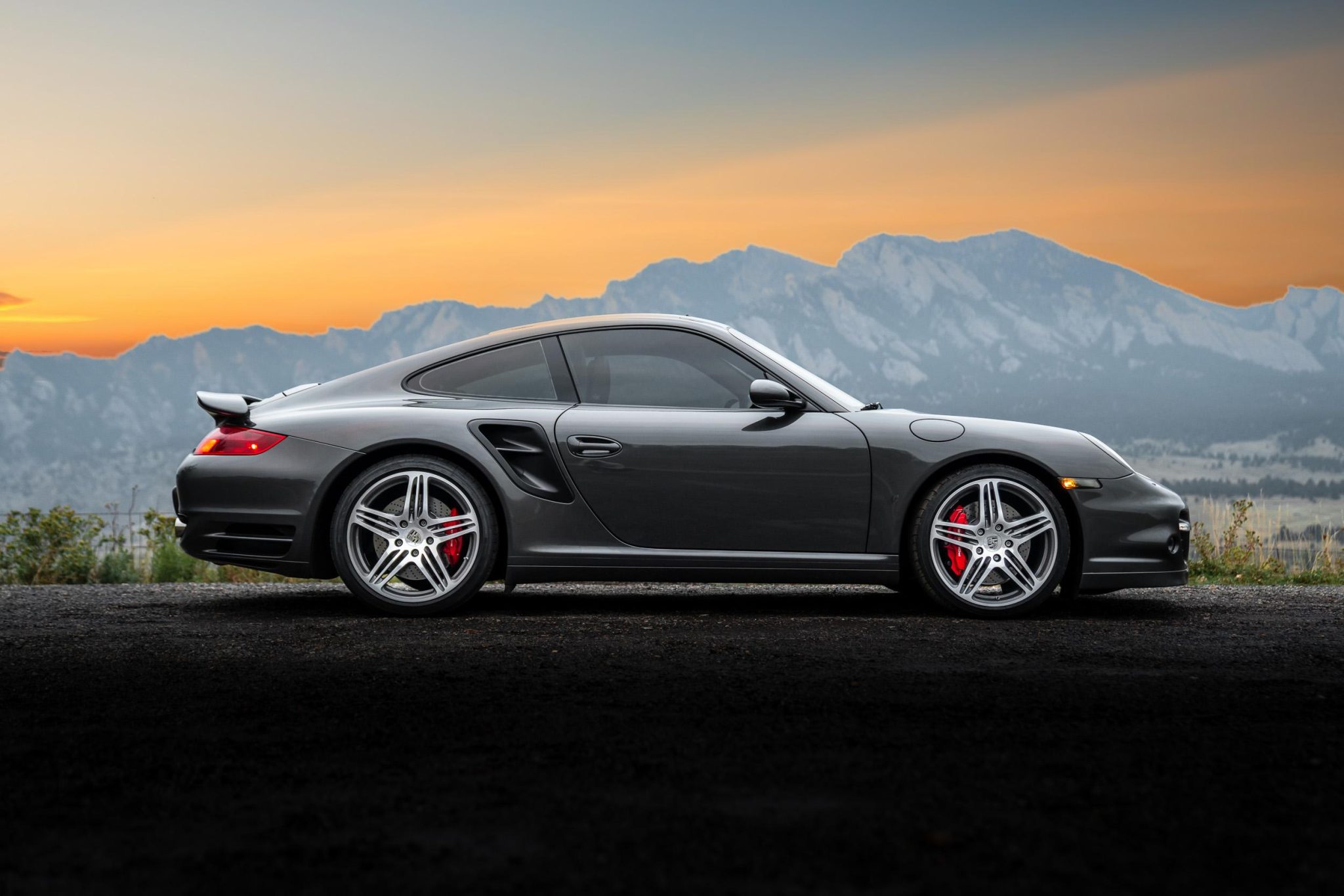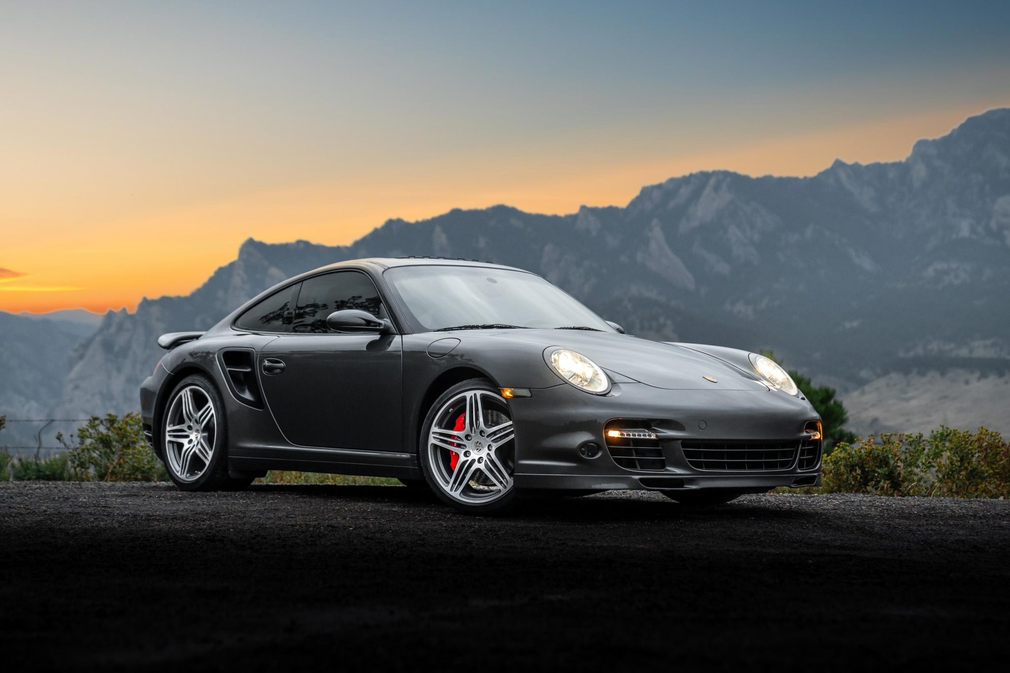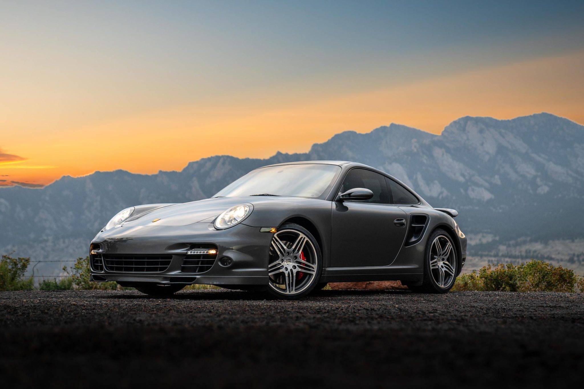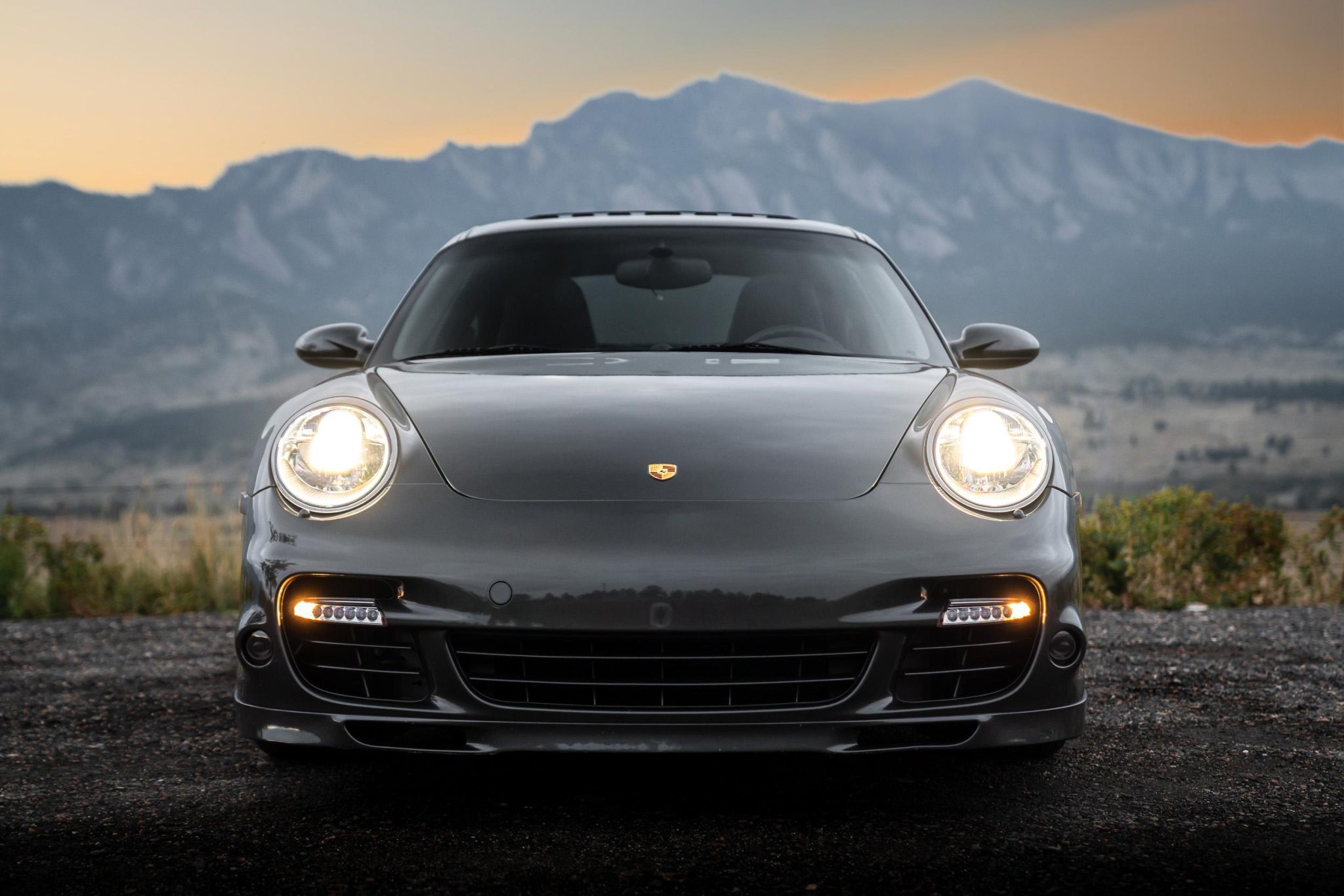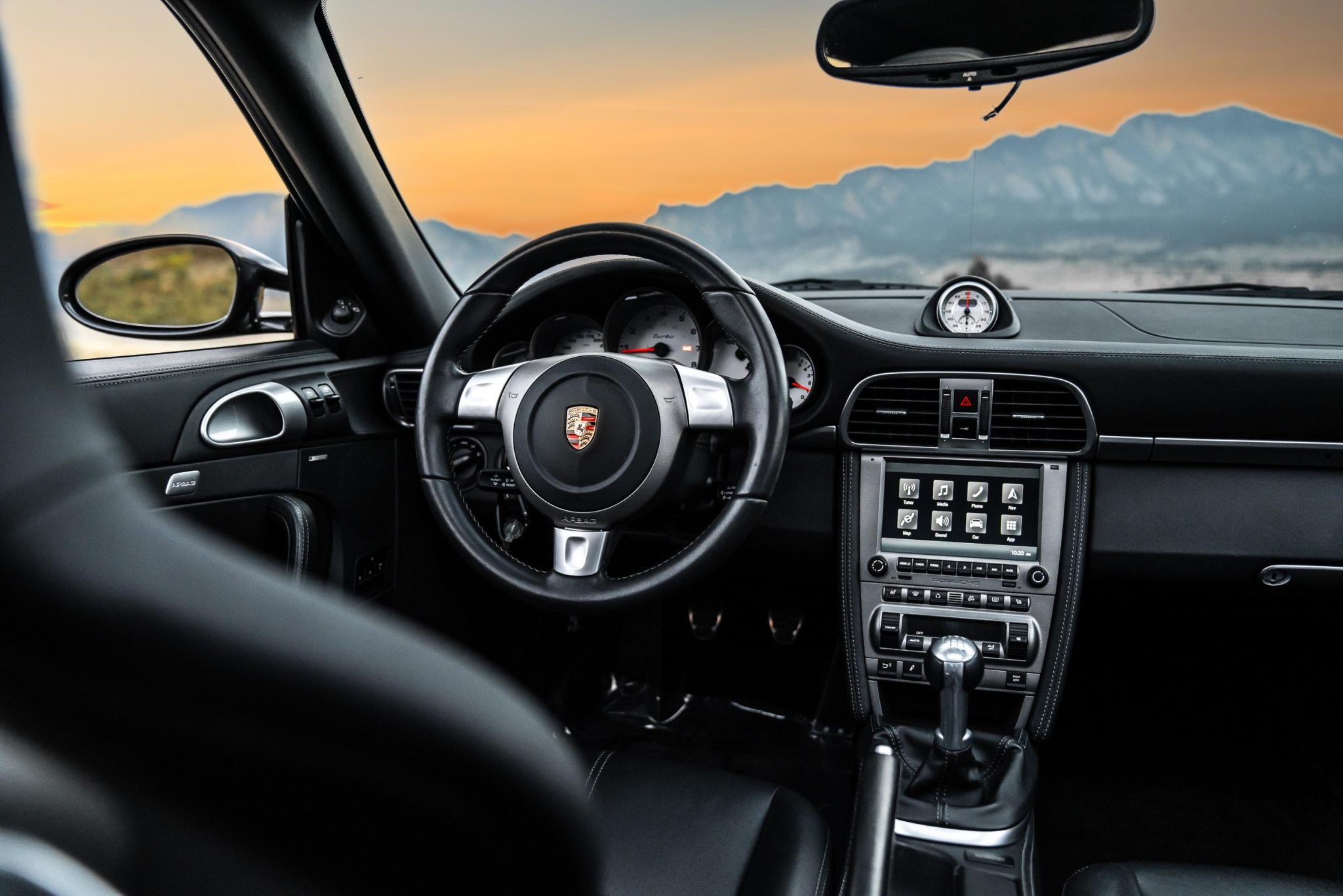 It is finished in Slate Gray Metallic over black leather and is powered by a twin-turbocharged 3.6L flat-six that drives all four wheels via a six-speed manual transaxle. Features include the Sport Chrono Package, 19” Turbo wheels, an aftermarket cat-back exhaust system, bi-xenon headlights, a power sunroof, heated power-adjustable front sport seats, a Bose sound system, automatic climate control, cruise control, and Porsche Communication Management with navigation and Bluetooth connectivity.