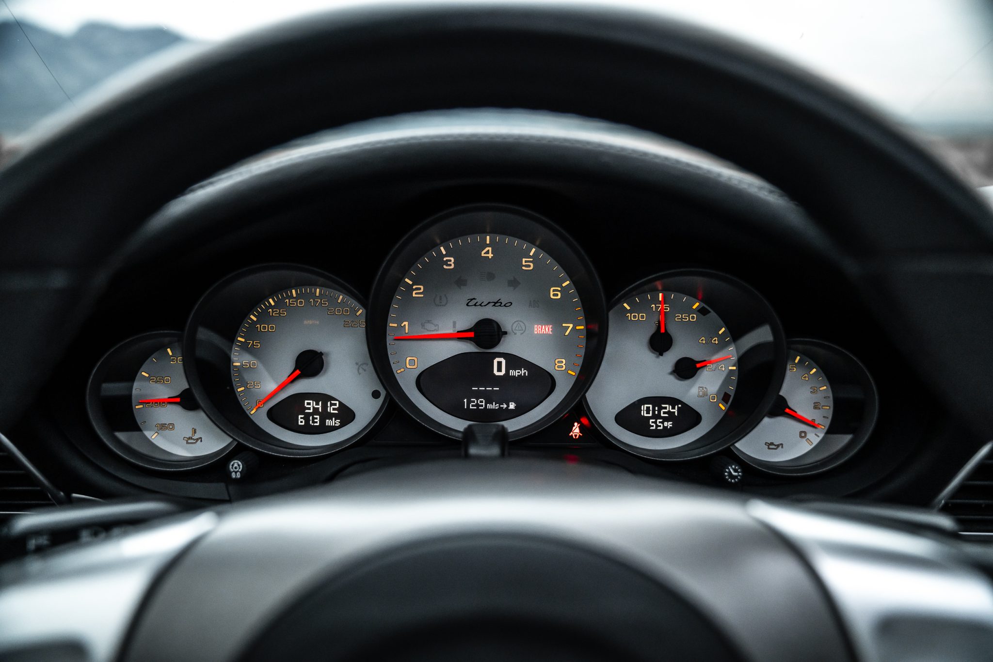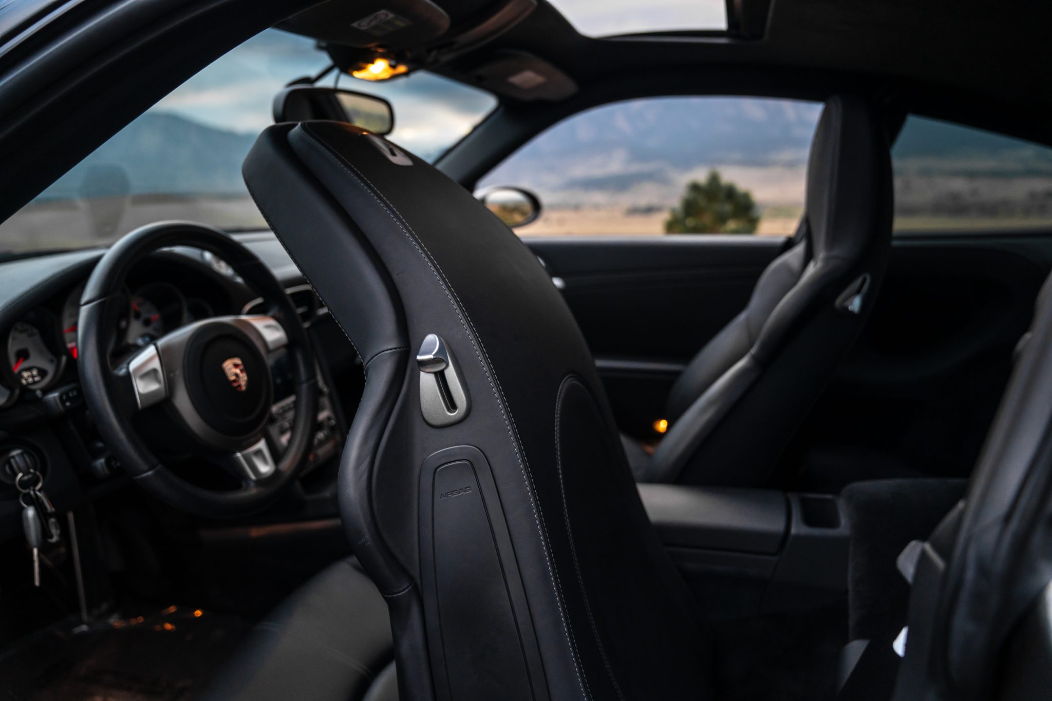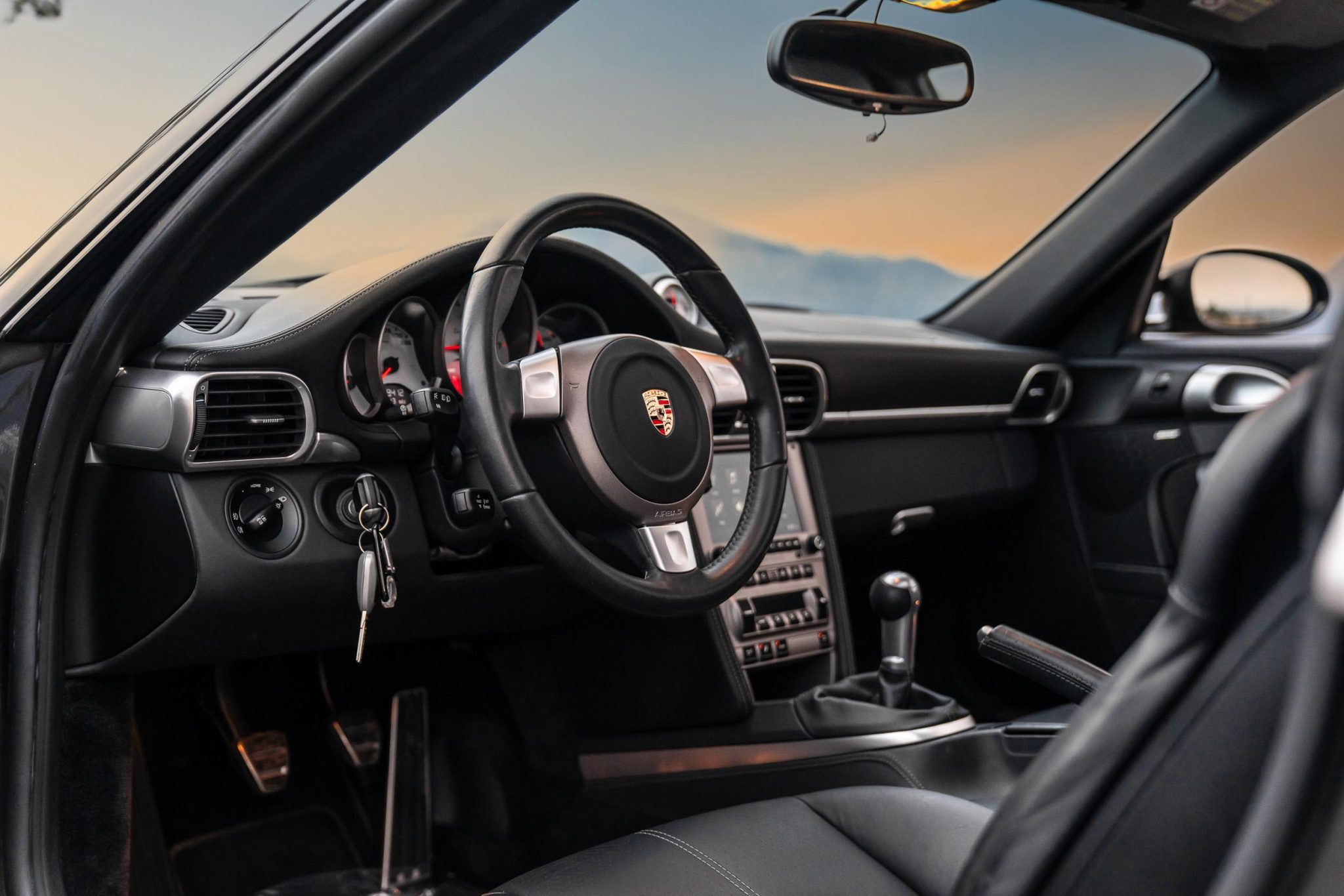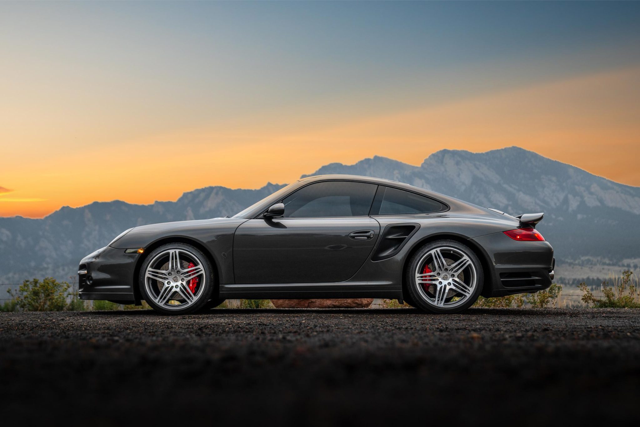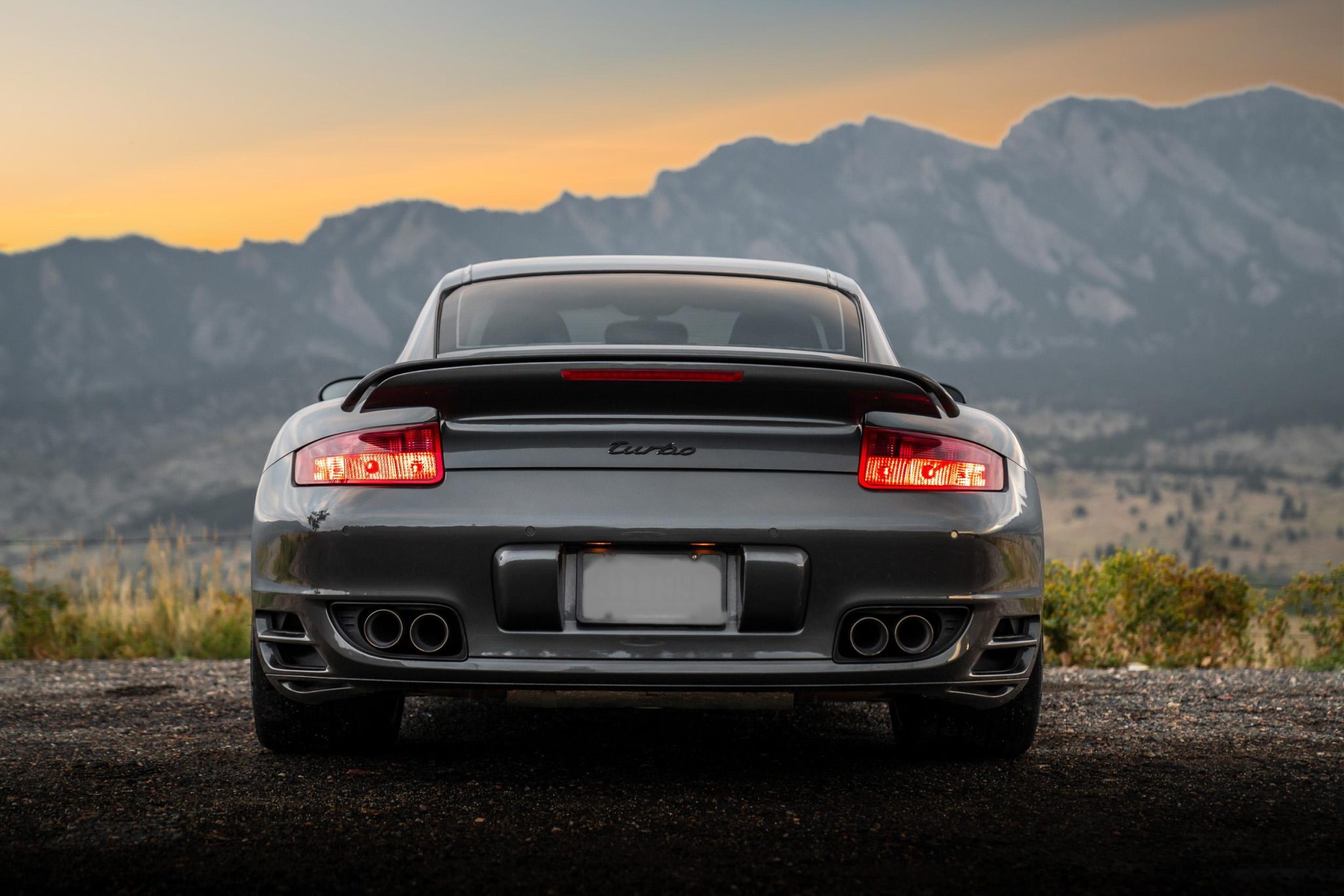 It is finished in Slate Gray Metallic over black leather and is powered by a twin-turbocharged 3.6L flat-six that drives all four wheels via a six-speed manual transaxle. Features include the Sport Chrono Package, 19” Turbo wheels, an aftermarket cat-back exhaust system, bi-xenon headlights, a power sunroof, heated power-adjustable front sport seats, a Bose sound system, automatic climate control, cruise control, and Porsche Communication Management with navigation and Bluetooth connectivity.