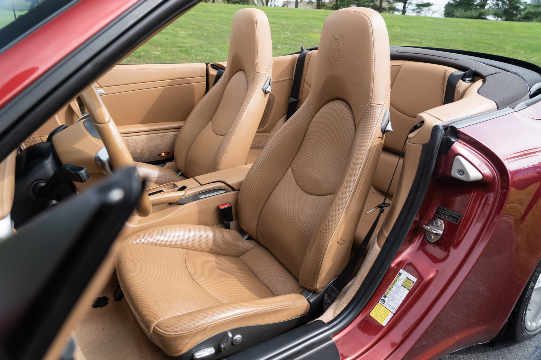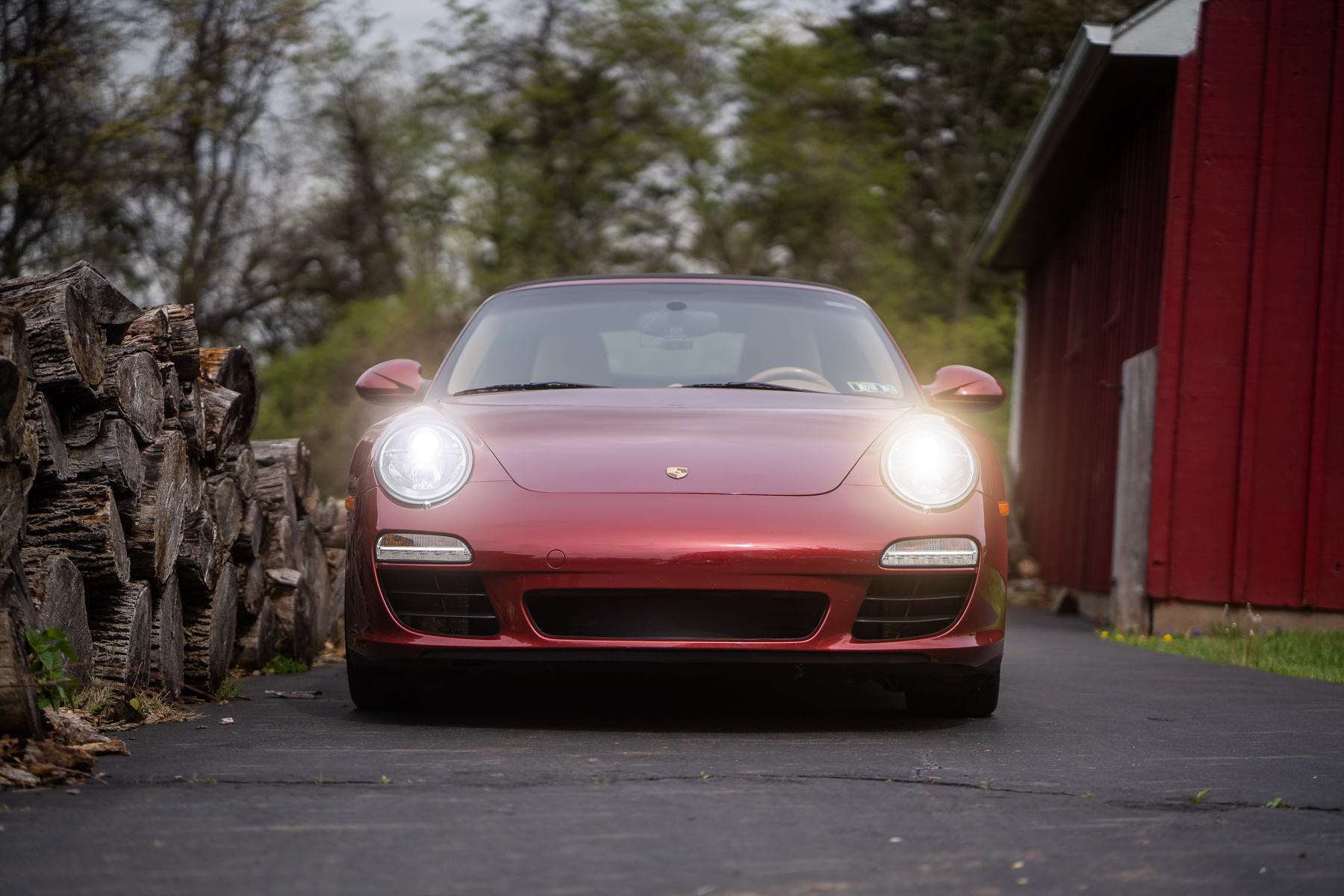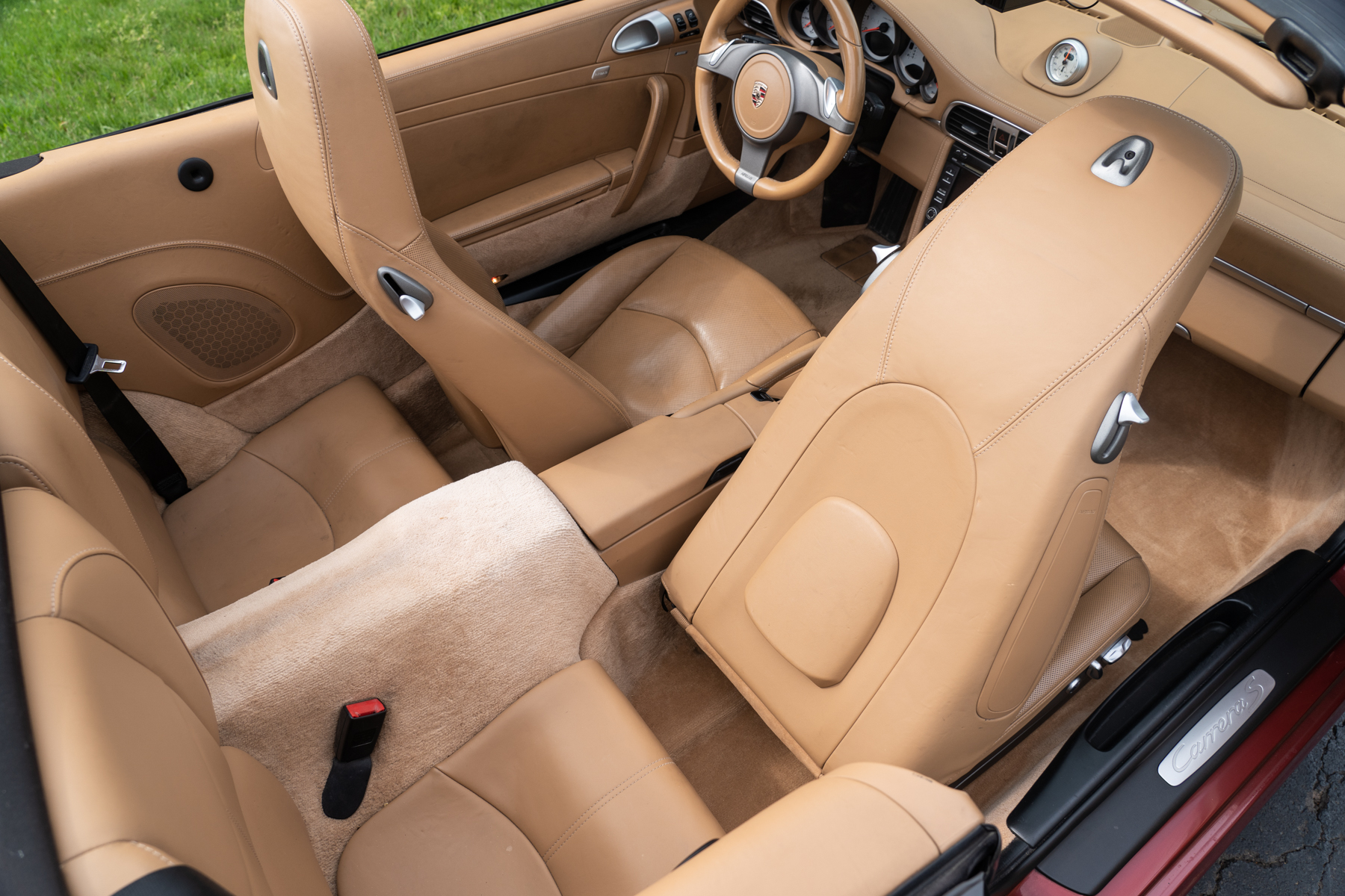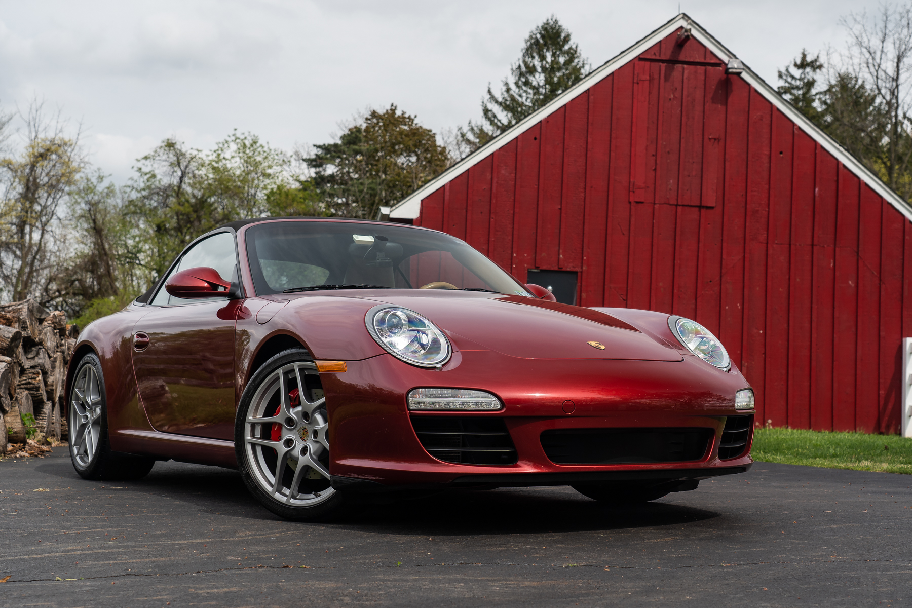 This 2009 Porsche 911 Carrera S cabriolet is powered by a 3.8-liter flat-six paired with a seven-speed PDK dual-clutch transaxle and is finished in Ruby Red Metallic over Sand Beige full leather. Equipment includes the Sport Chrono Package, a Cocoa soft top, 19” Carrera S II wheels, a deployable rear spoiler, bi-xenon headlights, PCM with navigation, a Bose High End sound system, heated and ventilated front seats, automatic climate control, and cruise control. Recent maintenance has included fluids services and replacing the spark plugs.