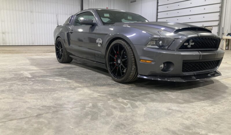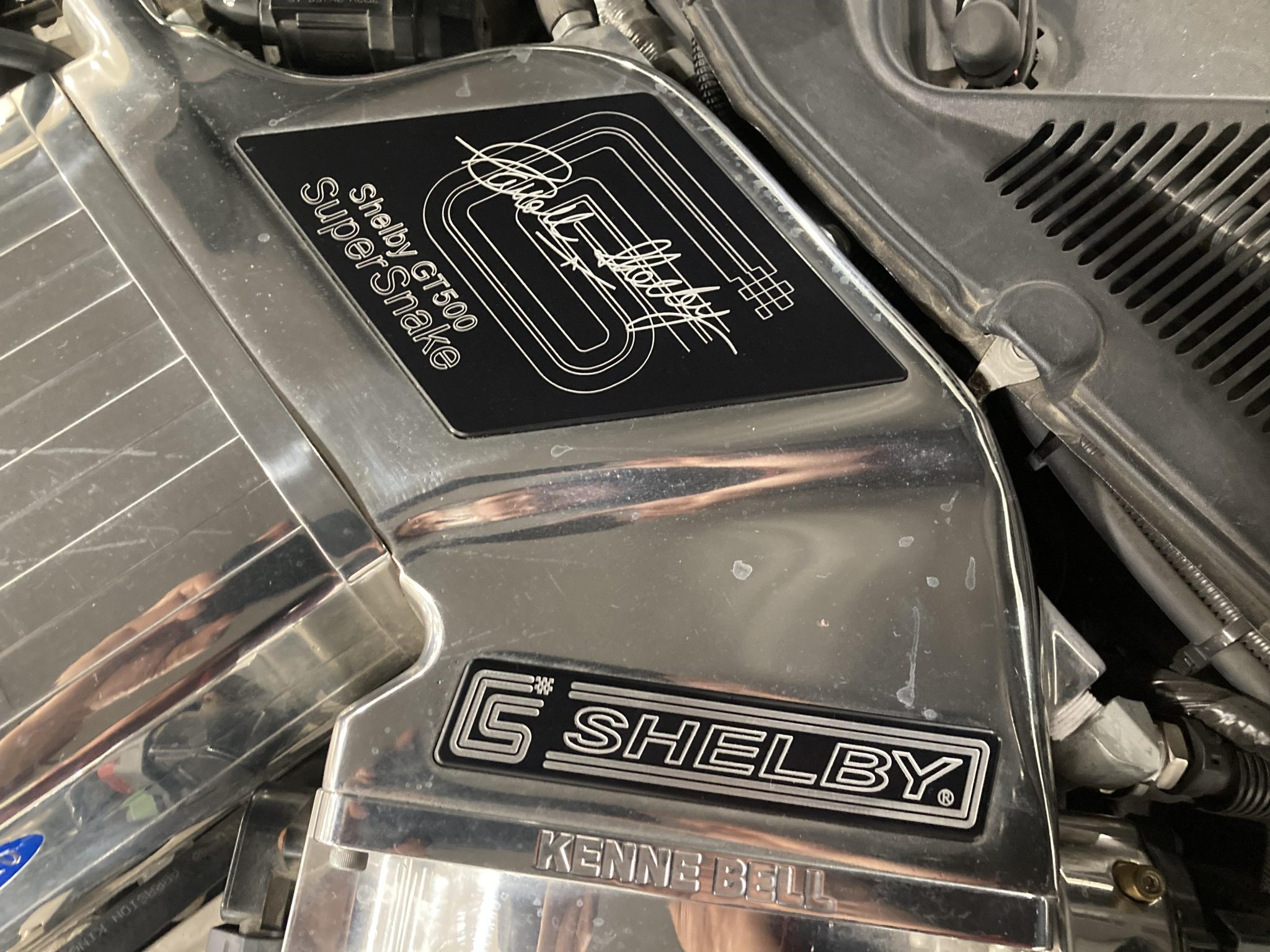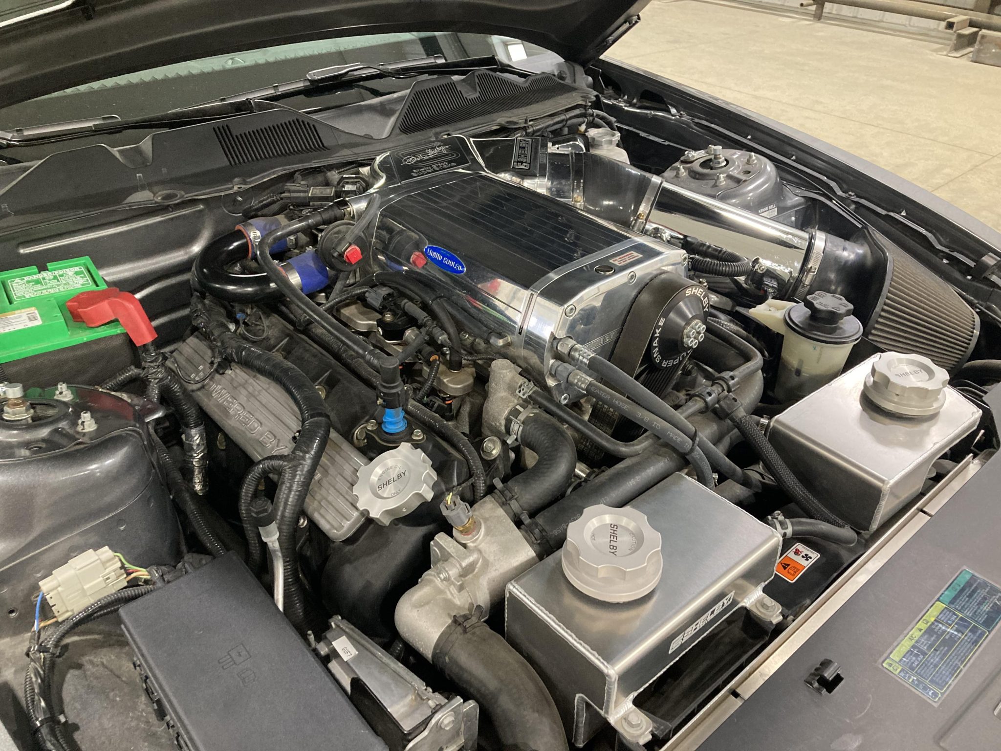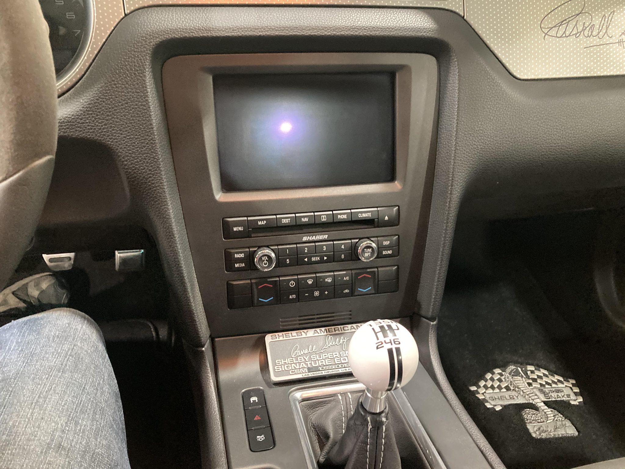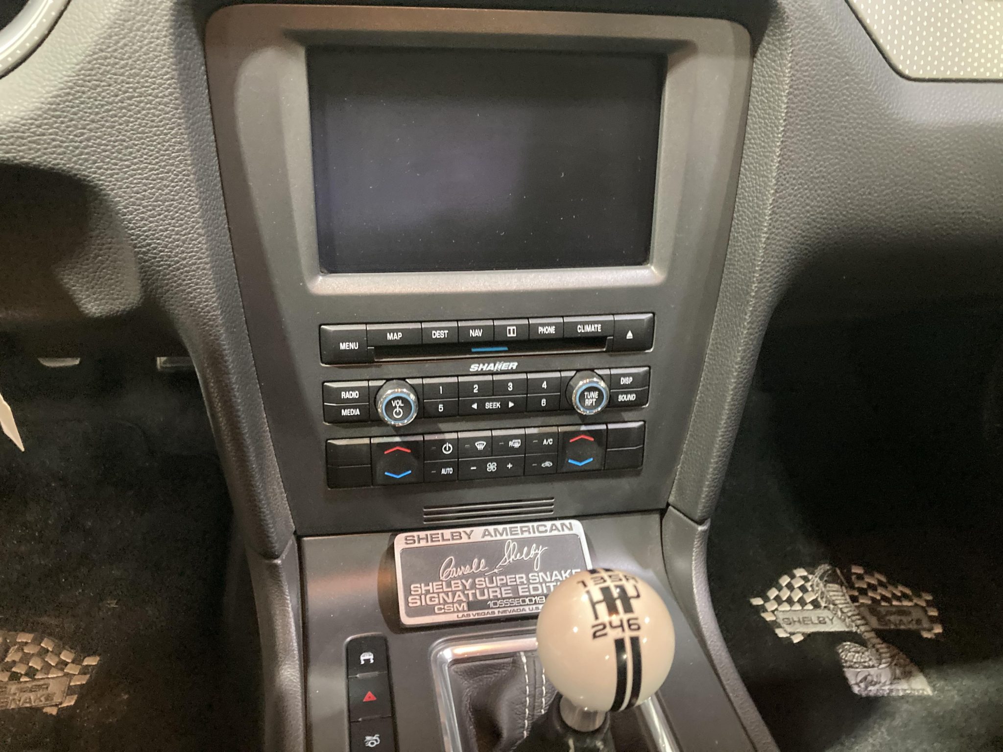 Super Snake Signature Series package, which included fitting the supercharged 5.4-liter V8 with a Shelby Performance cooling package and a 3.6L Kenne Bell supercharger as well as installing a rear big-brake kit, forged Weld-Shelby American 20″ wheels, and Signature Edition interior and exterior accents. The car is finished in Sterling Grey over black leather and also features a six-speed manual transmission, a limited-slip differential, a decklid spoiler, a vented hood, HID headlights, quarter window scoops, Shelby-branded multi-piston brake calipers, dual-zone automatic climate control, cruise control, a cue ball-style shift knob, Shaker audio, and a touchscreen infotainment system with navigation
