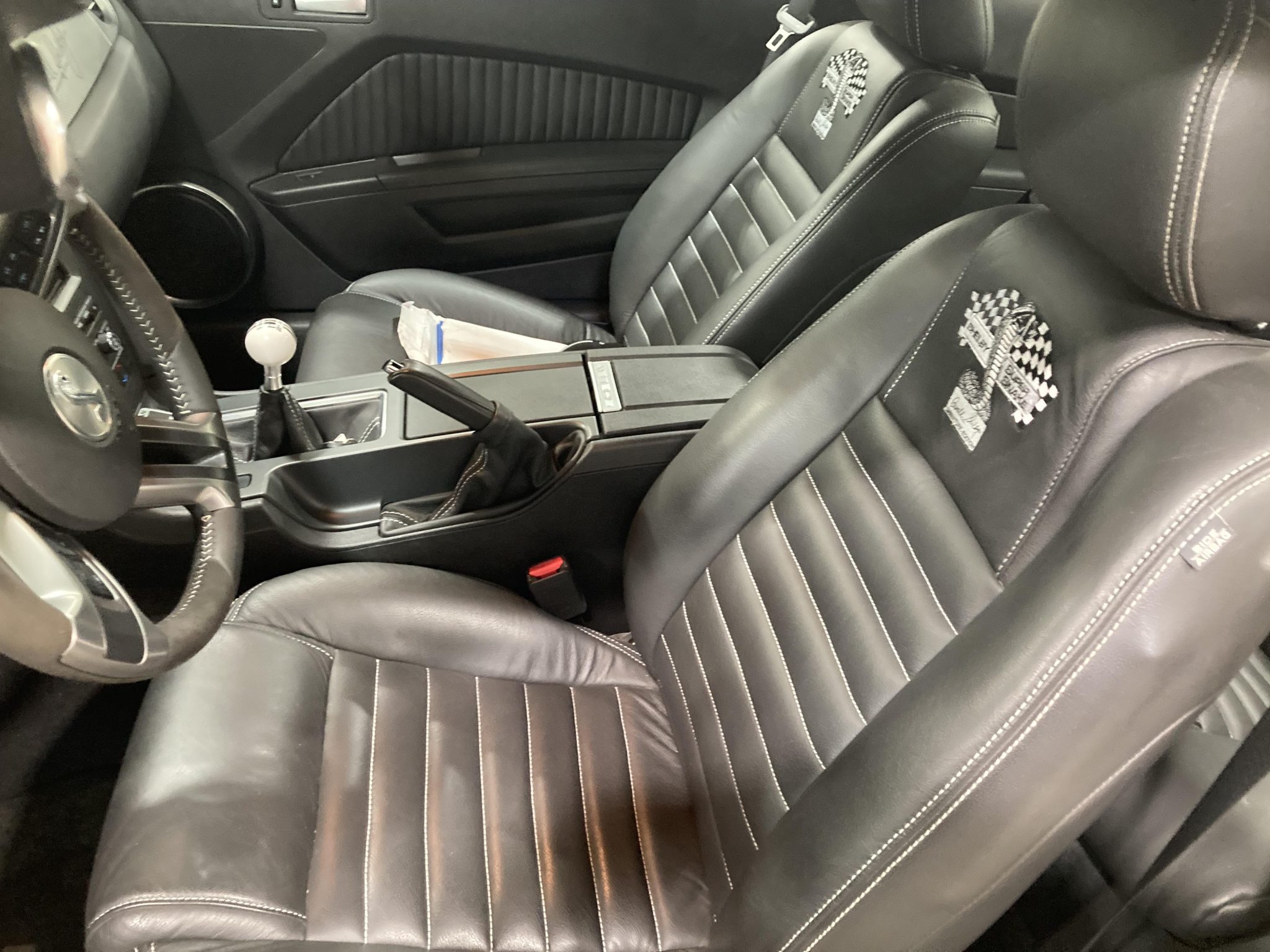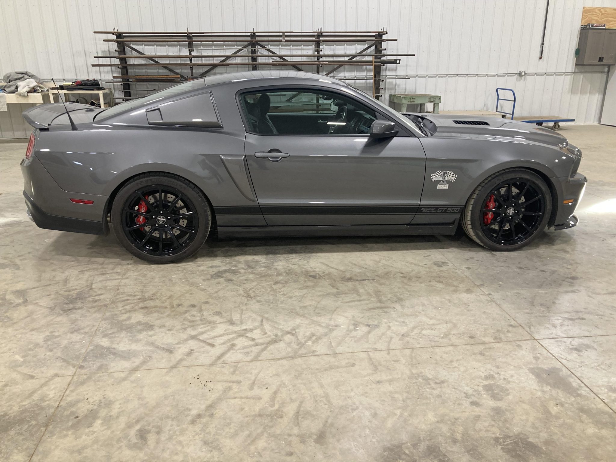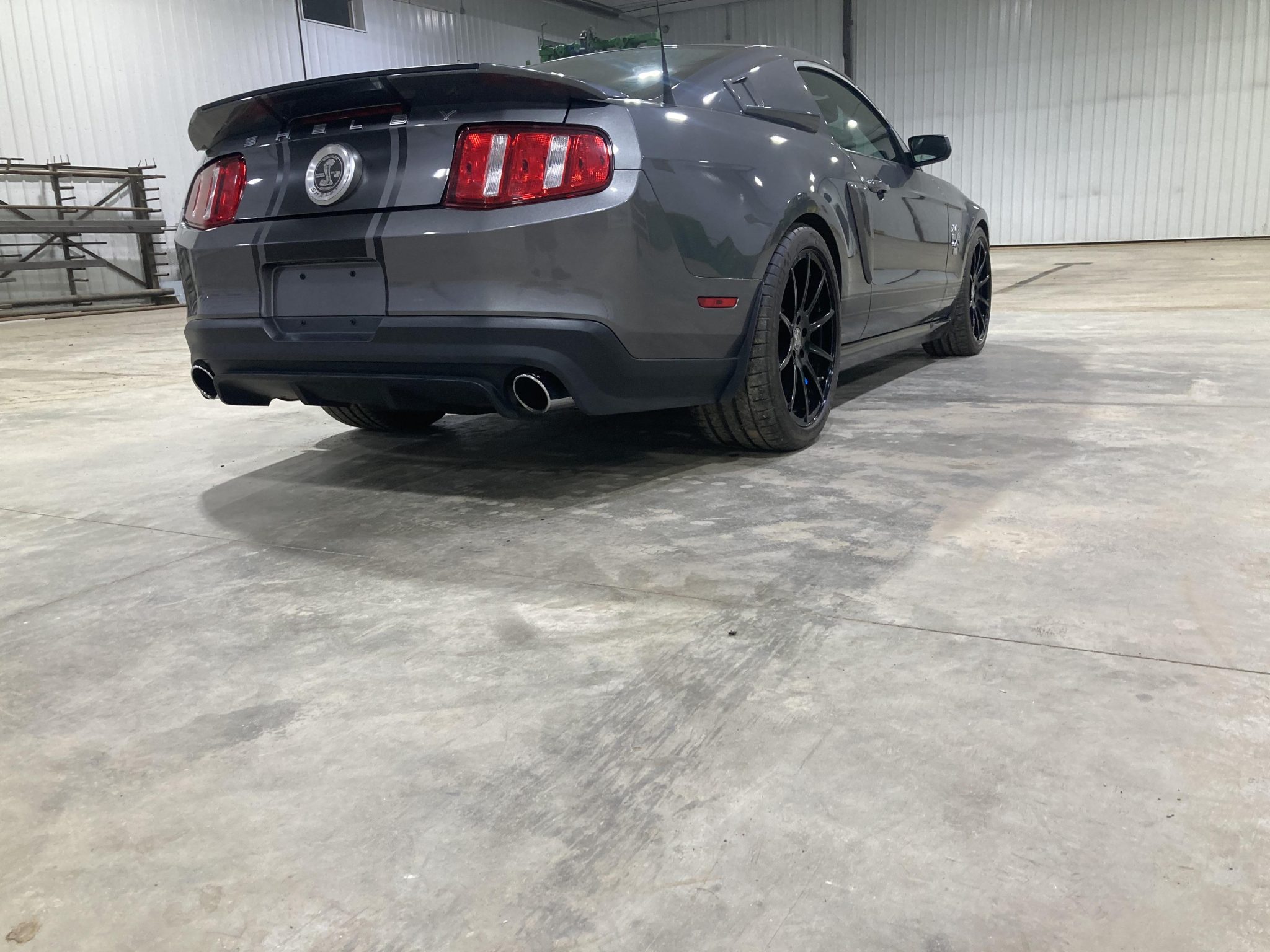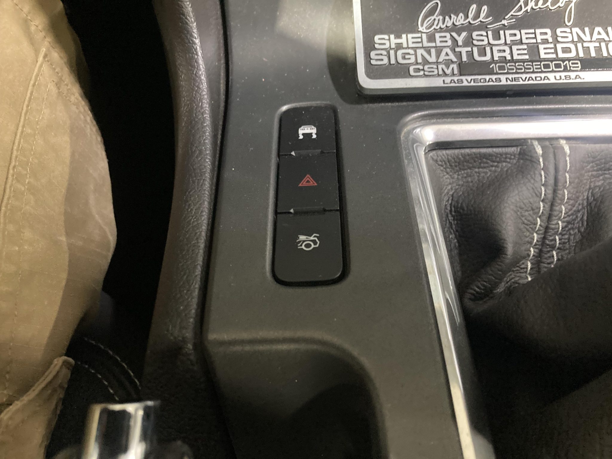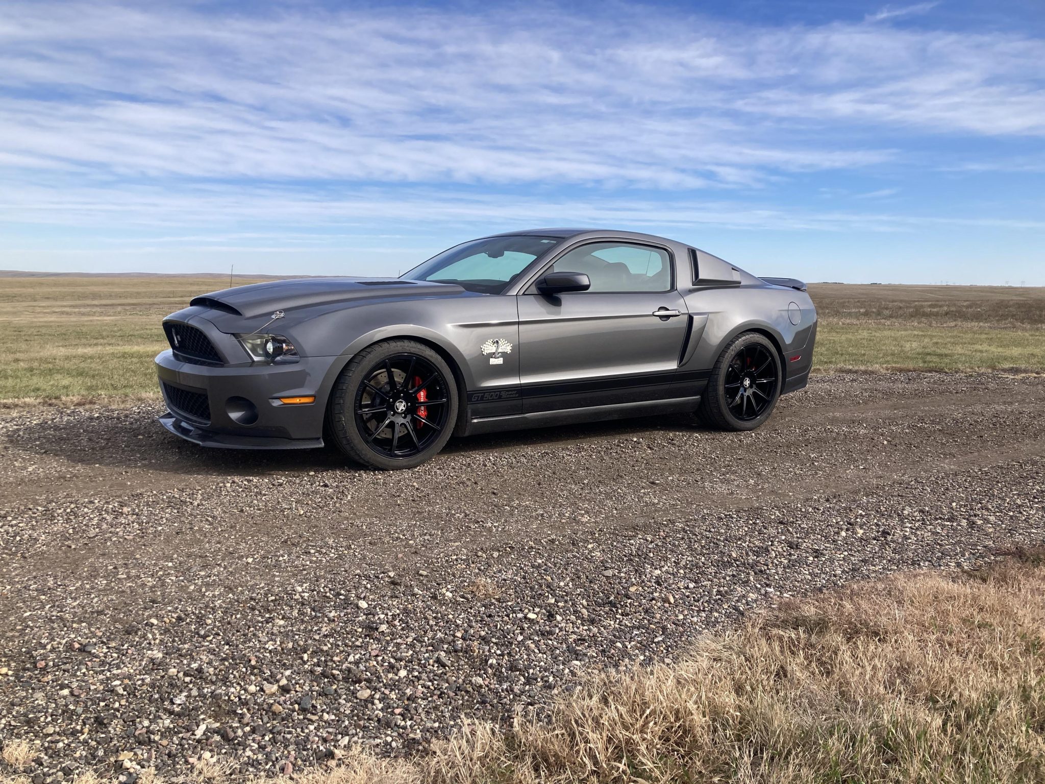 Super Snake Signature Series package, which included fitting the supercharged 5.4-liter V8 with a Shelby Performance cooling package and a 3.6L Kenne Bell supercharger as well as installing a rear big-brake kit, forged Weld-Shelby American 20″ wheels, and Signature Edition interior and exterior accents. The car is finished in Sterling Grey over black leather and also features a six-speed manual transmission, a limited-slip differential, a decklid spoiler, a vented hood, HID headlights, quarter window scoops, Shelby-branded multi-piston brake calipers, dual-zone automatic climate control, cruise control, a cue ball-style shift knob, Shaker audio, and a touchscreen infotainment system with navigation