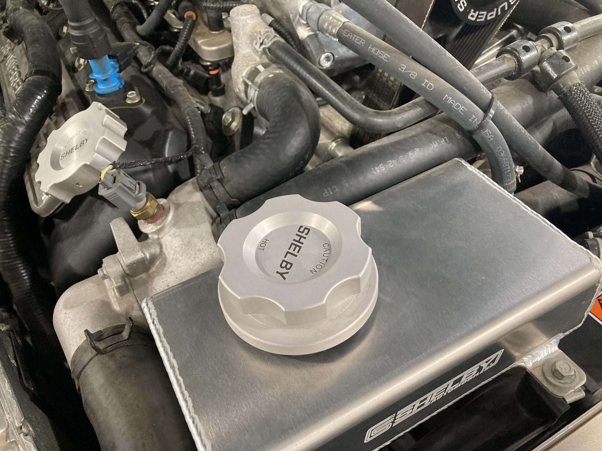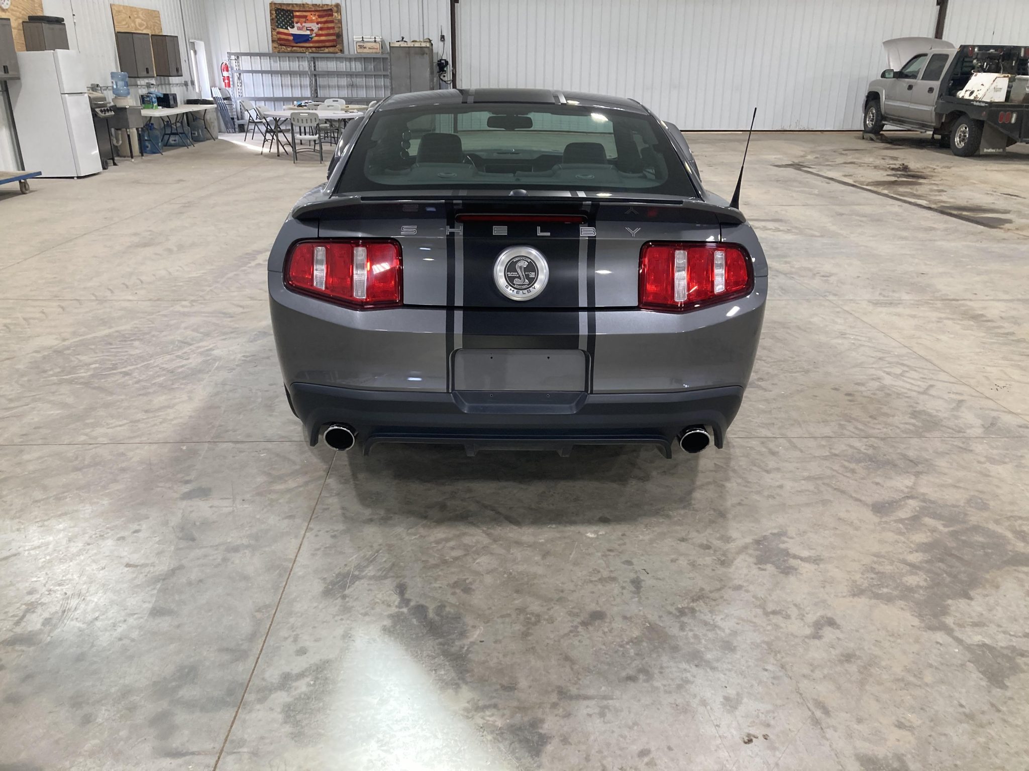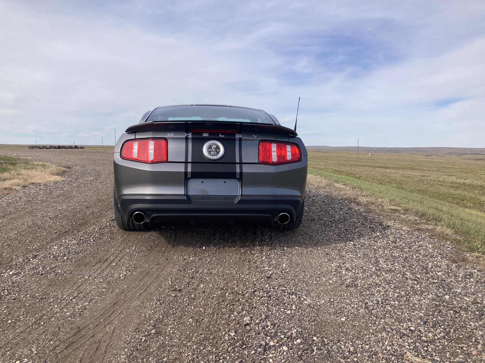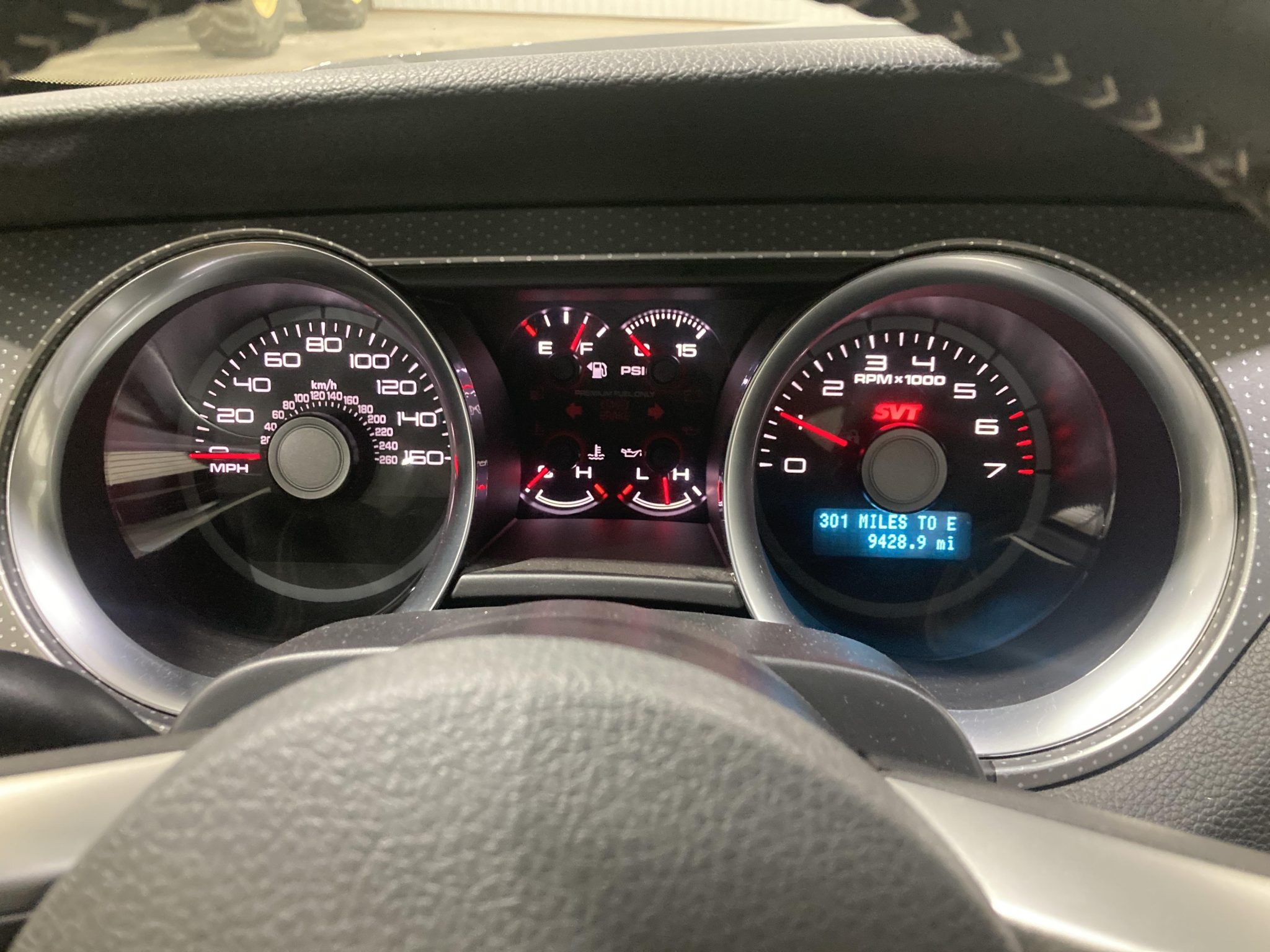 Super Snake Signature Series package, which included fitting the supercharged 5.4-liter V8 with a Shelby Performance cooling package and a 3.6L Kenne Bell supercharger as well as installing a rear big-brake kit, forged Weld-Shelby American 20″ wheels, and Signature Edition interior and exterior accents. The car is finished in Sterling Grey over black leather and also features a six-speed manual transmission, a limited-slip differential, a decklid spoiler, a vented hood, HID headlights, quarter window scoops, Shelby-branded multi-piston brake calipers, dual-zone automatic climate control, cruise control, a cue ball-style shift knob, Shaker audio, and a touchscreen infotainment system with navigation