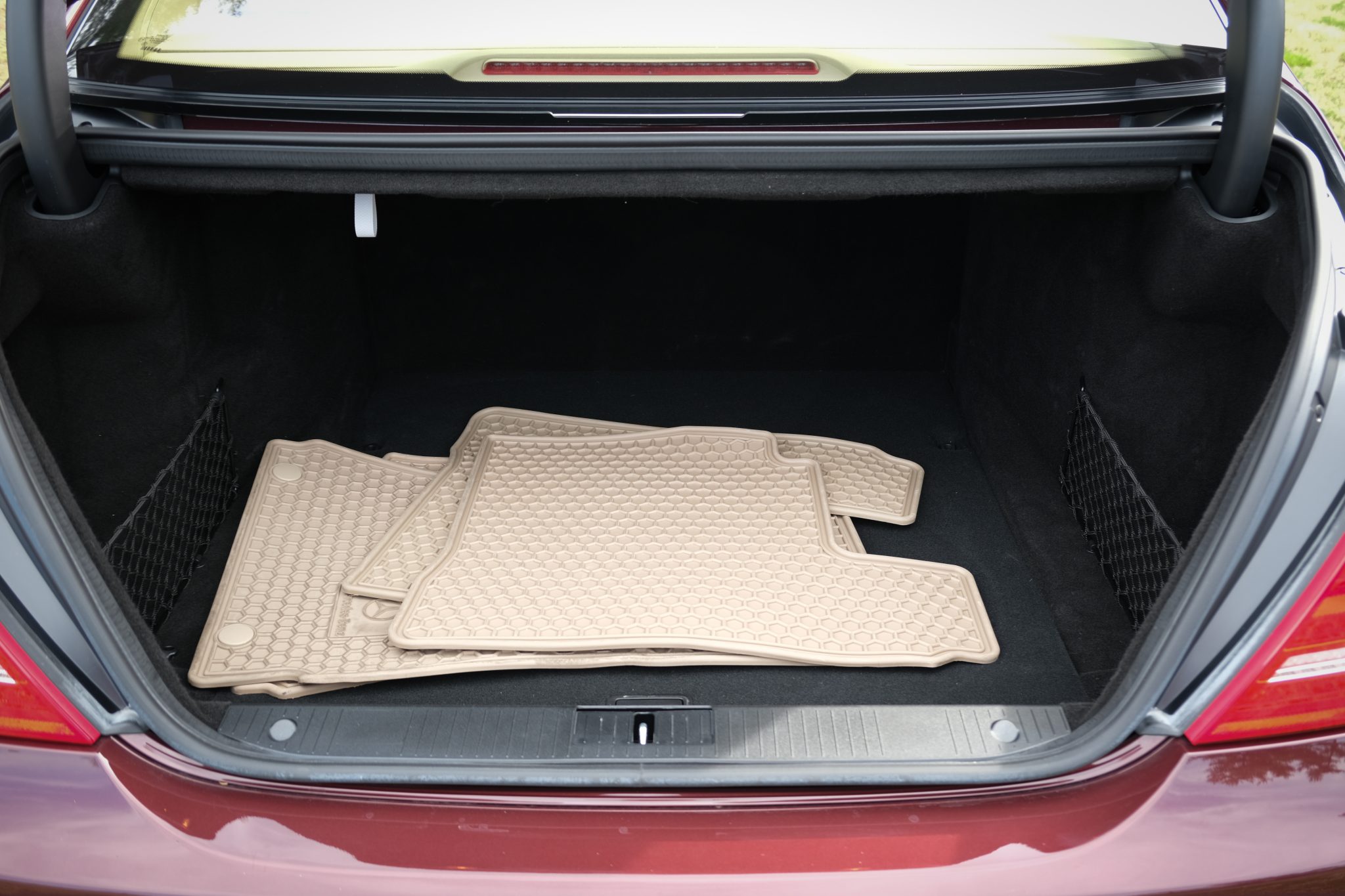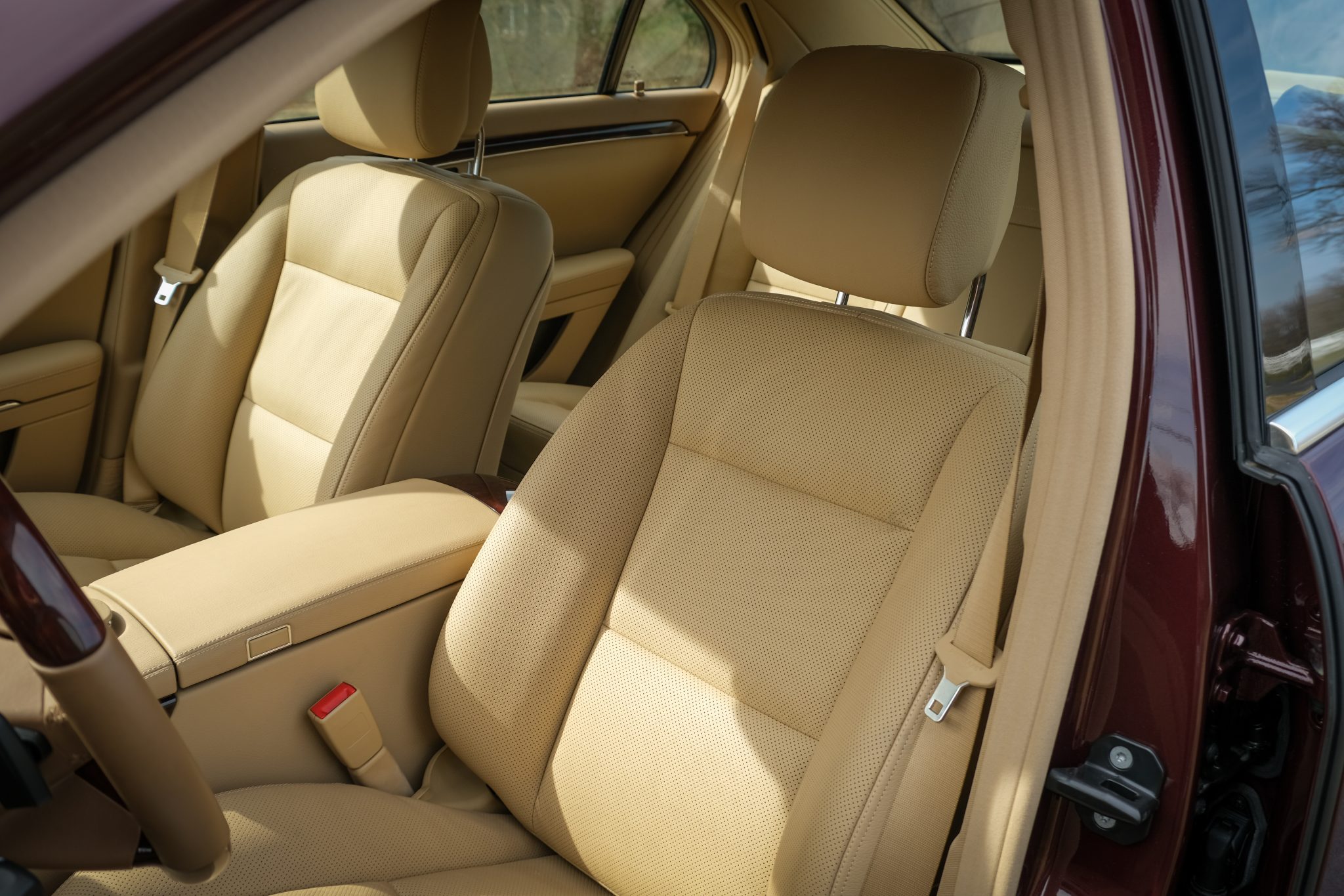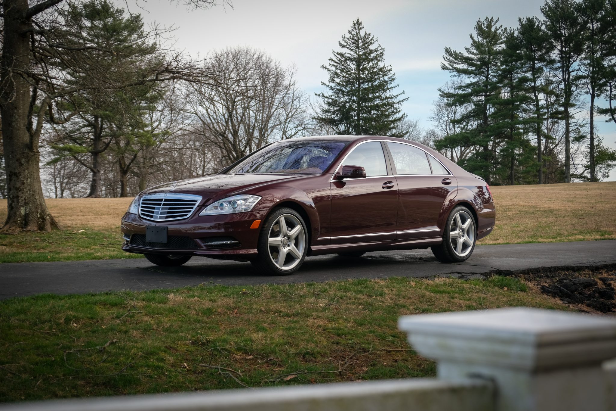 The car is powered by a 5.5-liter V8 paired with a seven-speed automatic transmission and is finished in Barolo Red Metallic over Savanna and Cashmere leather upholstery. Equipment includes the Sport Package Plus One, 20″ five-spoke AMG wheels, bi-xenon headlights, a sunroof, Parktronic, soft-close doors, Keyless-Go, Distronic Plus adaptive cruise control, a backup camera, COMAND with navigation, a Harman Kardon sound system, and heated power-adjustable front seats.
