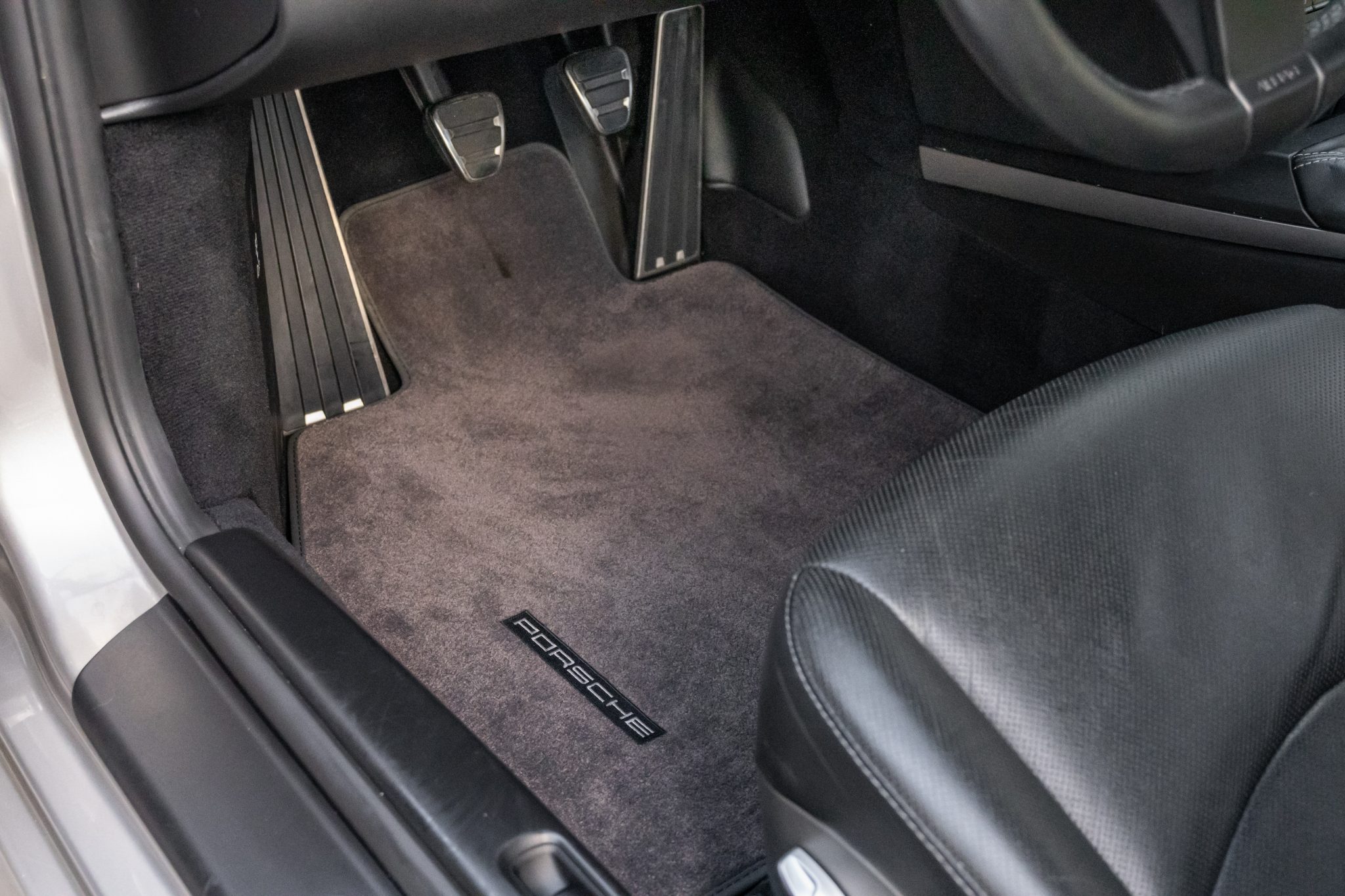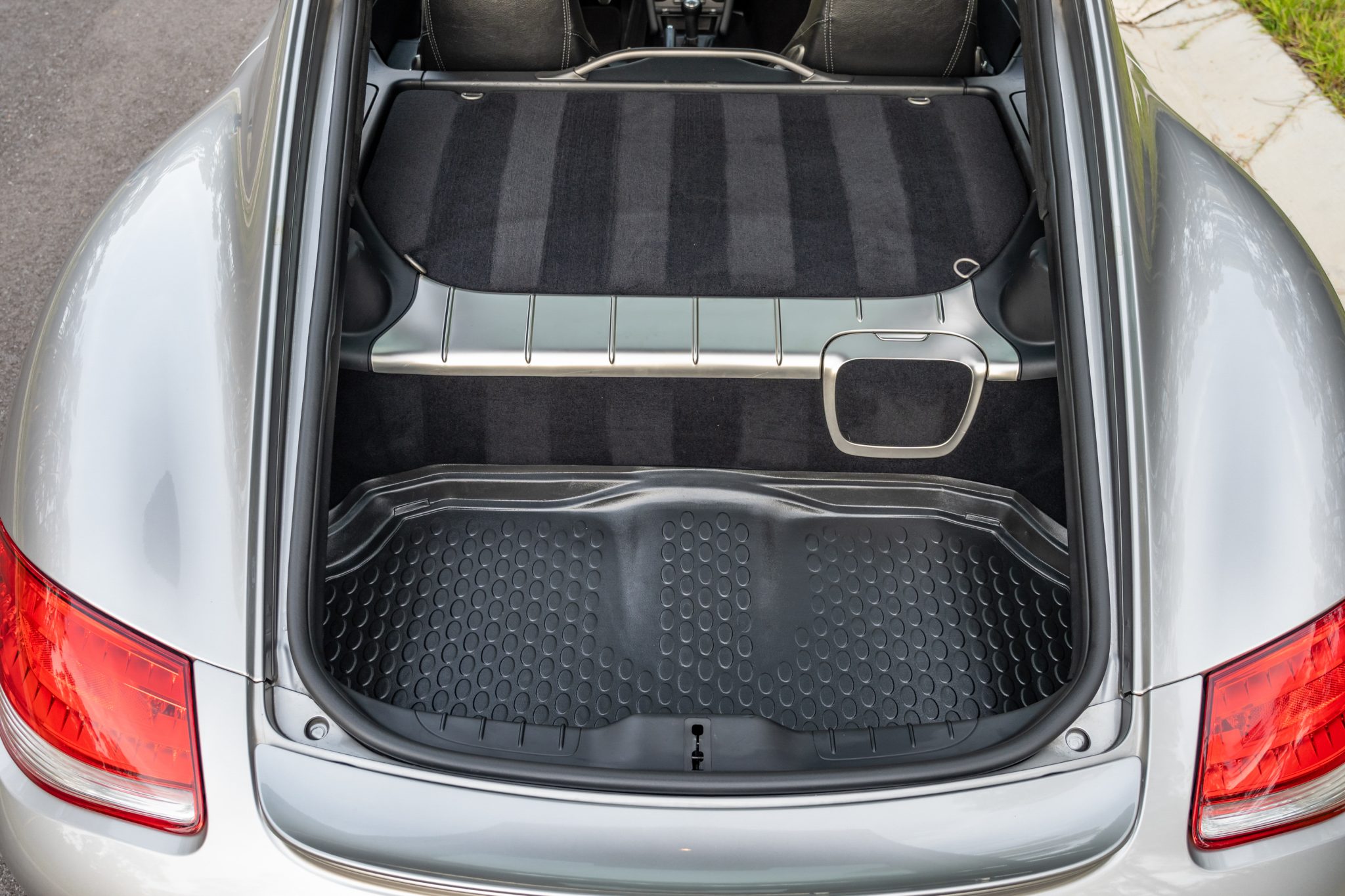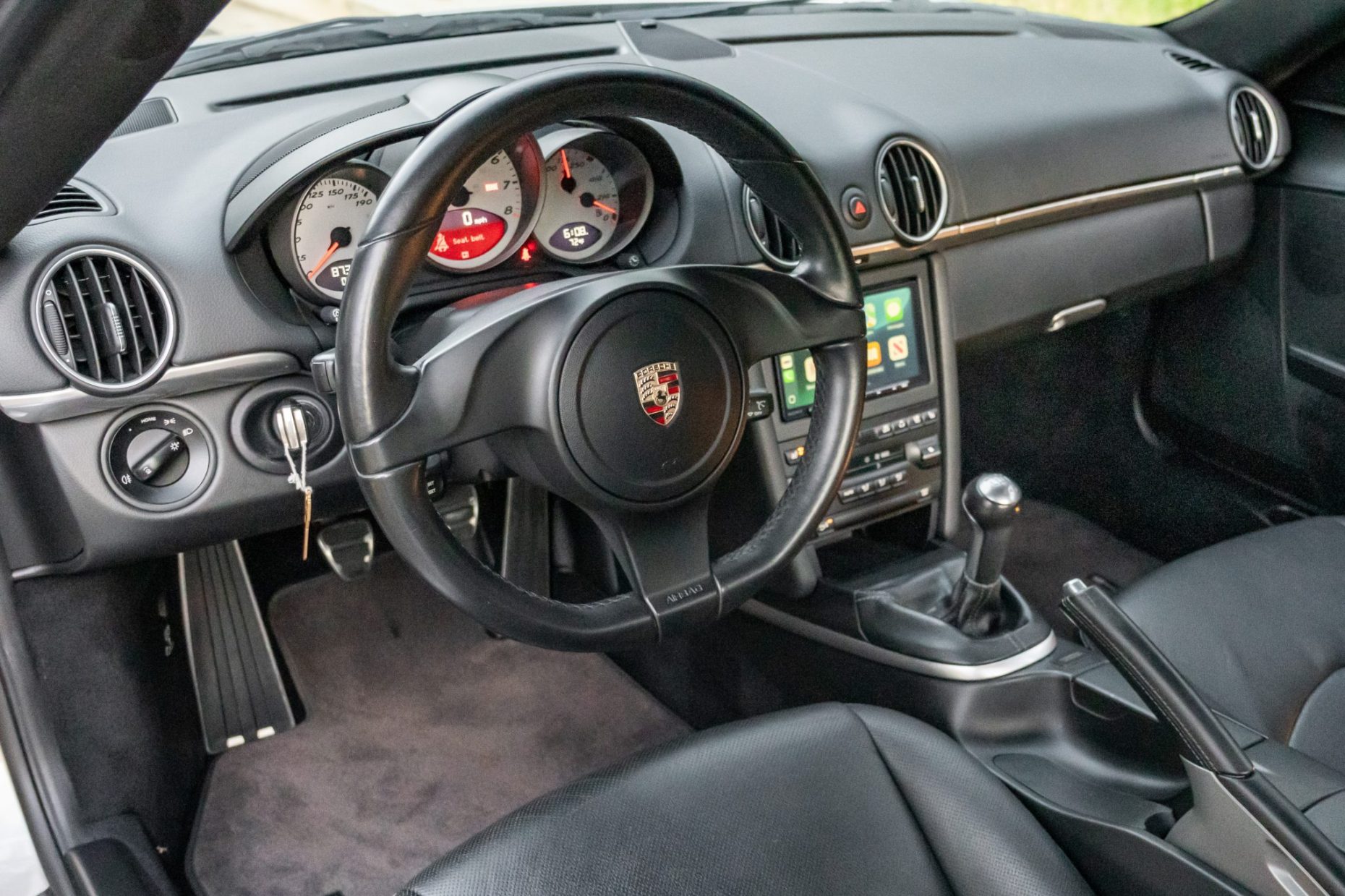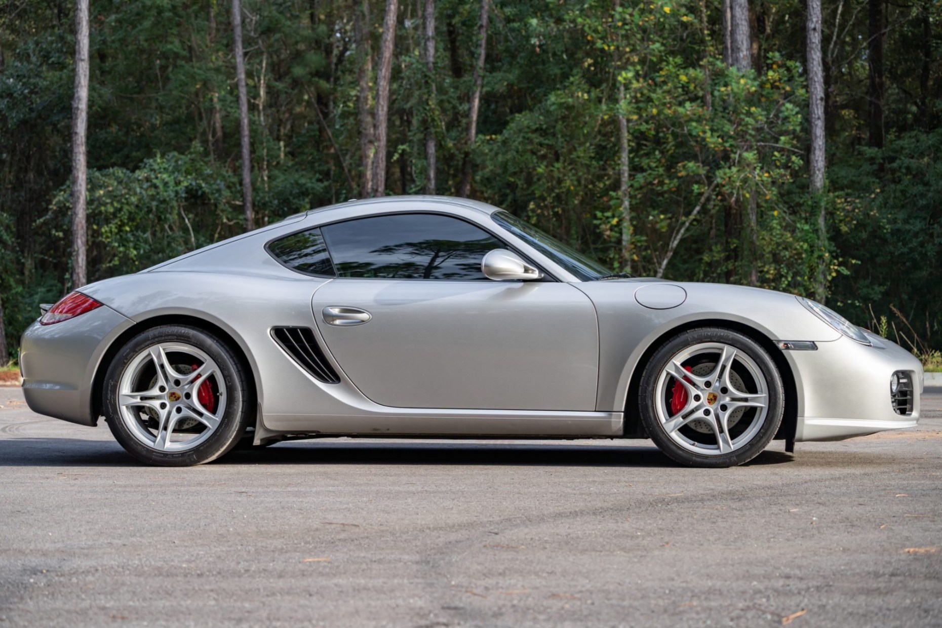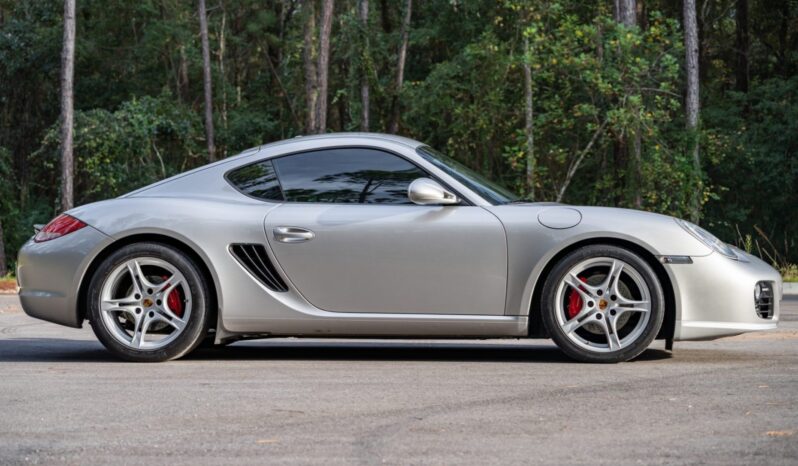 This 2011 Porsche Cayman S is finished in Platinum Silver Metallic over black leather and is powered by a 3.4-liter flat-six paired with a six-speed manual transaxle. Equipment includes the Convenience and Infotainment packages as well as GT3 front lower control arms, Cayman R suspension components, 18″ Cayman S II wheels, bi-xenon headlights, a deployable rear spoiler, heated and ventilated power-adjustable seats, automatic climate control, and Sony touchscreen infotainment linked to a Bose sound system