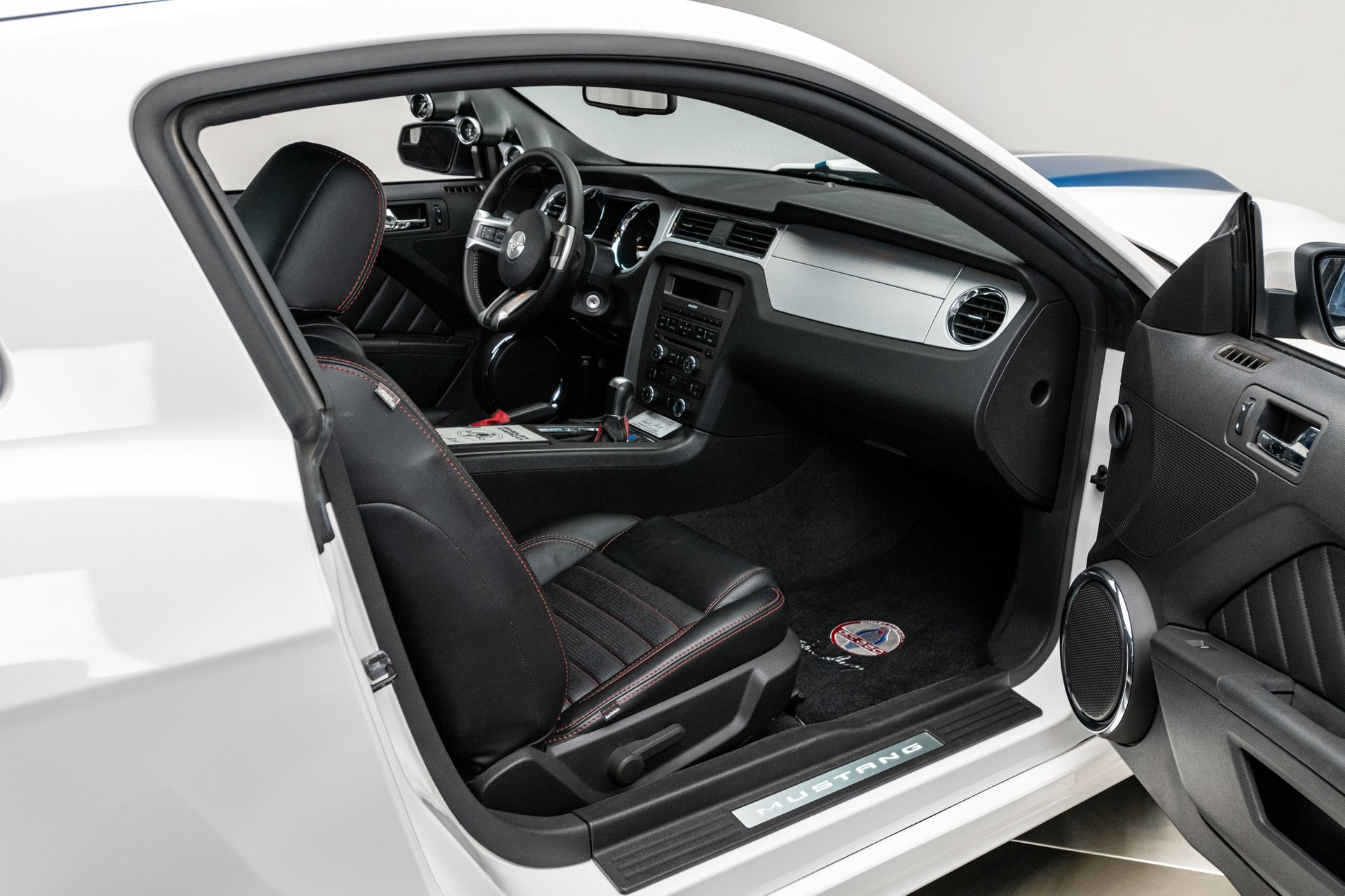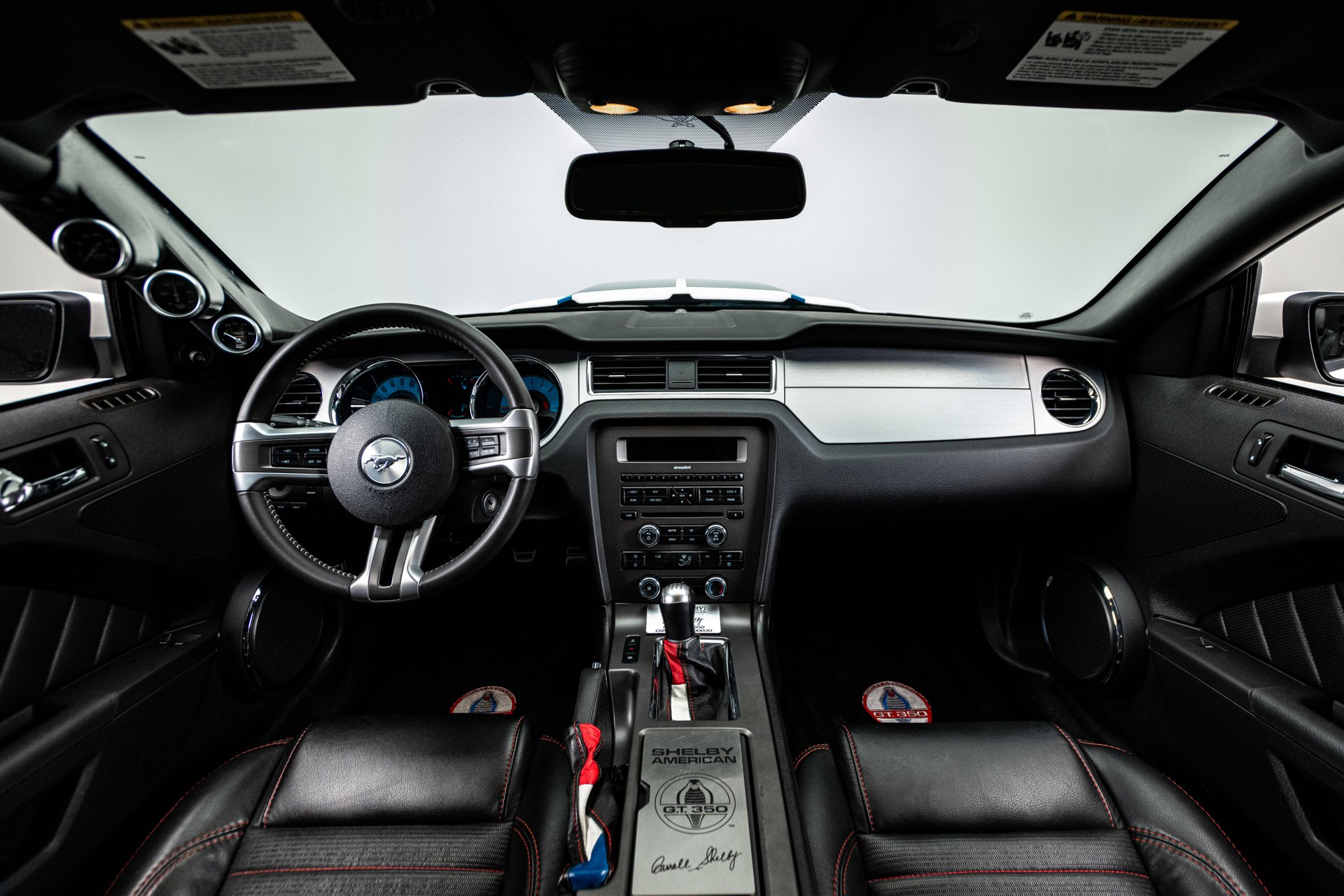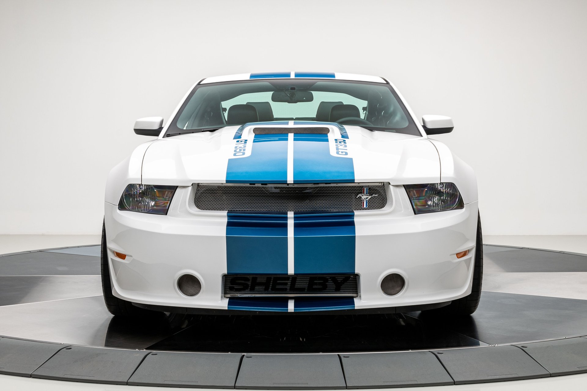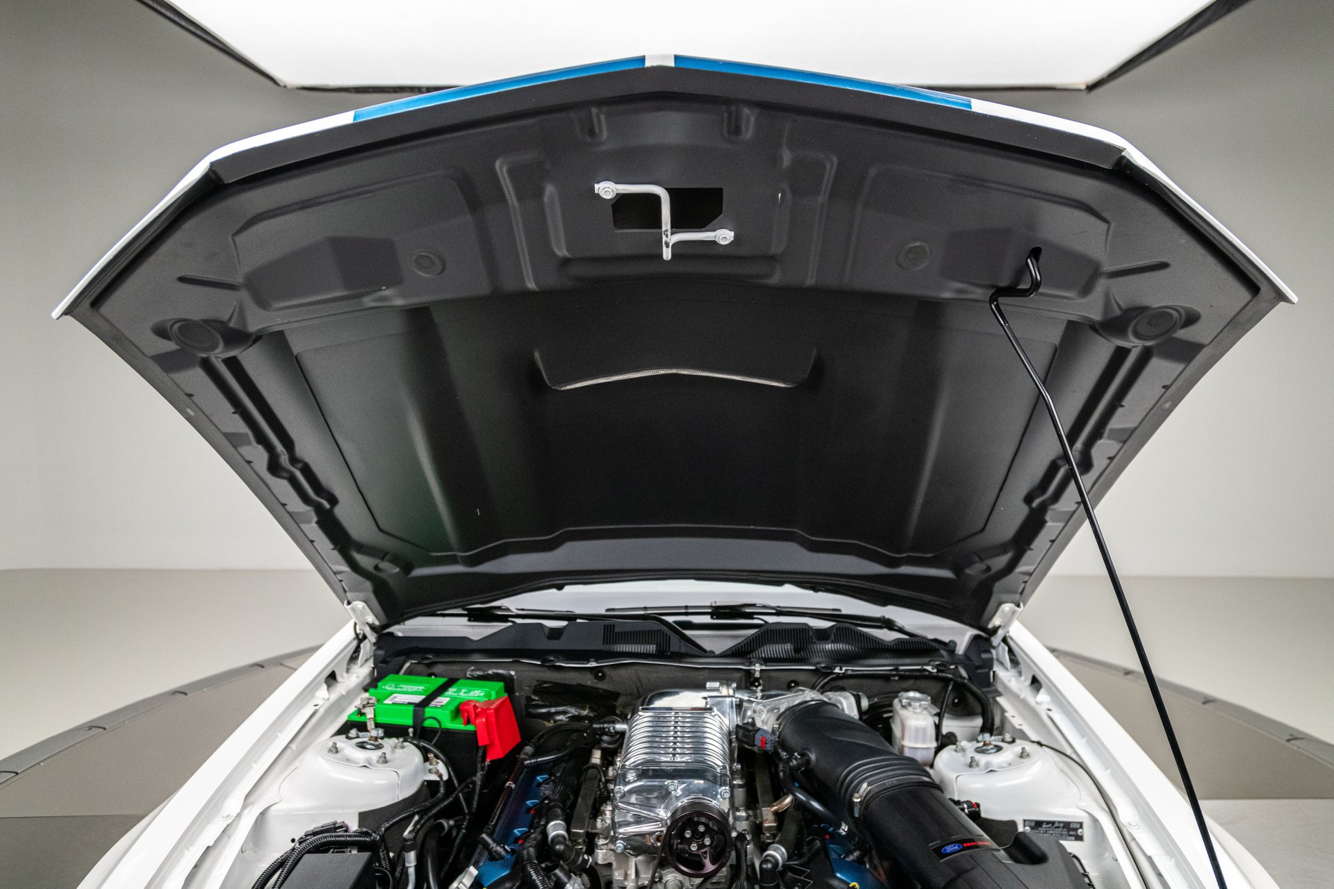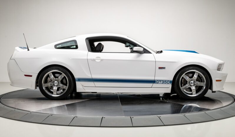 The car was finished in Performance White from the factory, with Guardsman Blue stripes and the GT350 Interior Package being added by Shelby American. Power is provided by a Whipple-supercharged 5.0-liter V8 linked with a six-speed manual transmission and a limited-slip differential. Options include Shelby-specific front and rear fascias, a hood scoop, an integrated rear spoiler, Wilwood brakes, revised handbrake and shift boots, a Shaker audio system, SYNC infotainment, dual-zone automatic climate control, cruise control.