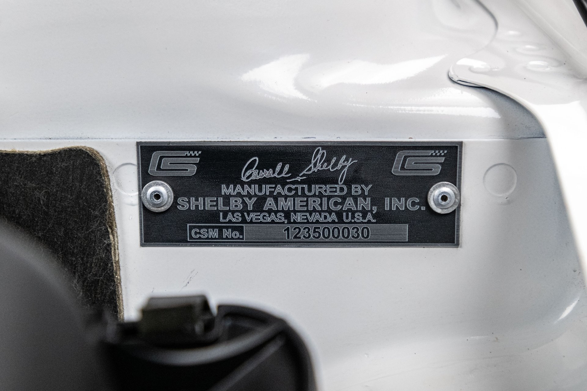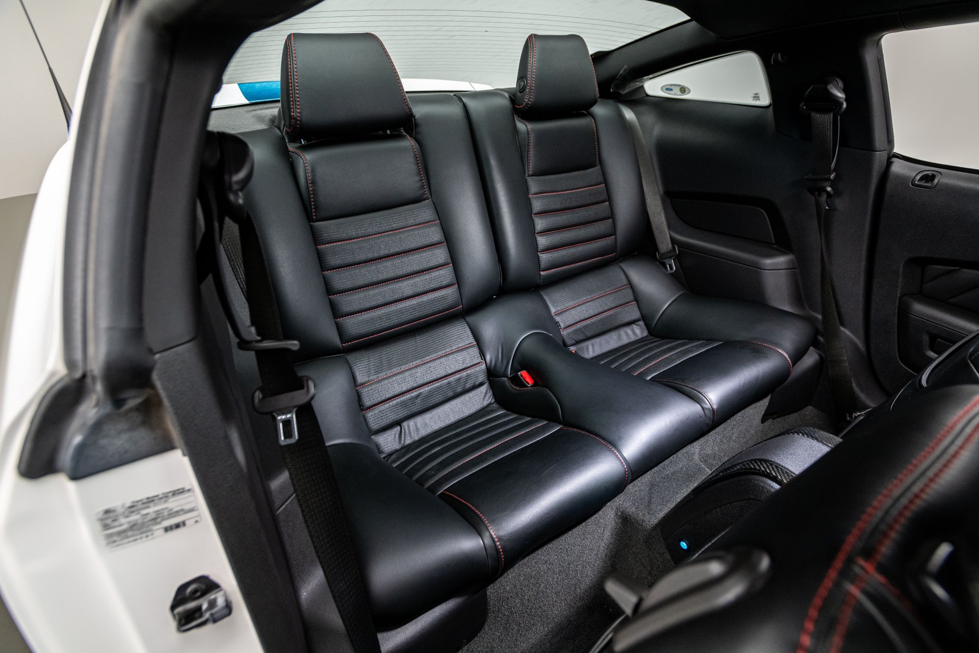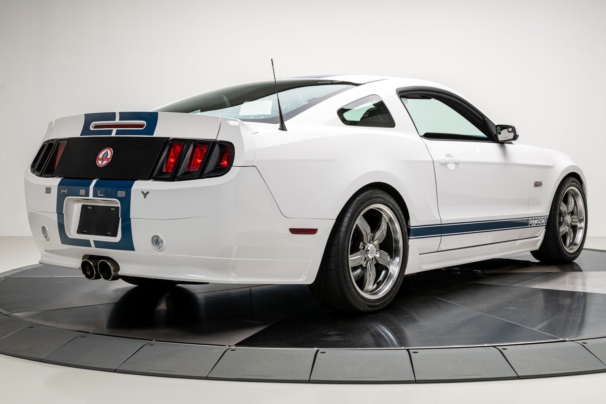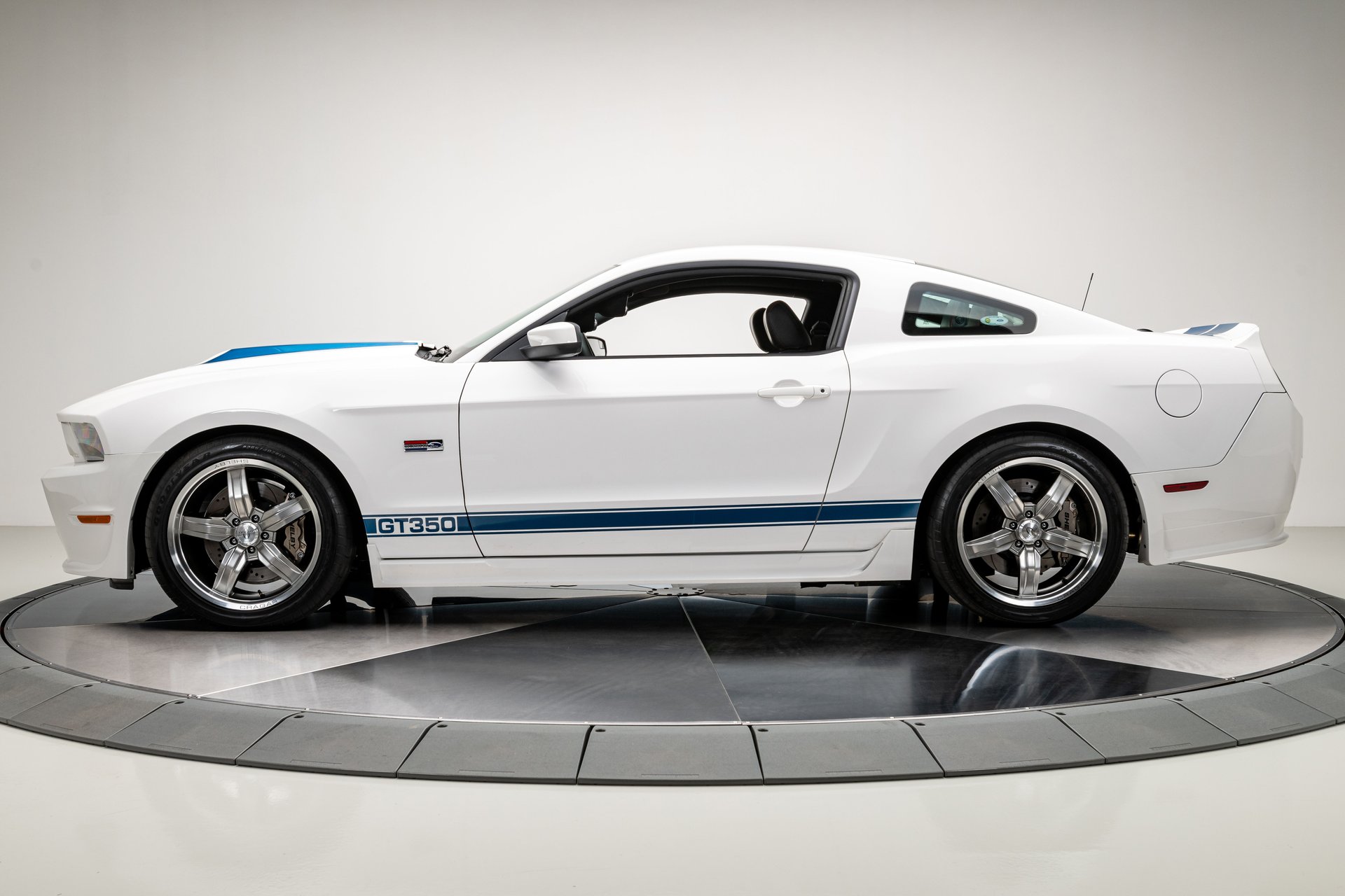 The car was finished in Performance White from the factory, with Guardsman Blue stripes and the GT350 Interior Package being added by Shelby American. Power is provided by a Whipple-supercharged 5.0-liter V8 linked with a six-speed manual transmission and a limited-slip differential. Options include Shelby-specific front and rear fascias, a hood scoop, an integrated rear spoiler, Wilwood brakes, revised handbrake and shift boots, a Shaker audio system, SYNC infotainment, dual-zone automatic climate control, cruise control.