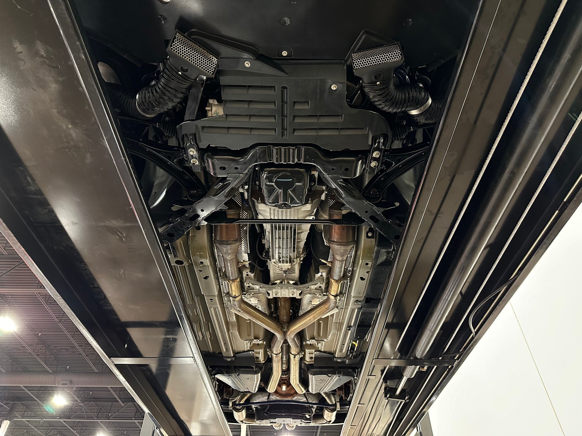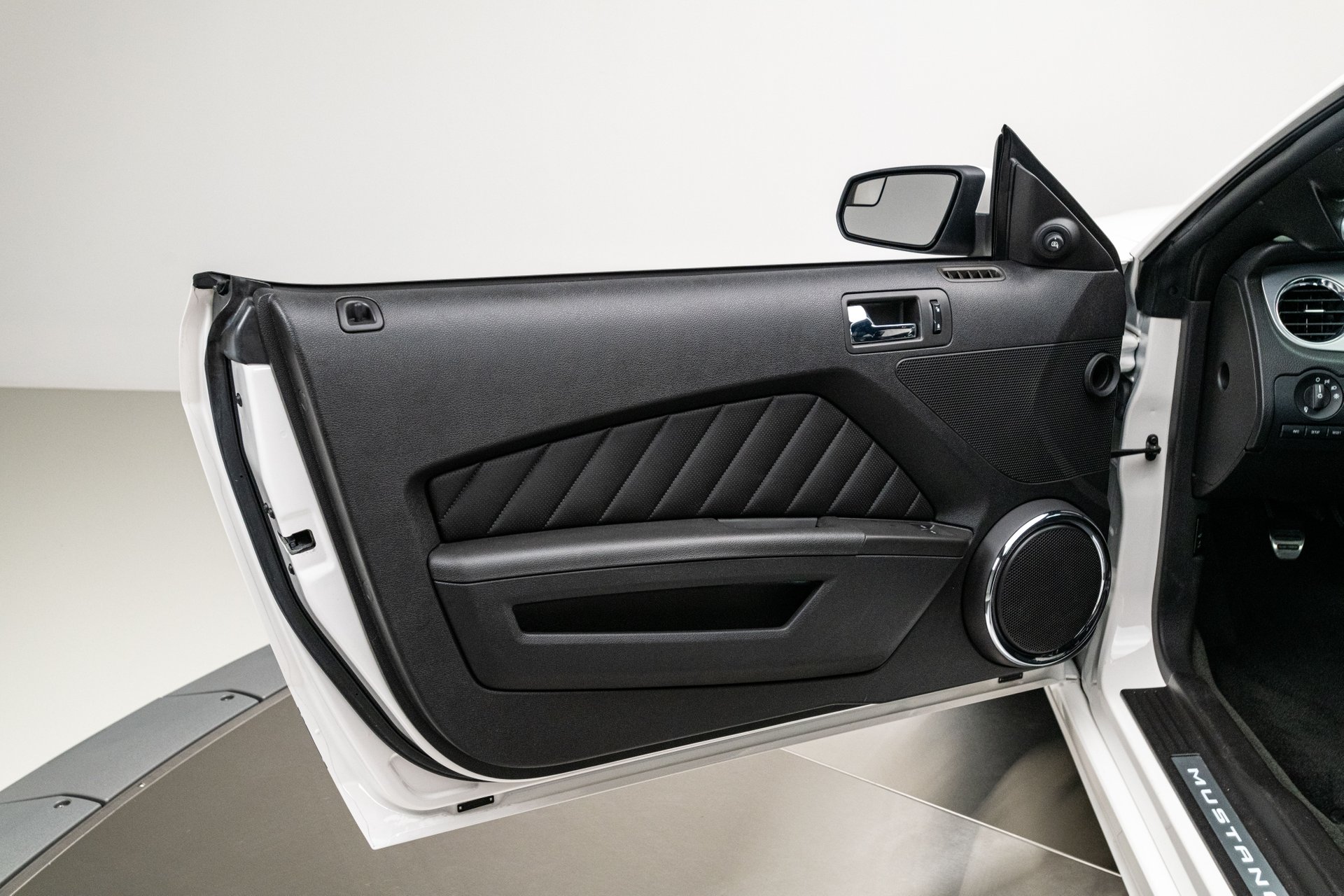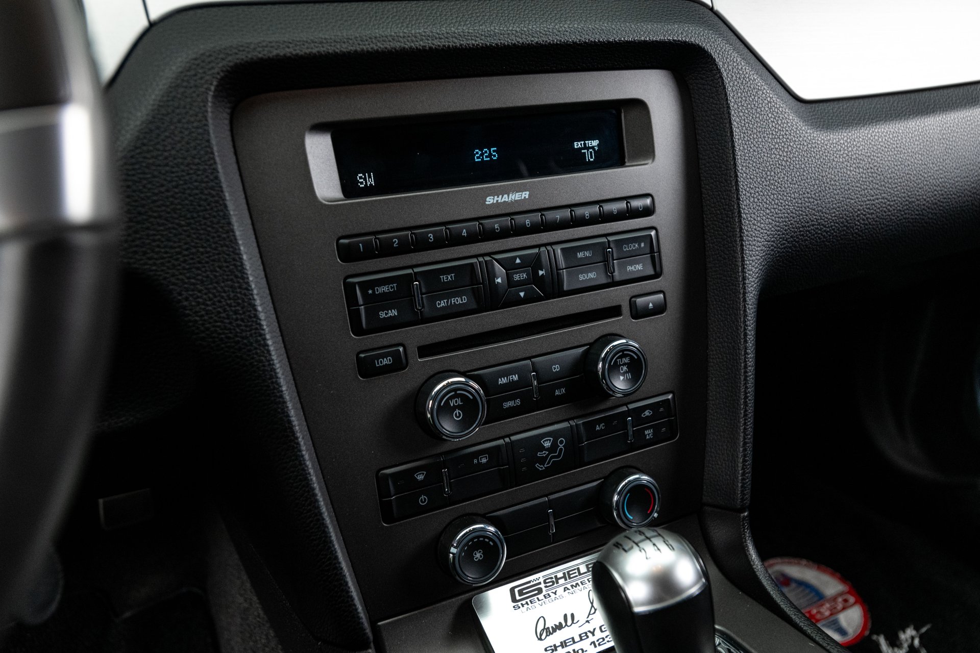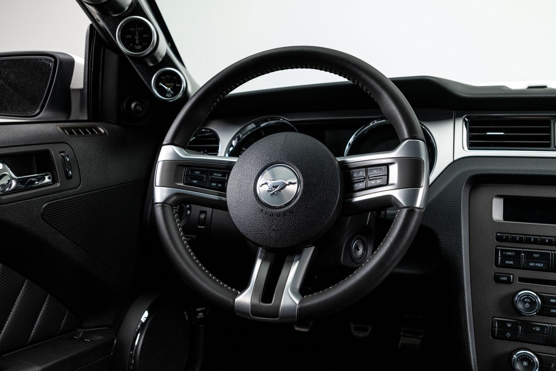 The car was finished in Performance White from the factory, with Guardsman Blue stripes and the GT350 Interior Package being added by Shelby American. Power is provided by a Whipple-supercharged 5.0-liter V8 linked with a six-speed manual transmission and a limited-slip differential. Options include Shelby-specific front and rear fascias, a hood scoop, an integrated rear spoiler, Wilwood brakes, revised handbrake and shift boots, a Shaker audio system, SYNC infotainment, dual-zone automatic climate control, cruise control.