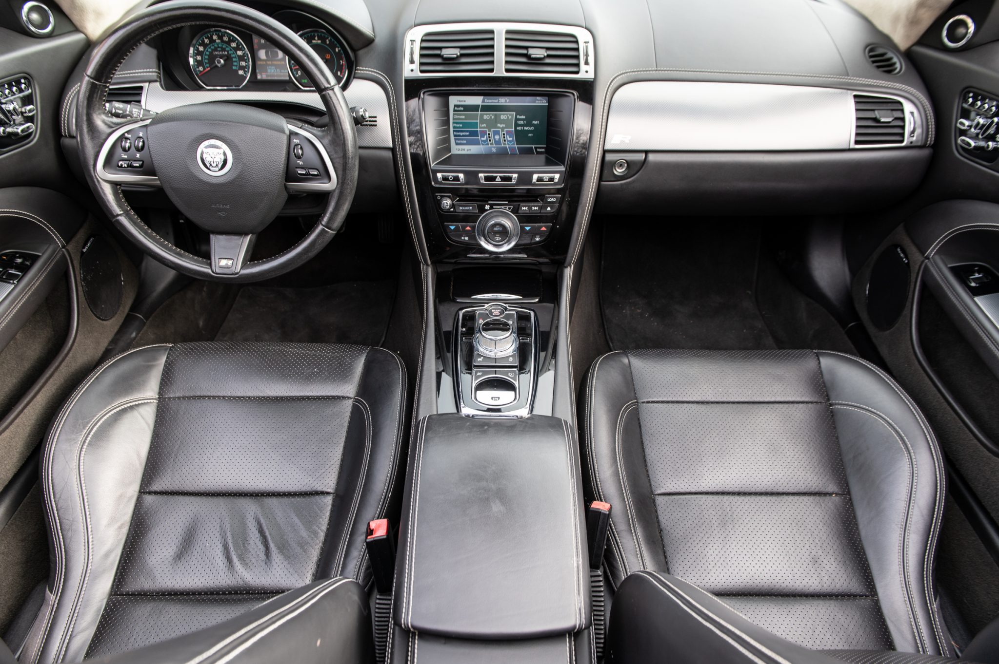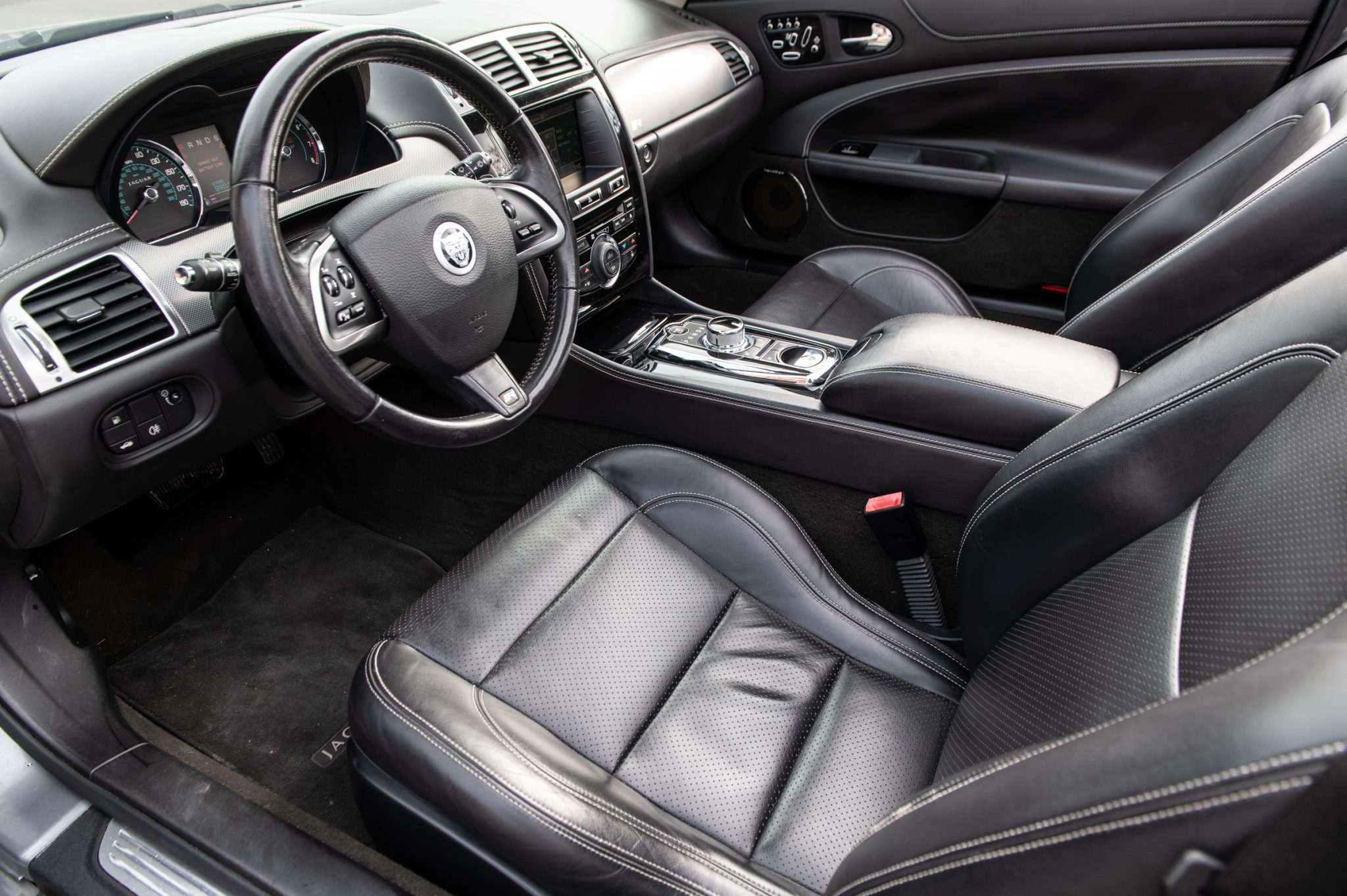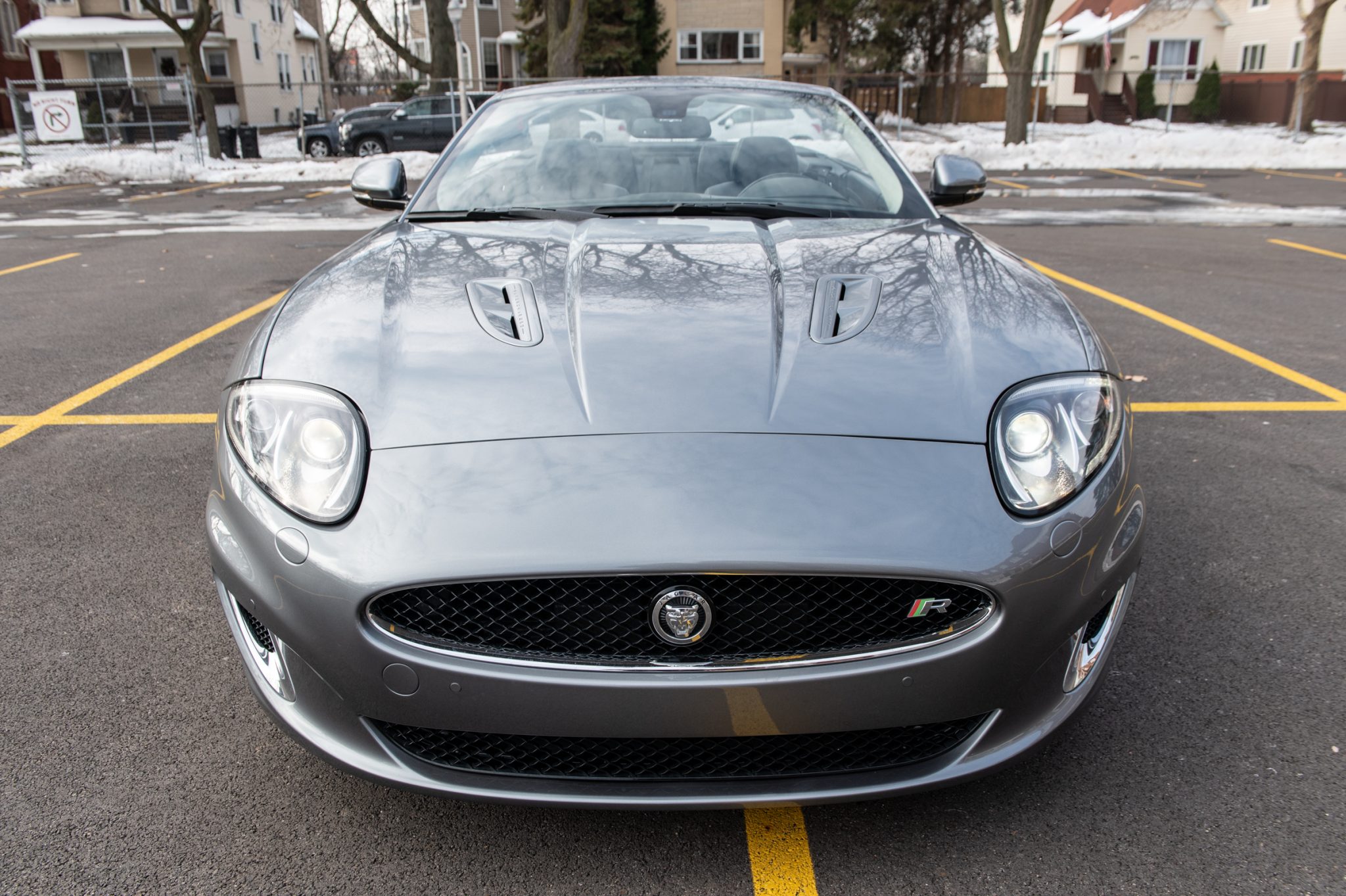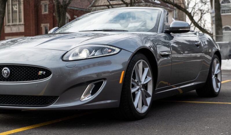 It is finished in Lunar Gray over Warm Charcoal soft-grain leather and is powered by a supercharged 5.0-liter V8 paired with a six-speed automatic transmission. Features include an active differential, a power-operated black soft top, xenon headlights, 19″ Tamana alloy wheels, heated power-adjustable front seats, navigation, a power-retractable rotary shift dial, push-button ignition, dual-zone automatic climate control, a back-up camera, and a Bowers & Wilkins sound system.
