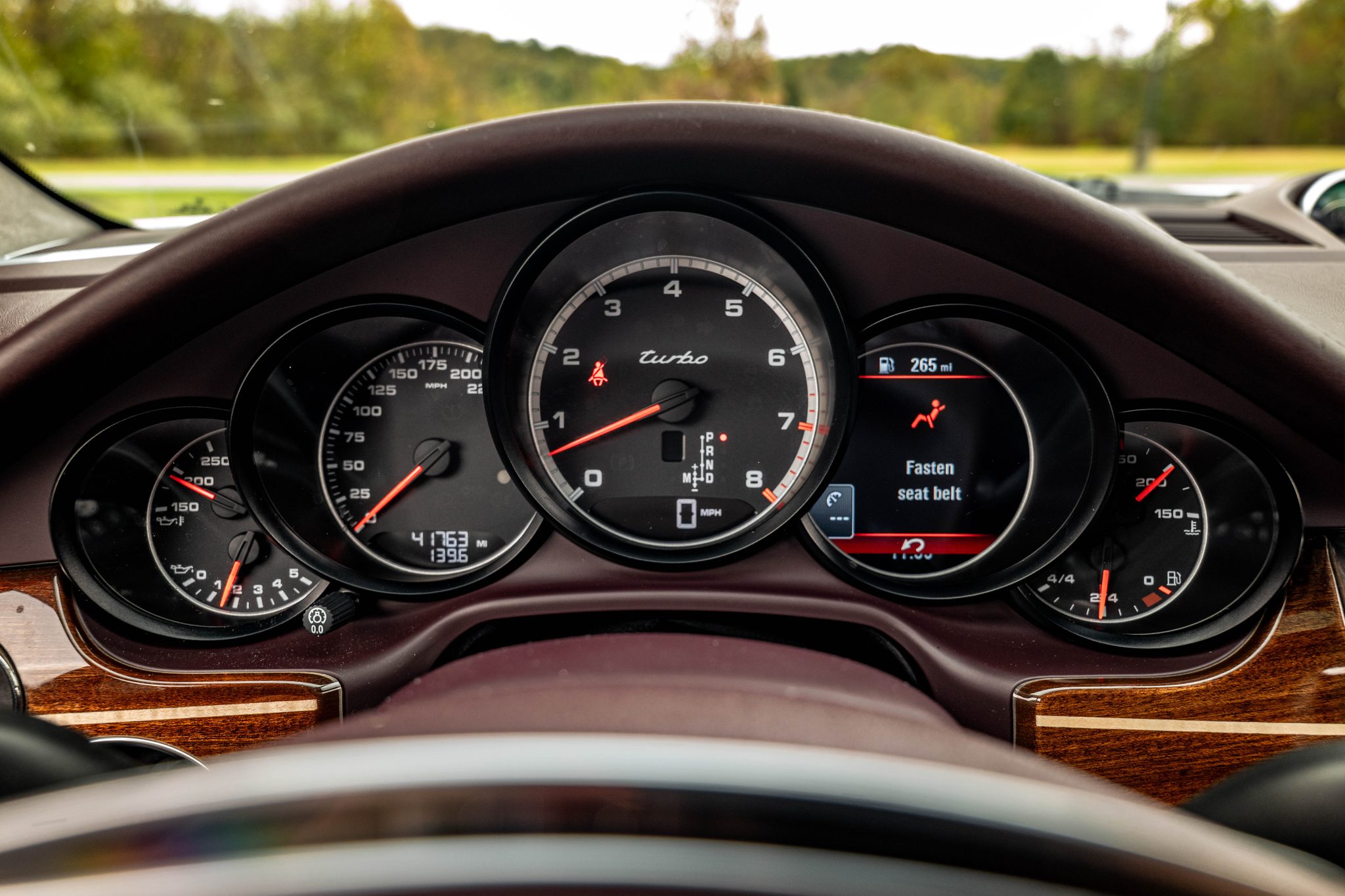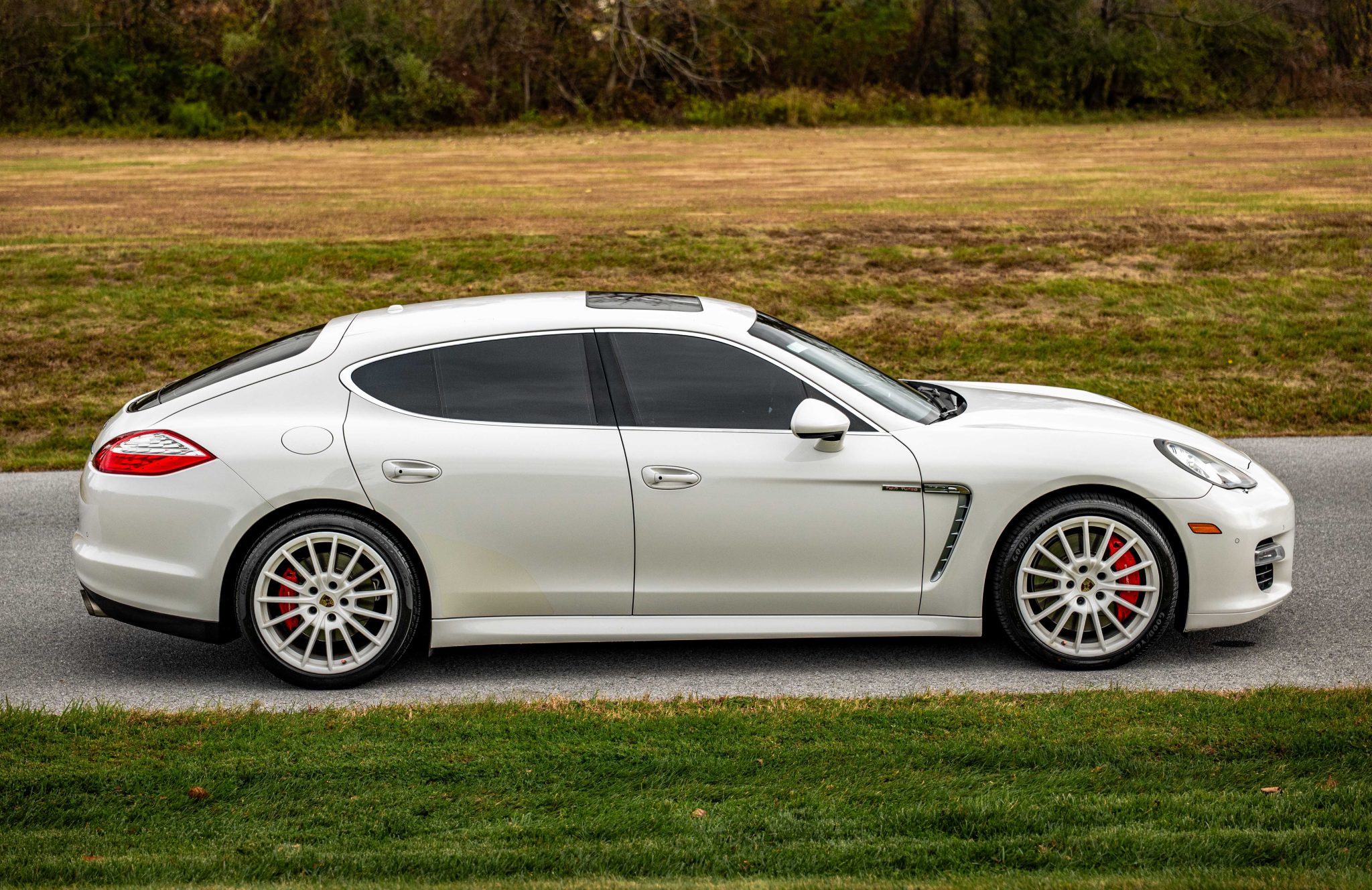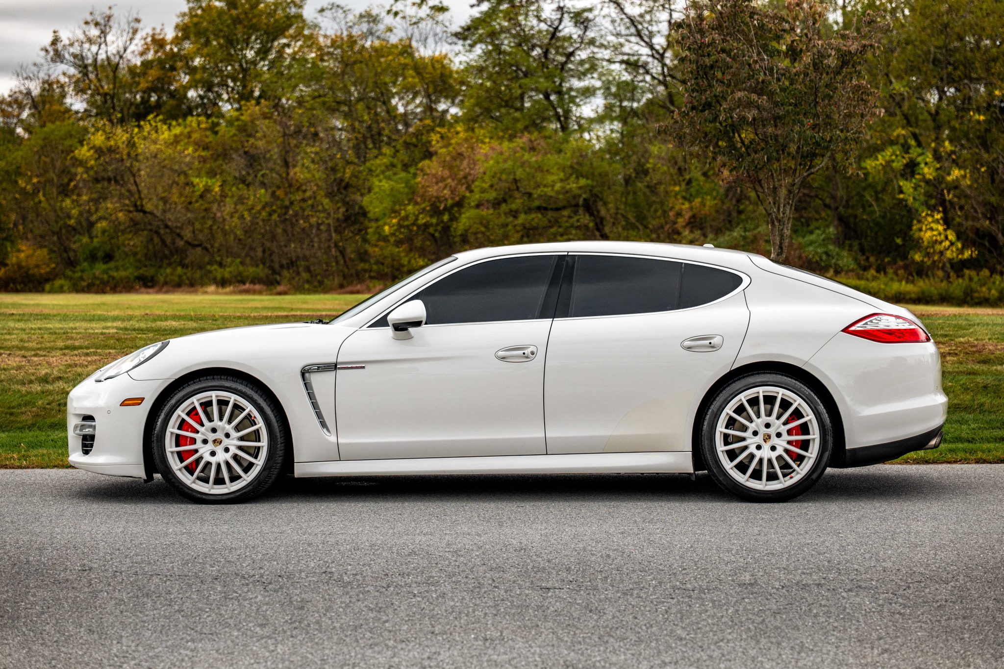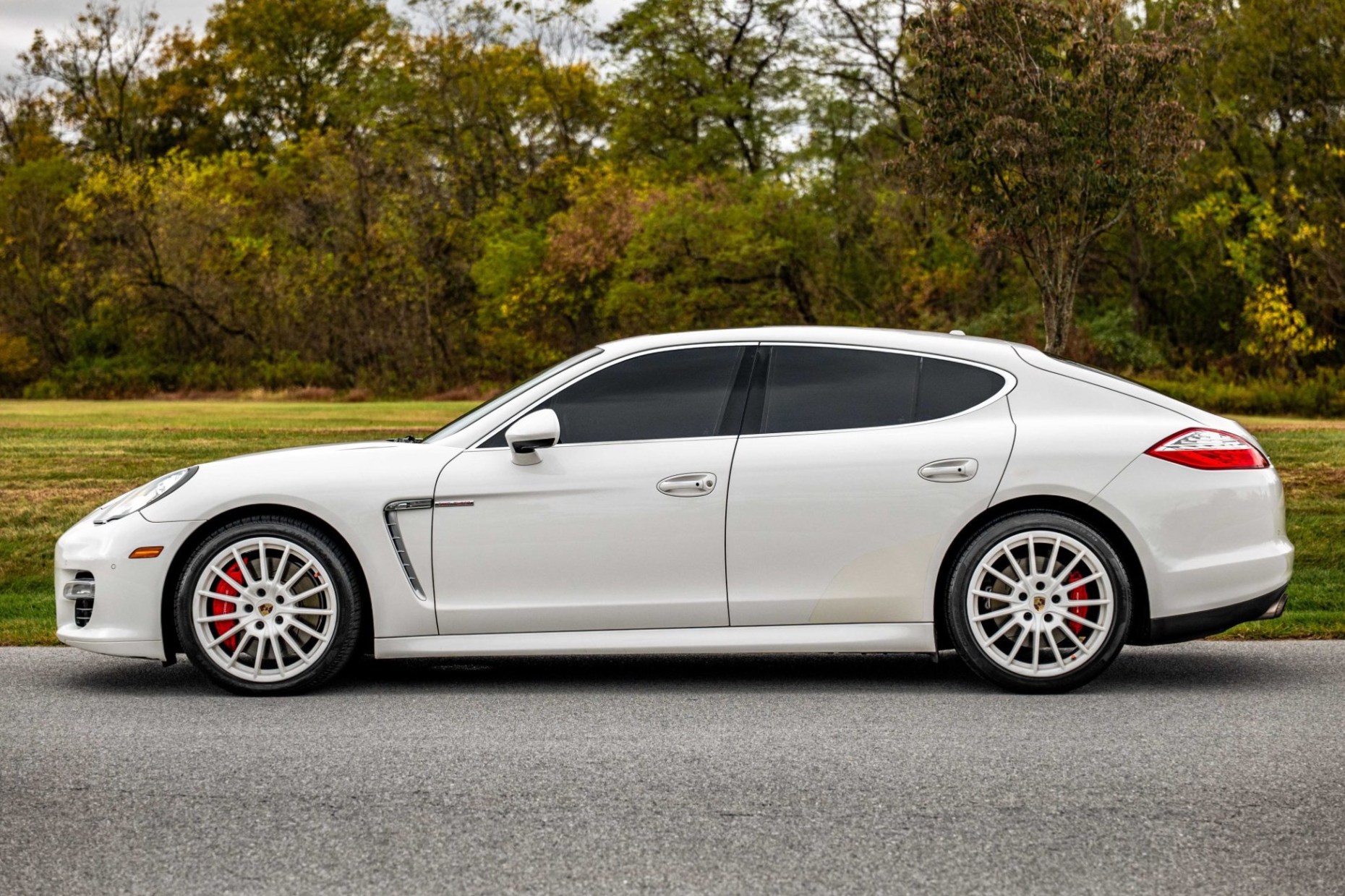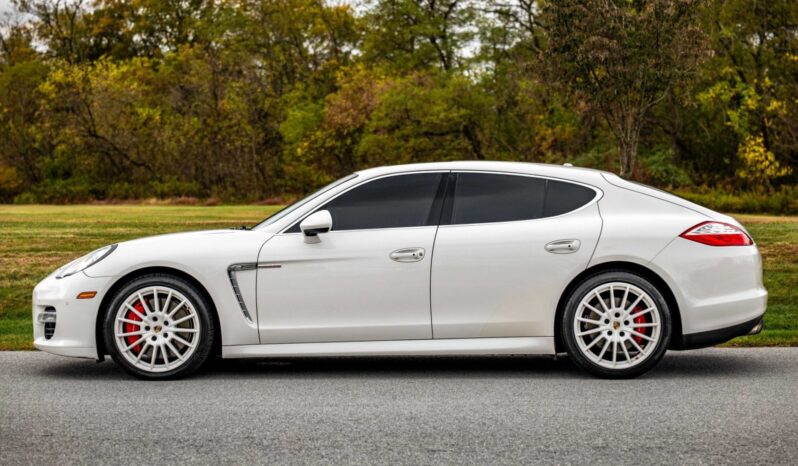 This 2012 Porsche Panamera Turbo is finished in Carrara White over Marsala Red Full leather and was ordered with the Comfort Plus, Mahogany Yachting Interior, and Sport Chrono Plus packages as well as a Burmester sound system, a Sport exhaust, adaptive cruise control, Carrara White 20″ Panamera Sport wheels, and four-zone climate control. Power is provided by a twin-turbocharged 4.8-liter V8 that drives all four wheels through a seven-speed PDK transmission.