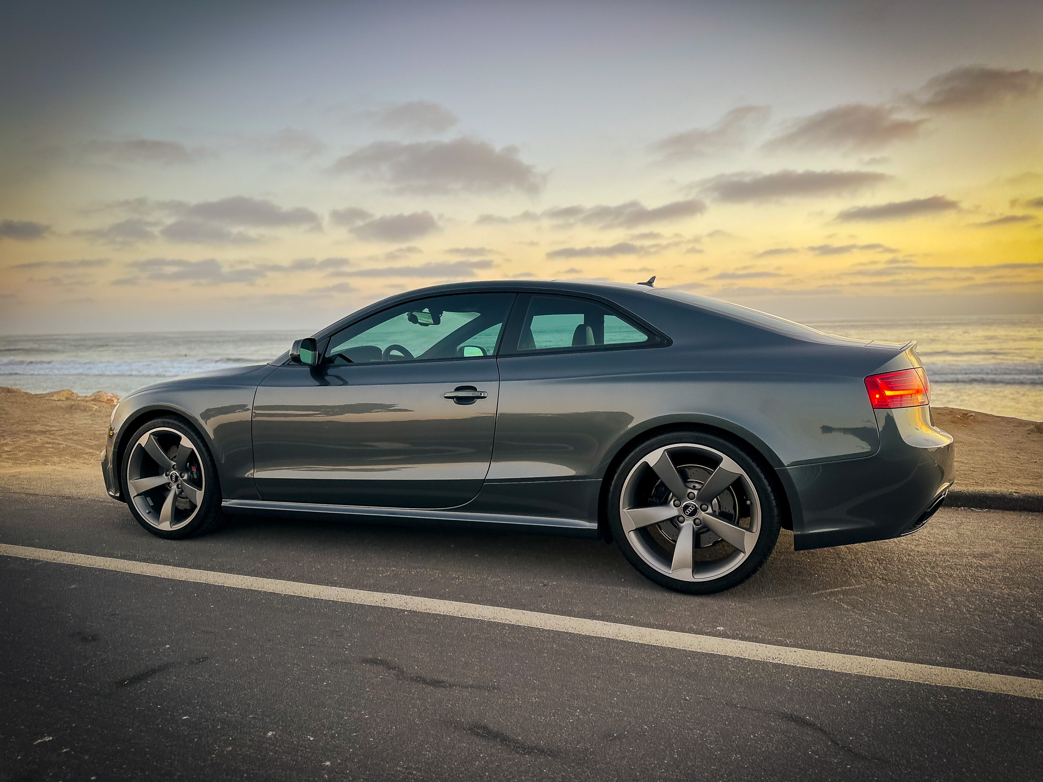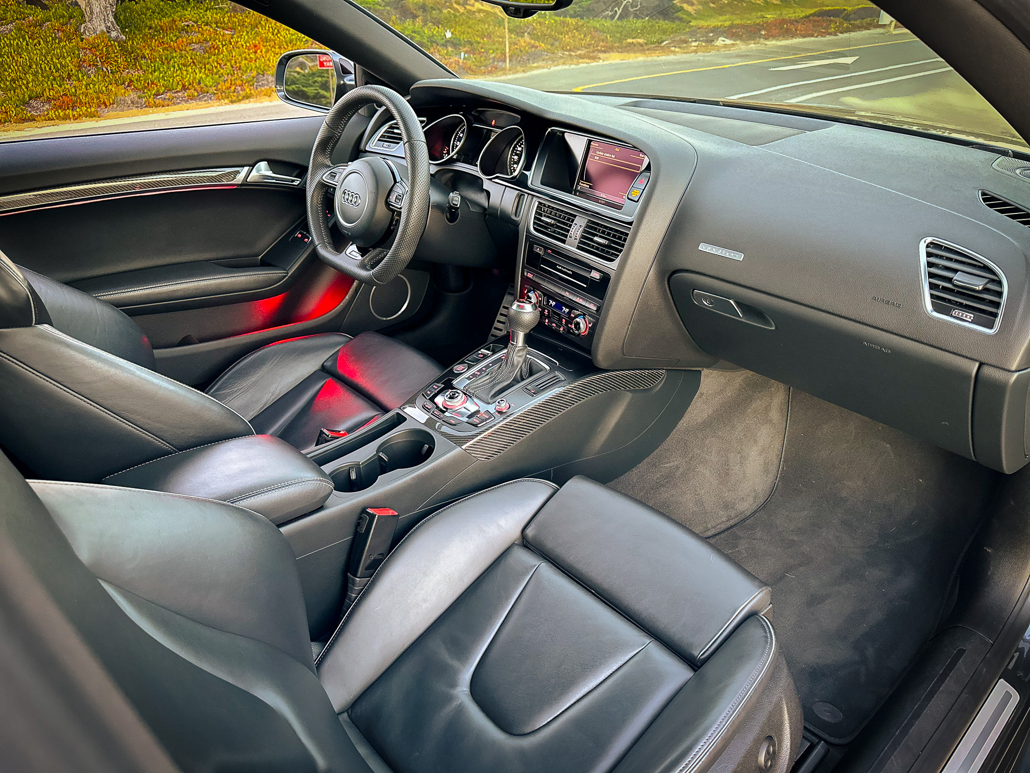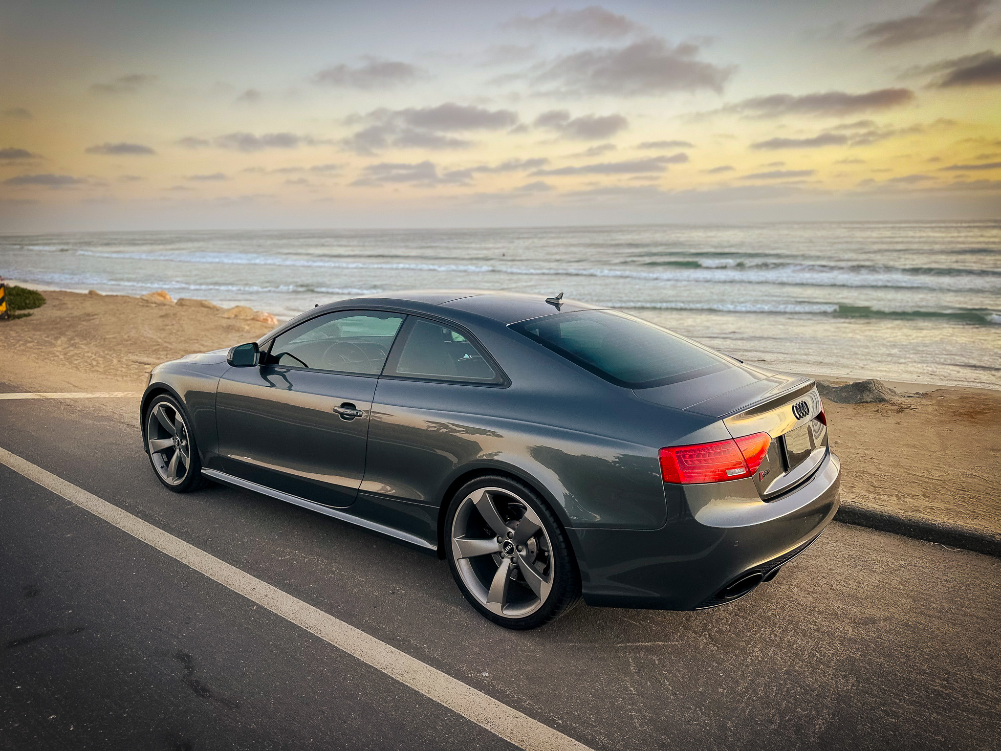 This 2013 Audi RS5 coupe is finished in Daytona Gray Pearl Effect over black Nappa leather and is powered by a 4.2-liter V8 that sends power to all four wheels through a seven-speed S tronic dual-clutch transaxle and Quattro all-wheel-drive with a sports rear differential. The car was optioned with the Audi MMI Navigation Plus, Driver Assist, and Titanium packages, and additional equipment includes a sport exhaust system, a glass sunroof, adaptive xenon headlights, parking sensors, 20″ five-arm rotor wheels, heated power-adjustable front seats, adaptive cruise control, and a Bang & Olufsen sound system.