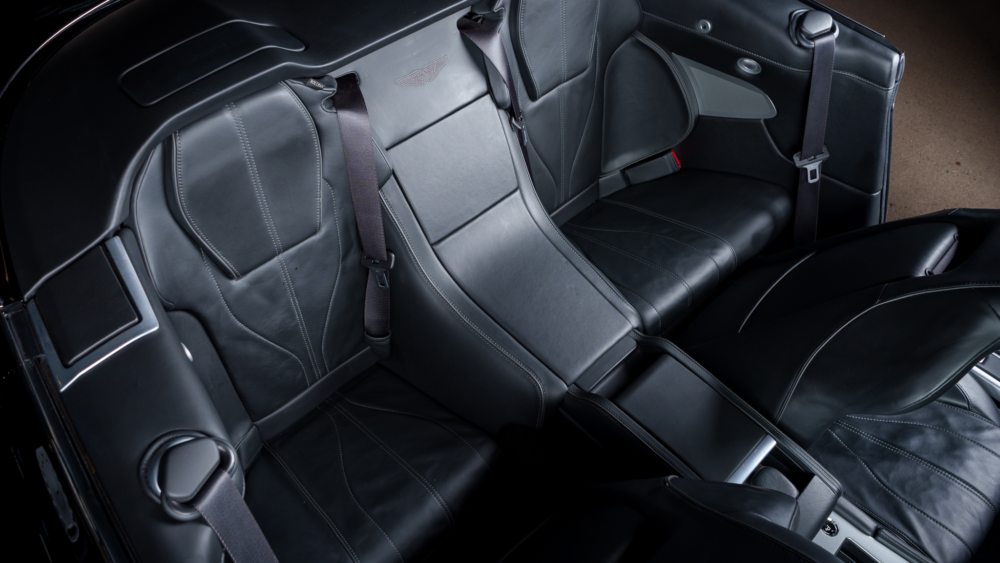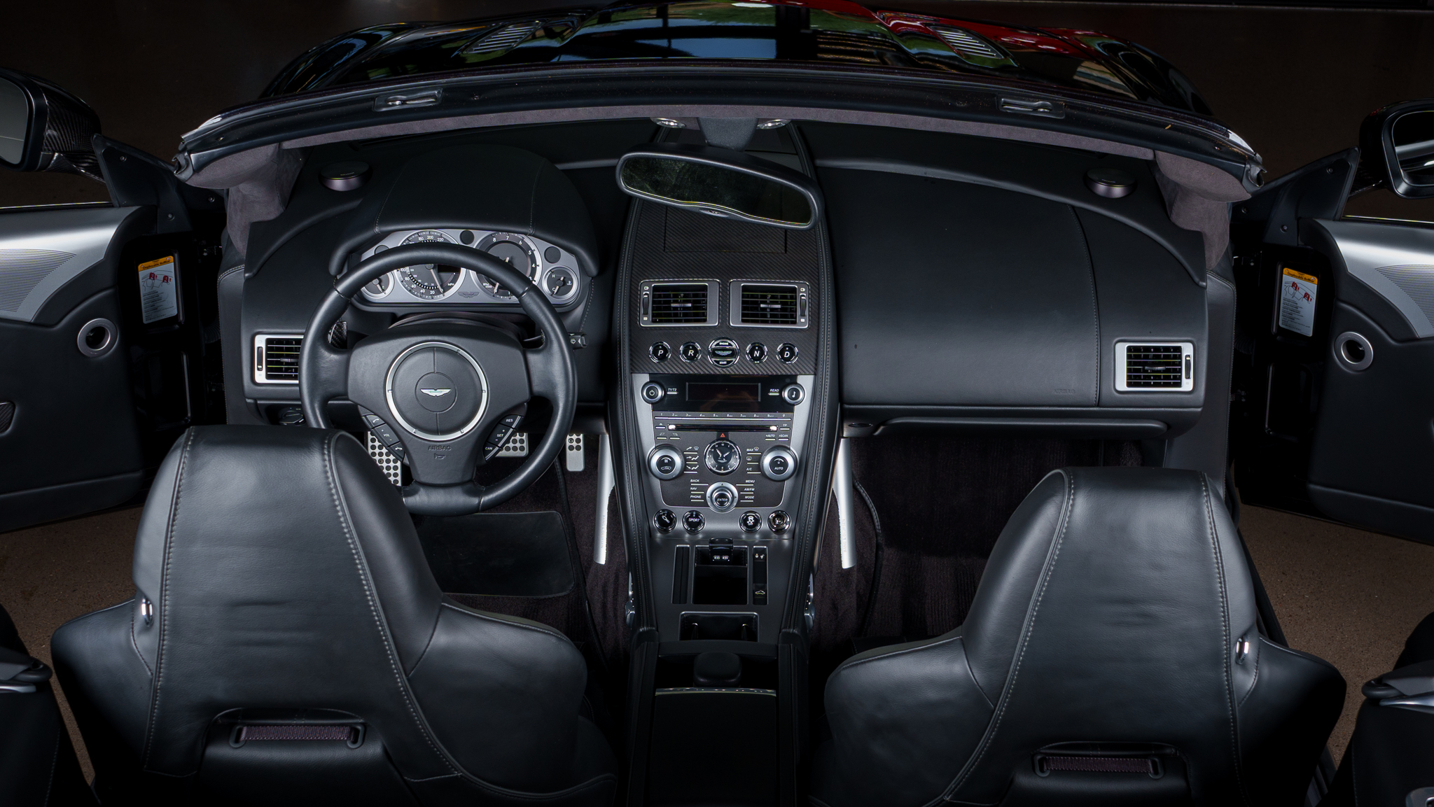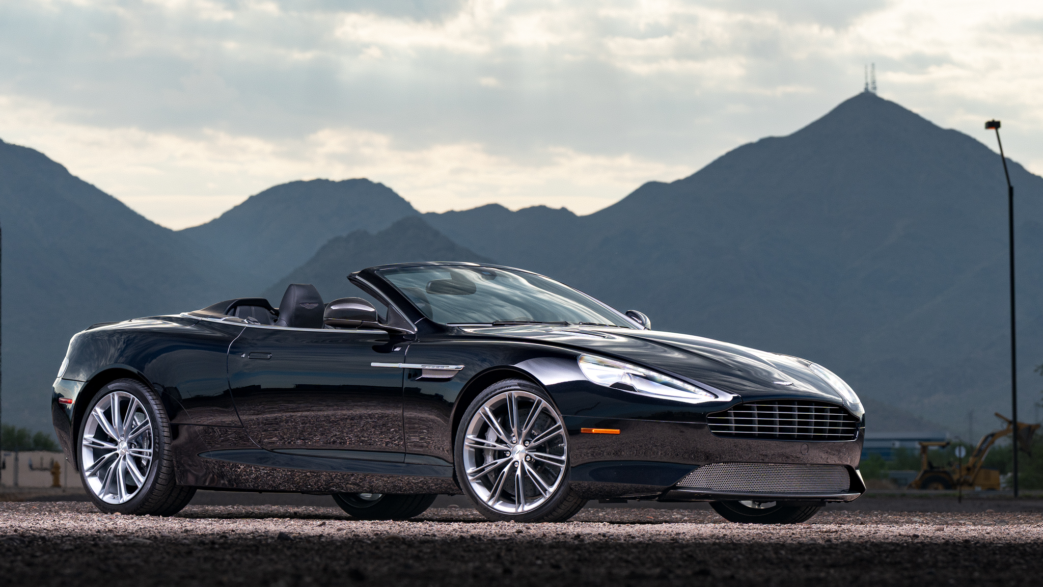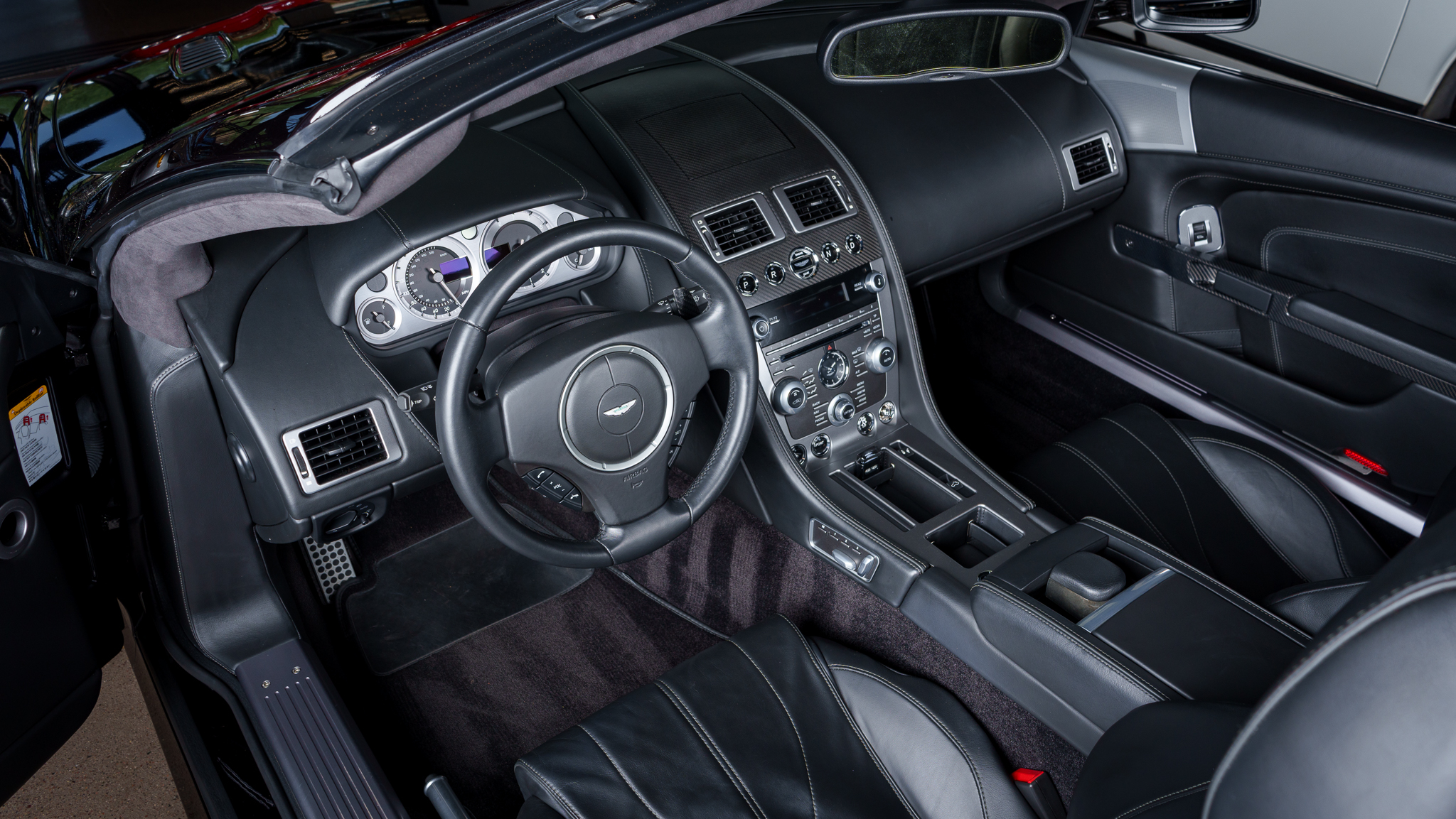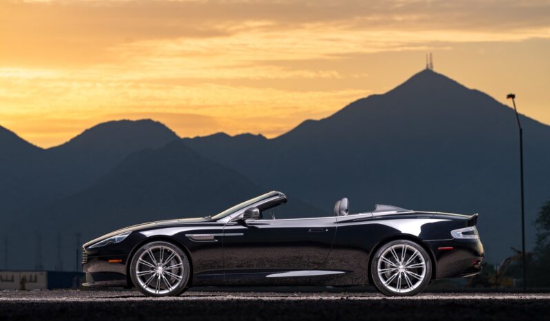 The car is powered by a 5.9-liter V12 linked with a six-speed automatic transaxle and a limited-slip differential, and it is finished in Onyx Black over Obsidian Black leather. A black convertible soft top is fitted along with parking sensors, 20″ split-spoke diamond-turned alloy wheels, ceramic-composite brakes, power-adjustable front seats, a rearview camera, a navigation system, a Bang & Olufsen sound system, and automatic climate control.