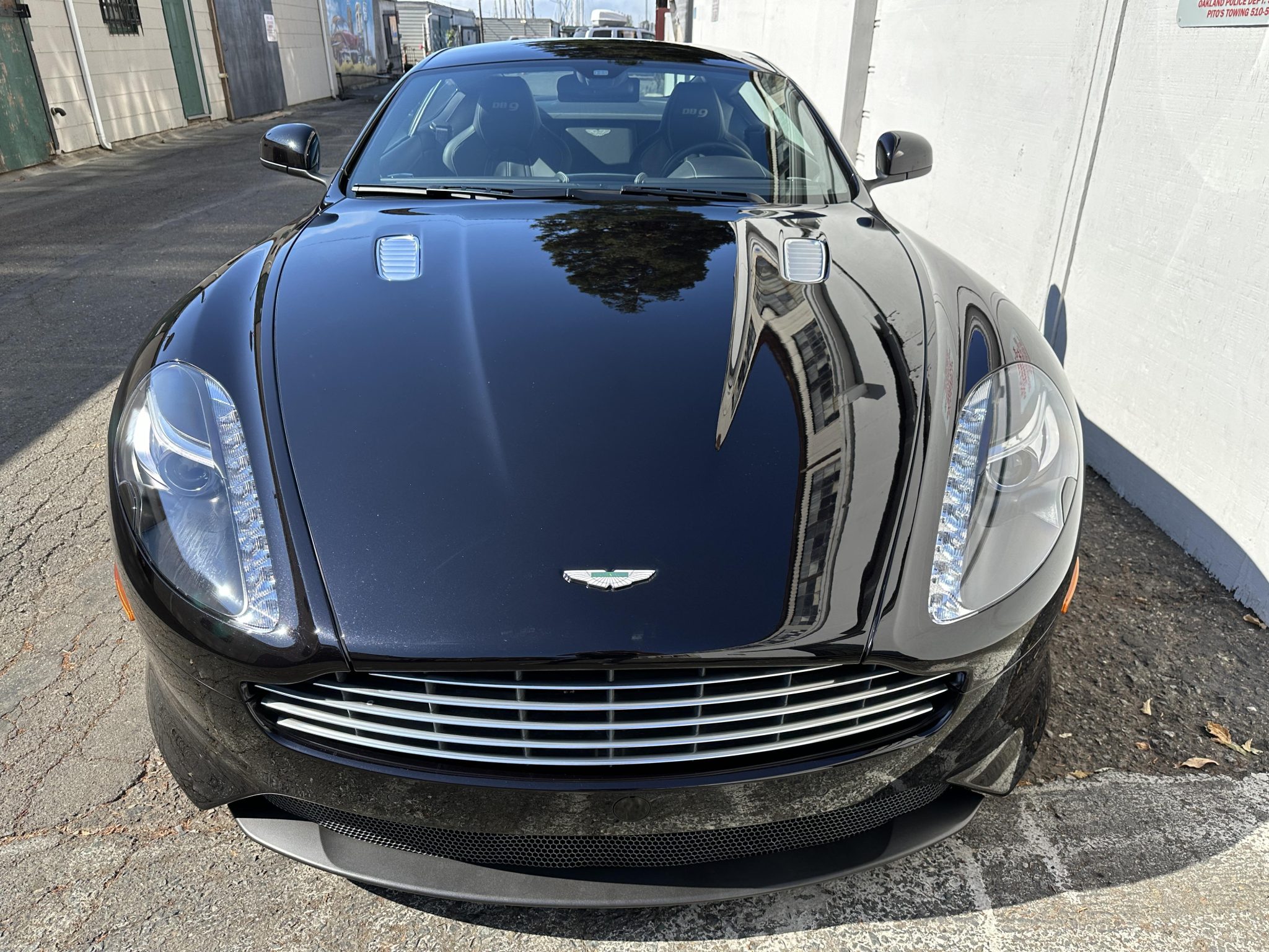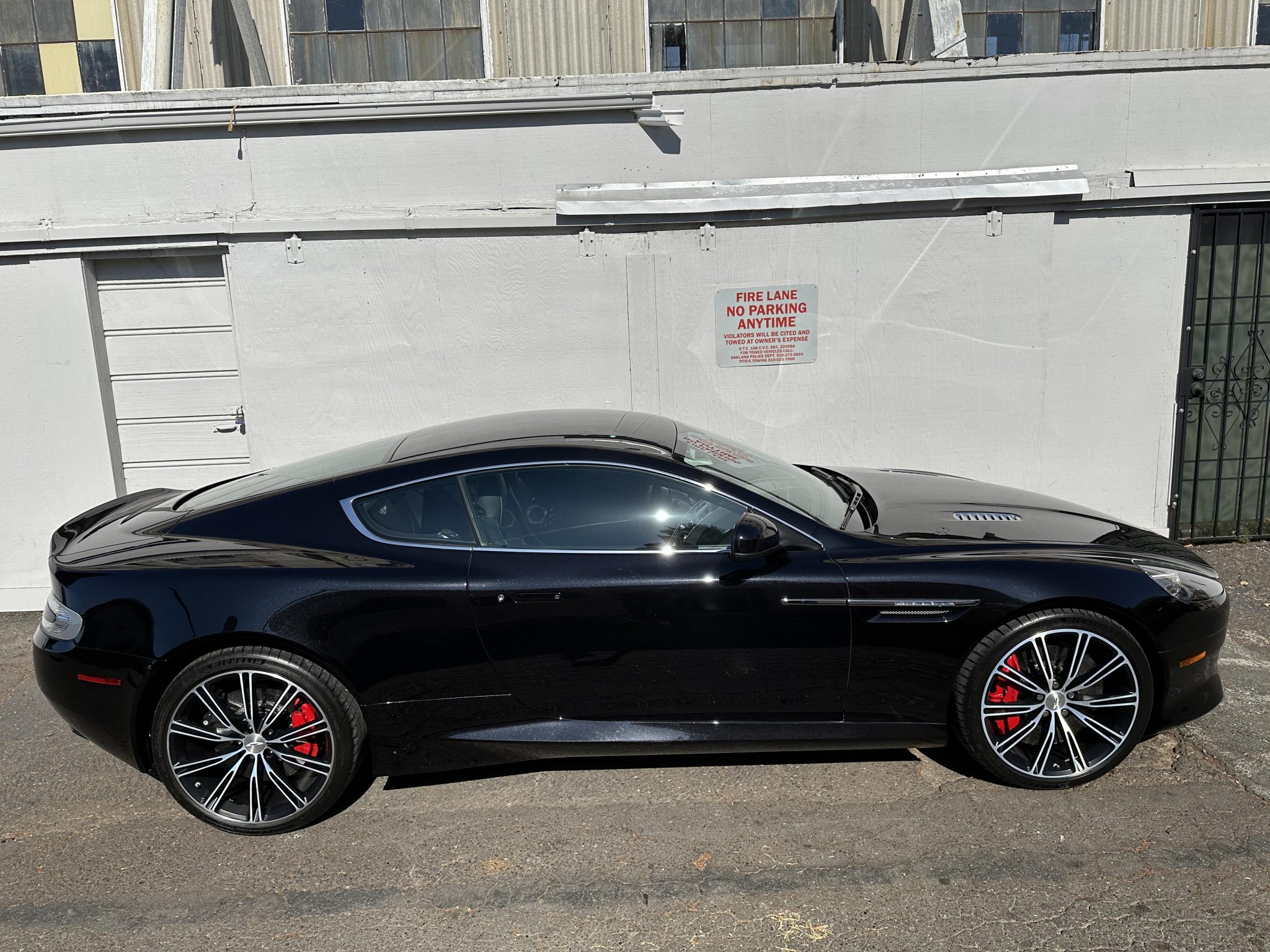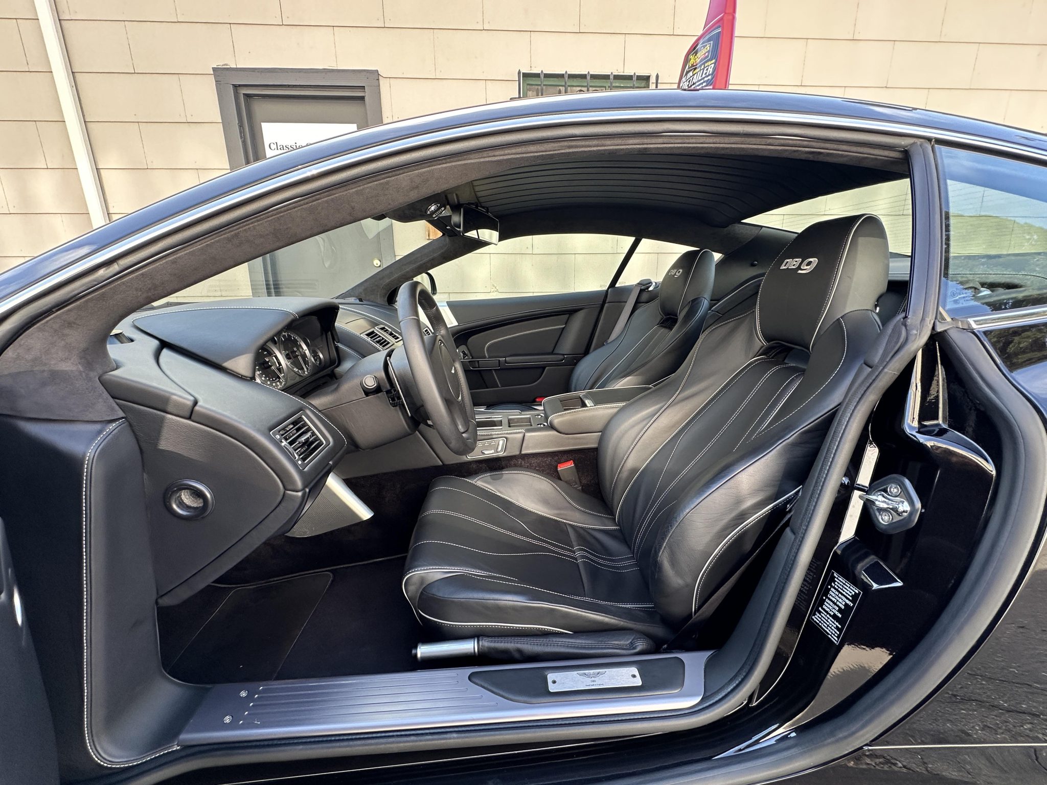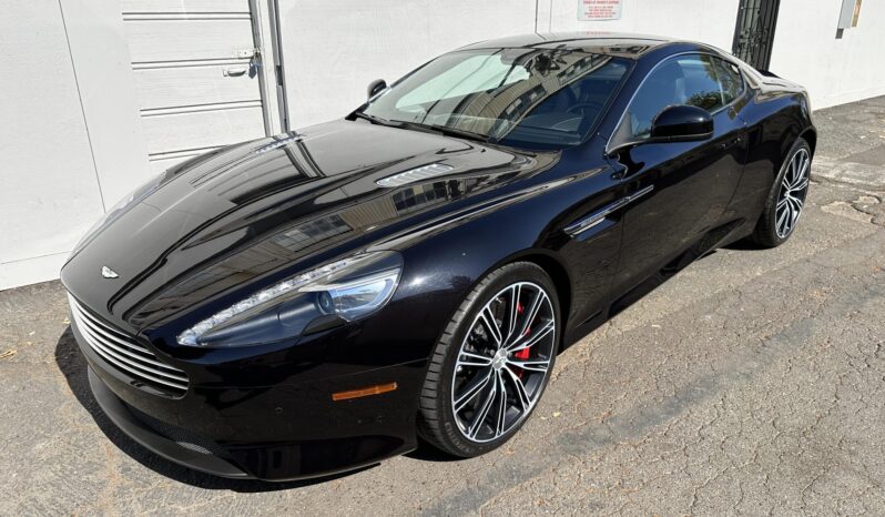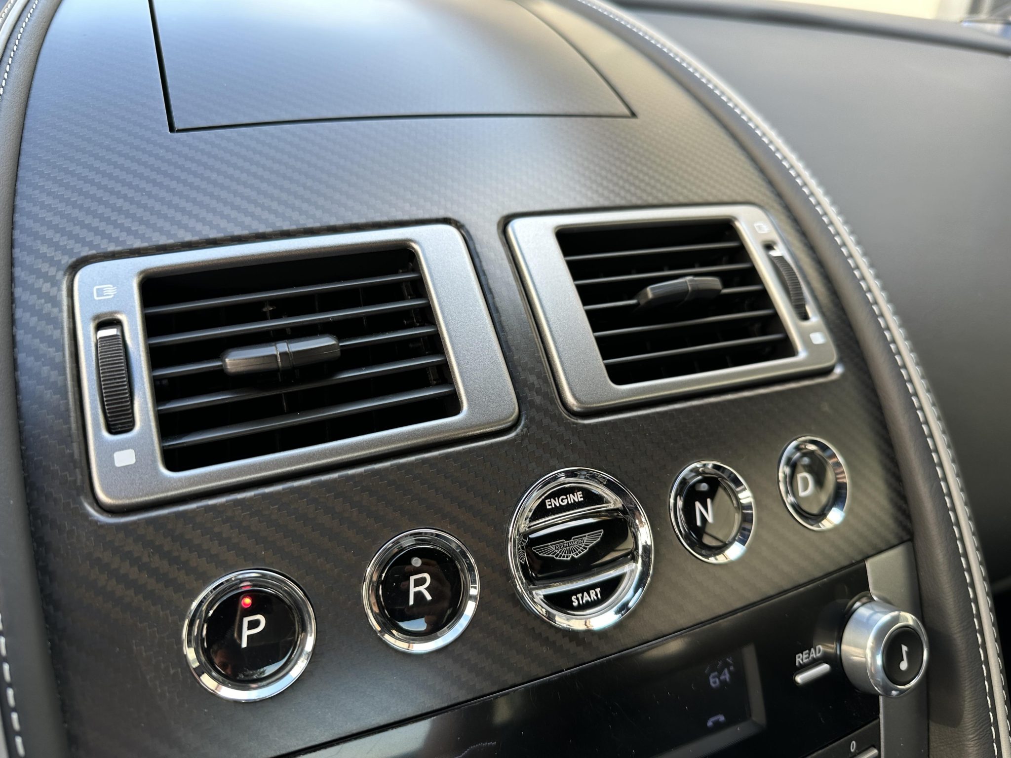 This 2014 Aston Martin DB9 is powered by a 5.9-liter V12 paired with a six-speed automatic transaxle and is finished in Onyx Black over Obsidian Black leather with Galena Silver stitching. It has ceramic-composite brakes, a limited-slip differential, 20″ split-spoke diamond-turned wheels, parking sensors, a rearview camera, carbon-fiber interior trim, heated power-adjustable seats, a Bang & Olufsen sound system, and a retractable navigation screen.