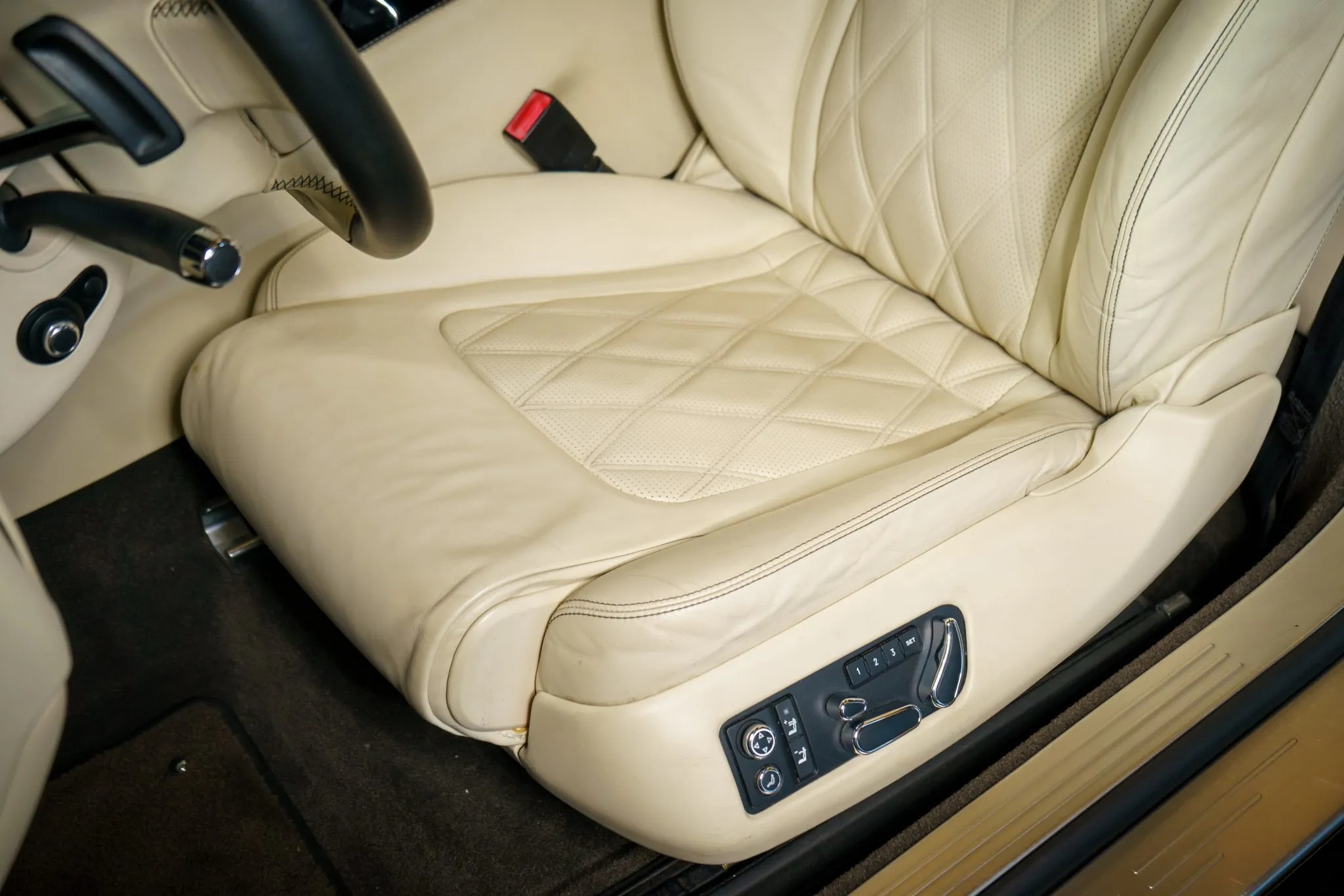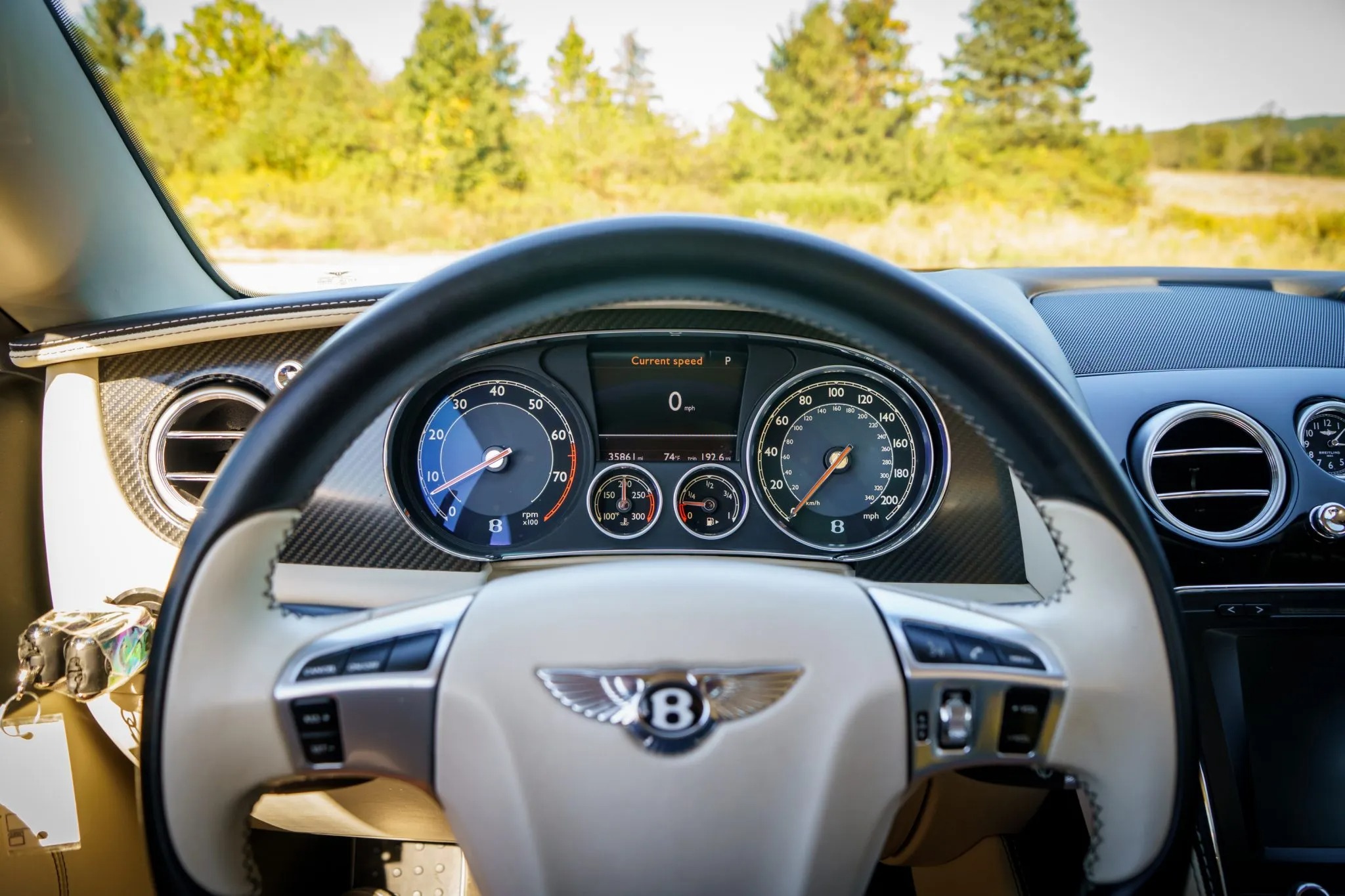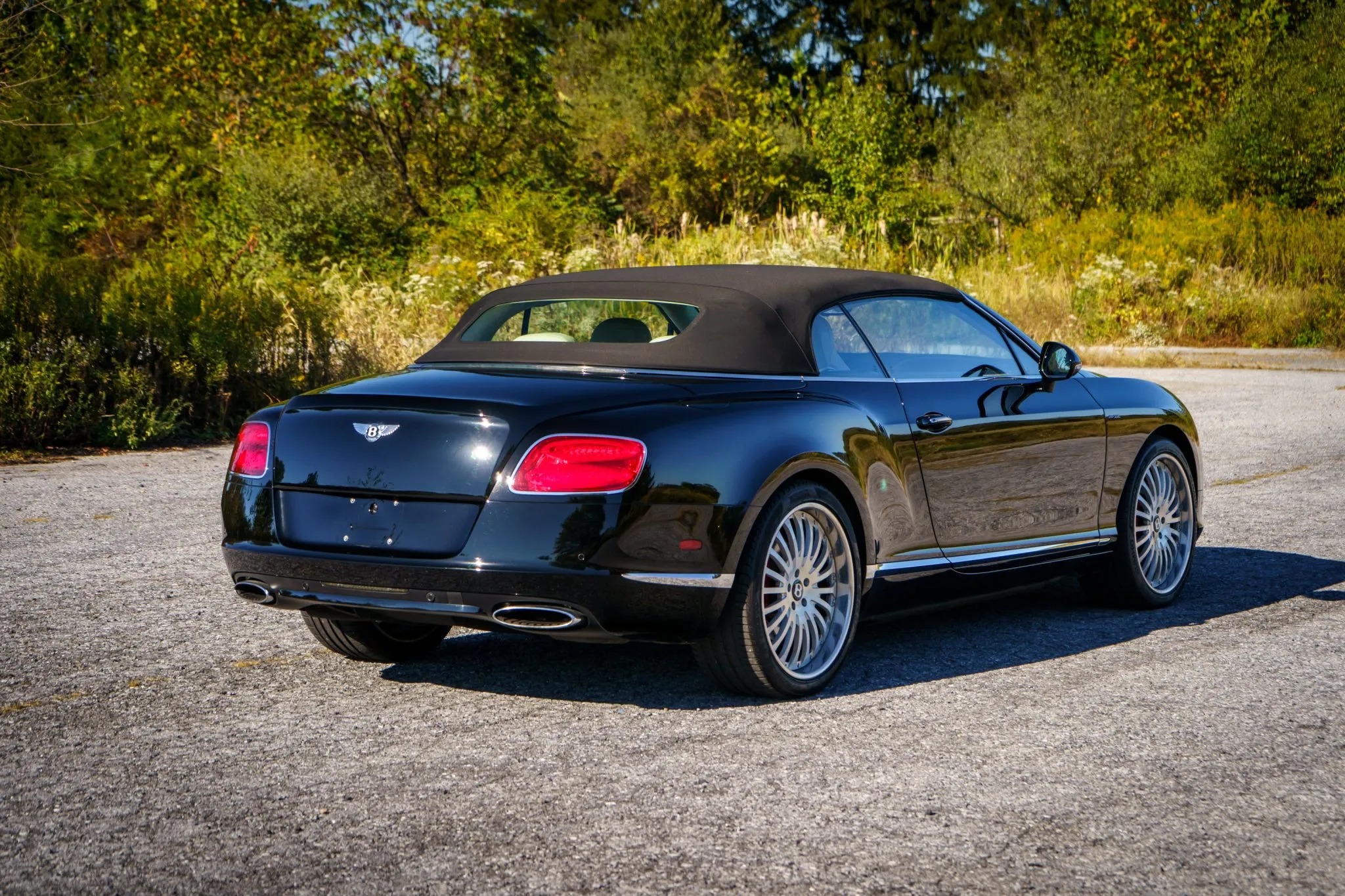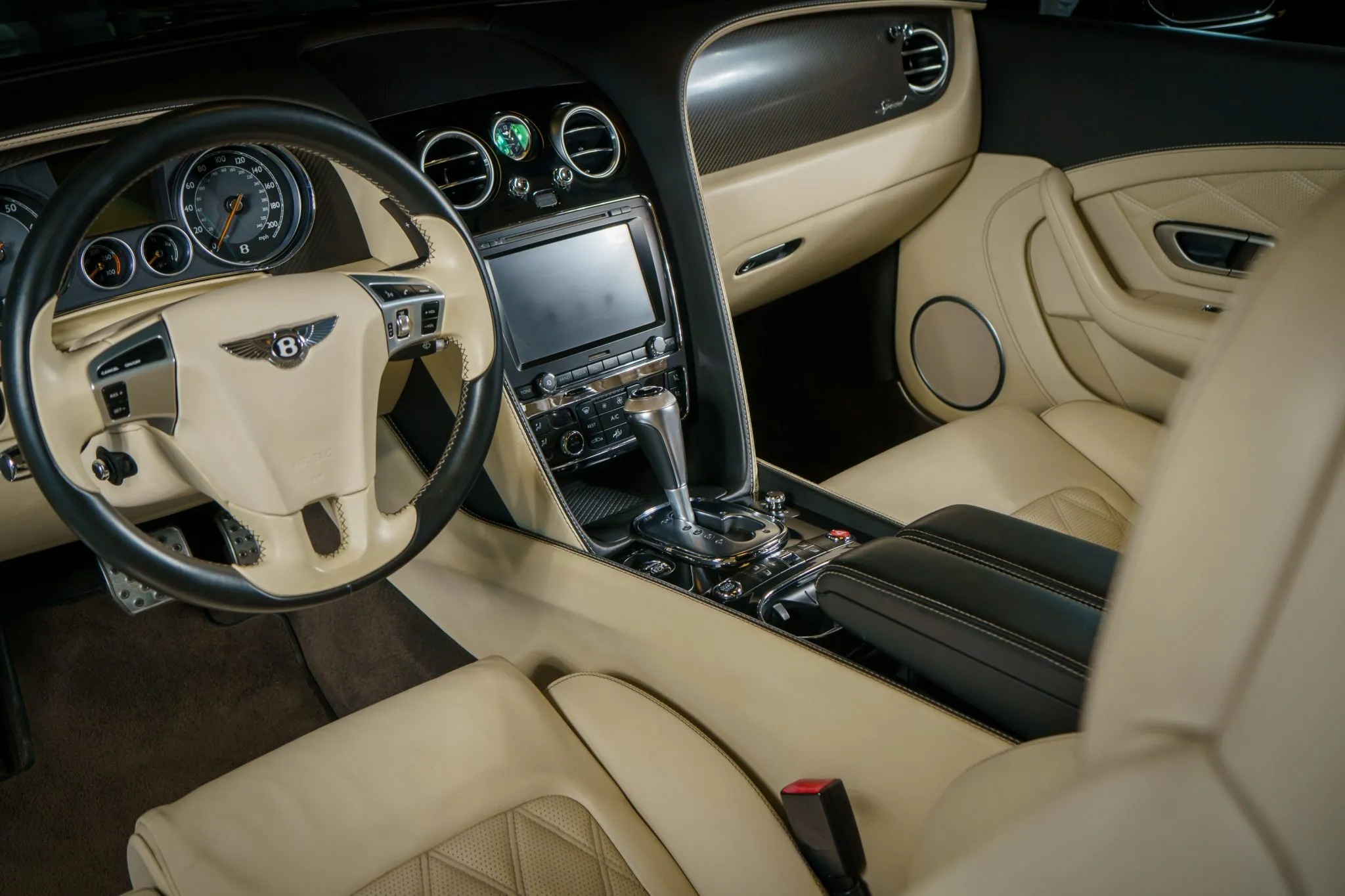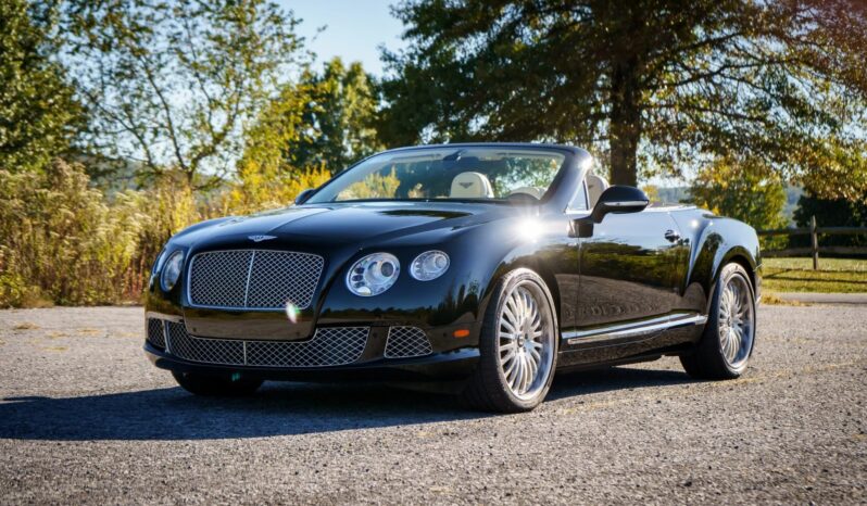 This 2014 Bentley Continental GTC Speed is finished in Beluga over Linen leather and is equipped with the Mulliner Driving Specification, carbon-fiber interior trim, a Black soft top, a back-up camera, air suspension, aftermarket 21″ wheels, and heated, ventilated, and massaging front seats with neck warmers. It is powered by a 616-horsepower twin-turbocharged 6.0L W12 that drives all four wheels through an eight-speed automatic transaxle