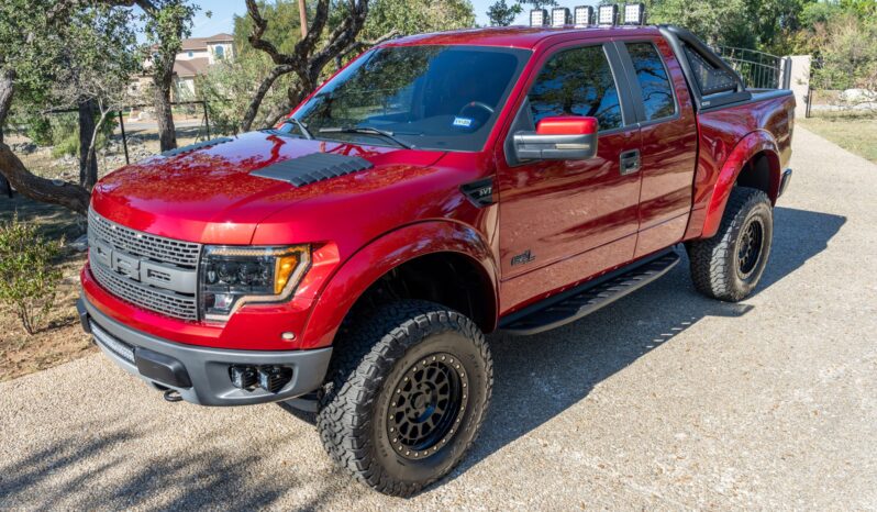 This 2014 Ford F-150 SVT Raptor SuperCab Special Edition is finished in Ruby Red Metallic over Black and Brick Red leather and cloth and is powered by a 6.2-liter Boss V8 that has been fitted with a Roush supercharger, air intake, and exhaust system. Power is routed to the rear or all four wheels through a six-speed automatic transmission, a dual-range transfer case, and an electronically locking rear differential. Features include the Luxury Package, a Fabtech 4″ suspension lift, Fox Racing internal-bypass shocks, 18″ Black Rhino Primm wheels, paint protection film, a Go Rhino Sport Bar 2.0, Morimoto LED headlights, Rigid LED lights, heated and cooled front seats, and SYNC infotainment with navigation.