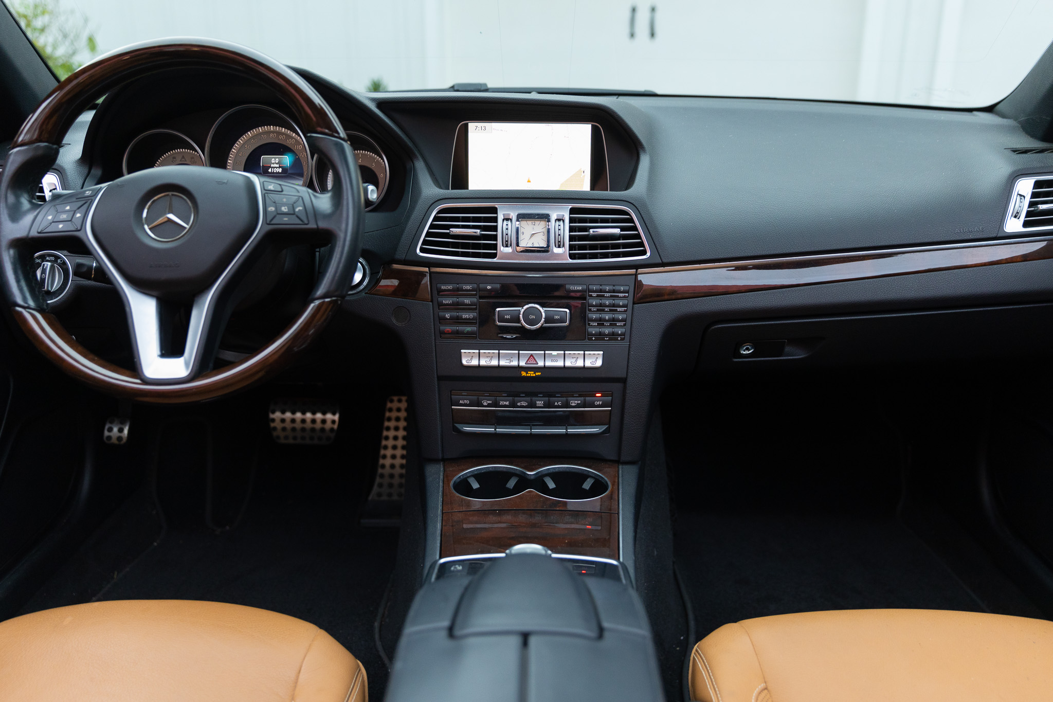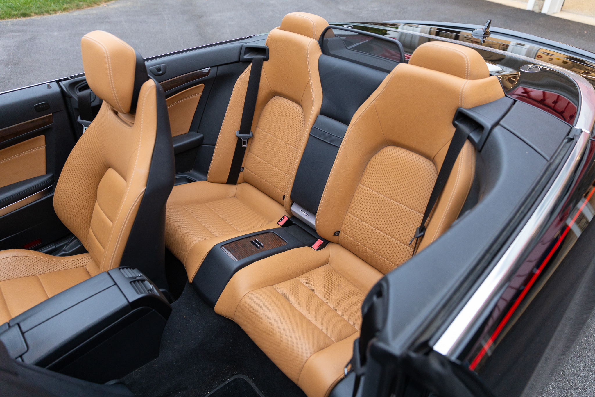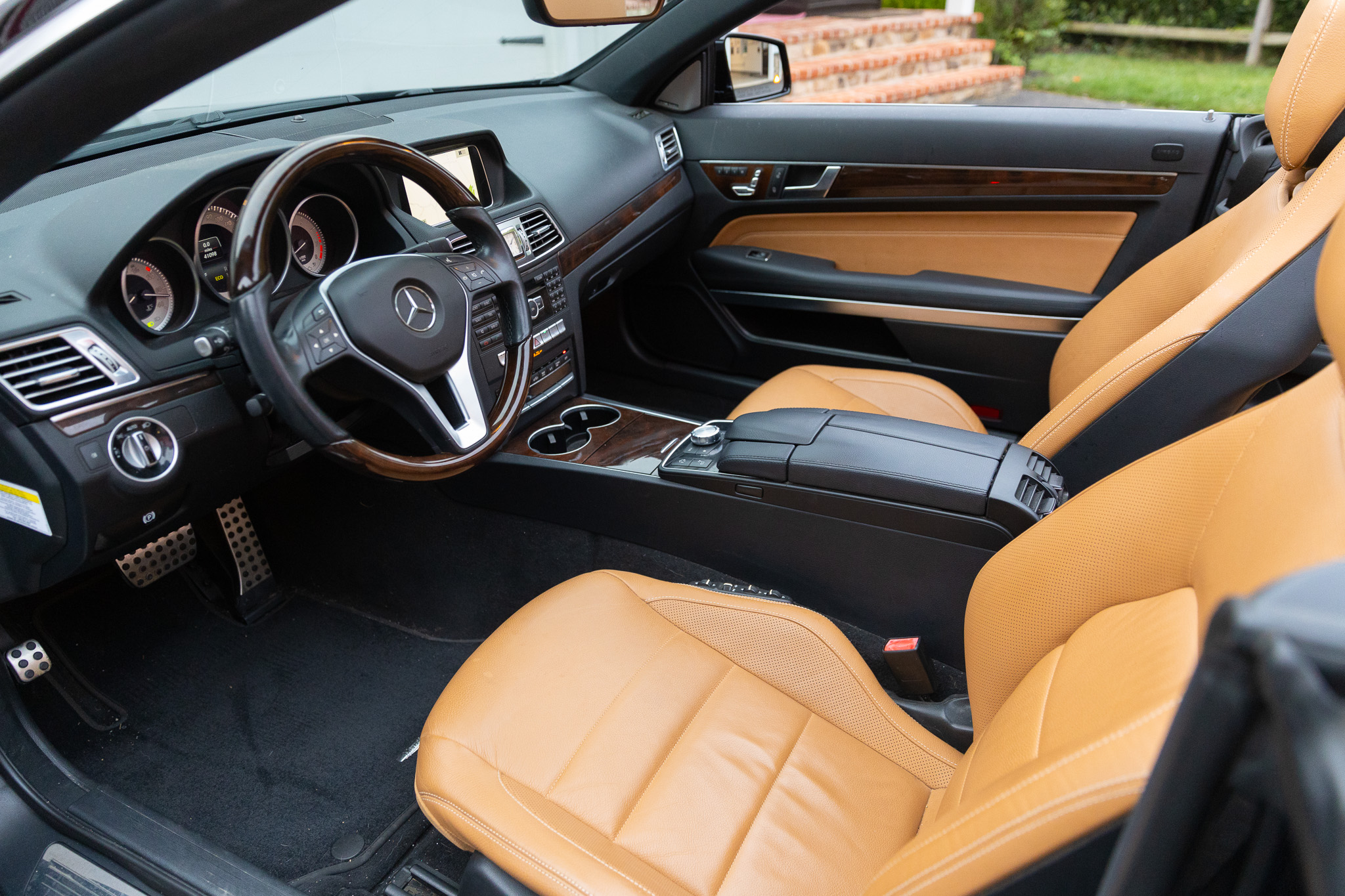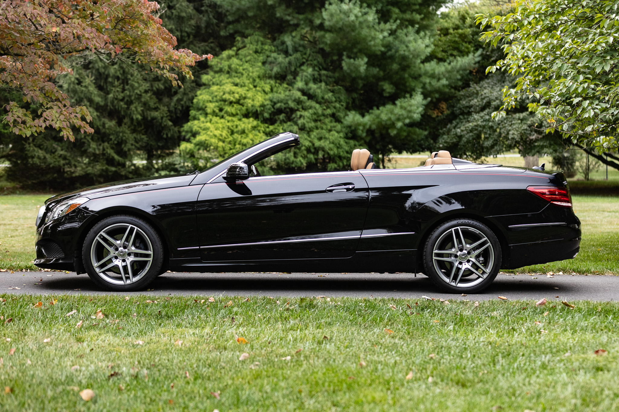 The car is finished in black over brown leather and is powered by a 3.5-liter V6 paired with a seven-speed automatic transmission. Additional equipment includes LED headlights, a black convertible top, 18″ AMG split-spoke wheels, a back-up camera, Blind Spot Assist, Lane Keeping Assist, navigation, heated front seats, a Harman Kardon sound system, Keyless Go, and dual-zone automatic climate control.