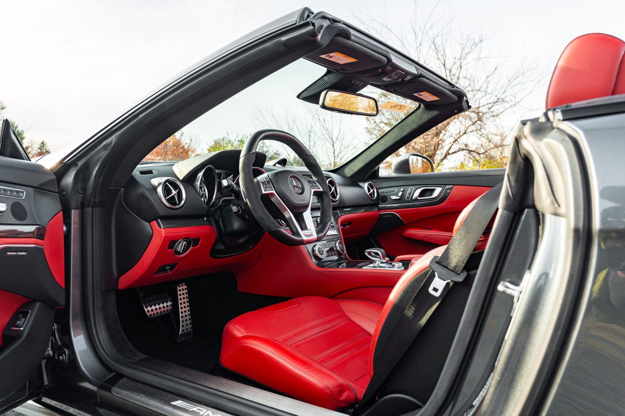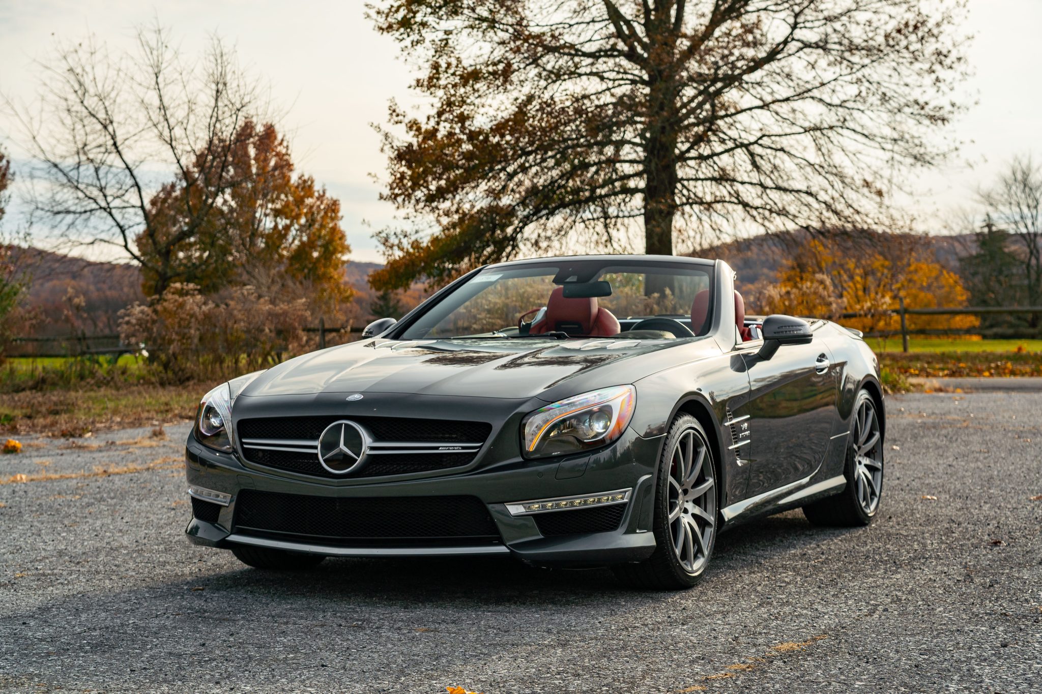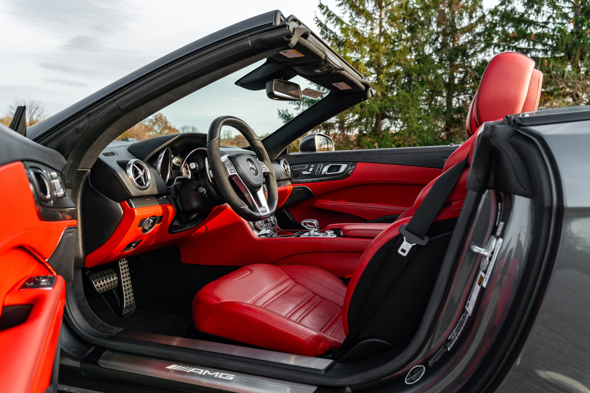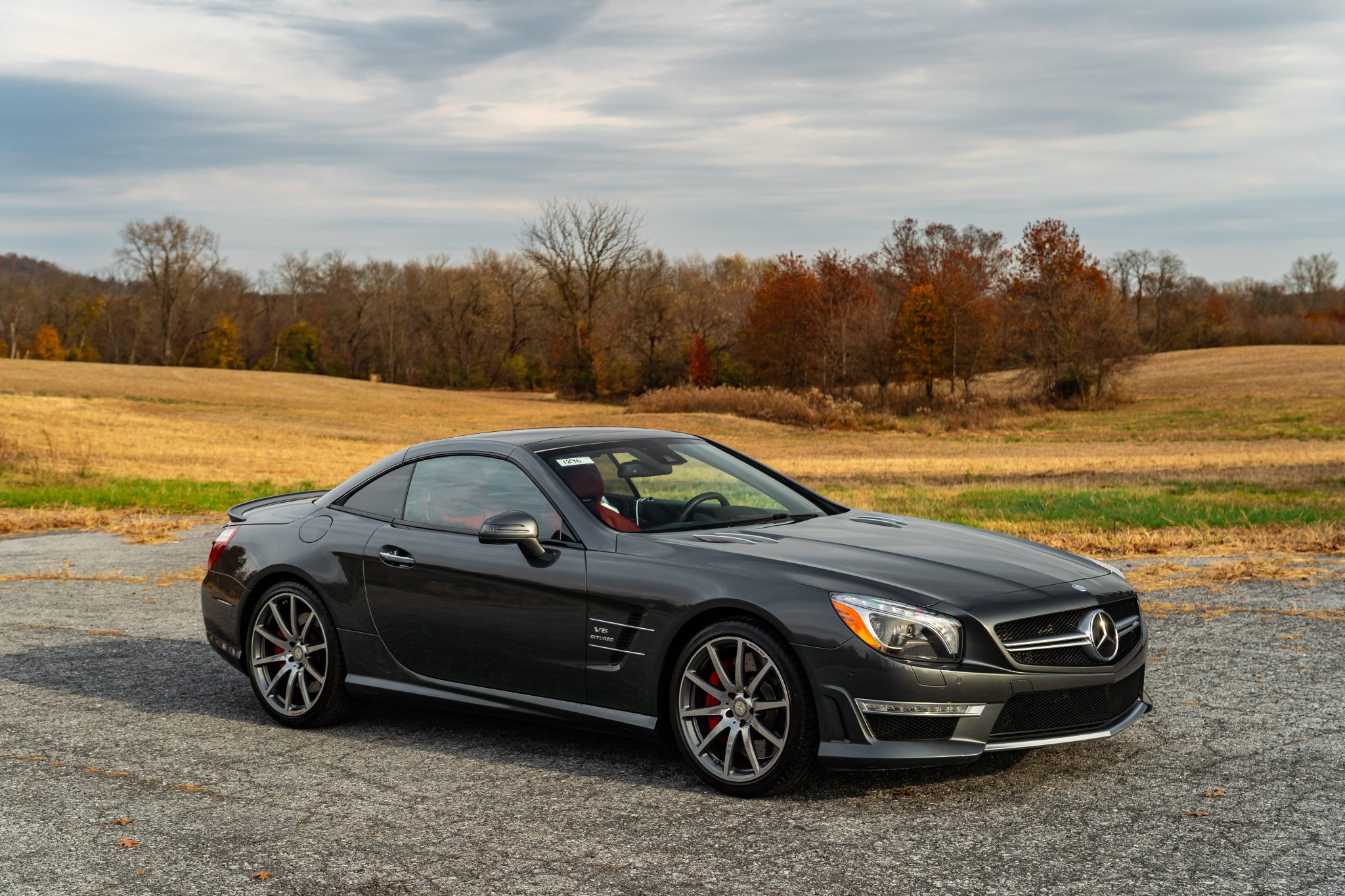 Specified in Designo Graphite Metallic over designo Classic Red Nappa leather, the car was optioned with the Diver Assistance Package as well as red-painted brake calipers, soft-close doors, carbon-fiber interior trim, an AMG Performance steering wheel, and staggered-width AMG 10-spoke wheels. Powered by a twin-turbocharged 5.5-liter V8 linked with a seven-speed automatic transmission and a limited-slip differential, the car is equipped with a power-retractable hardtop, a panoramic roof, blind-spot monitoring, Lane Keeping Assist, Parktronic, a back-up camera, heated and ventilated seats, a Harman Kardon sound system, and COMAND infotainment with navigation.