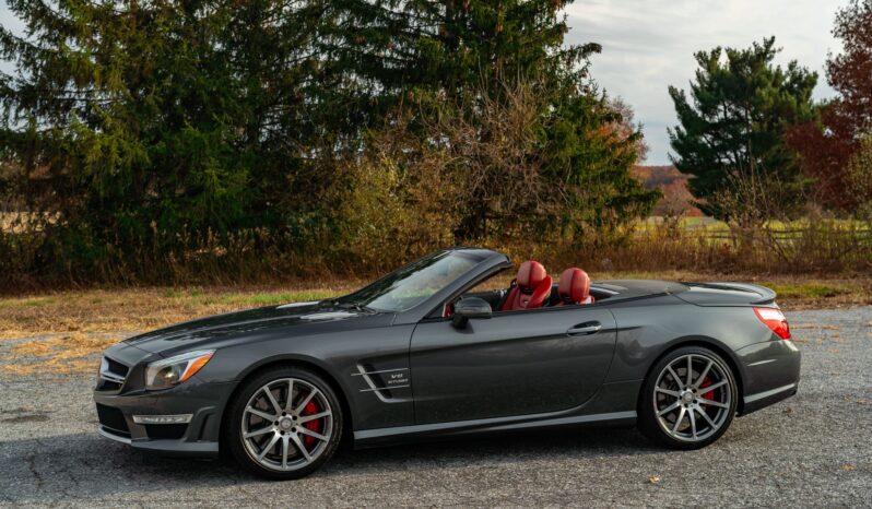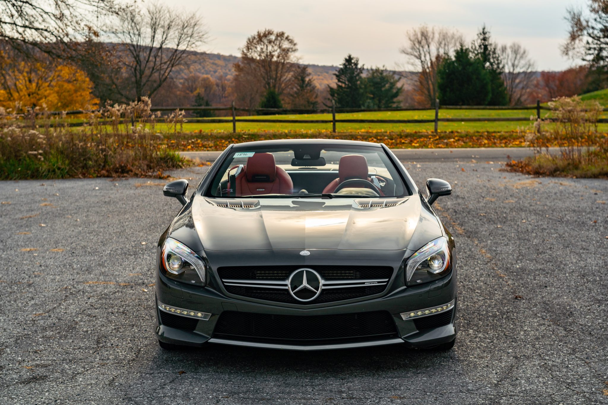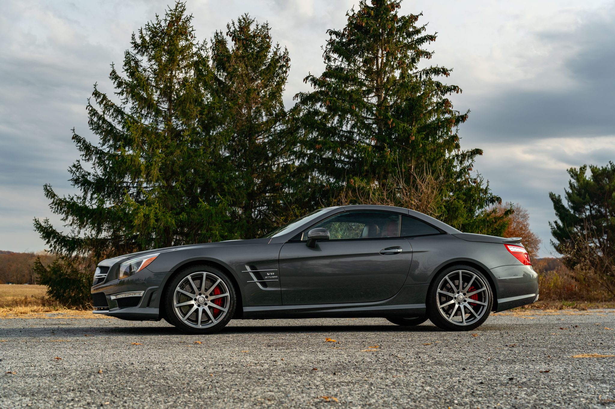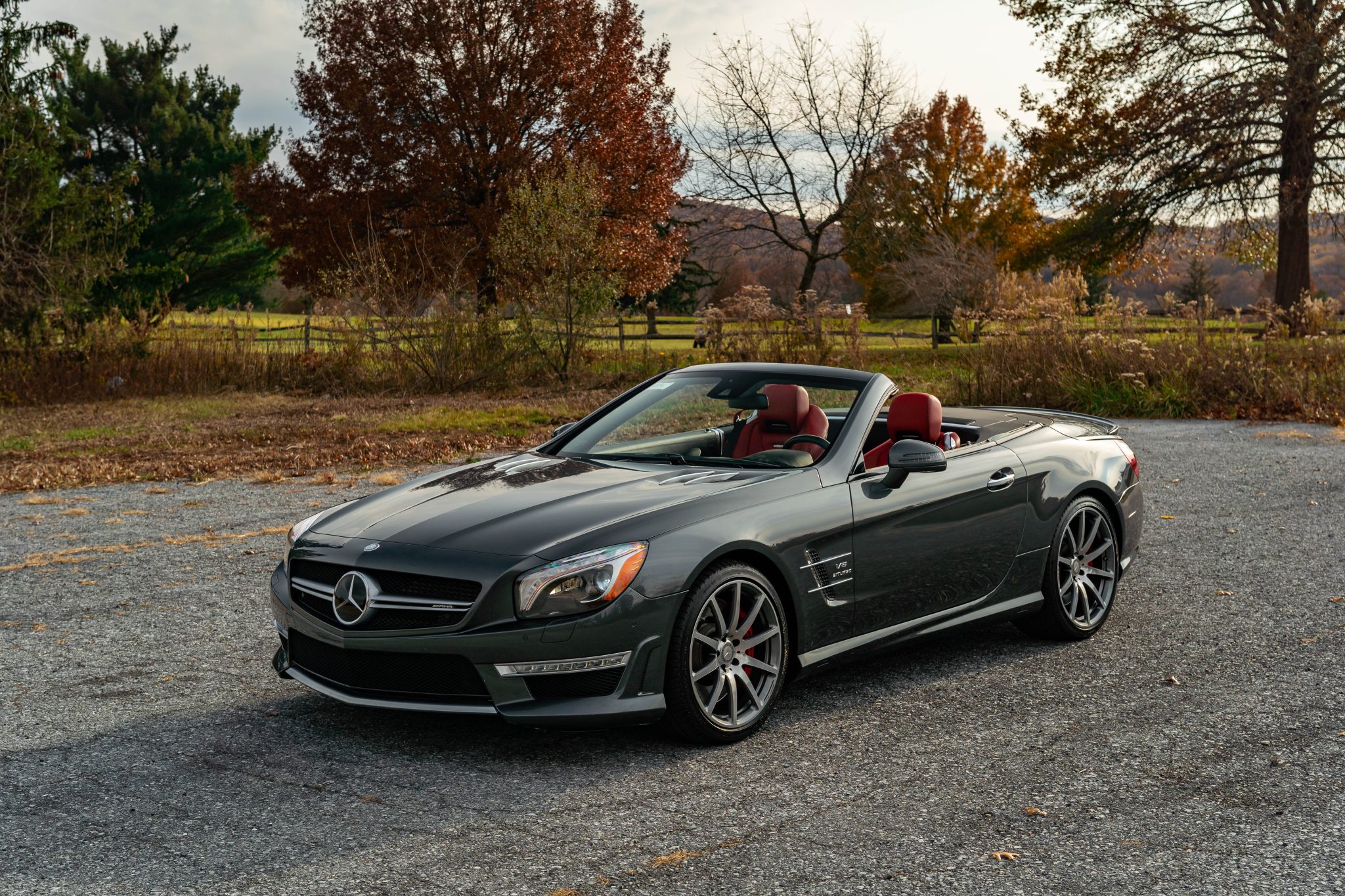 Specified in Designo Graphite Metallic over designo Classic Red Nappa leather, the car was optioned with the Diver Assistance Package as well as red-painted brake calipers, soft-close doors, carbon-fiber interior trim, an AMG Performance steering wheel, and staggered-width AMG 10-spoke wheels. Powered by a twin-turbocharged 5.5-liter V8 linked with a seven-speed automatic transmission and a limited-slip differential, the car is equipped with a power-retractable hardtop, a panoramic roof, blind-spot monitoring, Lane Keeping Assist, Parktronic, a back-up camera, heated and ventilated seats, a Harman Kardon sound system, and COMAND infotainment with navigation.