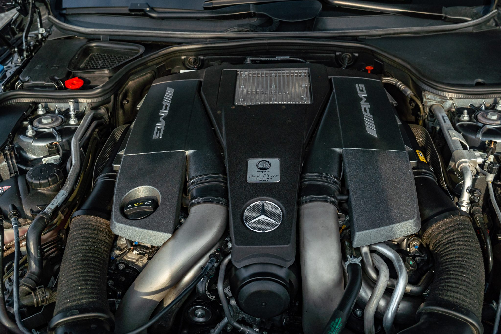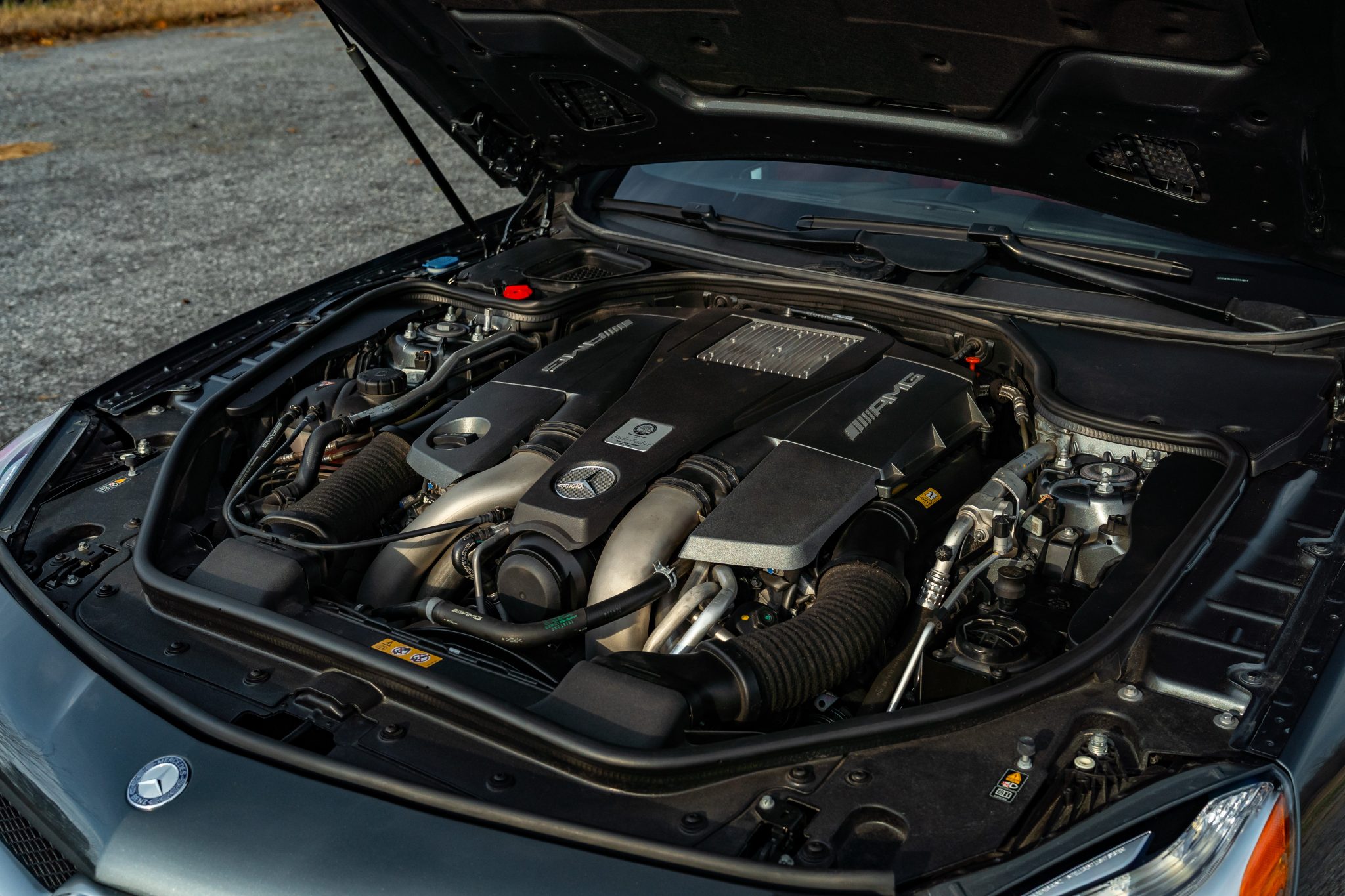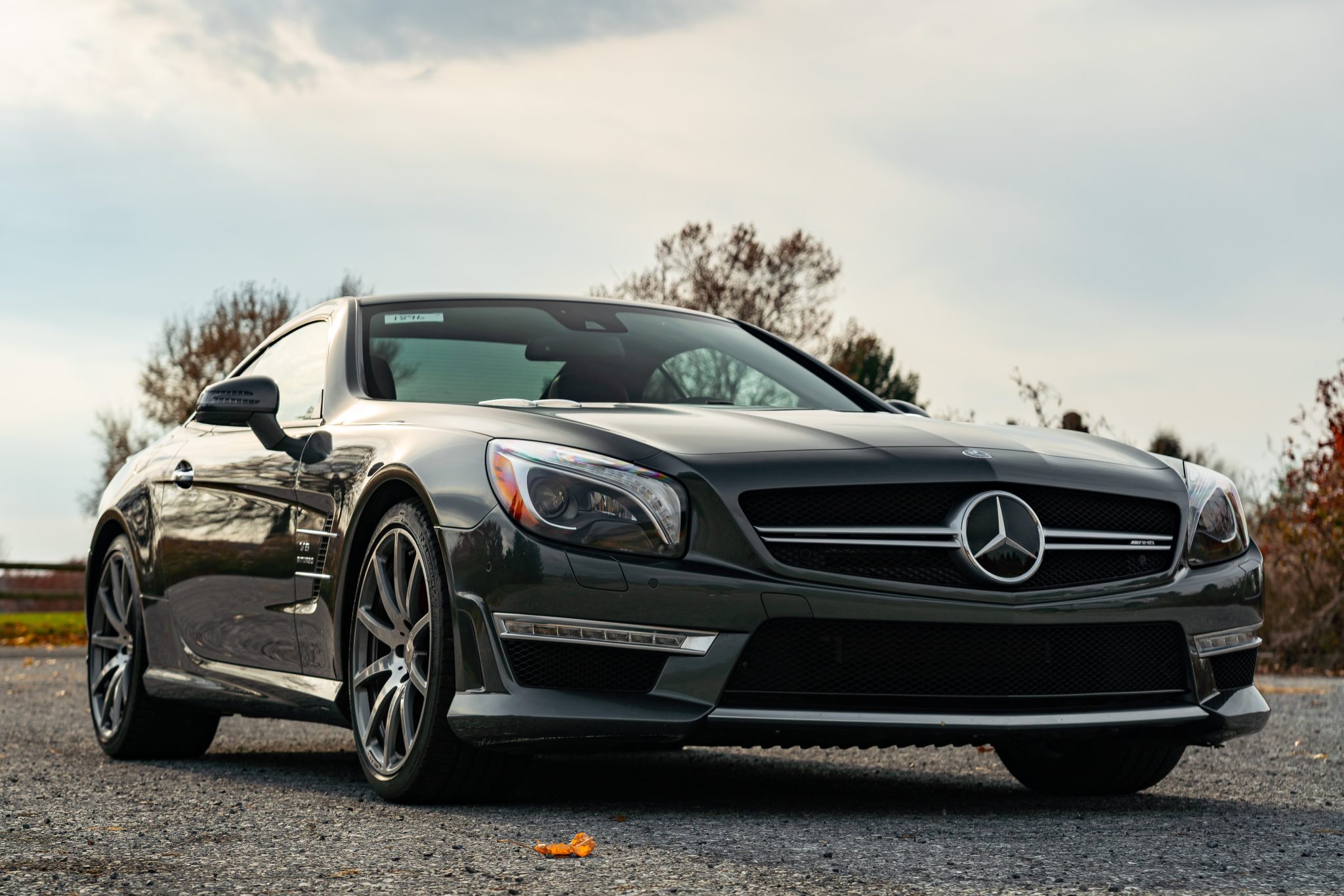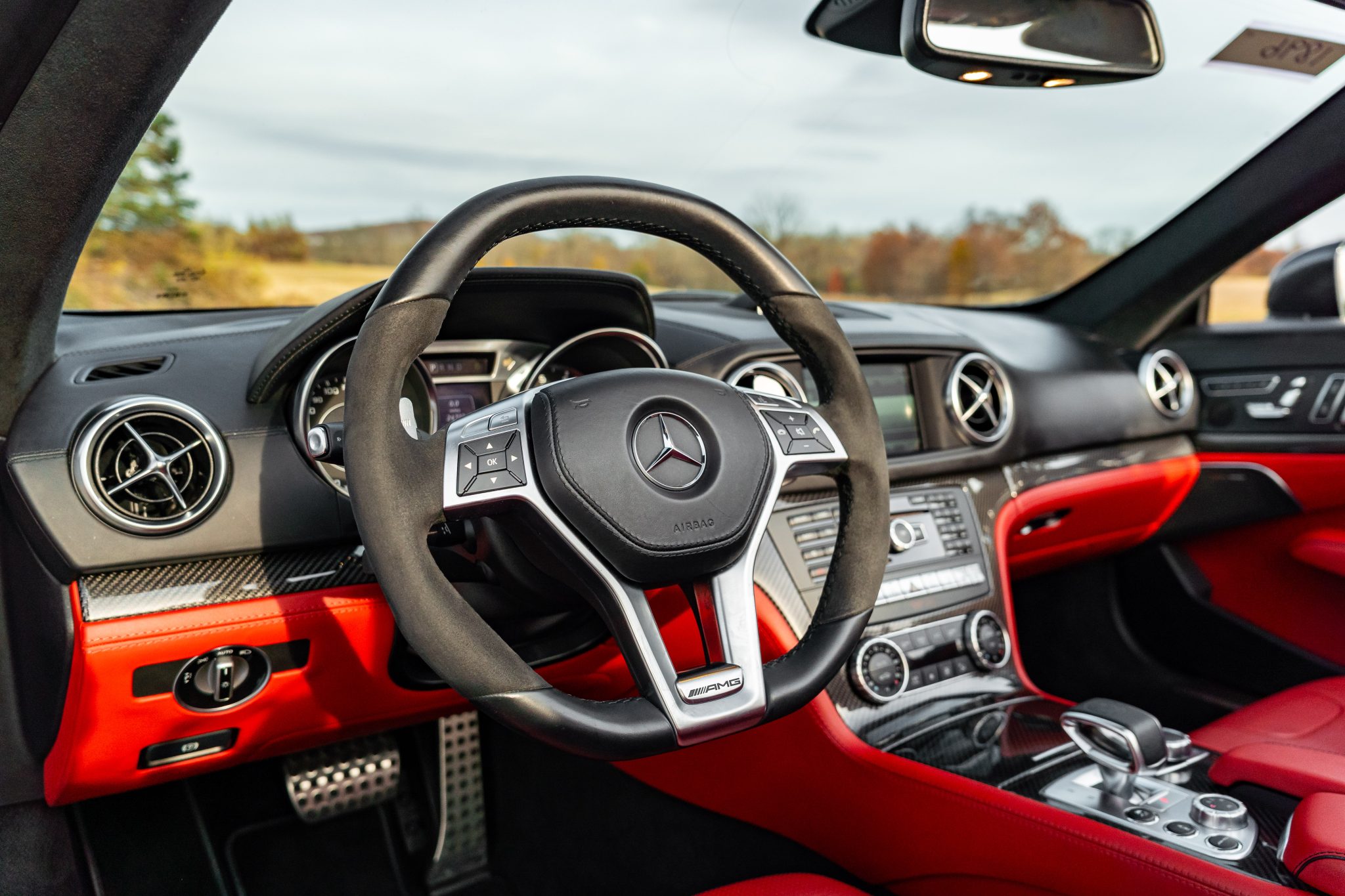 Specified in Designo Graphite Metallic over designo Classic Red Nappa leather, the car was optioned with the Diver Assistance Package as well as red-painted brake calipers, soft-close doors, carbon-fiber interior trim, an AMG Performance steering wheel, and staggered-width AMG 10-spoke wheels. Powered by a twin-turbocharged 5.5-liter V8 linked with a seven-speed automatic transmission and a limited-slip differential, the car is equipped with a power-retractable hardtop, a panoramic roof, blind-spot monitoring, Lane Keeping Assist, Parktronic, a back-up camera, heated and ventilated seats, a Harman Kardon sound system, and COMAND infotainment with navigation.