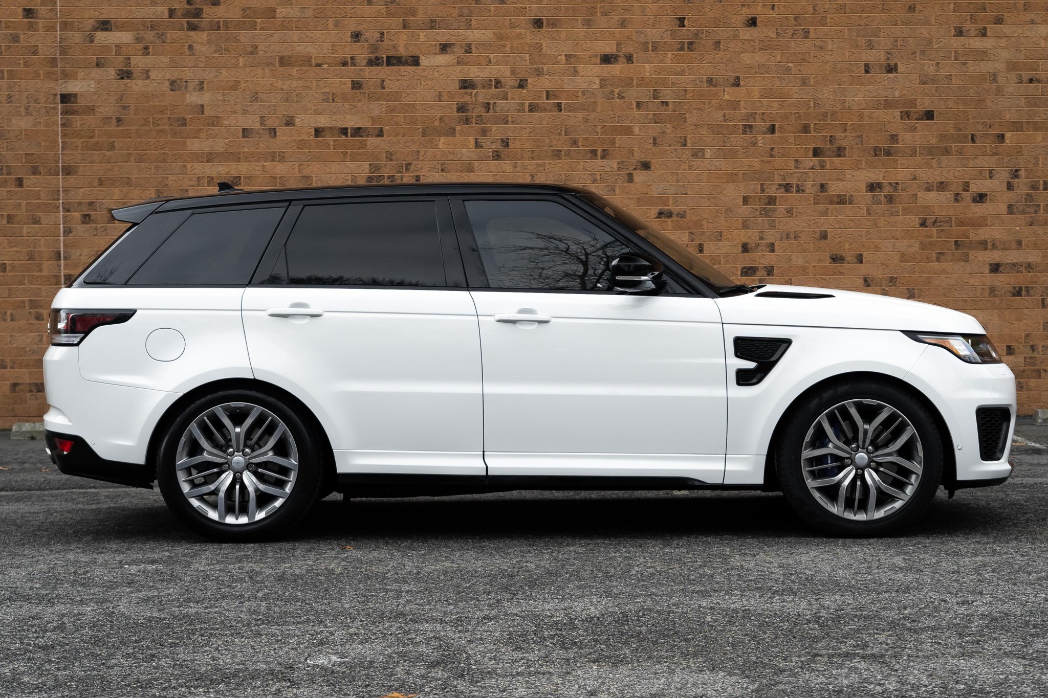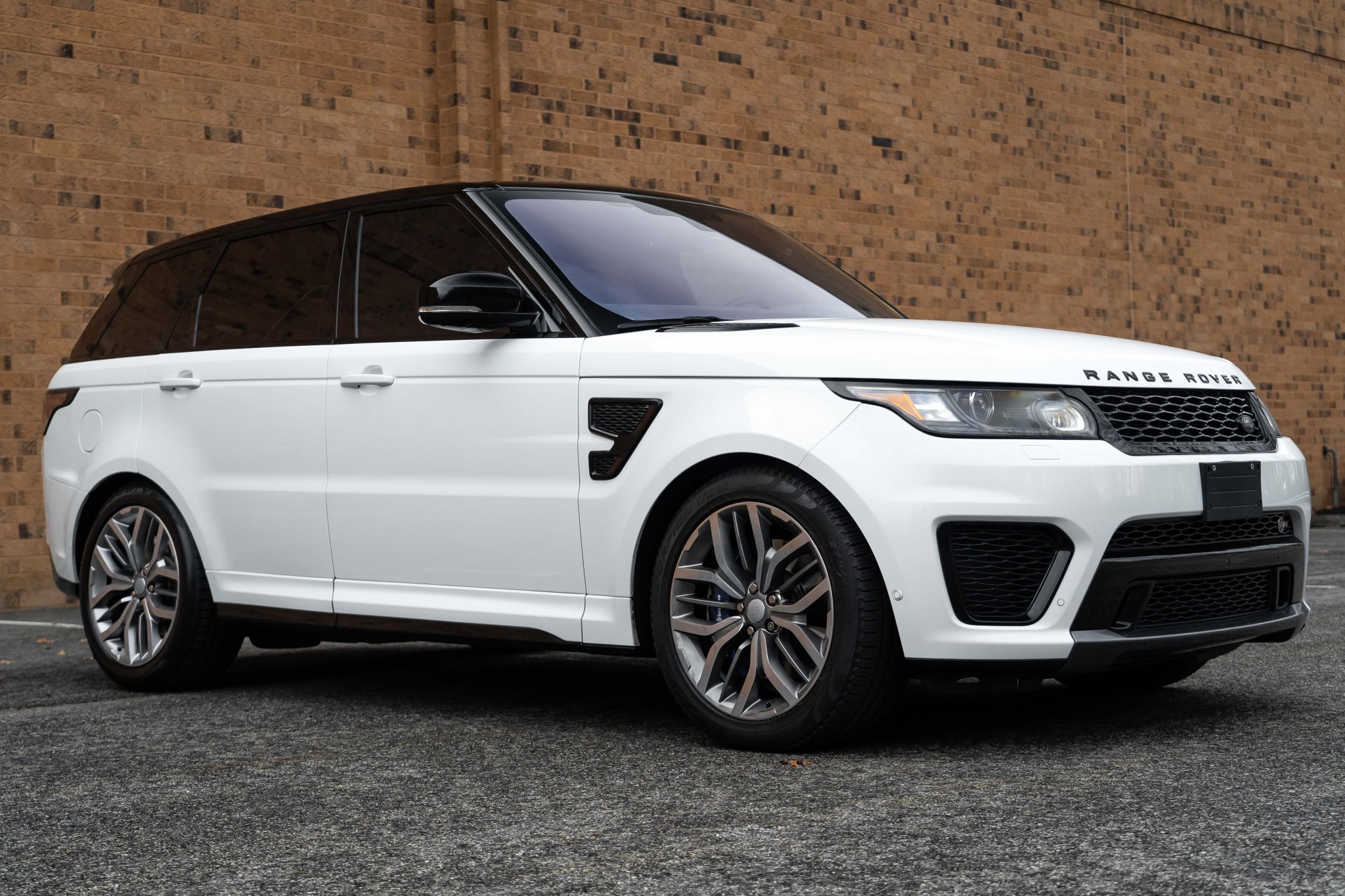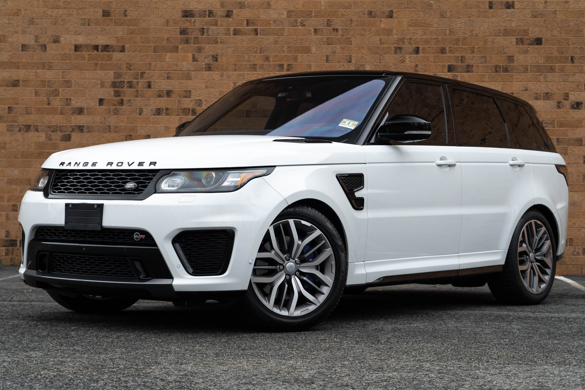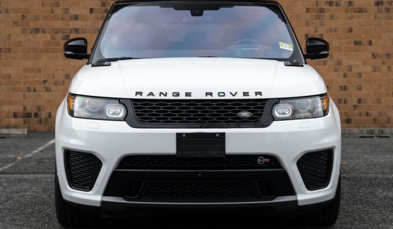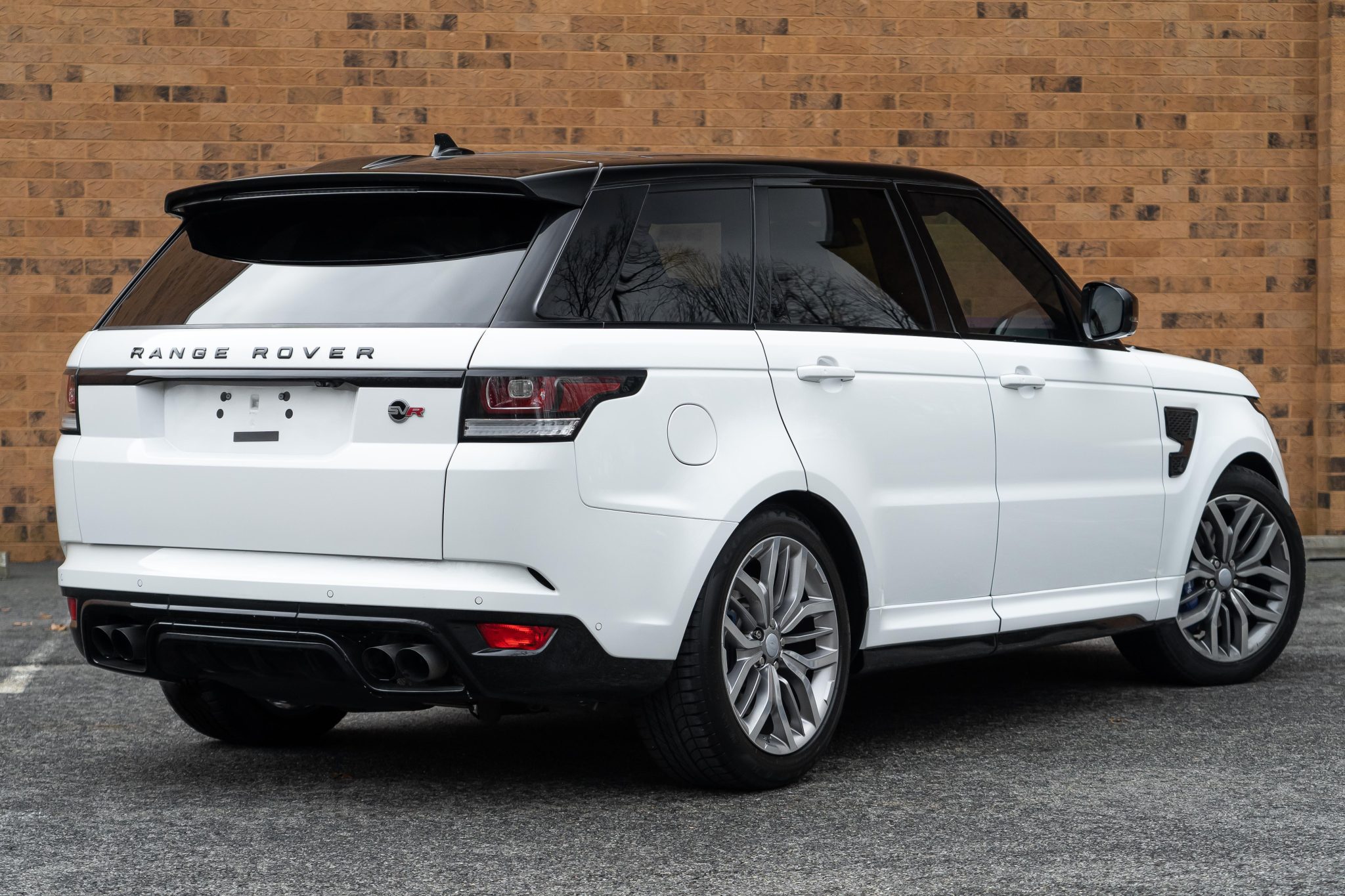 This 2016 Land Rover Range Rover Sport SVR is finished in Fuji White over black leather upholstery and is powered by a supercharged 5.0-liter V8 paired with an eight-speed automatic transmission, a dual-range transfer case, and an electronic active rear differential. Equipment includes 21″ wheels, sport-tuned adjustable air suspension, adaptive xenon headlamps, parking sensors, a glass sunroof, a cooler box, adaptive cruise control, a surround camera system, heated front and rear seats, and a Meridian Signature Reference audio system.