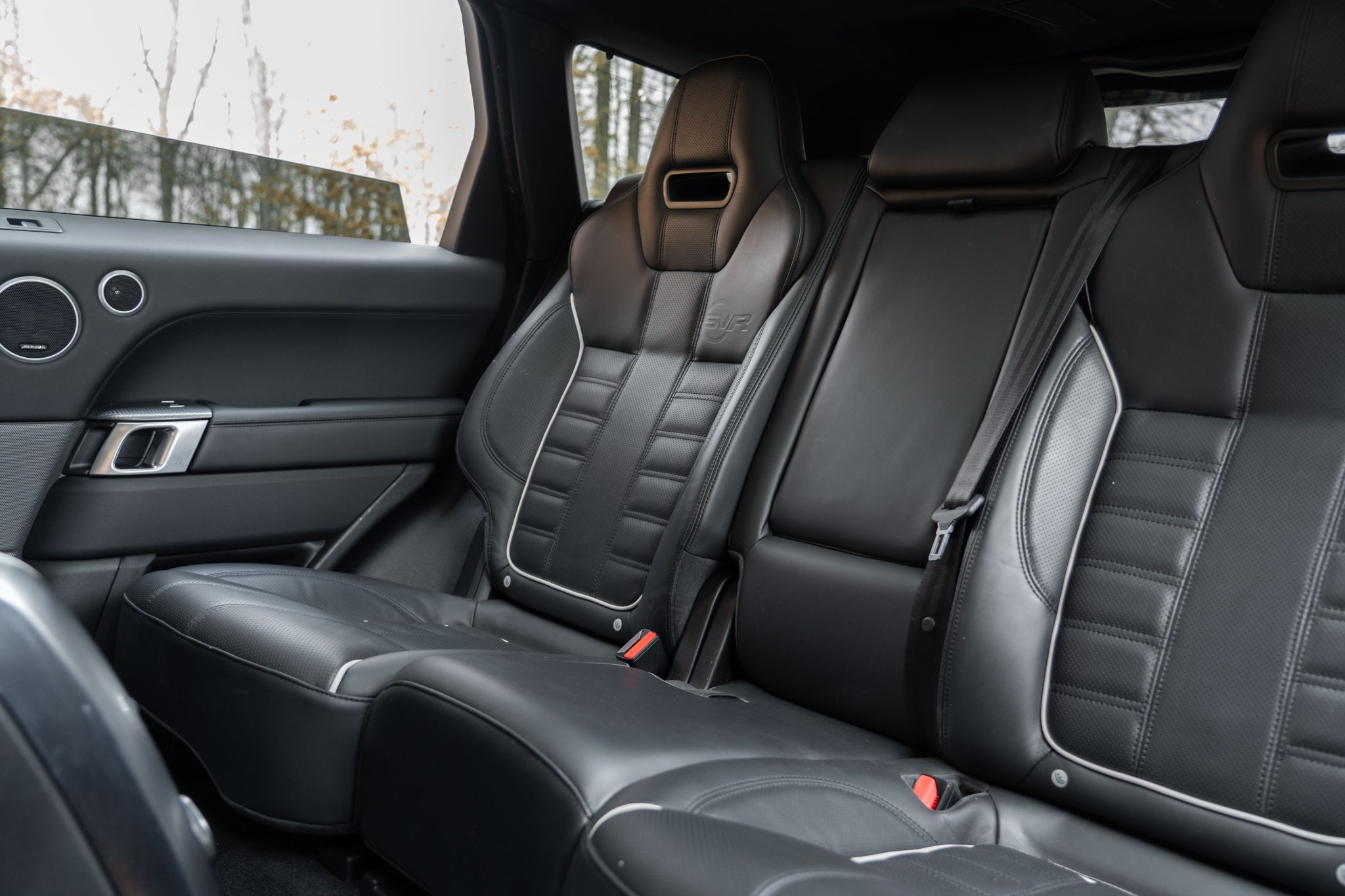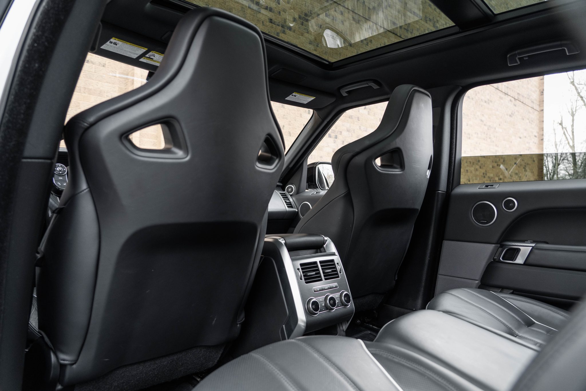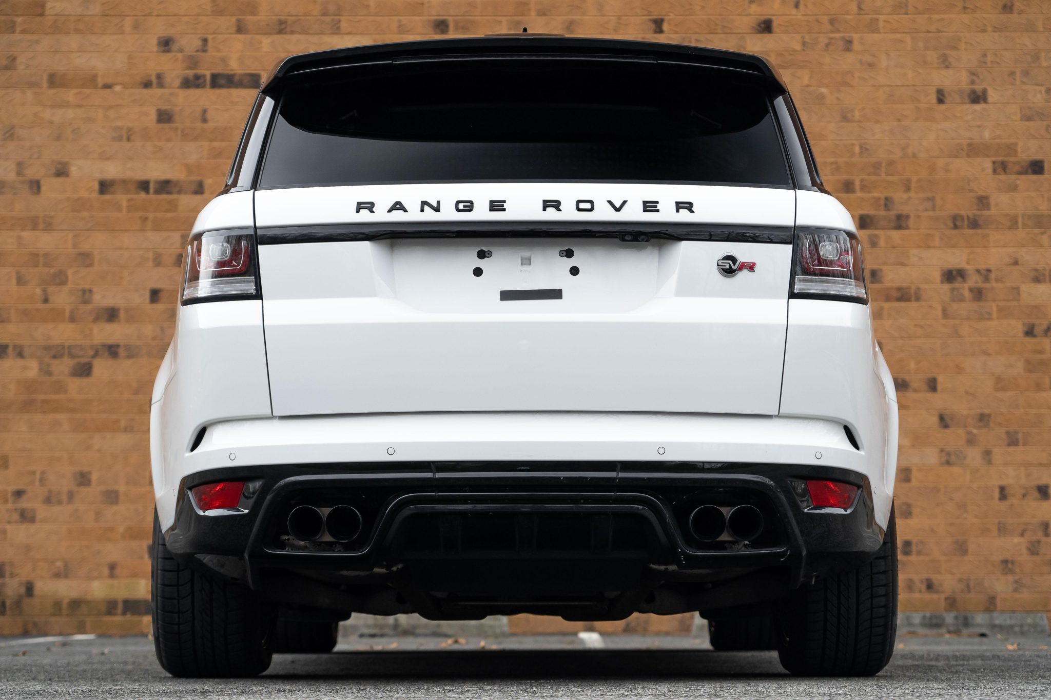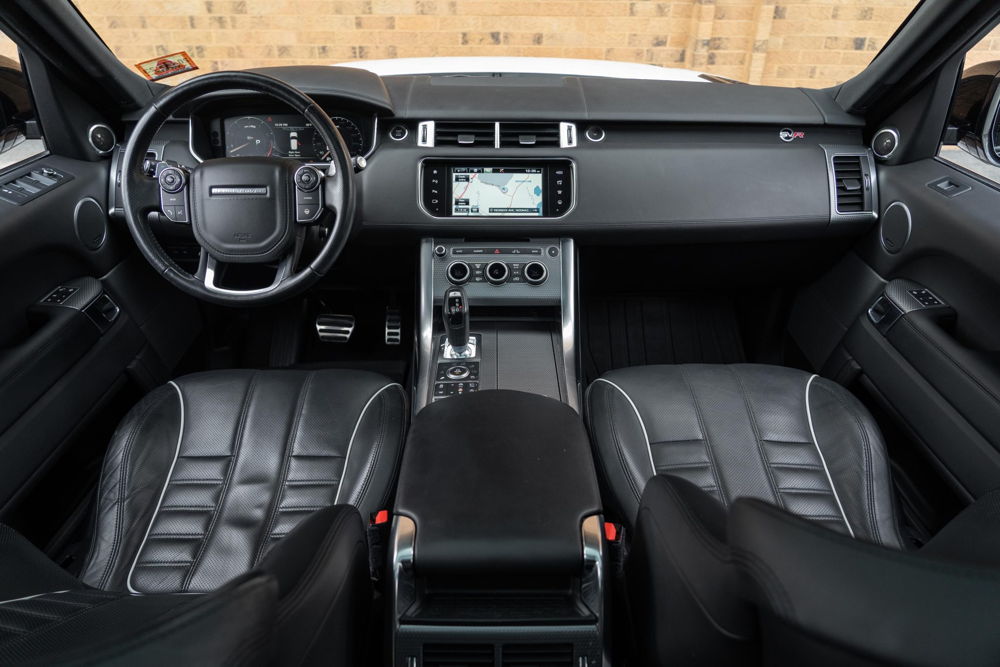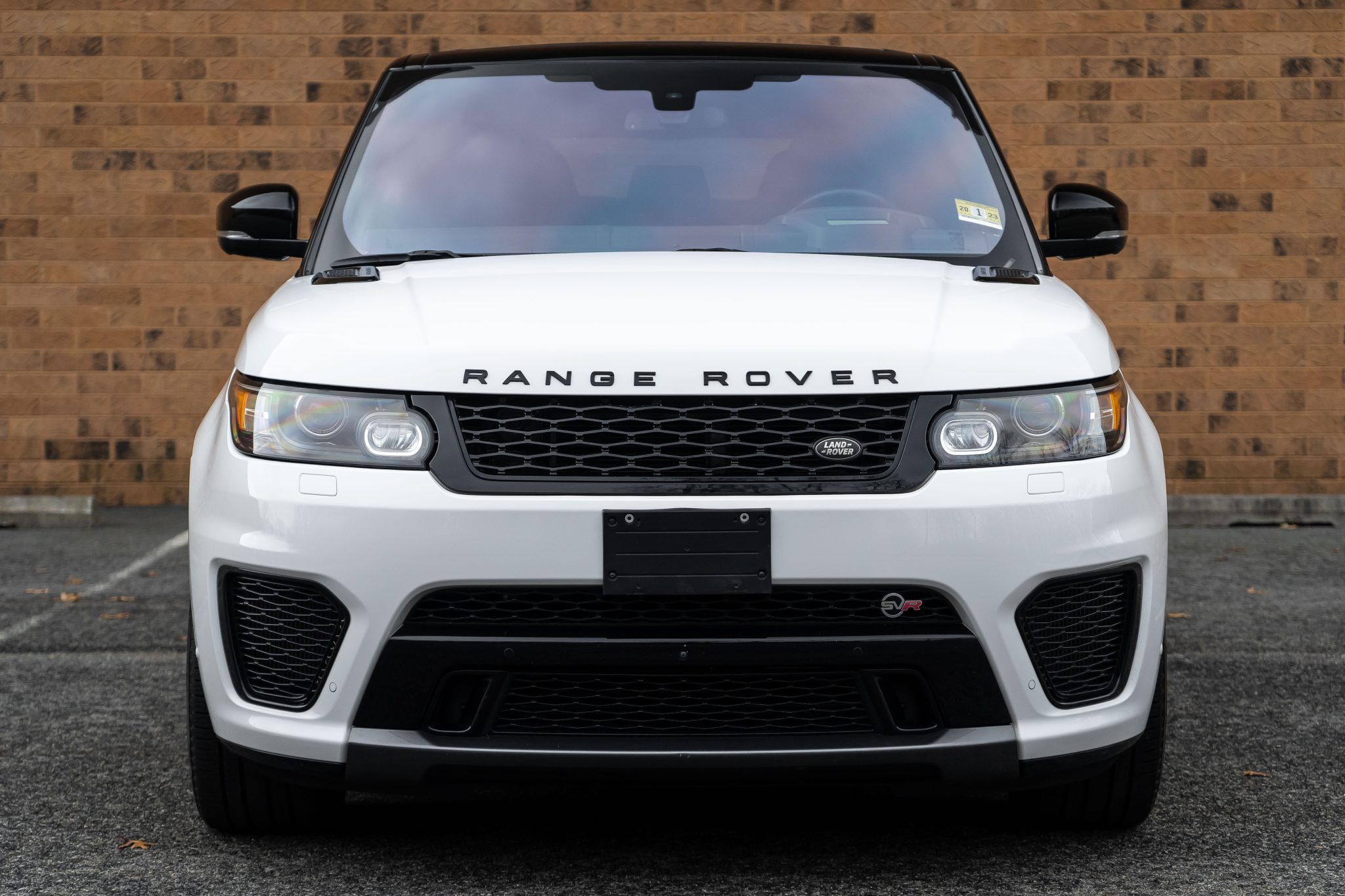 This 2016 Land Rover Range Rover Sport SVR is finished in Fuji White over black leather upholstery and is powered by a supercharged 5.0-liter V8 paired with an eight-speed automatic transmission, a dual-range transfer case, and an electronic active rear differential. Equipment includes 21″ wheels, sport-tuned adjustable air suspension, adaptive xenon headlamps, parking sensors, a glass sunroof, a cooler box, adaptive cruise control, a surround camera system, heated front and rear seats, and a Meridian Signature Reference audio system.