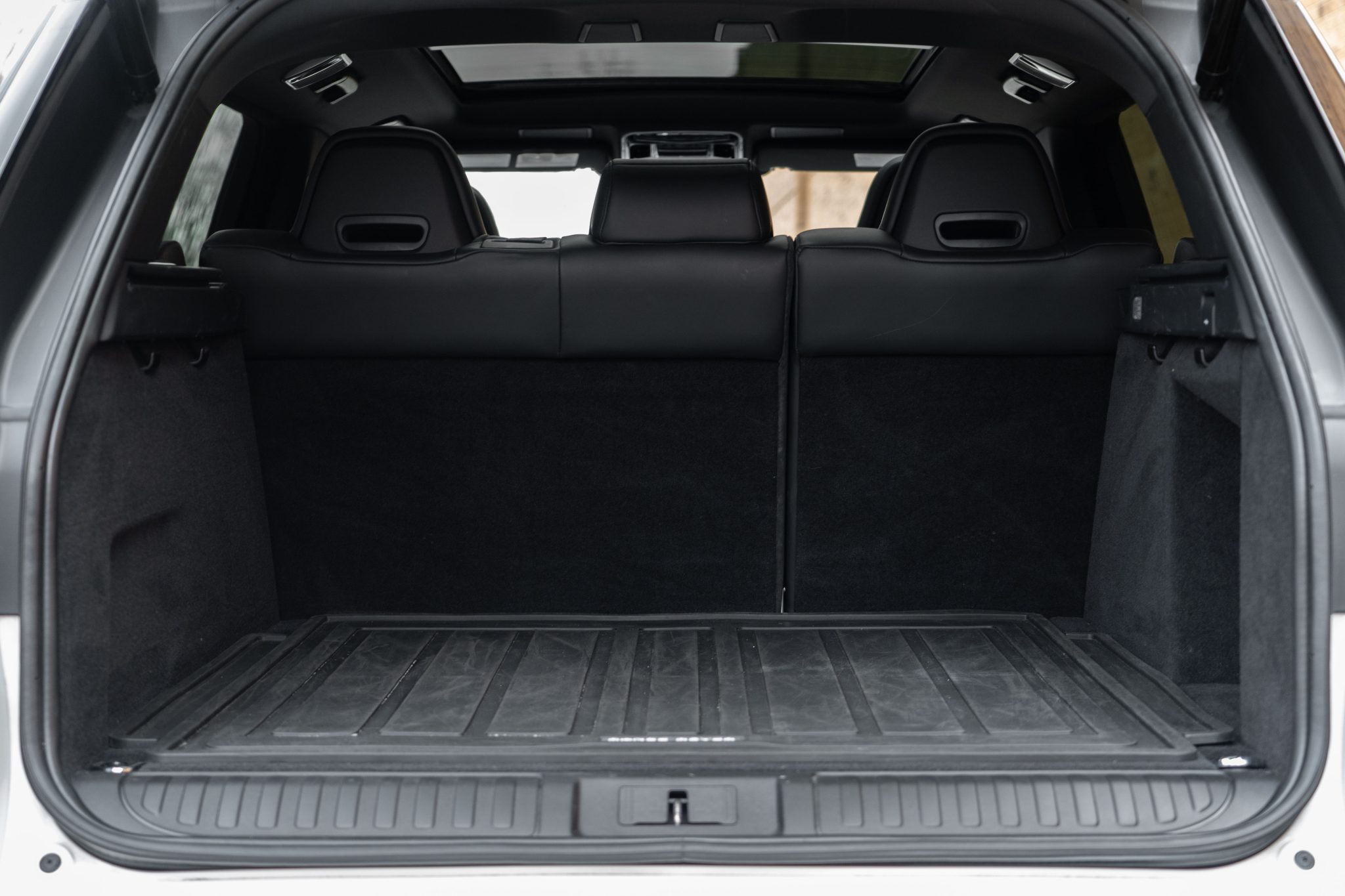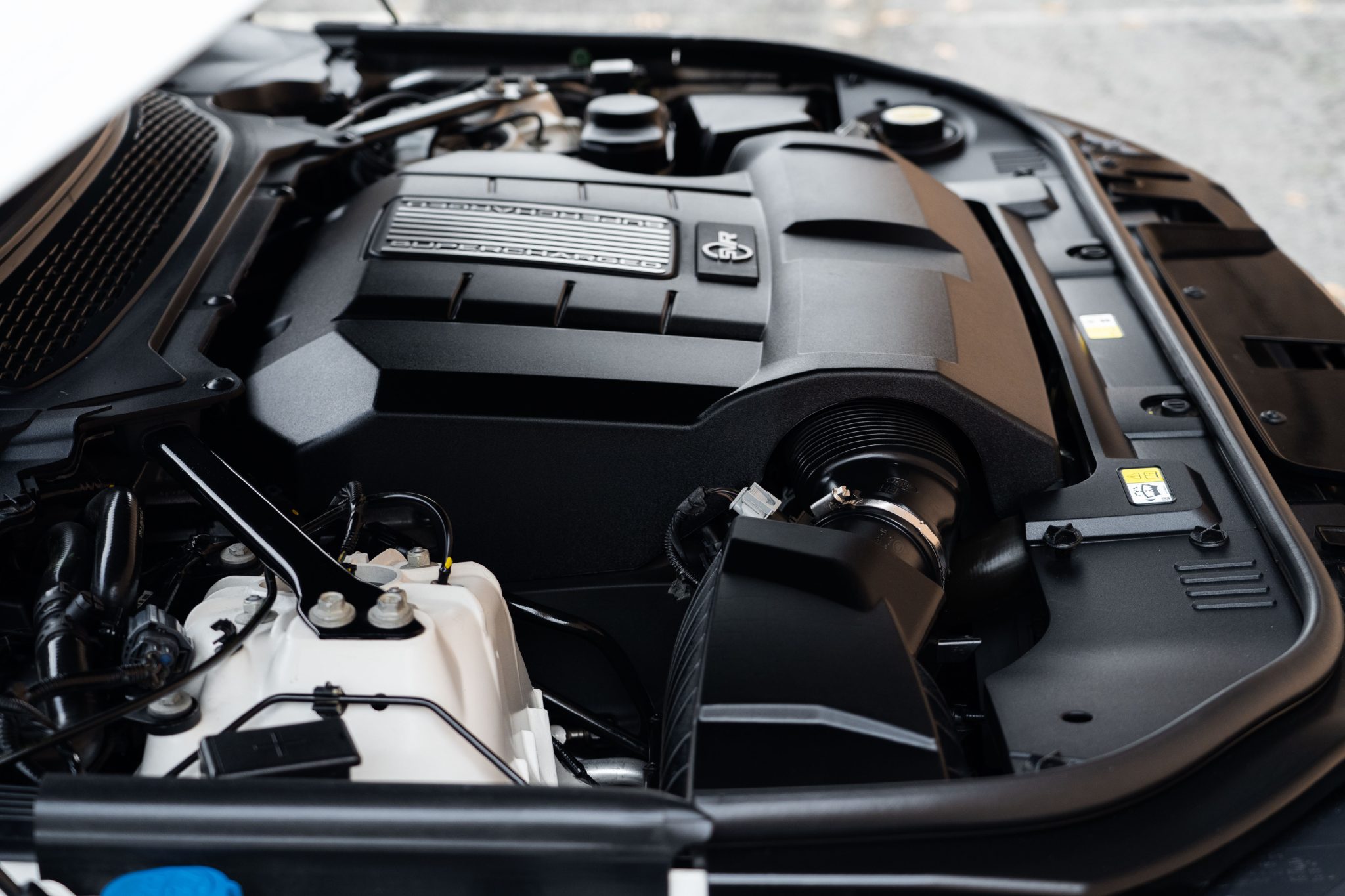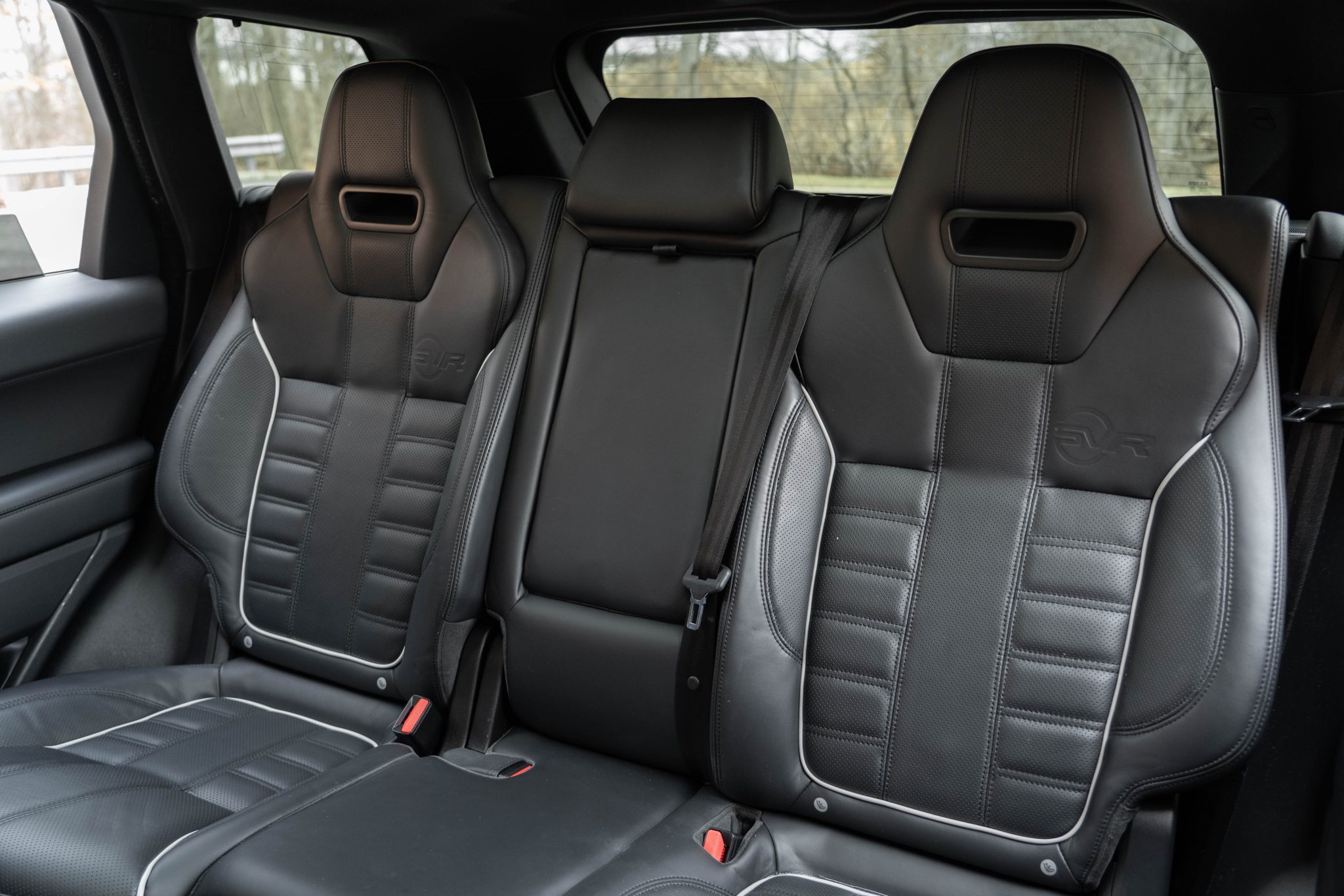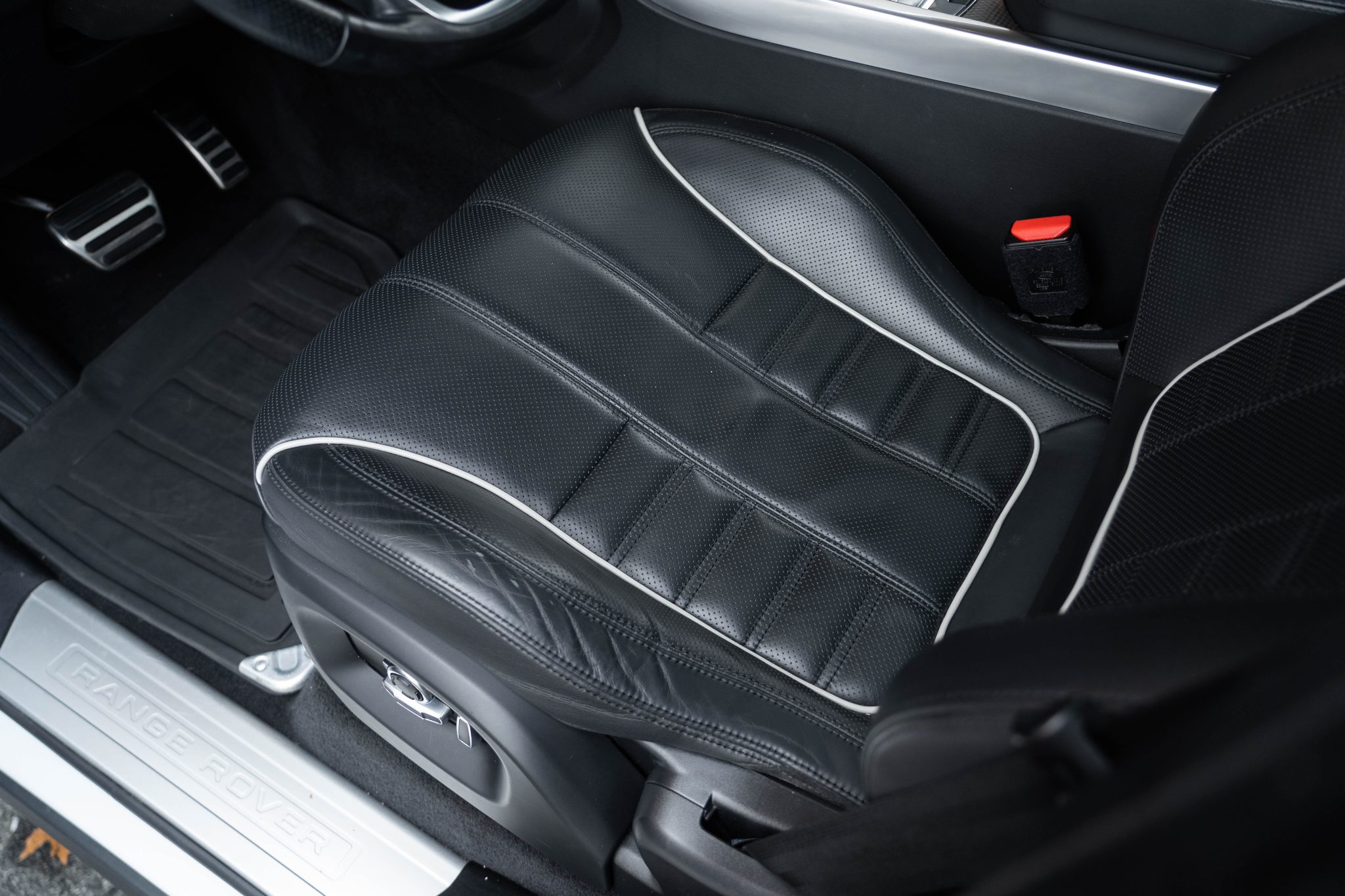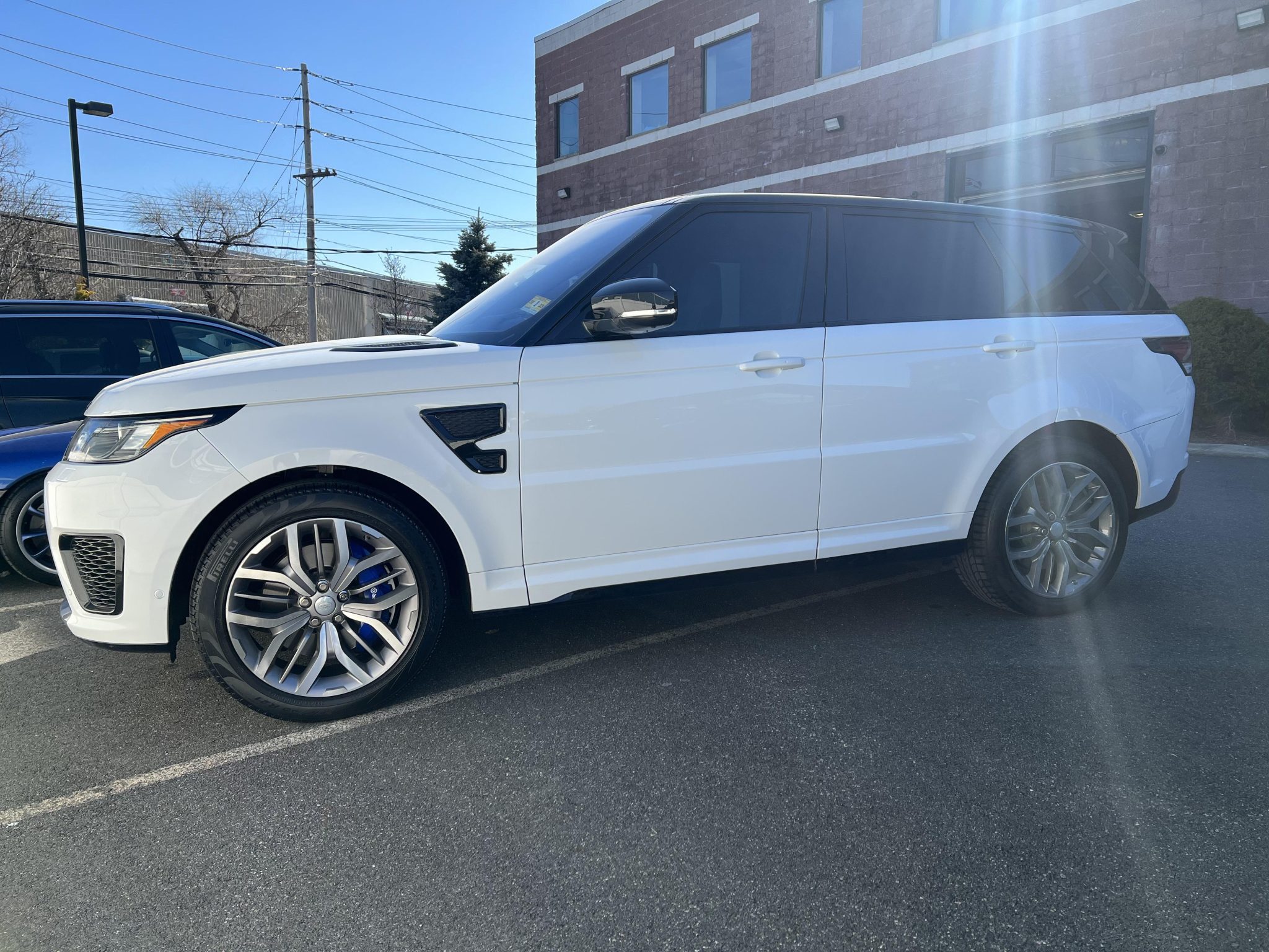 This 2016 Land Rover Range Rover Sport SVR is finished in Fuji White over black leather upholstery and is powered by a supercharged 5.0-liter V8 paired with an eight-speed automatic transmission, a dual-range transfer case, and an electronic active rear differential. Equipment includes 21″ wheels, sport-tuned adjustable air suspension, adaptive xenon headlamps, parking sensors, a glass sunroof, a cooler box, adaptive cruise control, a surround camera system, heated front and rear seats, and a Meridian Signature Reference audio system.