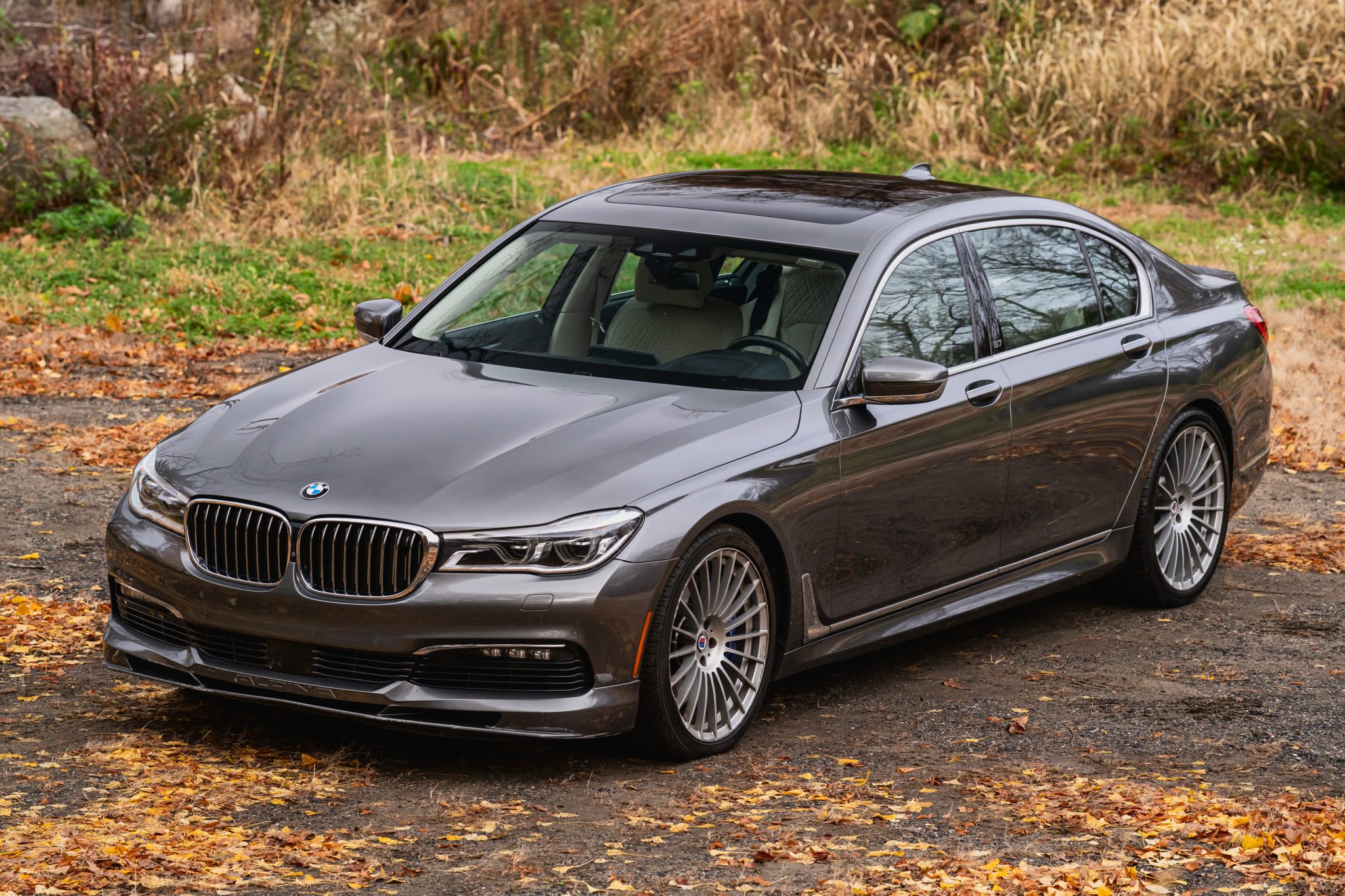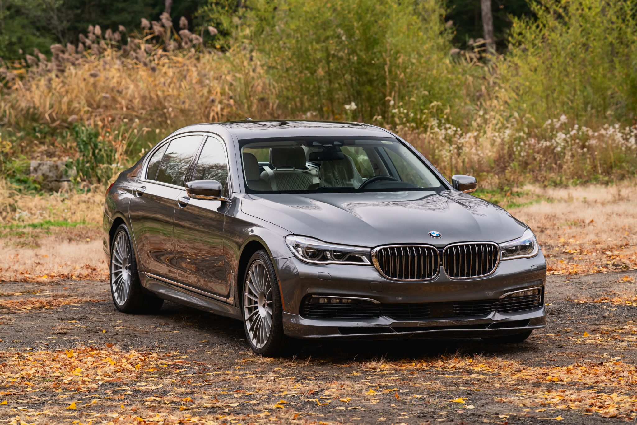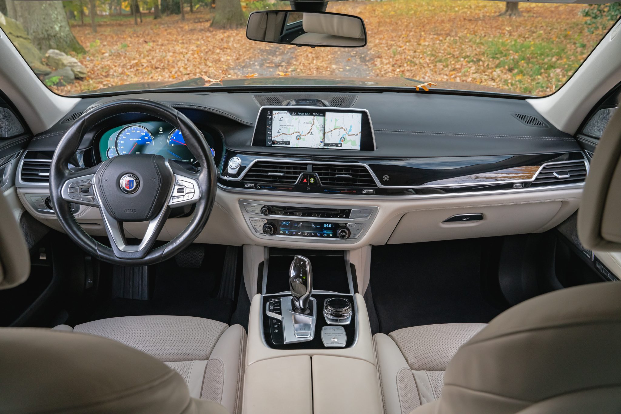 This 2017 BMW Alpina B7 xDrive is finished in Magellan Grey Metallic over Ivory White Nappa leather, and it was specified with the Executive and Cold Weather Packages as well as multi-spoke 21″ Alpina wheels, a panoramic Sky Lounge LED sunroof, and a Bowers and Wilkins sound system. Power is provided by a twin-turbocharged 4.4-liter V8 that drives all four wheels through an eight-speed automatic transmission and an xDrive all-wheel-drive system. Cabin features include heated and ventilated power-adjustable front and rear seats, seat massaging functions, and Piano Black trim, in addition to four-zone automatic climate control, a head-up display, Gesture Control, a surround view camera system, and iDrive infotainment.