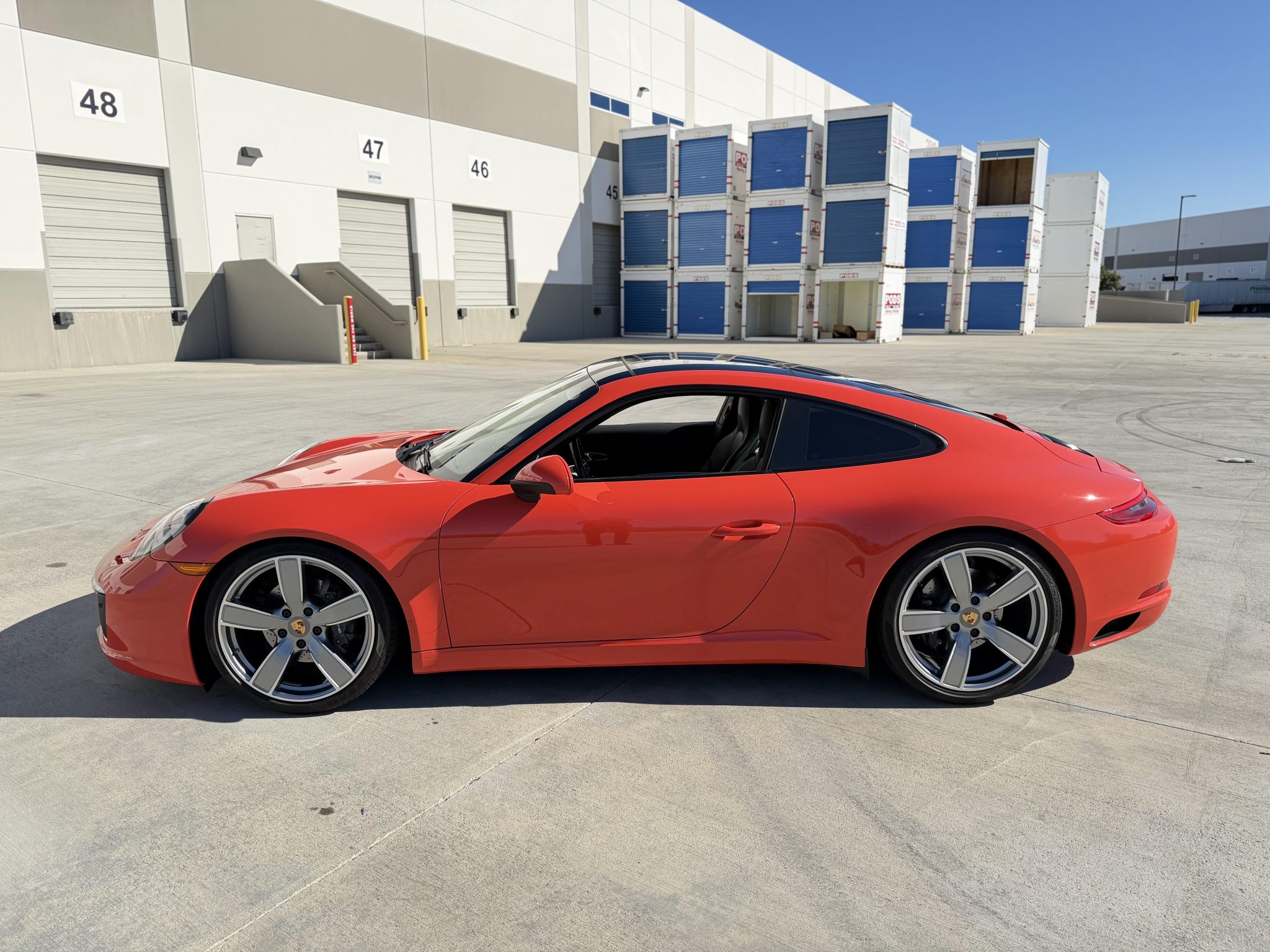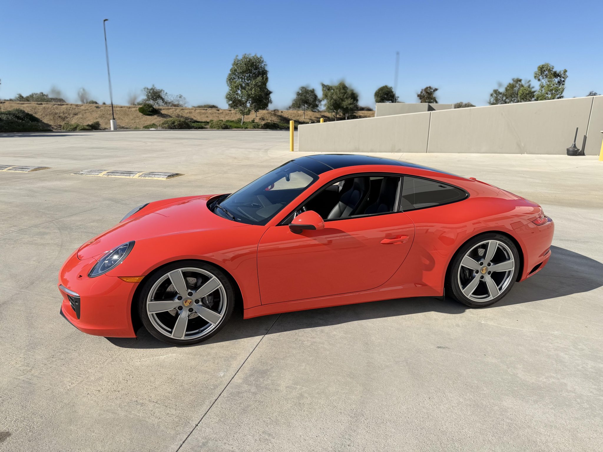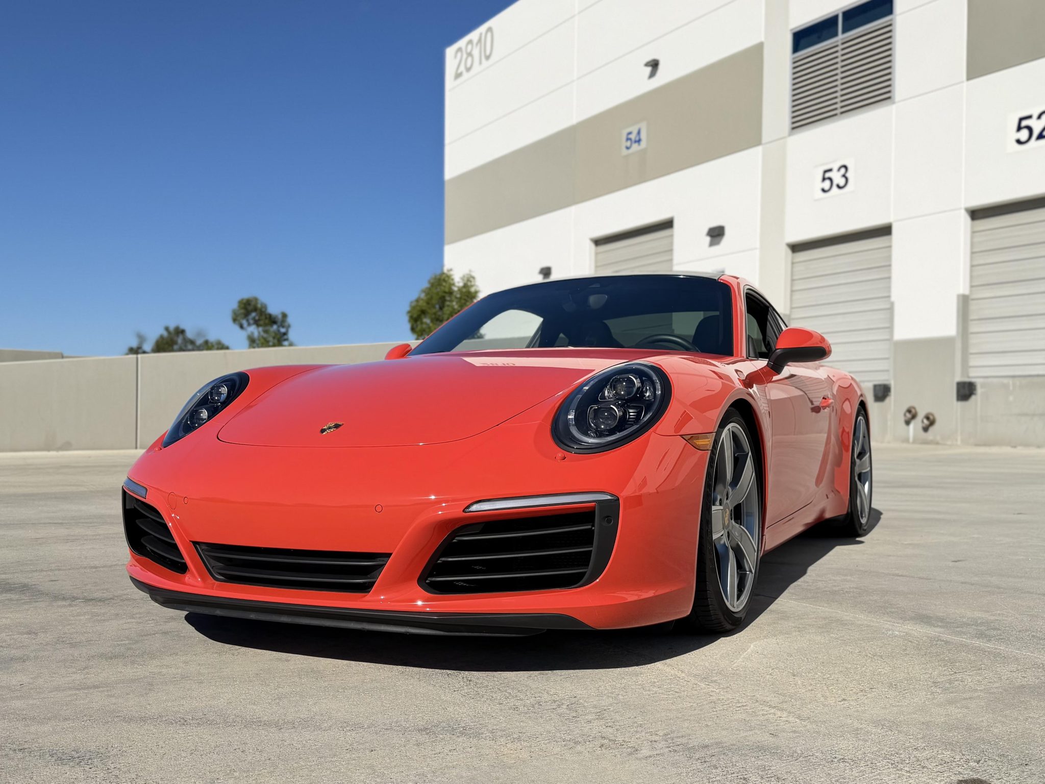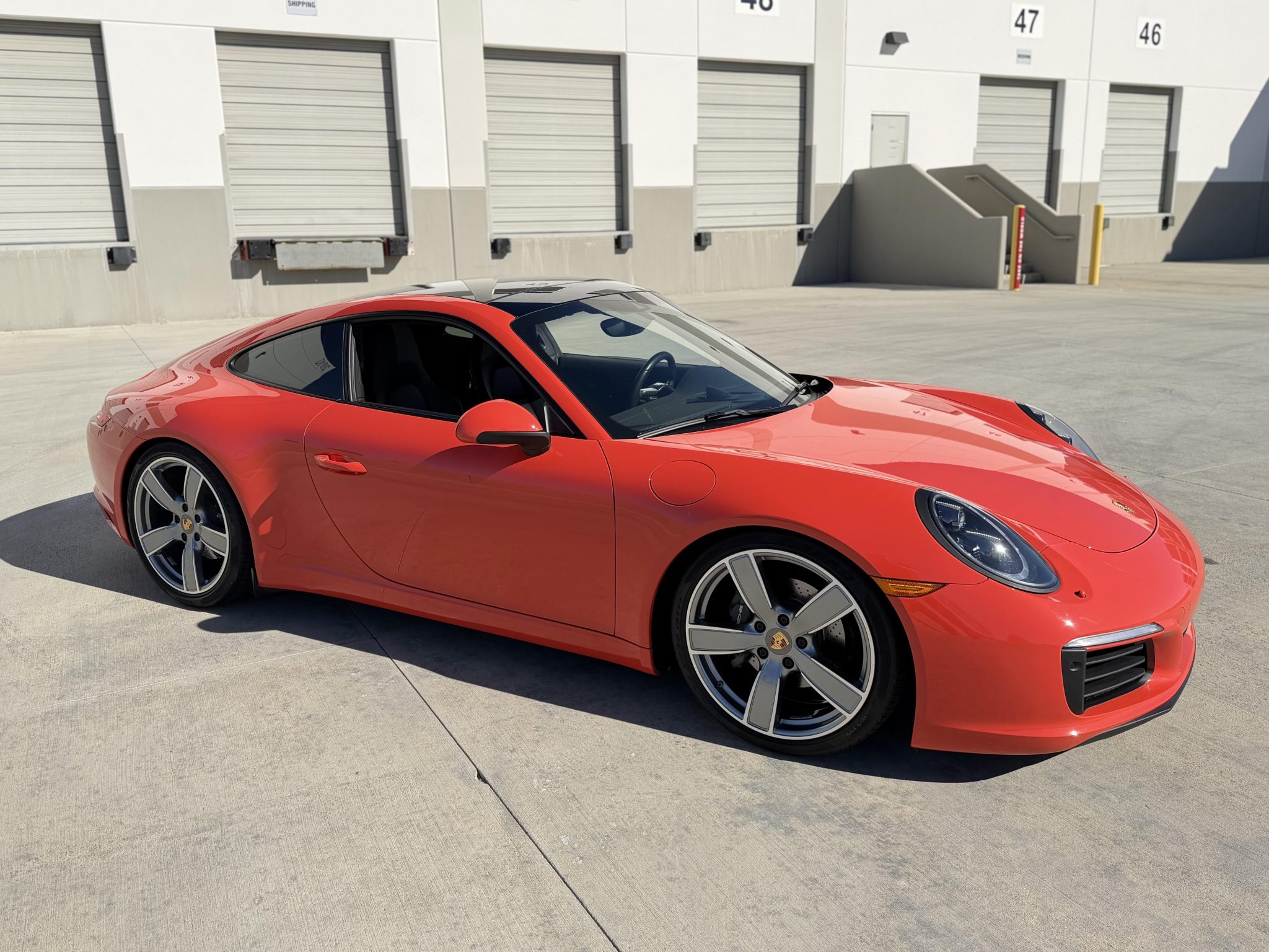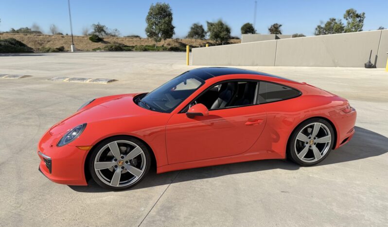 This 2017 Porsche 911 Carrera coupe now has 43k miles. The car was optioned in Lava Orange over black leather with 20″ Carrera Sport wheels, a sport exhaust system, Power Steering Plus, a Bose sound system, Lane Change Assist, Adaptive Sport Seats Plus with memory, a power sunroof, LED headlights with the Porsche Dynamic Light System Plus, a heated steering wheel, the Sport Chrono Package, and the Premium Package Plus, which added Porsche Entry and Drive, auto-dimming mirrors, the Light Design Package, and heated and ventilated front seats. Power is from a twin-turbocharged 3.0L flat-six paired with a seven-speed manual transaxle, and modifications to the car include TechArt lowering springs, Rennline radiator grille screens, Suncoast wind diffusers, and tinted windows.