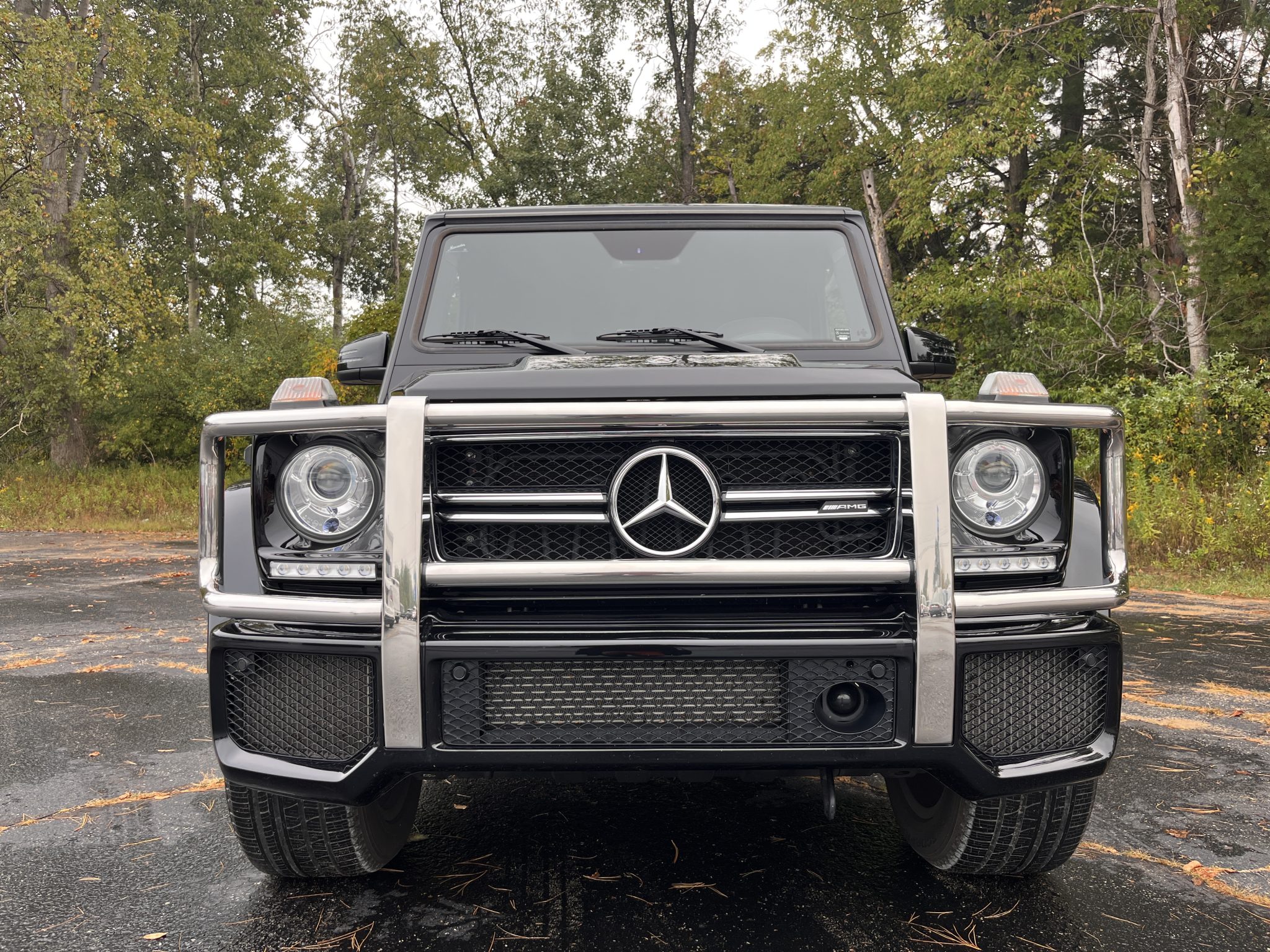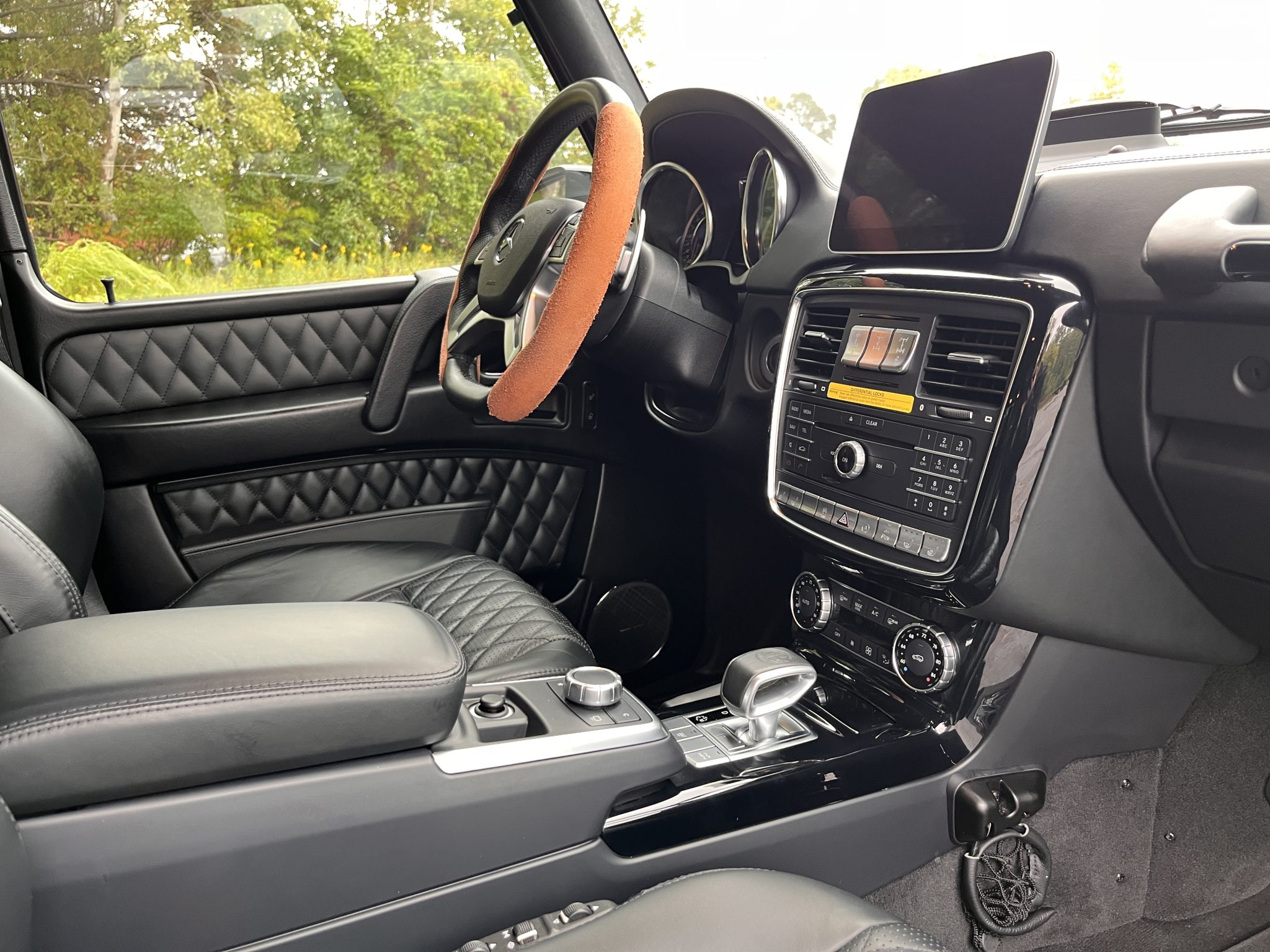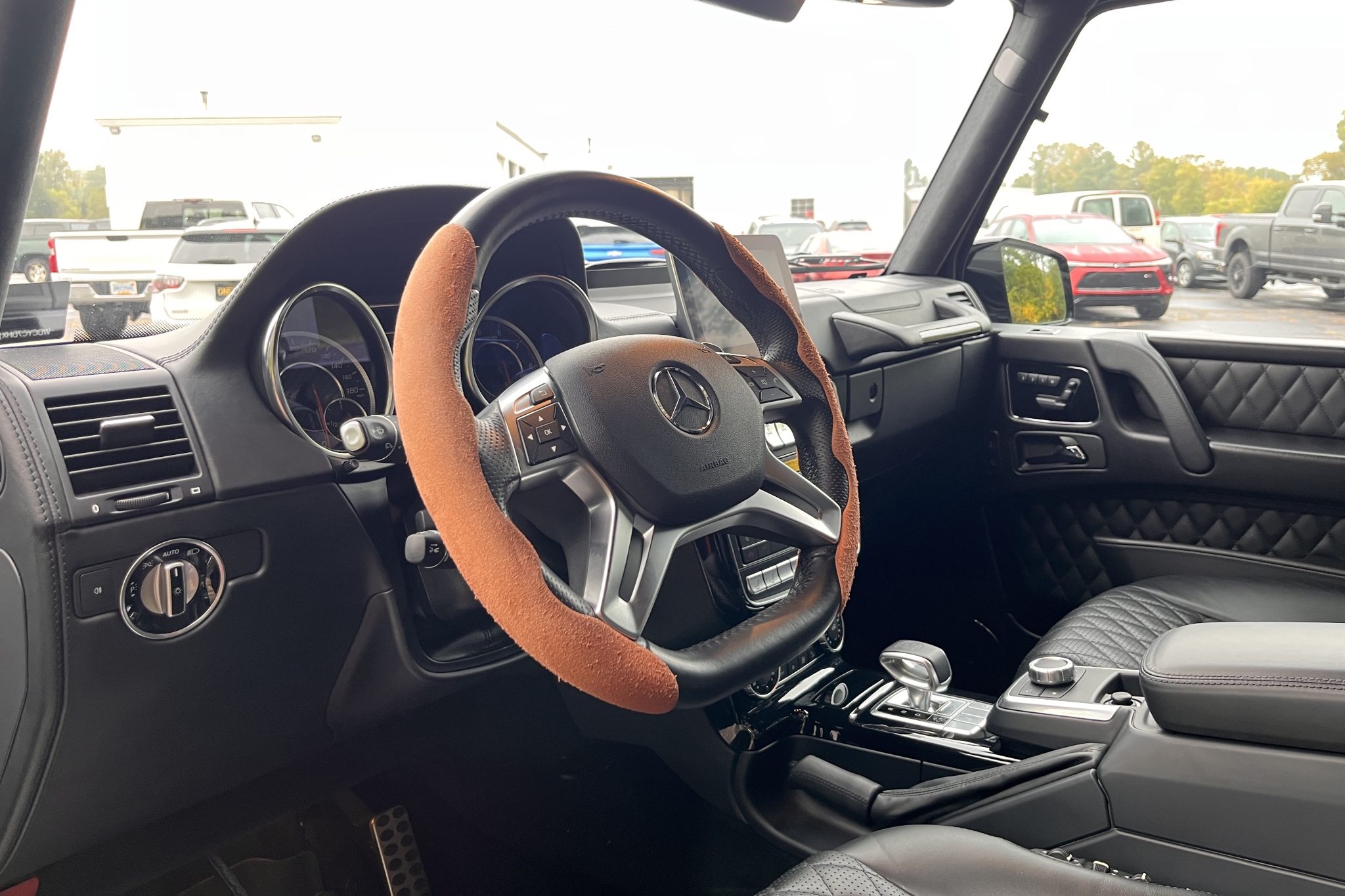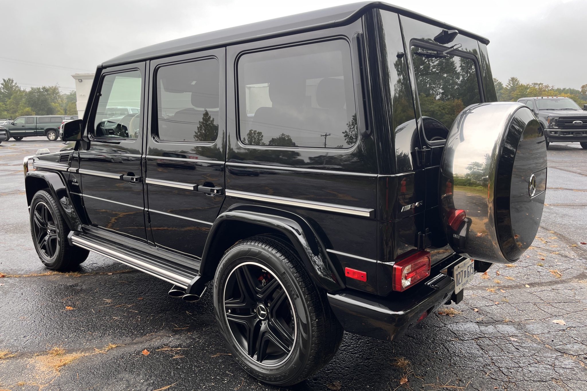 the truck is powered by a twin-turbocharged 5.5-liter V8 linked with a seven-speed automatic transmission, a dual-range transfer case, and three locking differentials. Finished in Black over matching Designo Exclusive Nappa leather, it is equipped with 20″ AMG wheels, bi-xenon headlights, a sunroof, Parktronic, a rearview camera, blind-spot monitoring, heated and ventilated power-adjustable front seats, heated rear seats, navigation, a Harman Kardon sound system, Distance Pilot Distronic, and dual-zone automatic climate control.