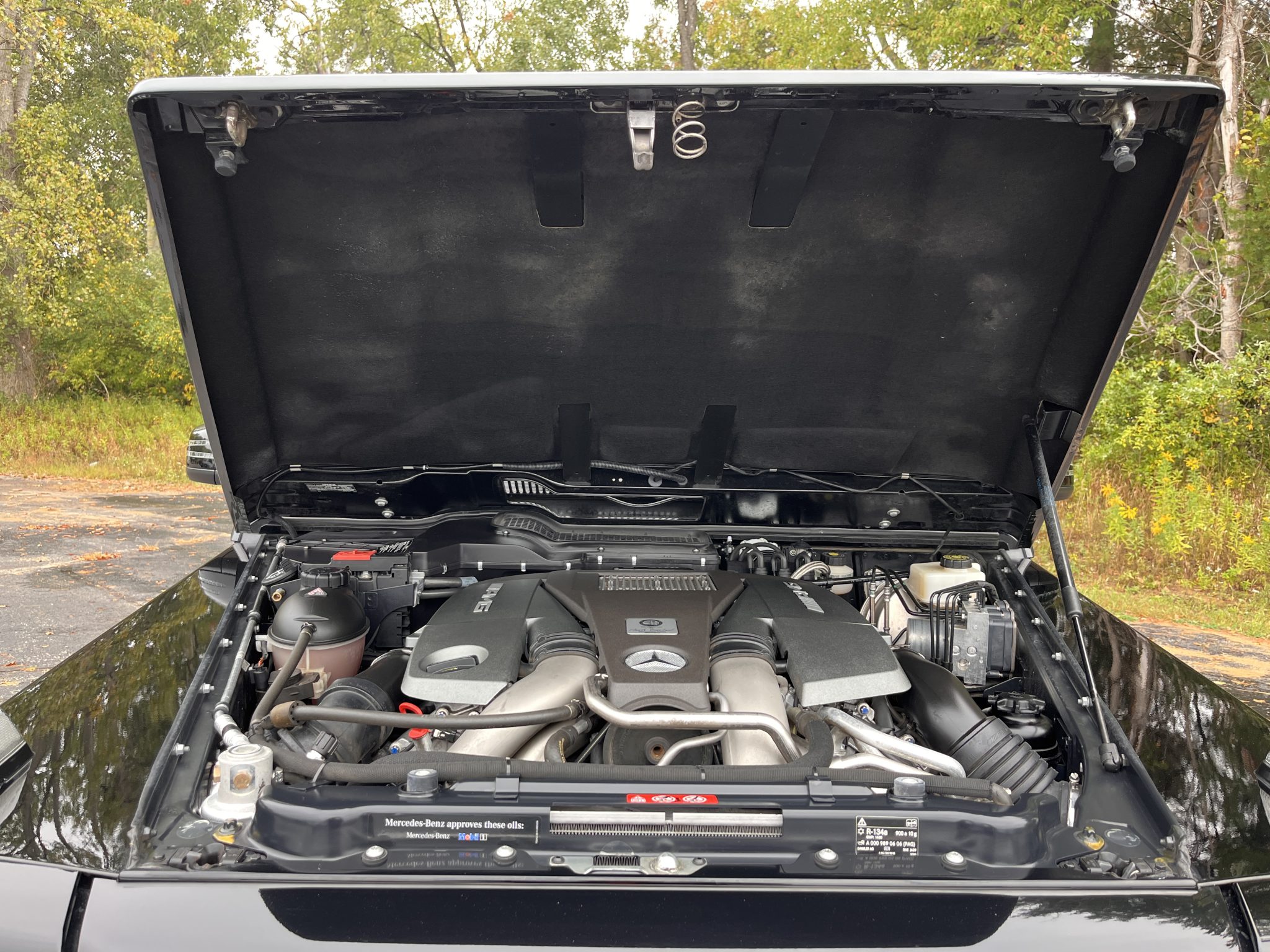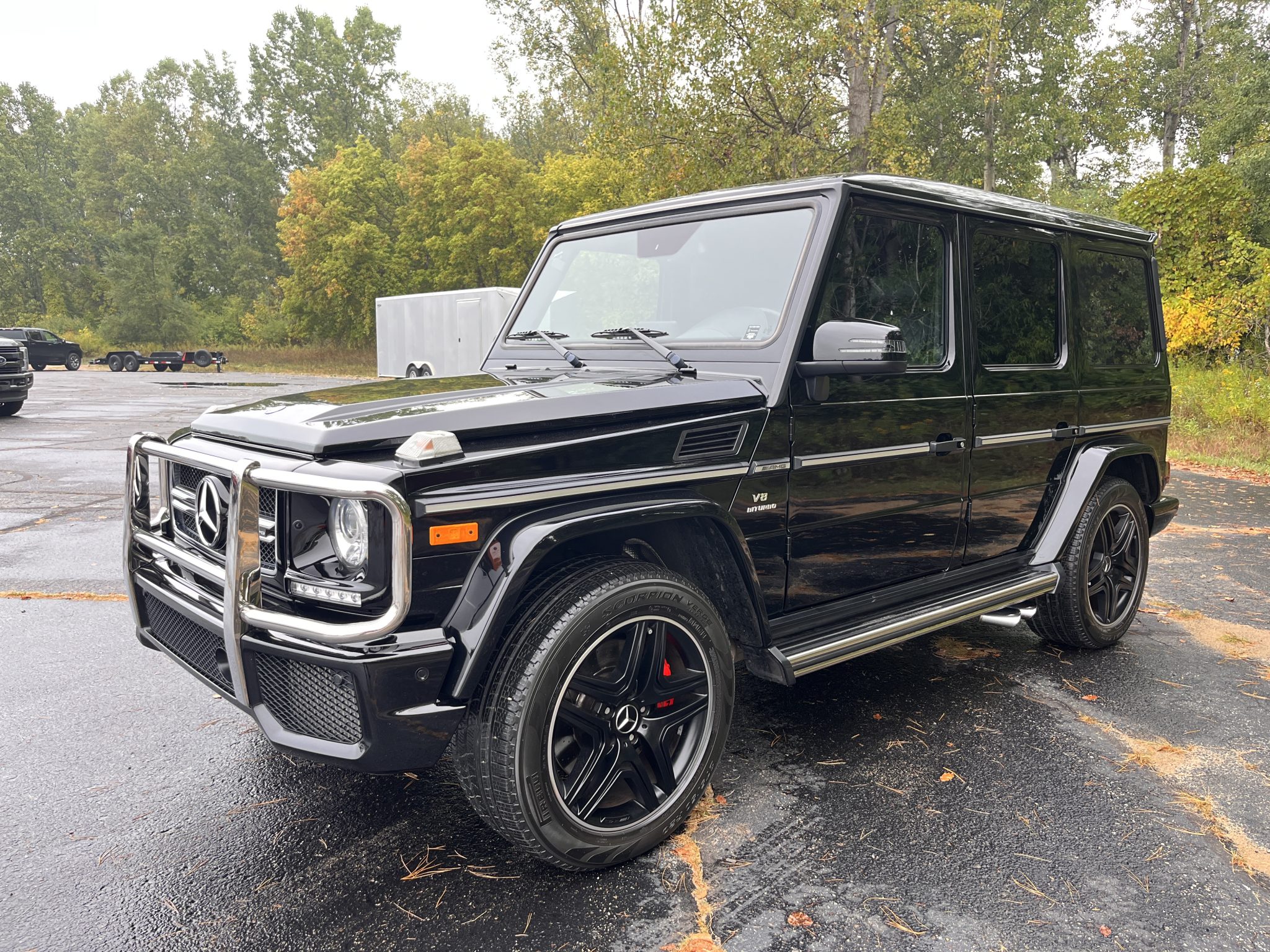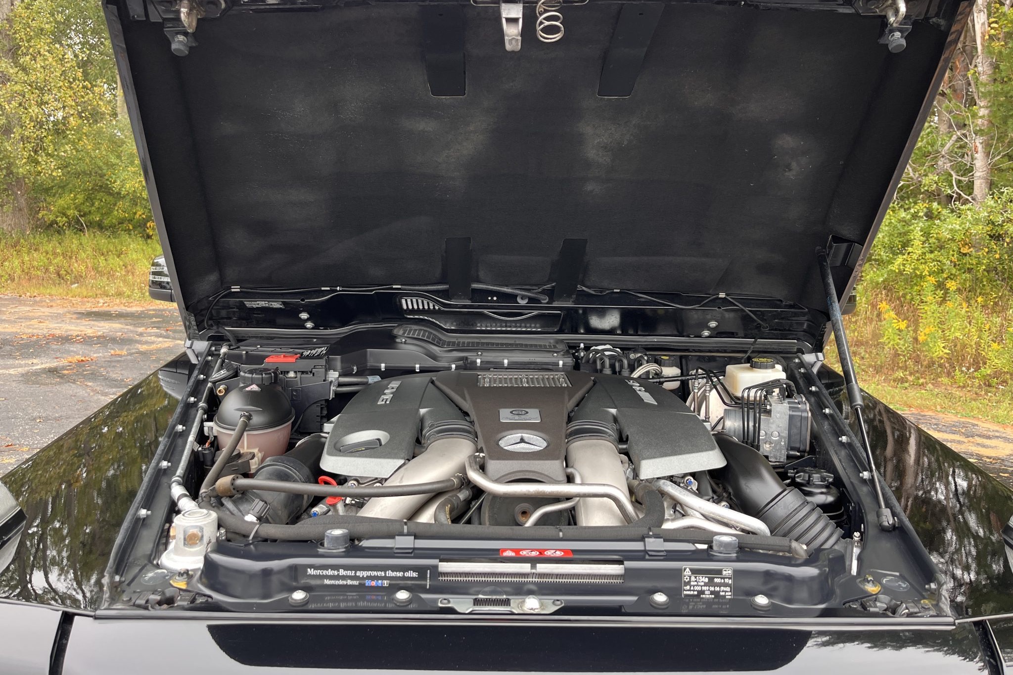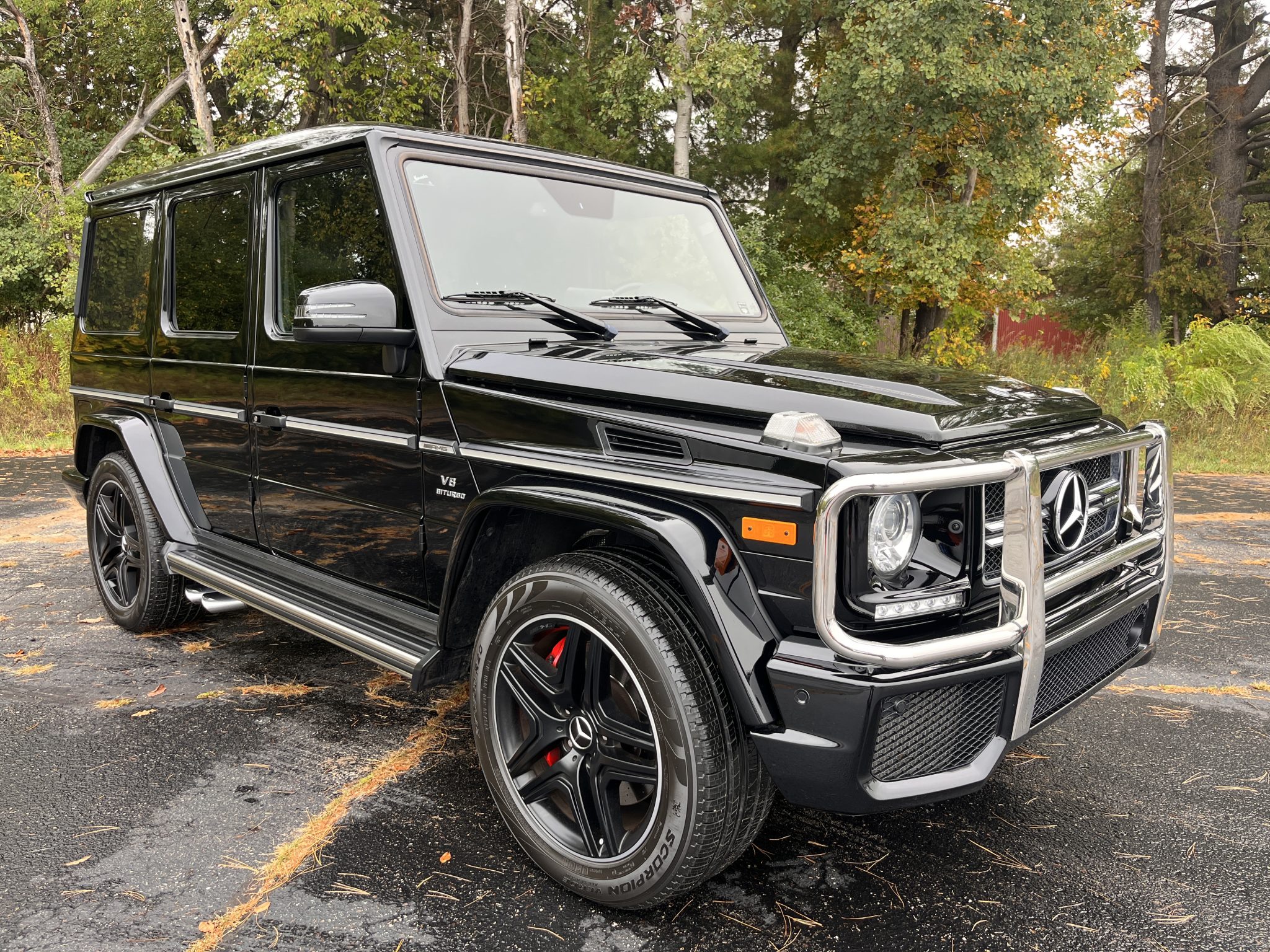the truck is powered by a twin-turbocharged 5.5-liter V8 linked with a seven-speed automatic transmission, a dual-range transfer case, and three locking differentials. Finished in Black over matching Designo Exclusive Nappa leather, it is equipped with 20″ AMG wheels, bi-xenon headlights, a sunroof, Parktronic, a rearview camera, blind-spot monitoring, heated and ventilated power-adjustable front seats, heated rear seats, navigation, a Harman Kardon sound system, Distance Pilot Distronic, and dual-zone automatic climate control.