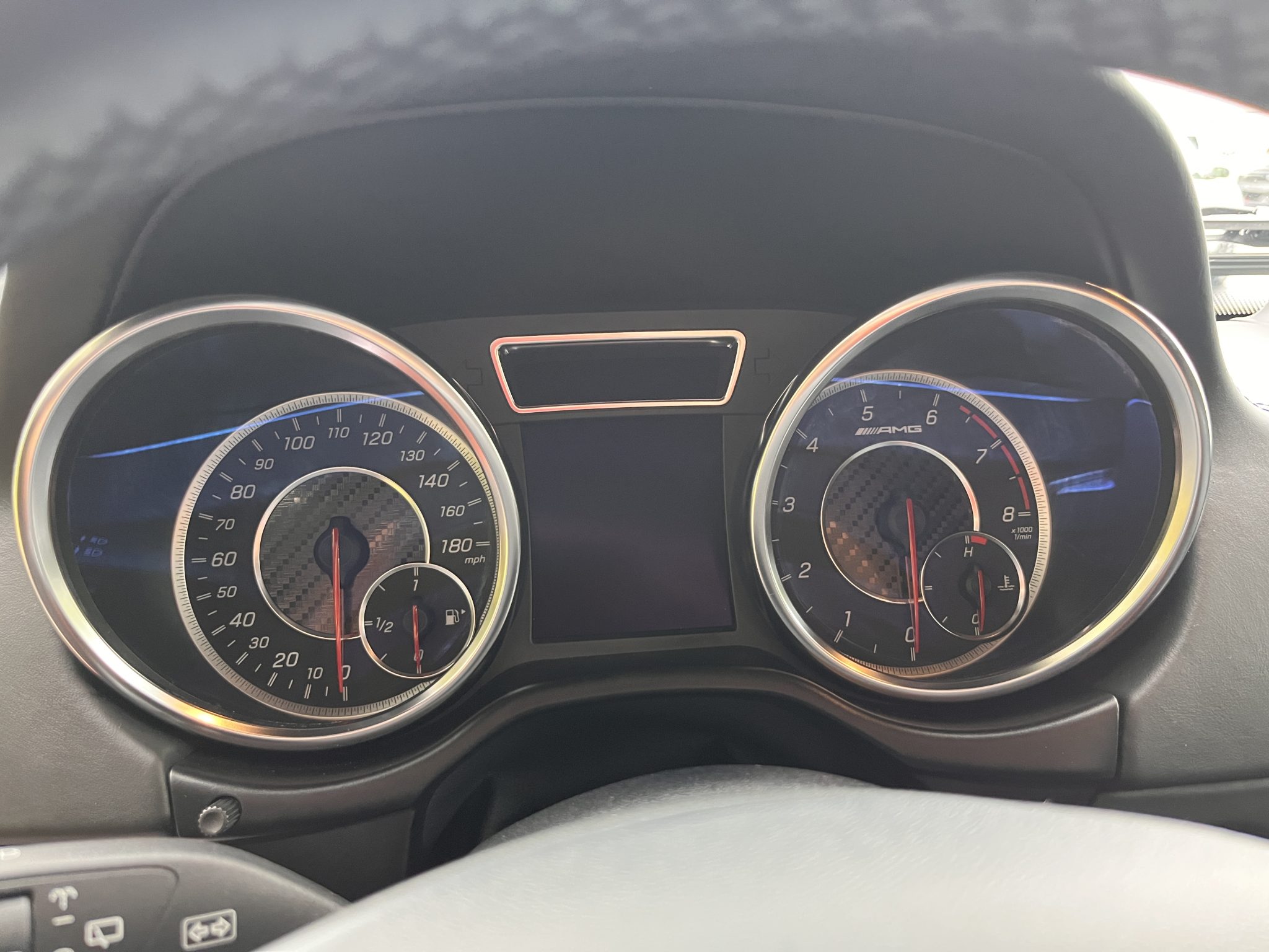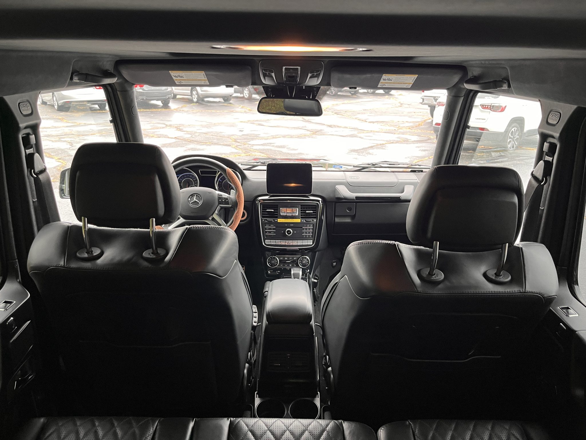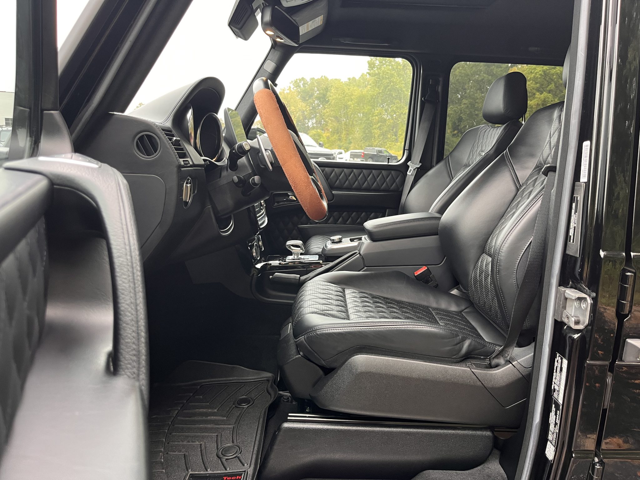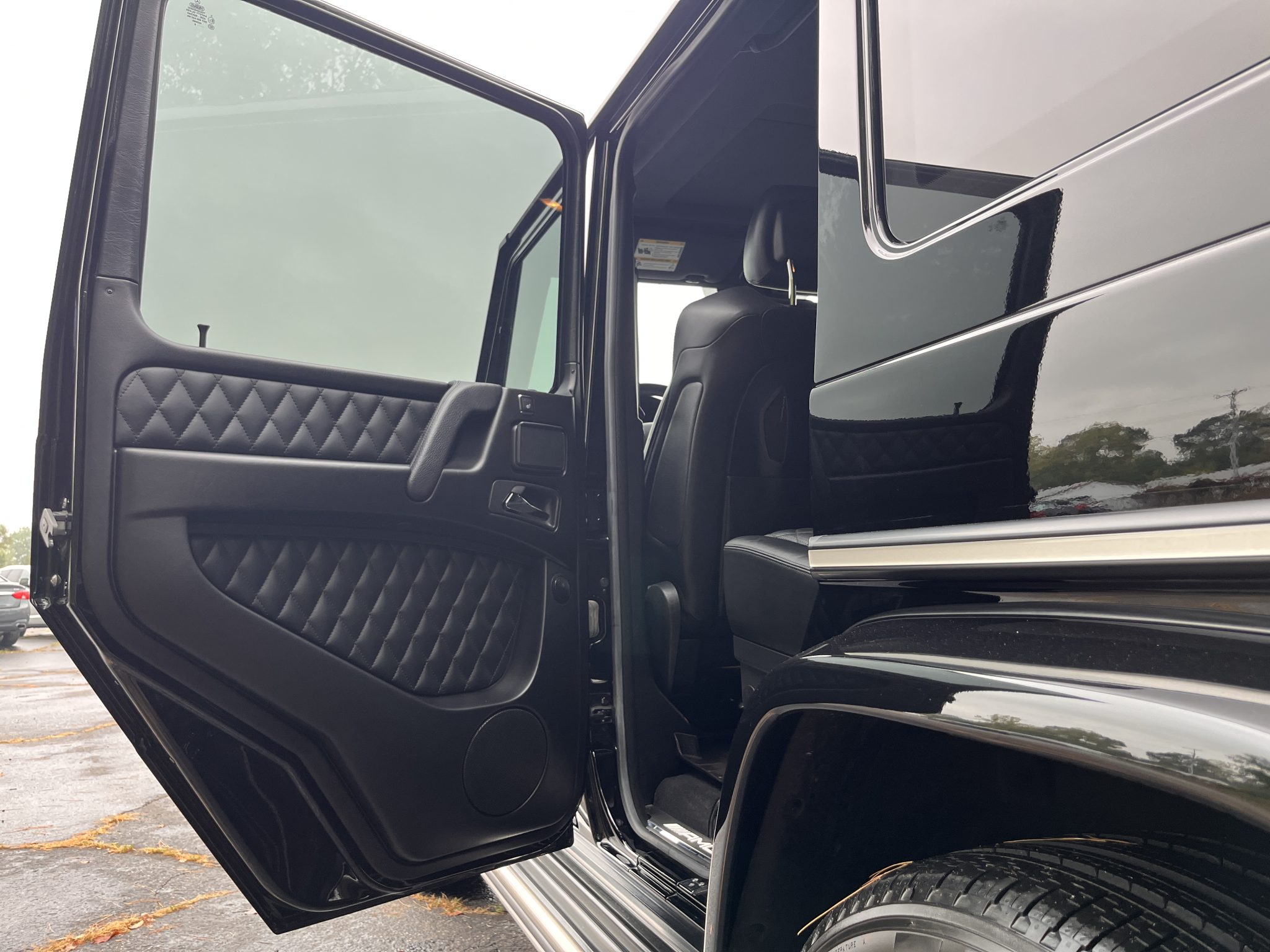 the truck is powered by a twin-turbocharged 5.5-liter V8 linked with a seven-speed automatic transmission, a dual-range transfer case, and three locking differentials. Finished in Black over matching Designo Exclusive Nappa leather, it is equipped with 20″ AMG wheels, bi-xenon headlights, a sunroof, Parktronic, a rearview camera, blind-spot monitoring, heated and ventilated power-adjustable front seats, heated rear seats, navigation, a Harman Kardon sound system, Distance Pilot Distronic, and dual-zone automatic climate control.