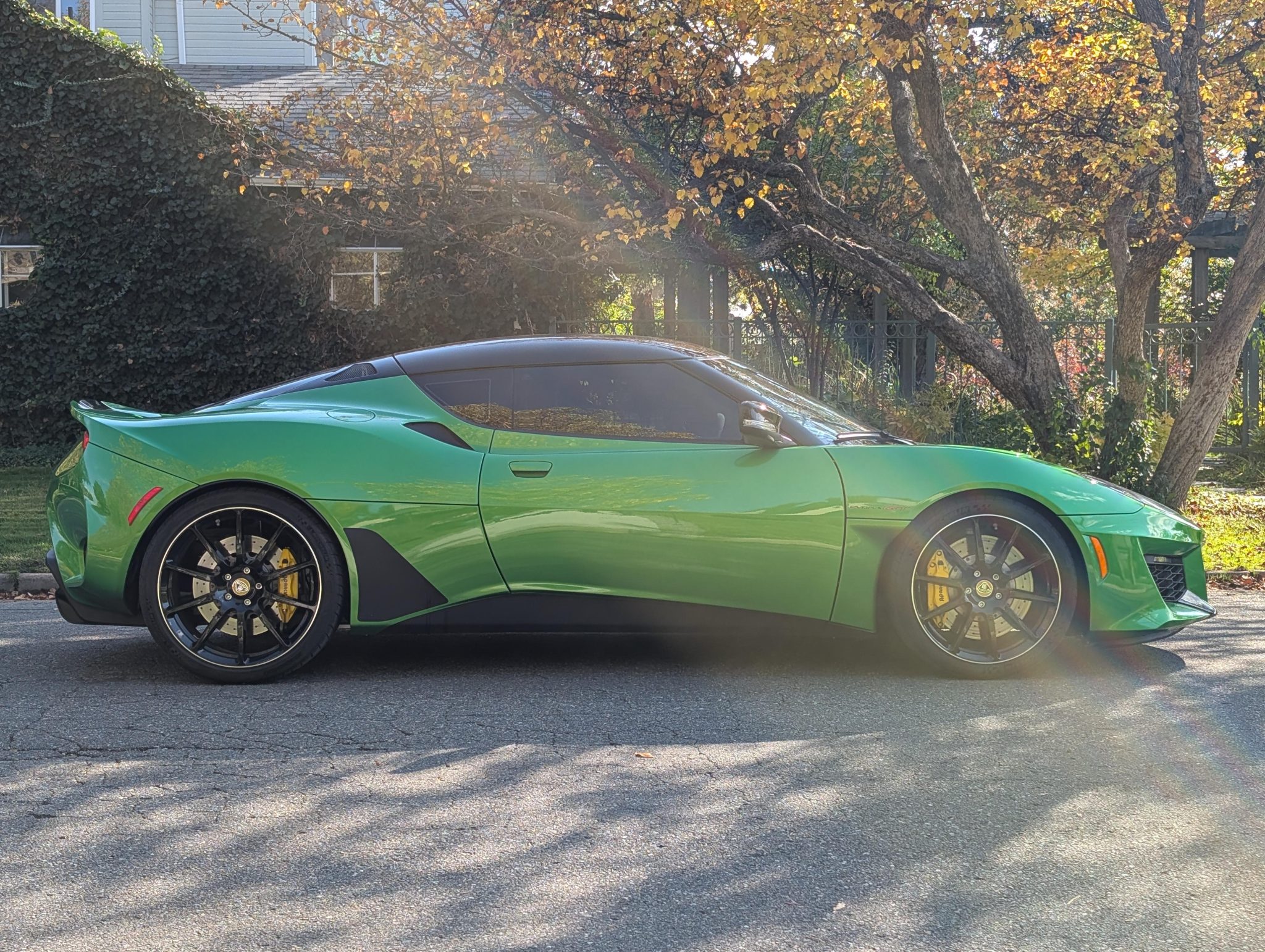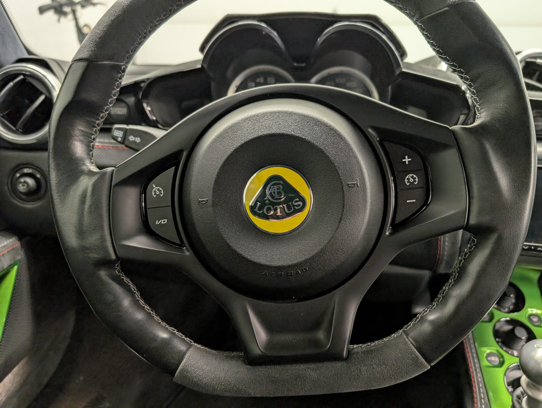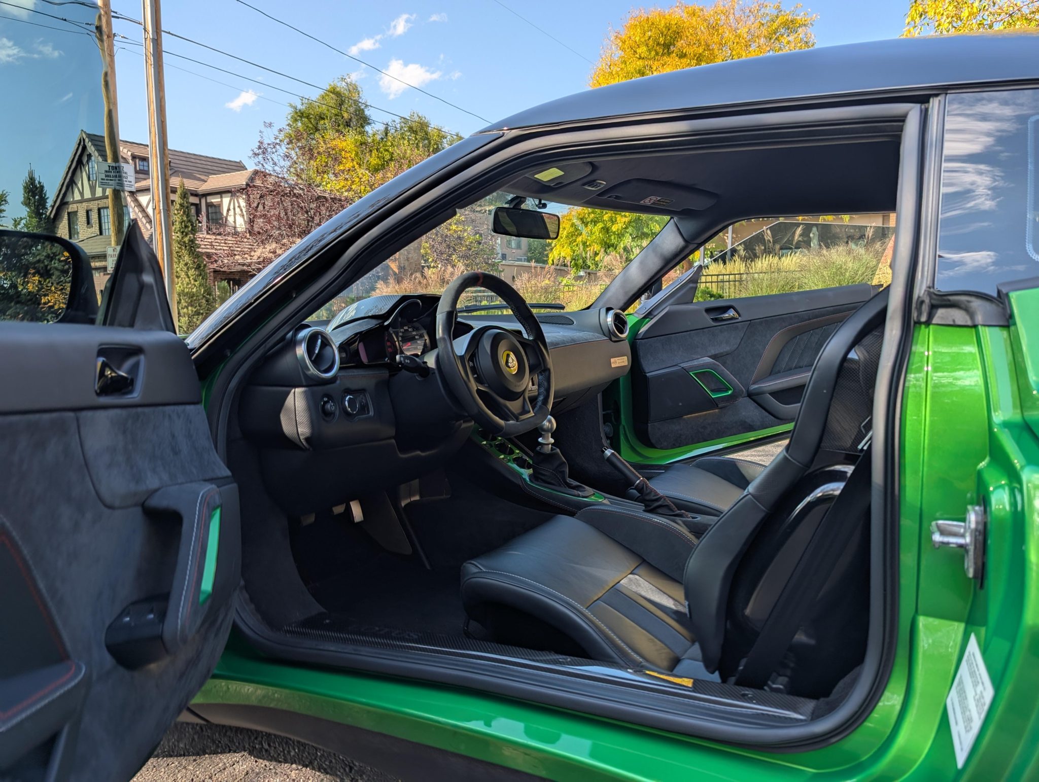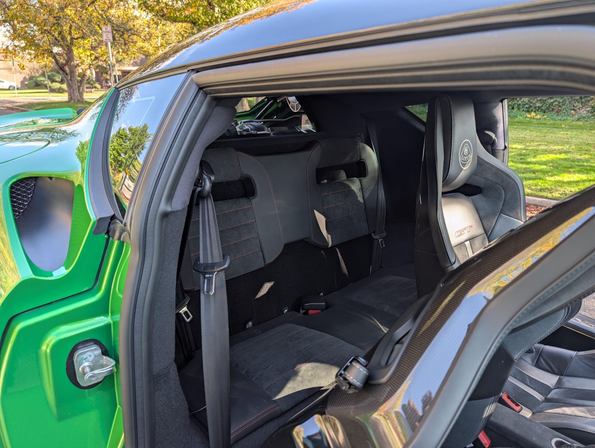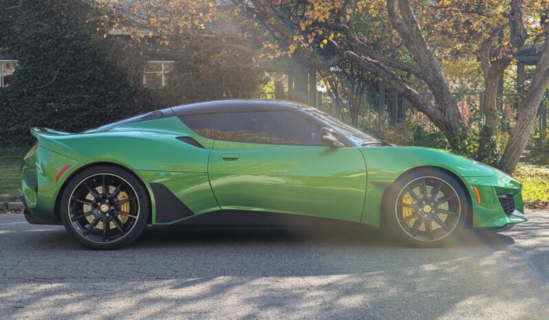 This 2020 Lotus Evora GT 2+2 has 4,700 miles Powered by a supercharged 3.5-liter V6 linked with a six-speed manual transaxle, the car is equipped with black leather and Alcantara, a limited-slip differential, the Vivid Green Interior Color Pack, bi-xenon headlights, LED taillights, rear parking sensors, 19″ and 20″ diamond-cut forged wheels, heated carbon-fiber bucket seats, a subwoofer, an amplifier, a rear-view camera, an Alpine head unit, cruise control, two rear seats, and air conditioning.