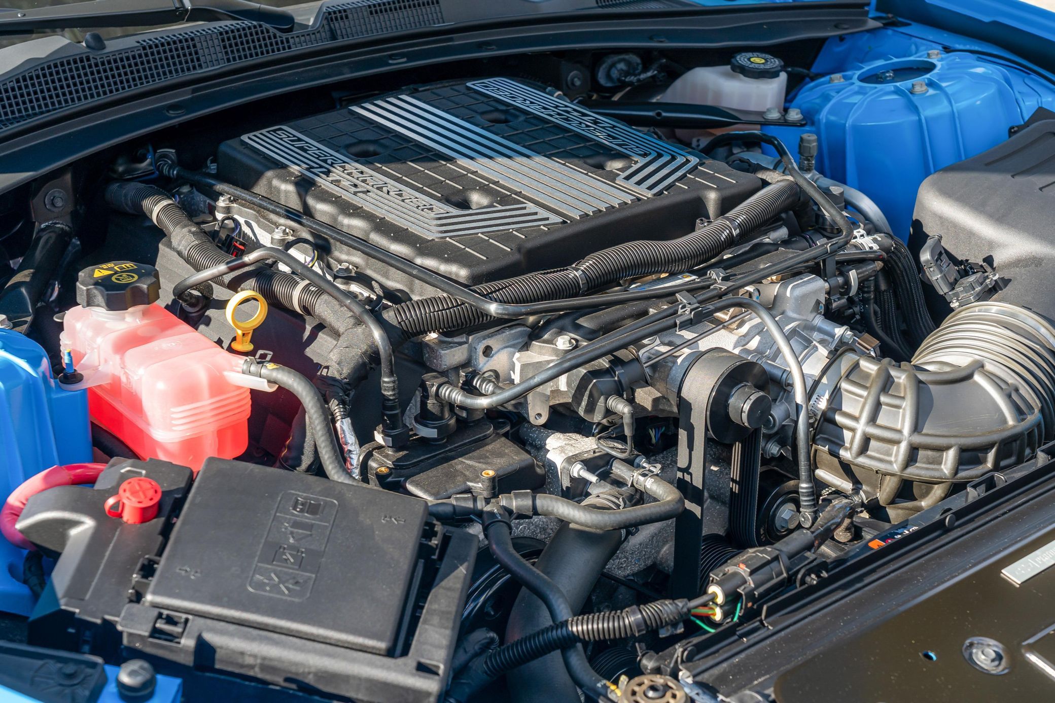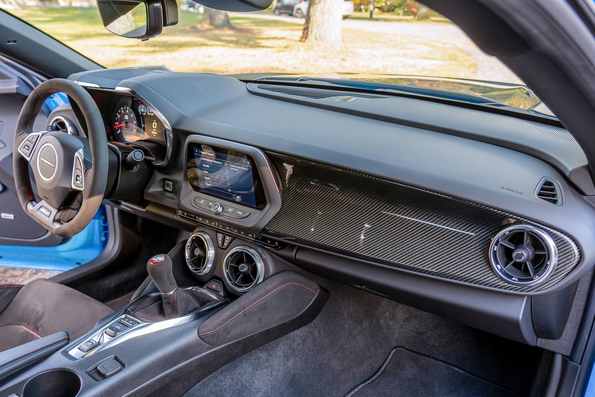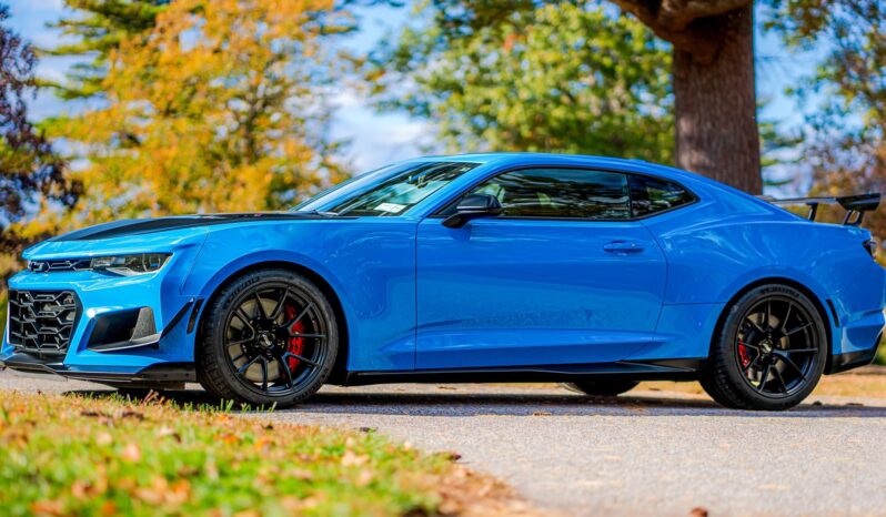 The Chevy Camaro ZL1 is an amazing performance car that offers a muscular supercharged V8, bold styling, and great handling – especially when equipped with the optional ZL1 1LE Extreme Track Package, like this example has. This particular ZL1 is also equipped with the 6-speed manual transmission, and it's finished in head-turning Rapid Blue. Other benefits include some great equipment like heated and ventilated front seats, carbon fiber interior trim, and a Bose premium sound system. Power comes from a 6.2-liter supercharged V8, rated at 650 horsepower and 650 lb-ft of torque. Output is sent to the rear wheels via a 6-speed manual transmission.