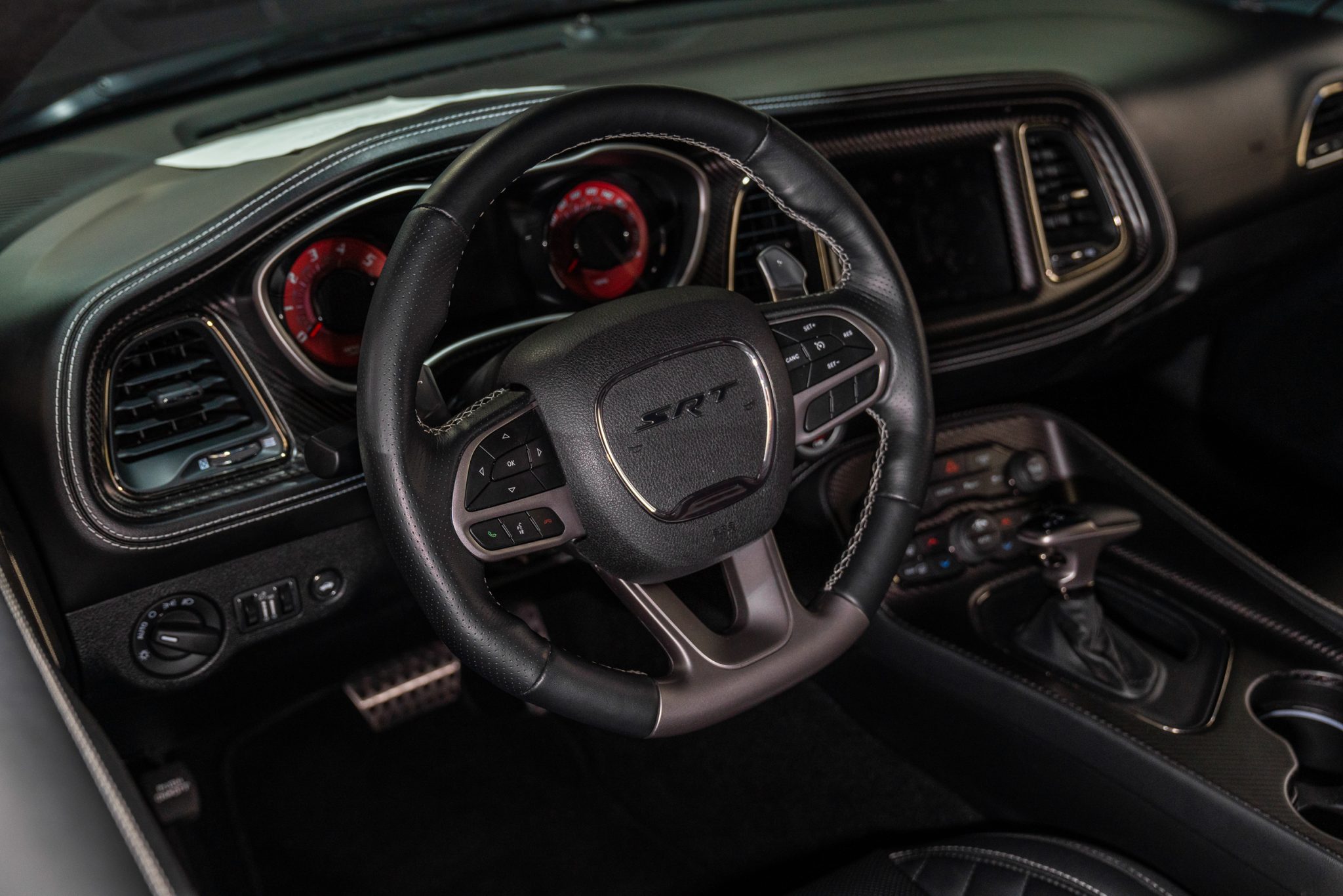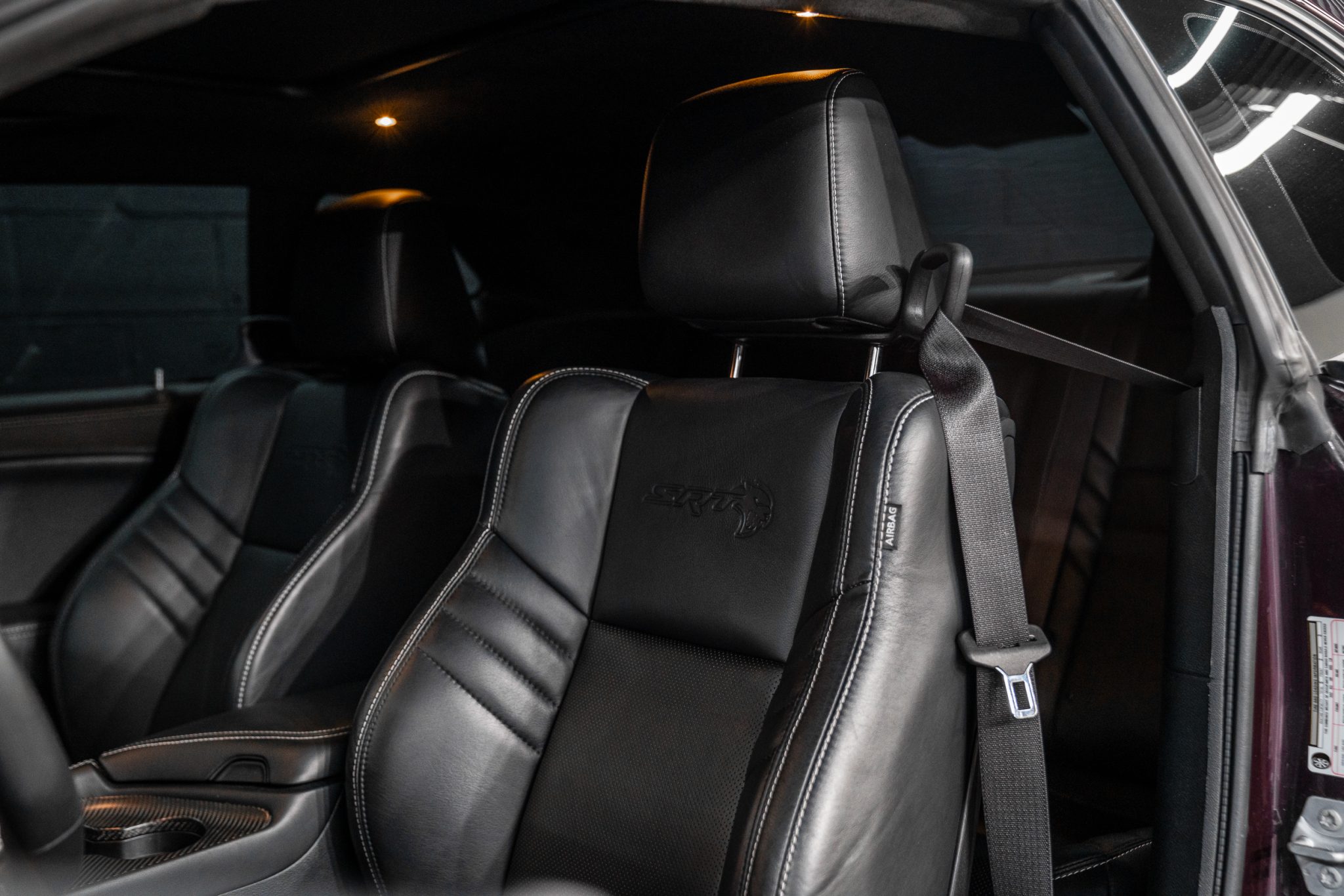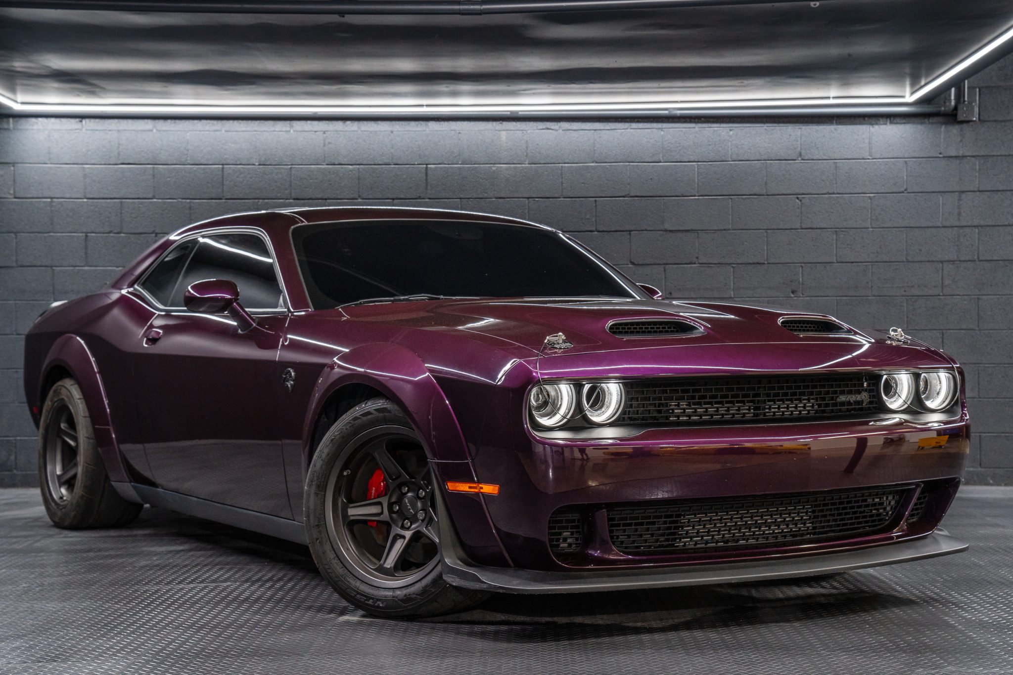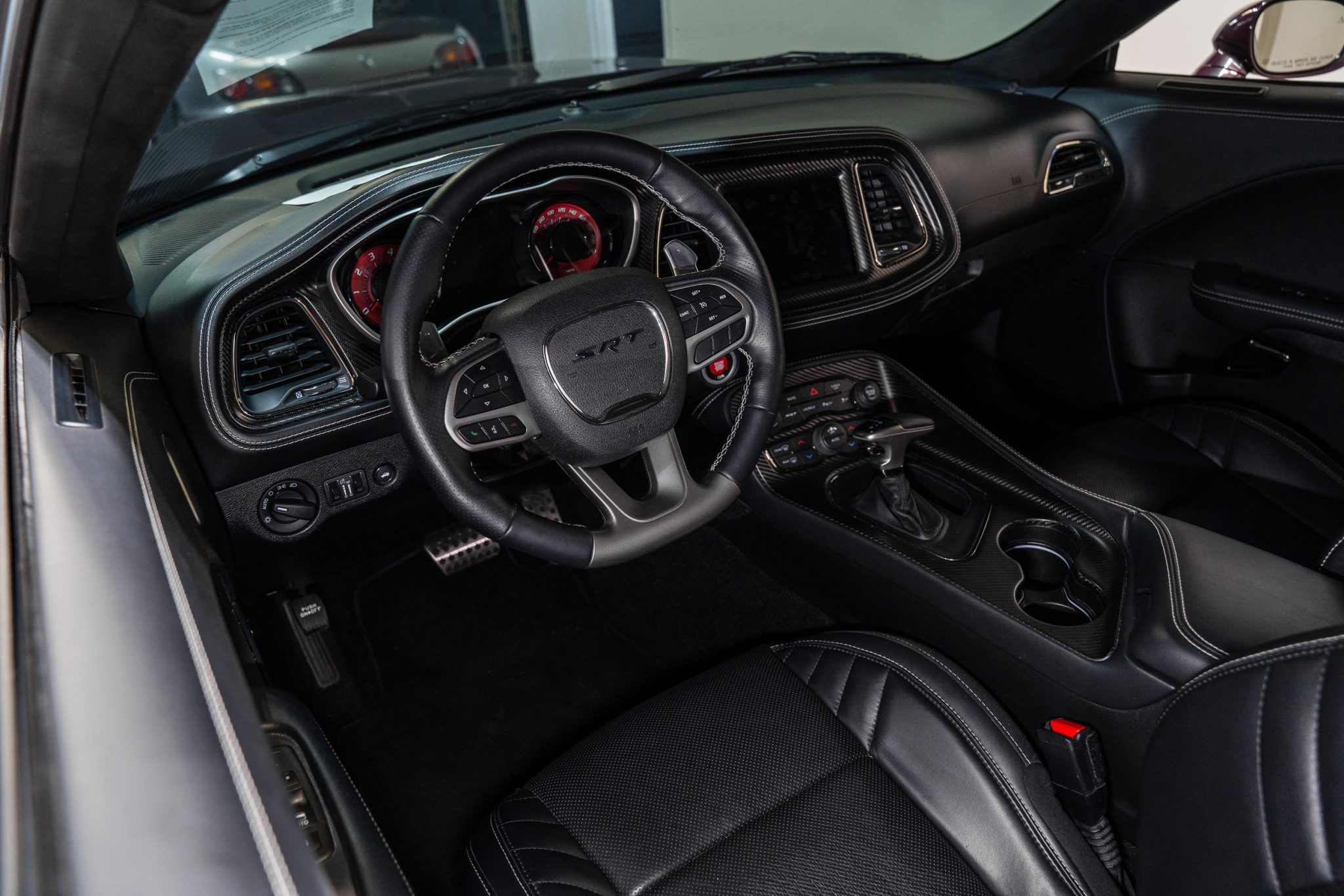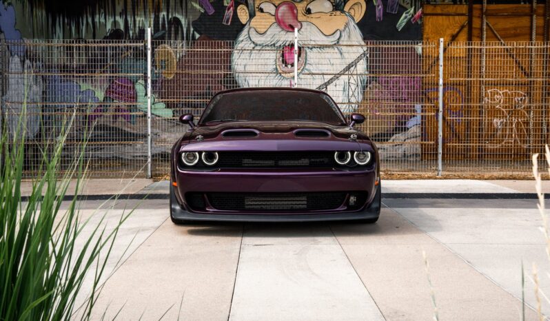 Power is provided by a supercharged 6.2-liter V8 linked to an eight-speed automatic transmission and a limited-slip differential. Performance features include launch control with Launch Assist, a Super Stock adaptive-damping suspension, an SRT Power Chiller, a line locker, 18″ aluminum wheels, and Brembo brake calipers. Additional equipment includes the Plus Package, HID Air-Catcher headlamps, widebody fenders, heated and ventilated power-adjustable front seats, a Harman Kardon sound system, and a Uconnect infotainment system with navigation.