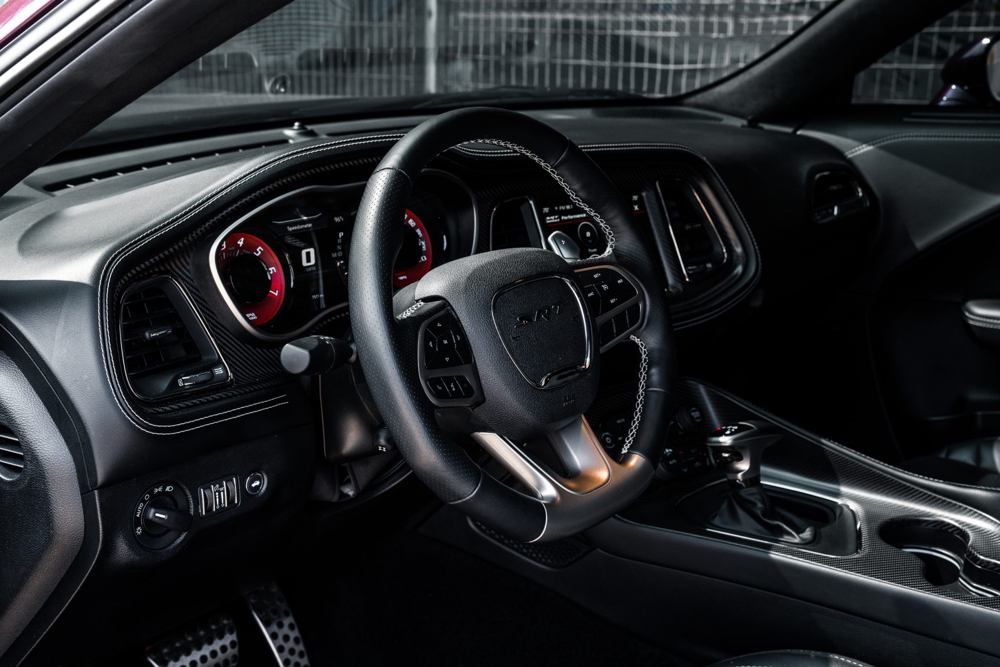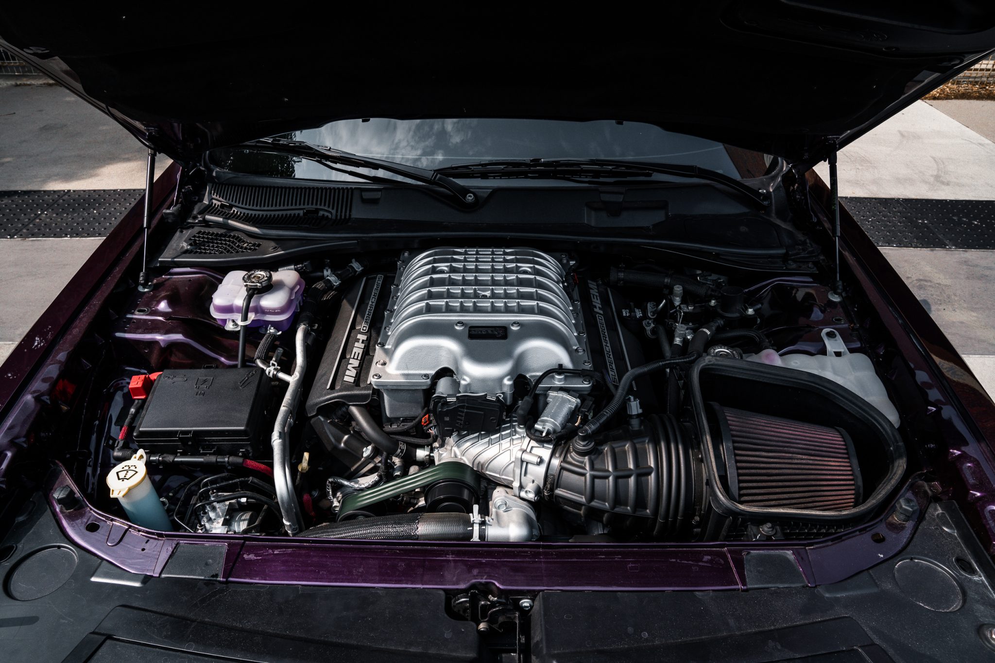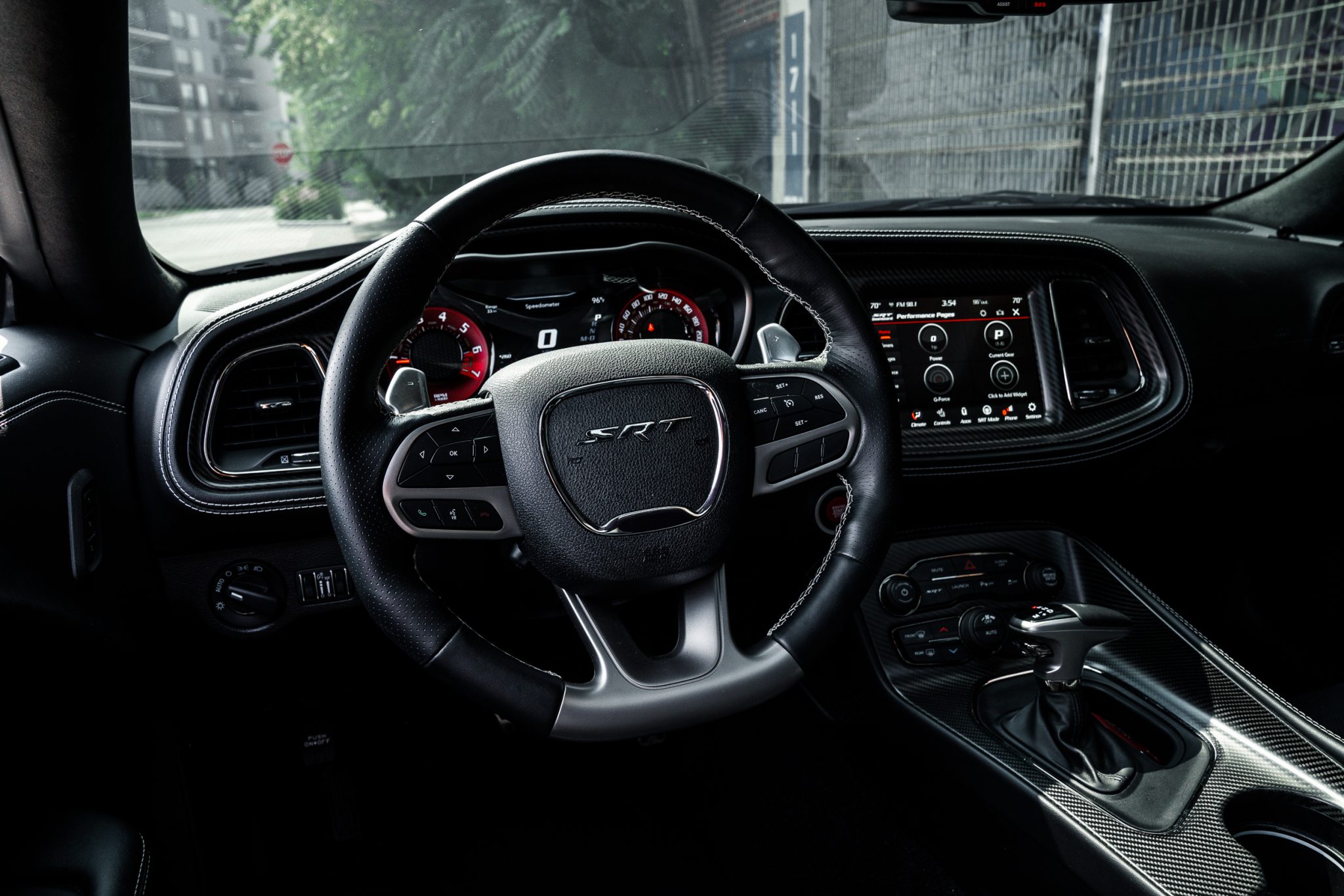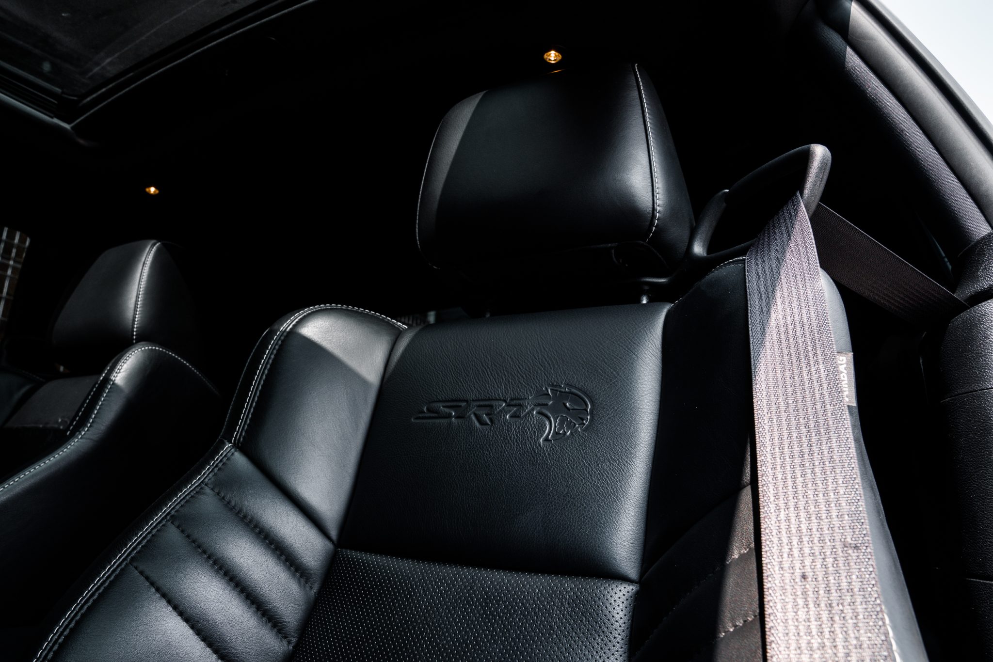 Power is provided by a supercharged 6.2-liter V8 linked to an eight-speed automatic transmission and a limited-slip differential. Performance features include launch control with Launch Assist, a Super Stock adaptive-damping suspension, an SRT Power Chiller, a line locker, 18″ aluminum wheels, and Brembo brake calipers. Additional equipment includes the Plus Package, HID Air-Catcher headlamps, widebody fenders, heated and ventilated power-adjustable front seats, a Harman Kardon sound system, and a Uconnect infotainment system with navigation.