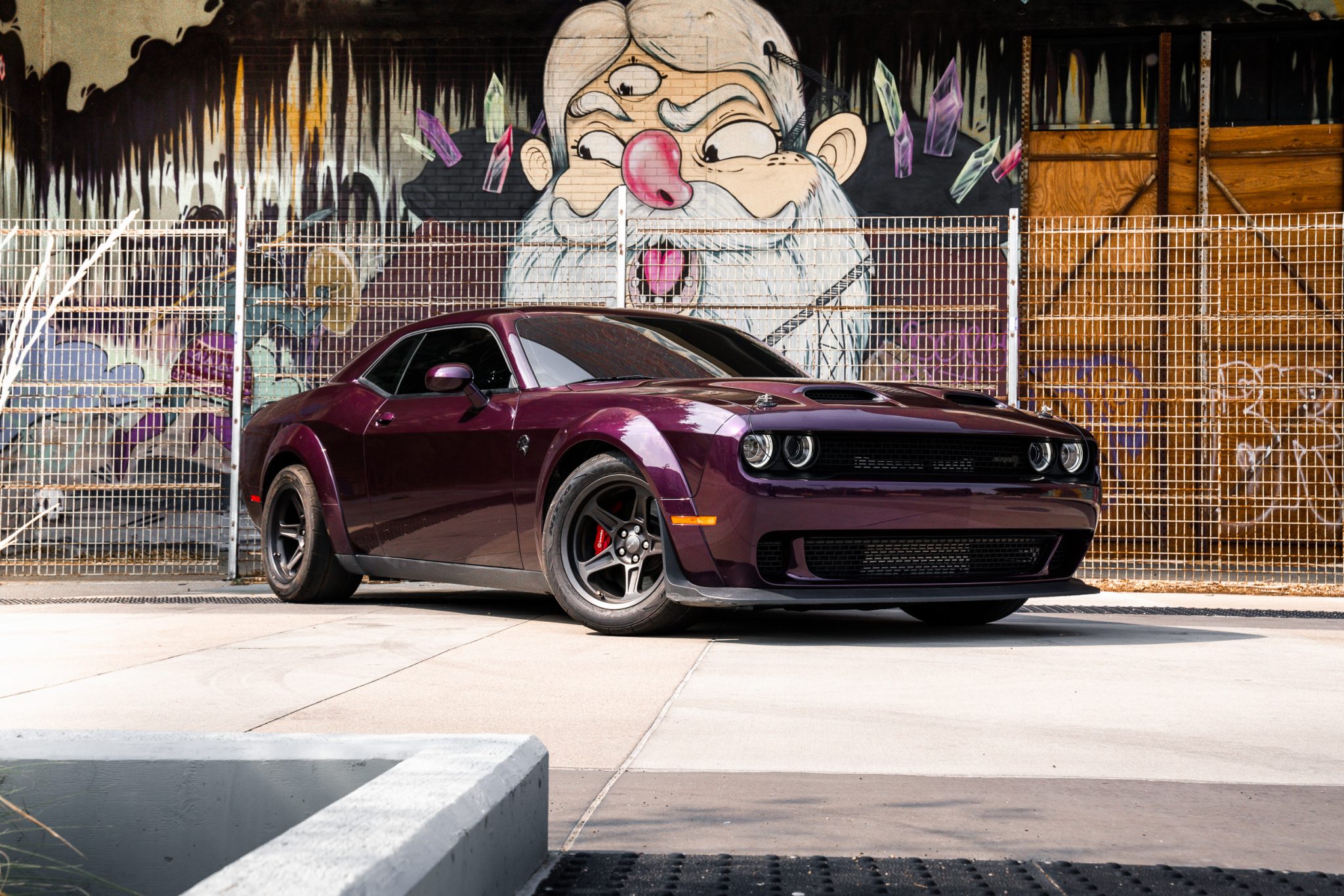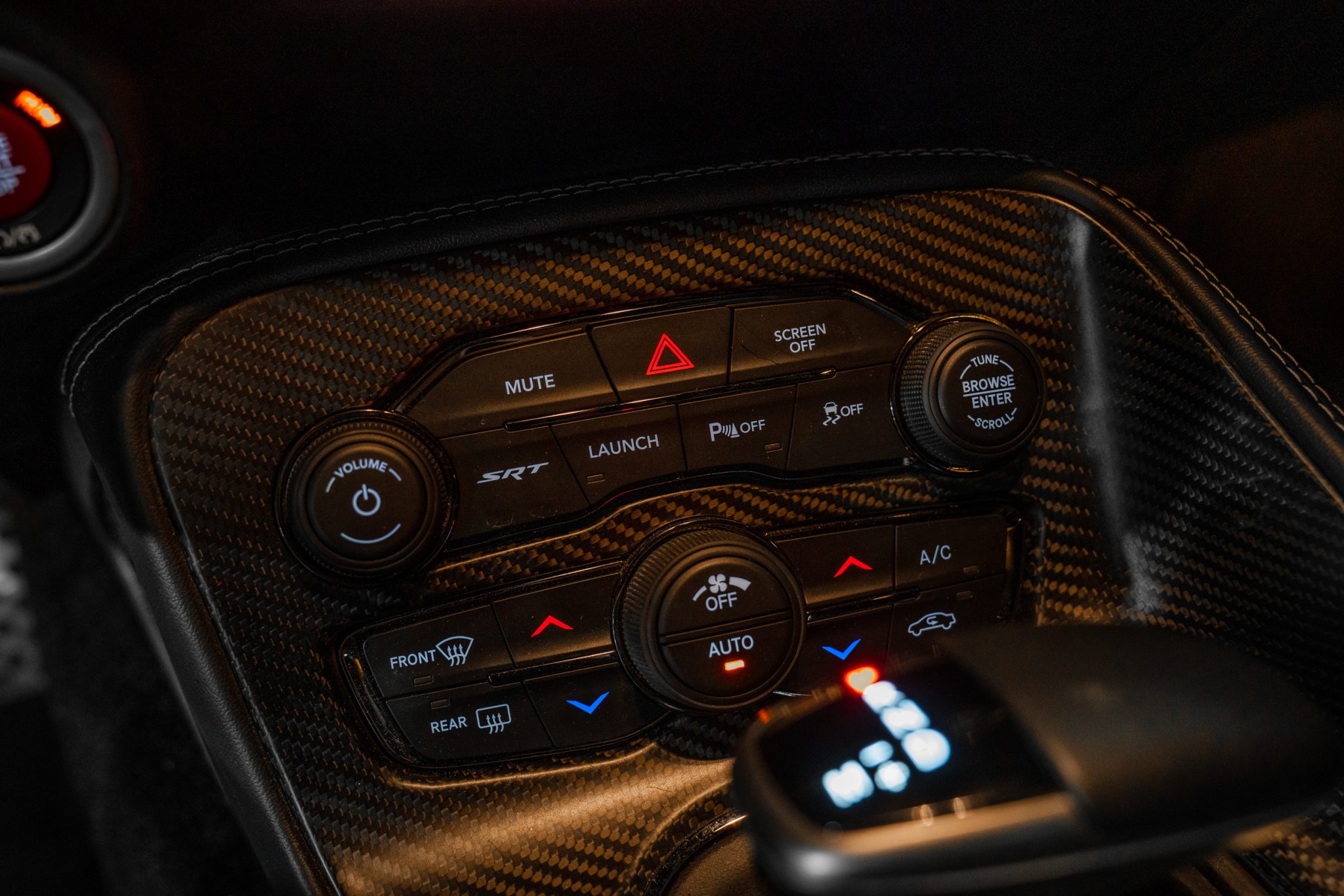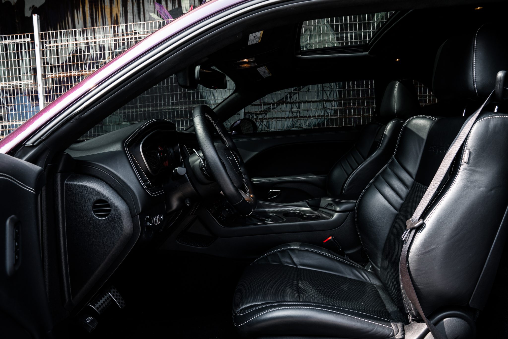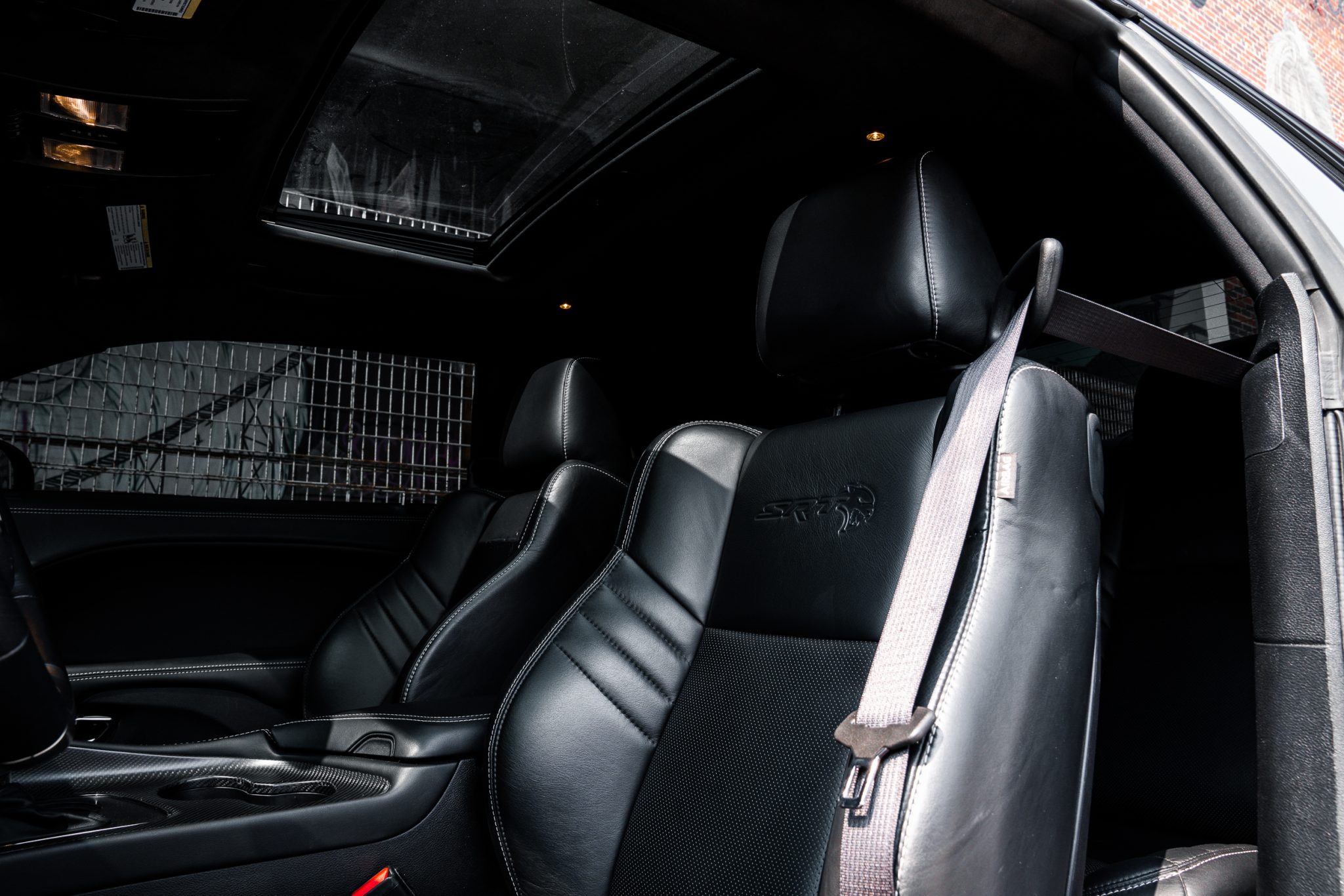 Power is provided by a supercharged 6.2-liter V8 linked to an eight-speed automatic transmission and a limited-slip differential. Performance features include launch control with Launch Assist, a Super Stock adaptive-damping suspension, an SRT Power Chiller, a line locker, 18″ aluminum wheels, and Brembo brake calipers. Additional equipment includes the Plus Package, HID Air-Catcher headlamps, widebody fenders, heated and ventilated power-adjustable front seats, a Harman Kardon sound system, and a Uconnect infotainment system with navigation.
