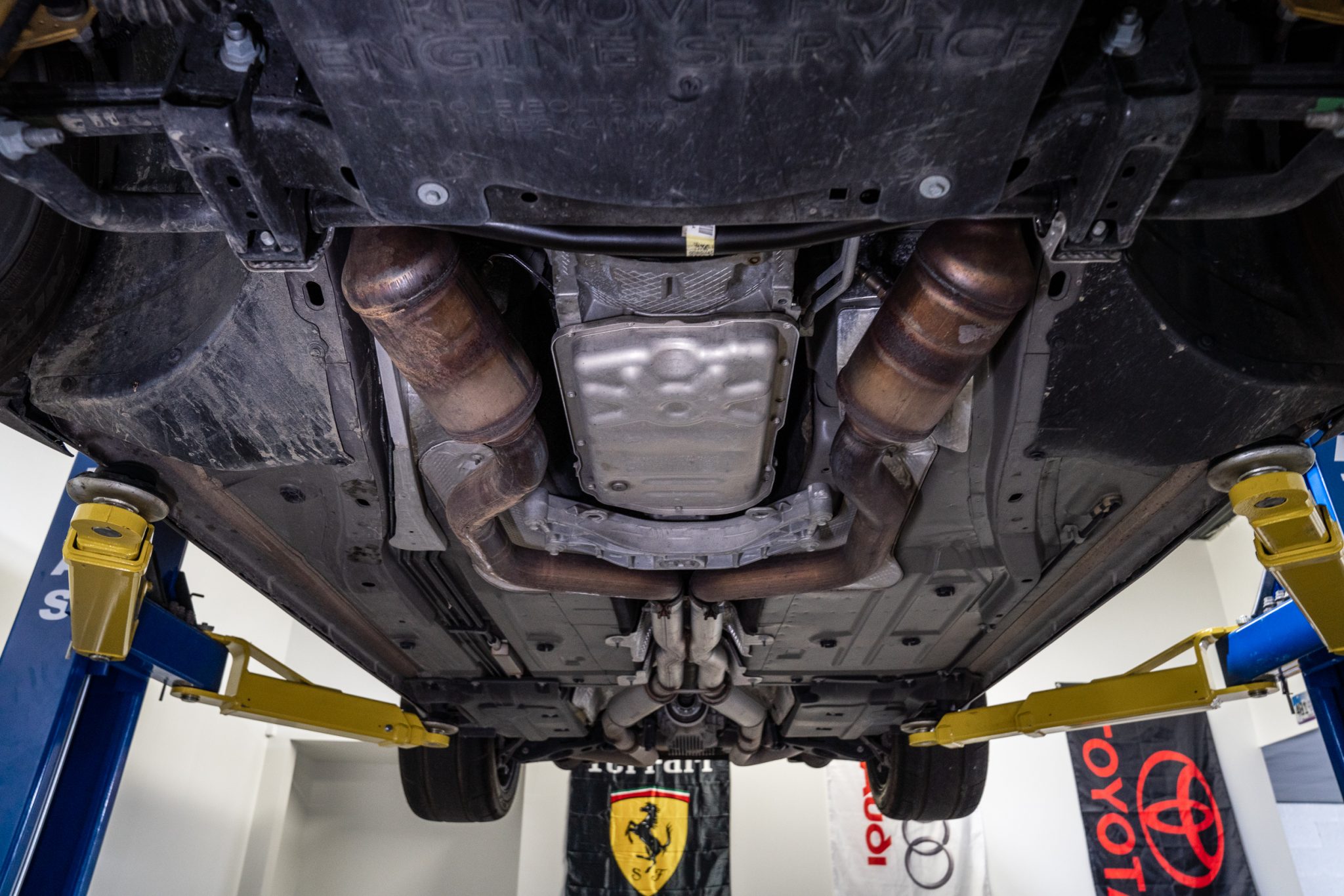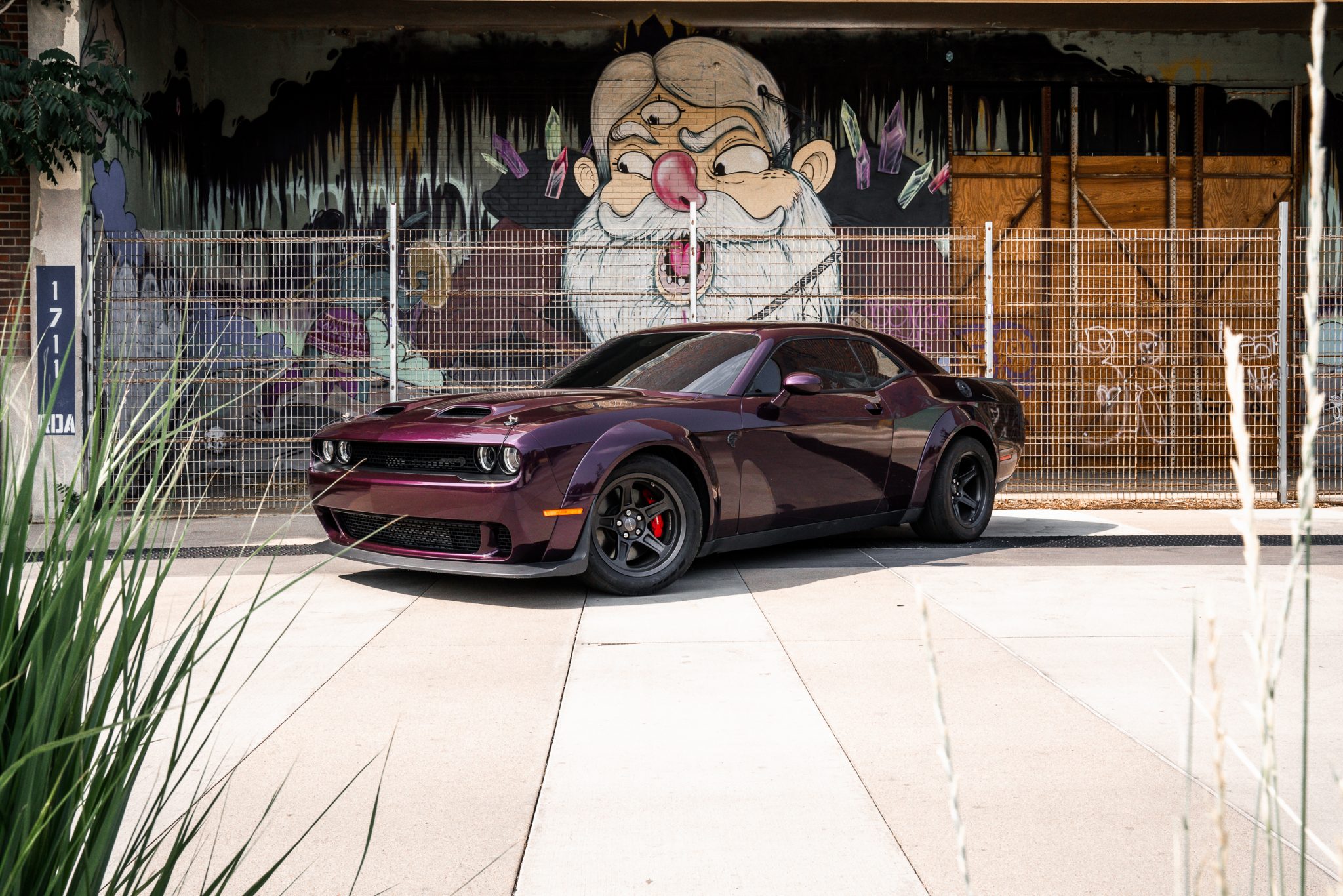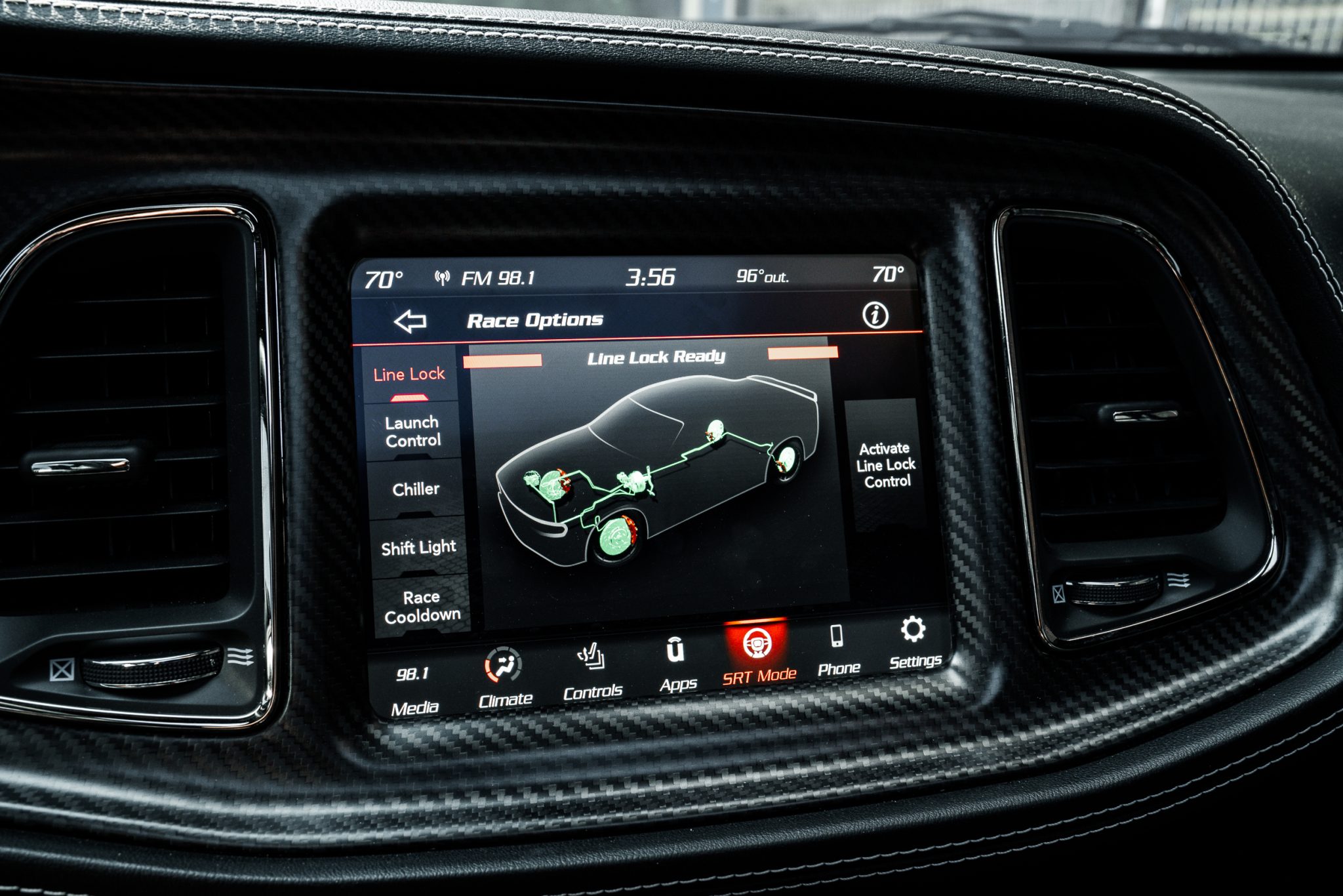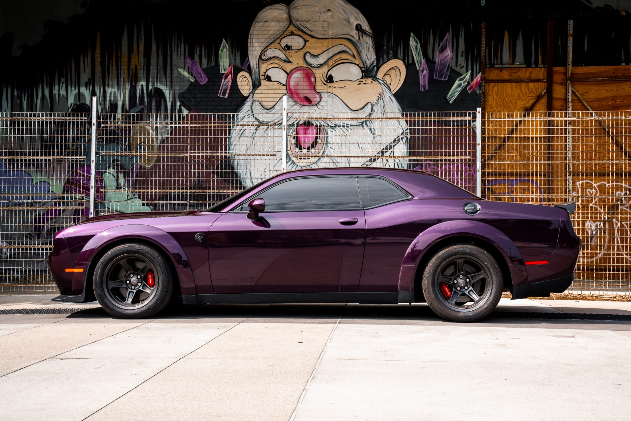 Power is provided by a supercharged 6.2-liter V8 linked to an eight-speed automatic transmission and a limited-slip differential. Performance features include launch control with Launch Assist, a Super Stock adaptive-damping suspension, an SRT Power Chiller, a line locker, 18″ aluminum wheels, and Brembo brake calipers. Additional equipment includes the Plus Package, HID Air-Catcher headlamps, widebody fenders, heated and ventilated power-adjustable front seats, a Harman Kardon sound system, and a Uconnect infotainment system with navigation.