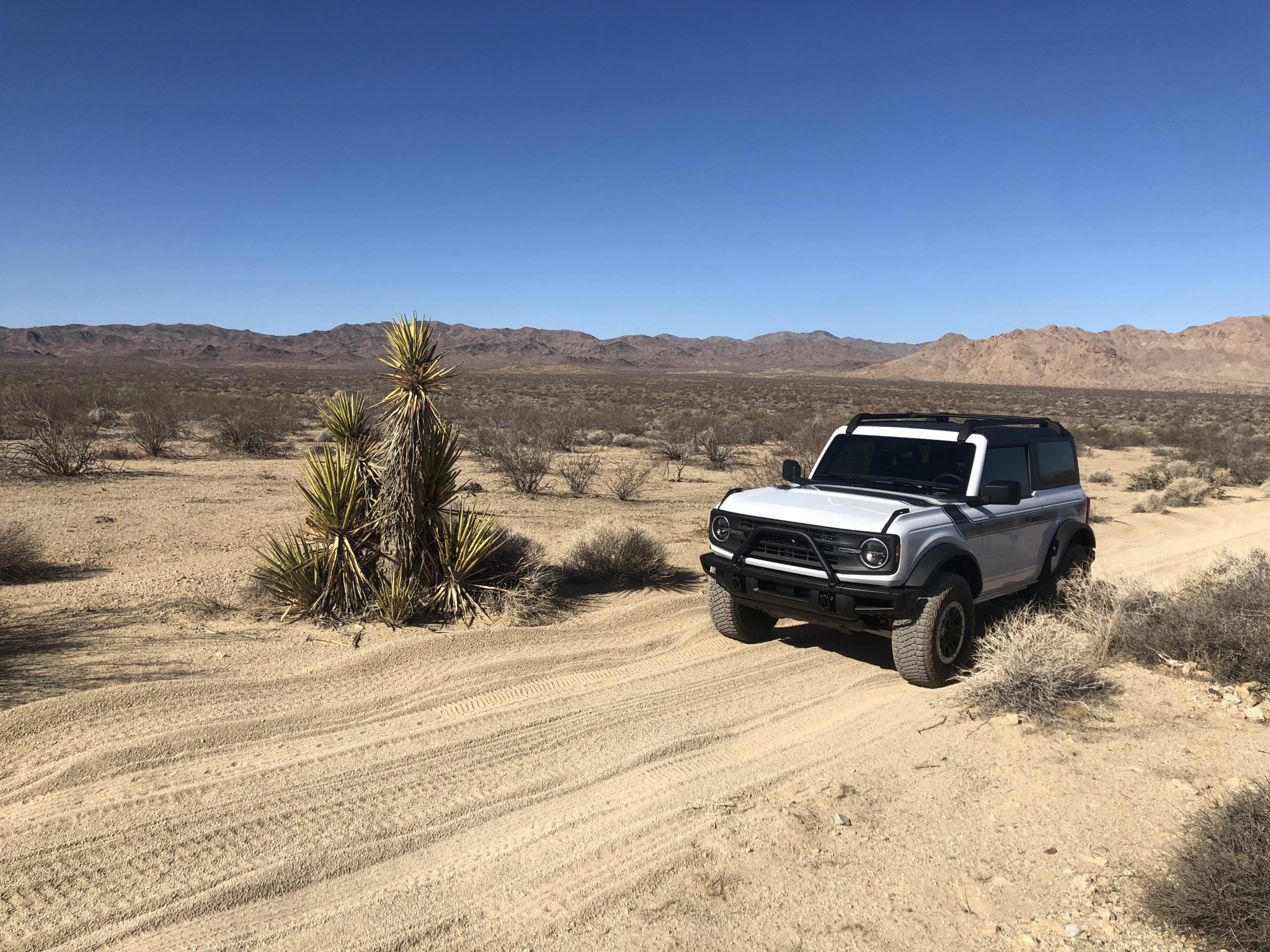 This 2022 Ford Bronco two-door is powered by a turbocharged 2.3-liter EcoBoost inline-four linked with a replacement seven-speed manual transmission, a dual-range transfer case, and electronic locking front and rear differentials. Finished in Oxford White over Dark Space Gray and Black Onyx cloth upholstery, it is equipped with the Sasquatch Package, 17″ beadlock-capable wheels, LED headlights, SYNC 4 infotainment, and a Terrain Management system with G.O.A.T. modes.