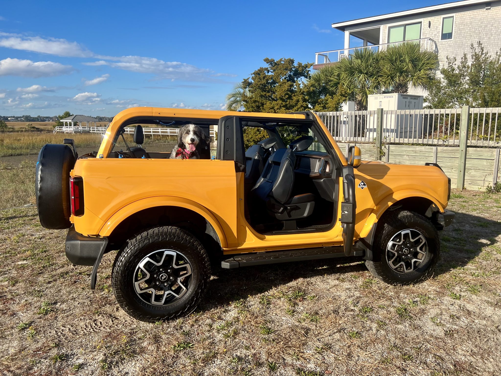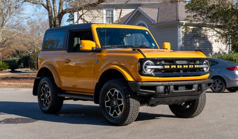 This 2022 Ford Bronco Outer Banks is a two-door example that is finished in Cyber Orange Metallic Tri-Coat over Black Onyx and Roast leather upholstery and is powered by a turbocharged 2.3-liter EcoBoost inline-four linked with a 10-speed automatic transmission, a dual-range transfer case, and a locking rear differential. Optioned with the High Package and a heavy-duty modular front bumper, the truck also has a Carbonized Gray hardtop with removable roof panels, LED headlights, running boards, 18″ V-spoke alloy wheels, and a 1.5″ suspension lift in addition to SYNC 4 infotainment, a table integrated into the swing-out tailgate, and a Terrain Management system with G.O.A.T. modes.