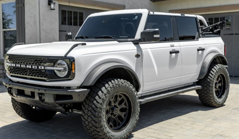 This 2022 Ford Bronco Wildtrak four-door is powered by a twin-turbocharged 2.7-liter EcoBoost V6 linked with a 10-speed automatic transmission, a dual-range transfer case, and electronic locking front and rear differentials. The truck is finished in Oxford White over Black Onyx and Medium Sandstone cloth upholstery and features the Lux, High, and Sasquatch packages in addition to a black soft top, a Fabtech 2.5″ lift kit, TIS Off-Road 20″ wheels, aftermarket window tint, a receiver hitch, keyless entry, LED headlights, parking sensors, SYNC 4 infotainment, and a Terrain Management system with G.O.A.T. modes.
