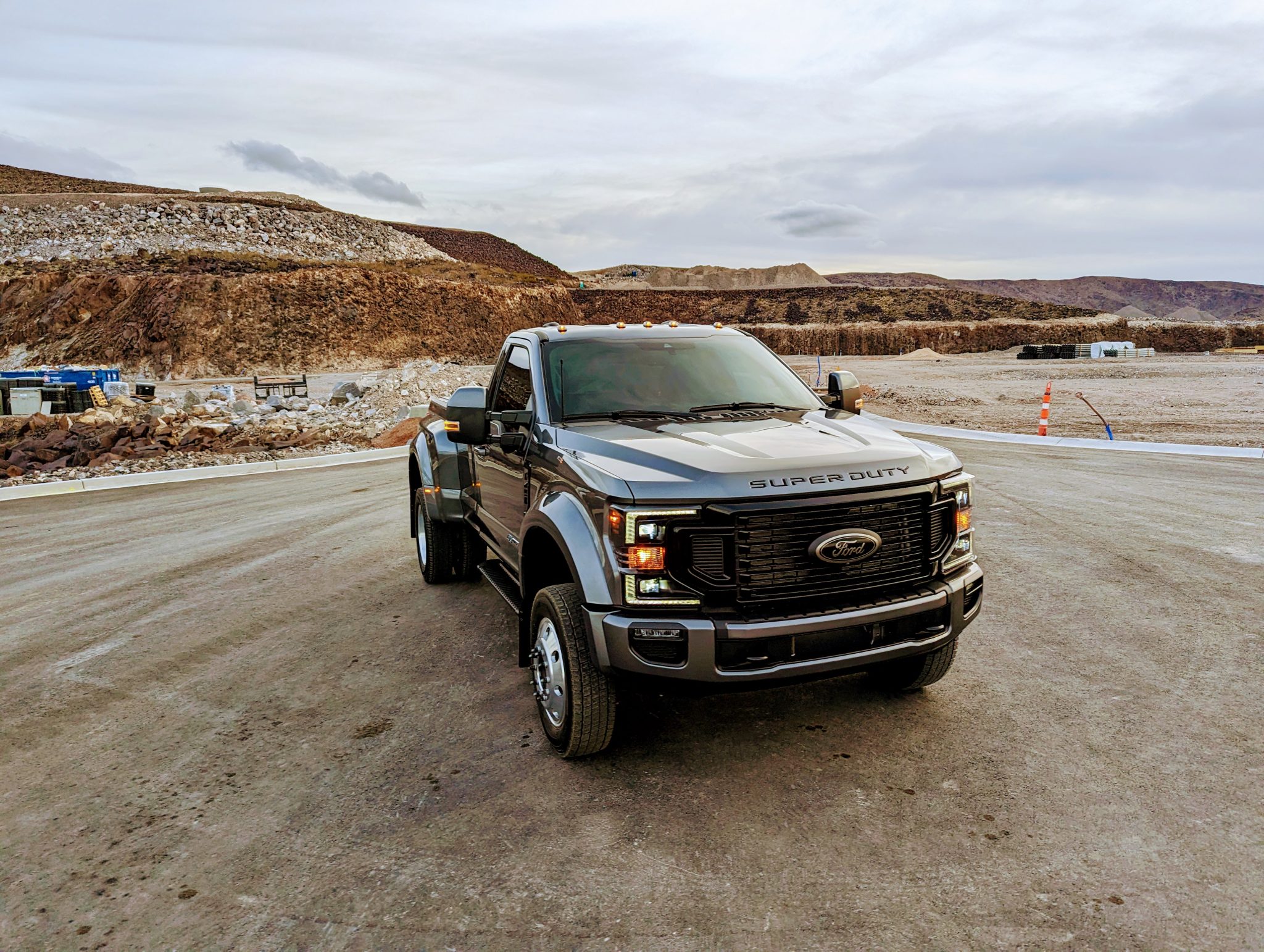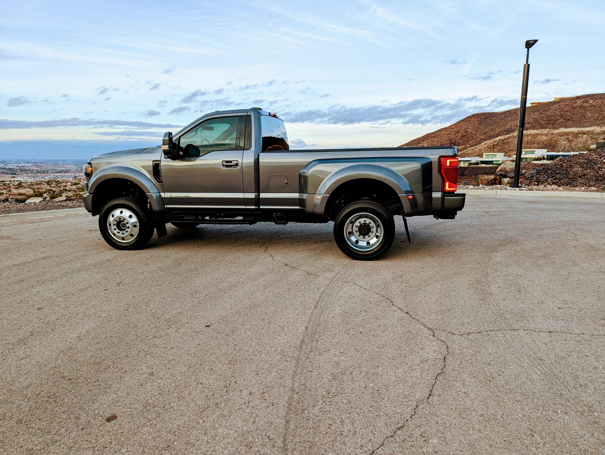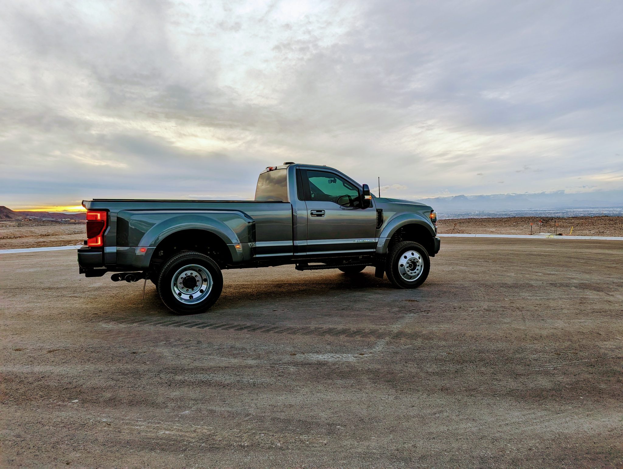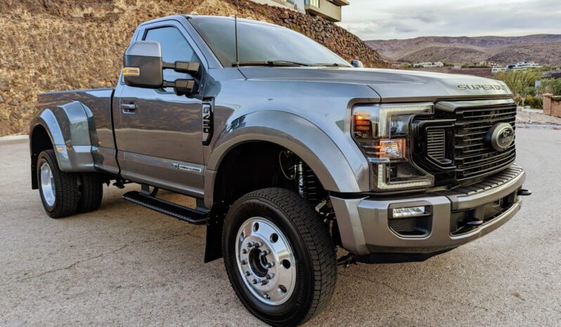 This 2022 Ford F-450 Super Duty is a 4×4 regular-cab dually pickup truck that was reportedly been modified with a 2.5″ Fox suspension lift, a Carli front torsion sway bar, a high-flow grille, Morimoto LED headlights, LED taillights, Rokblokz mudflaps, a Super Duty Platinum-sourced instrument cluster and interior components, and color-keyed bumpers, mirror caps, and door handles. Powered by a 6.7-liter turbodiesel V8 mated to a 10-speed automatic transmission and a dual-range transfer case, the truck is finished in Carbonized Gray over Medium Earth Gray cloth upholstery. Additional equipment includes a receiver hitch, a 360-degree camera system, rear parking sensors, running boards, polished 19.5″ wheels, and power-telescoping towing mirrors in addition to a power-adjustable driver seat, dual-zone automatic climate control, blind-spot monitoring, and SYNC3 infotainment with navigation.