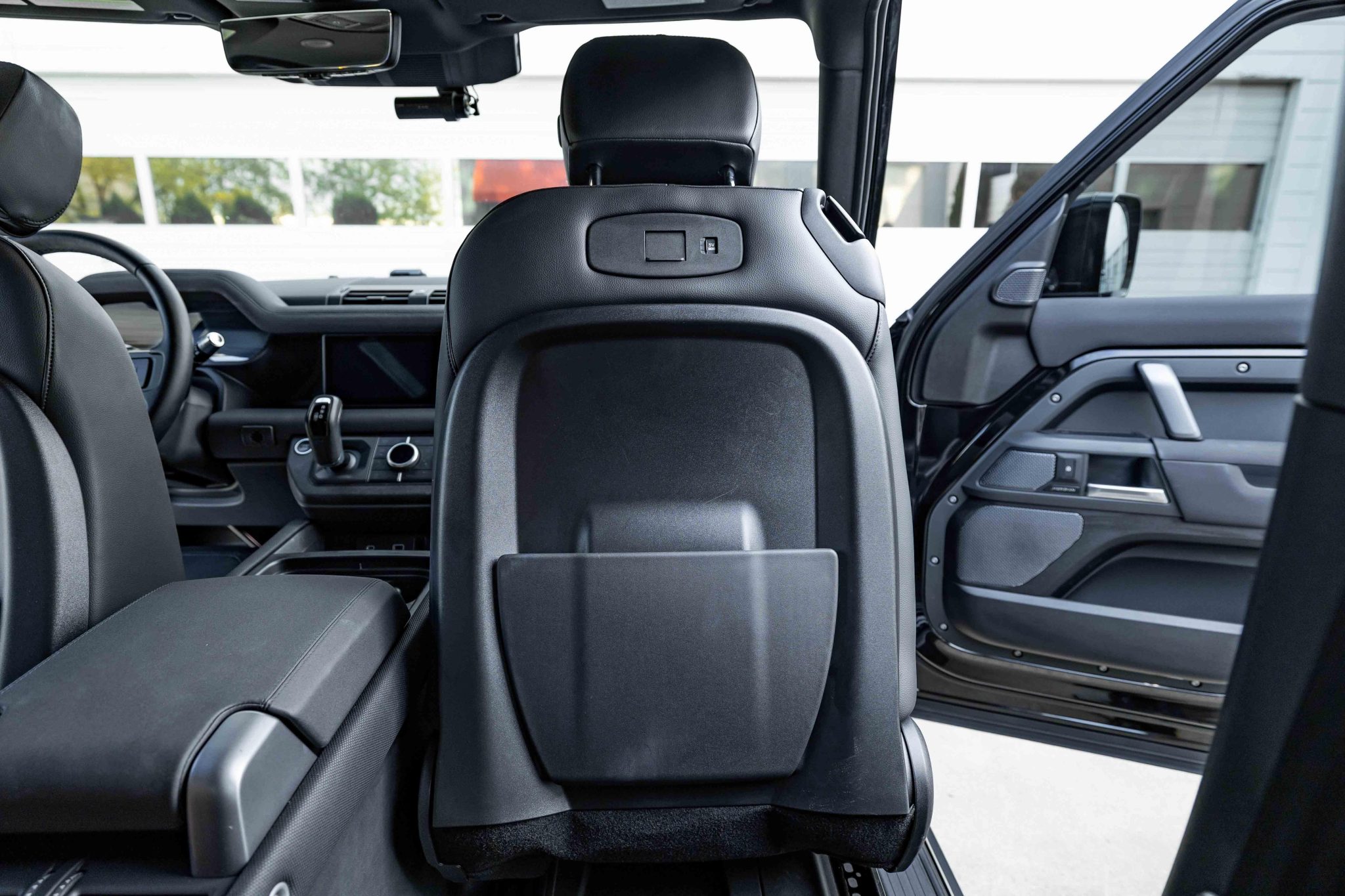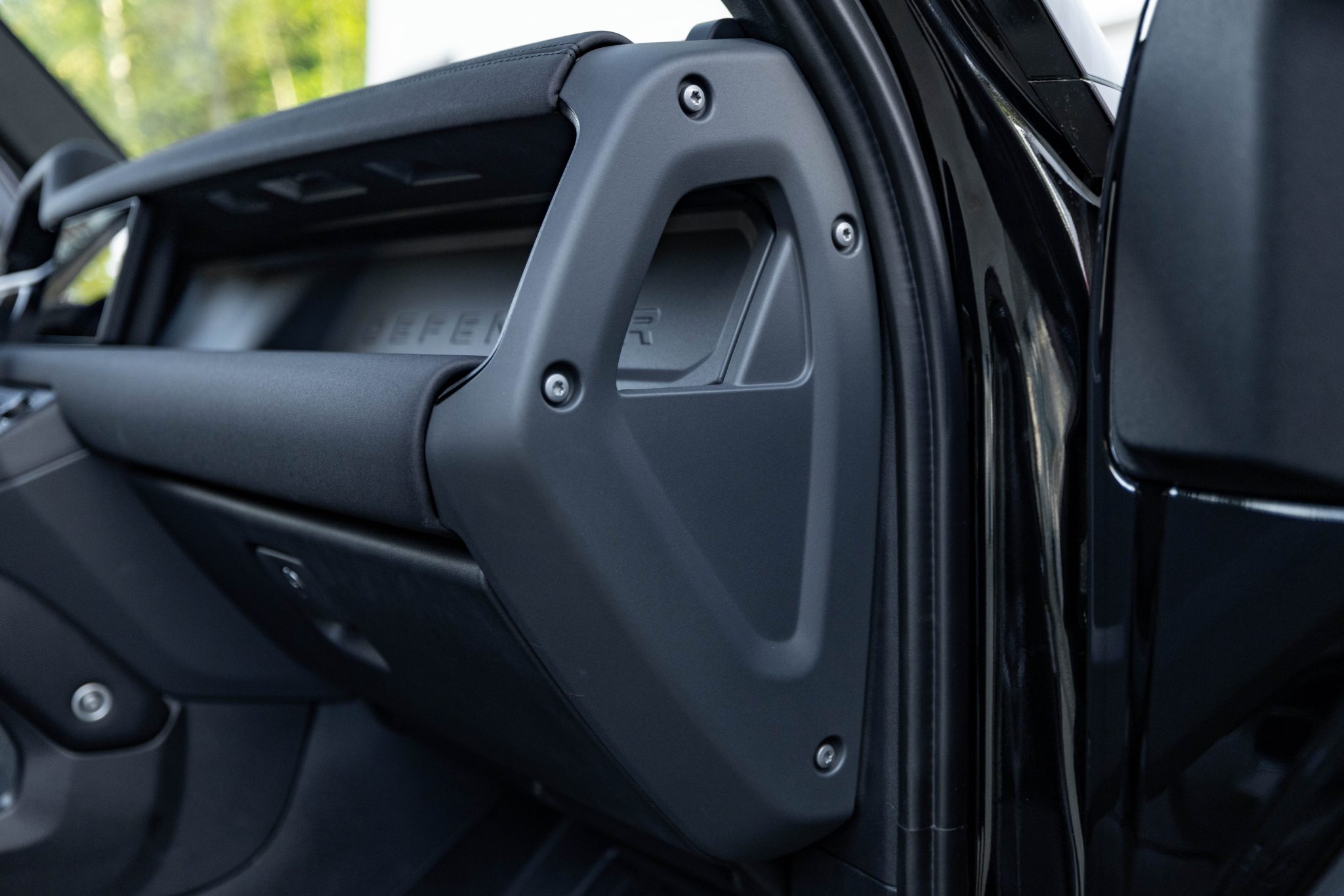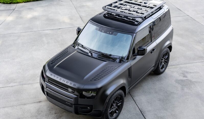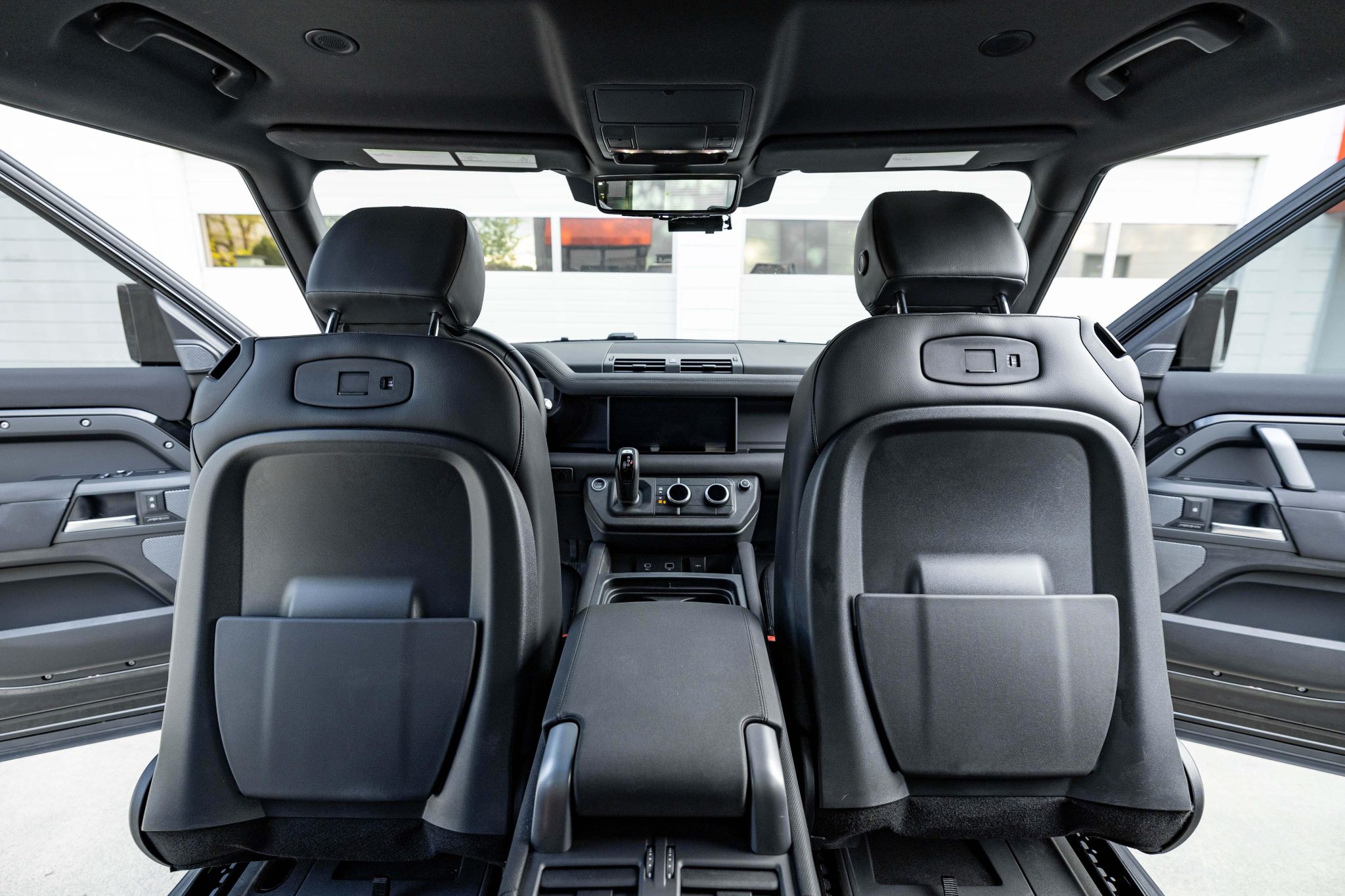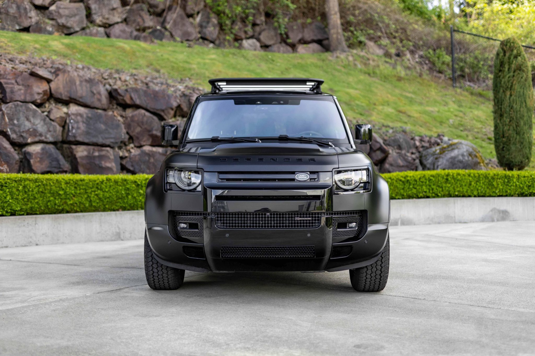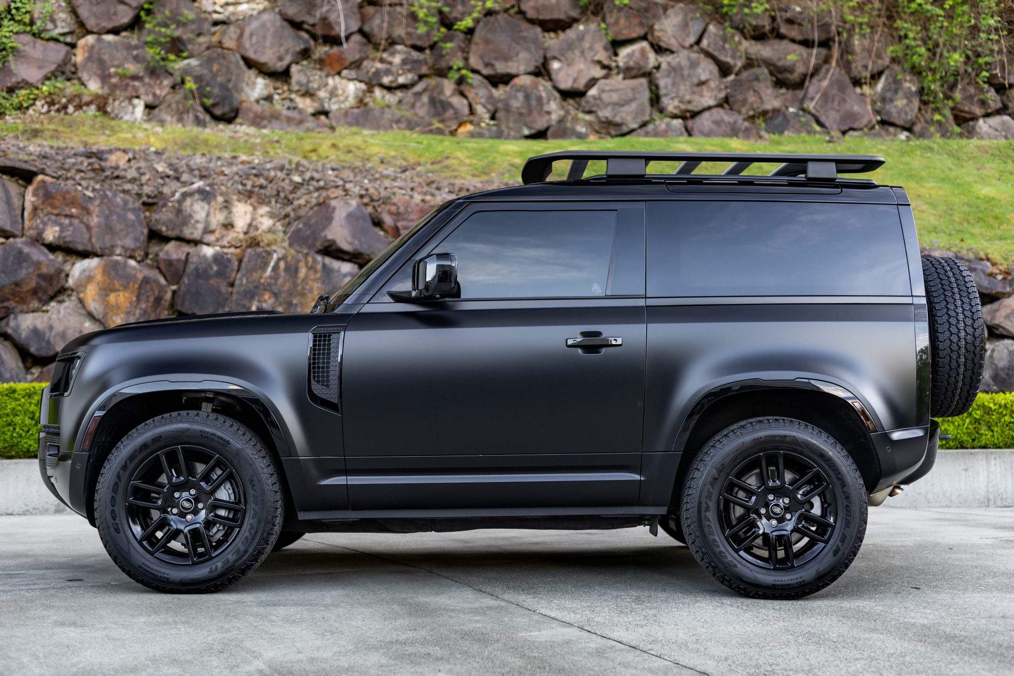 This 2022 Land Rover Defender 90 X-Dynamic S is a black-on-black example powered by a turbocharged and supercharged 3.0L inline-six linked to an eight-speed automatic transmission, a dual-range transfer case, and a 48-volt mild hybrid system. Equipment includes the Cold Climate, Air Suspension, and Extended Black Exterior packages, 19″ wheels, LED headlights, a roof rack, a 3D surround camera system, dual-zone climate control, heated front seats, a Meridian Sound System, PIVI Pro infotainment with navigation, and BlackVue front and rear-facing cameras.