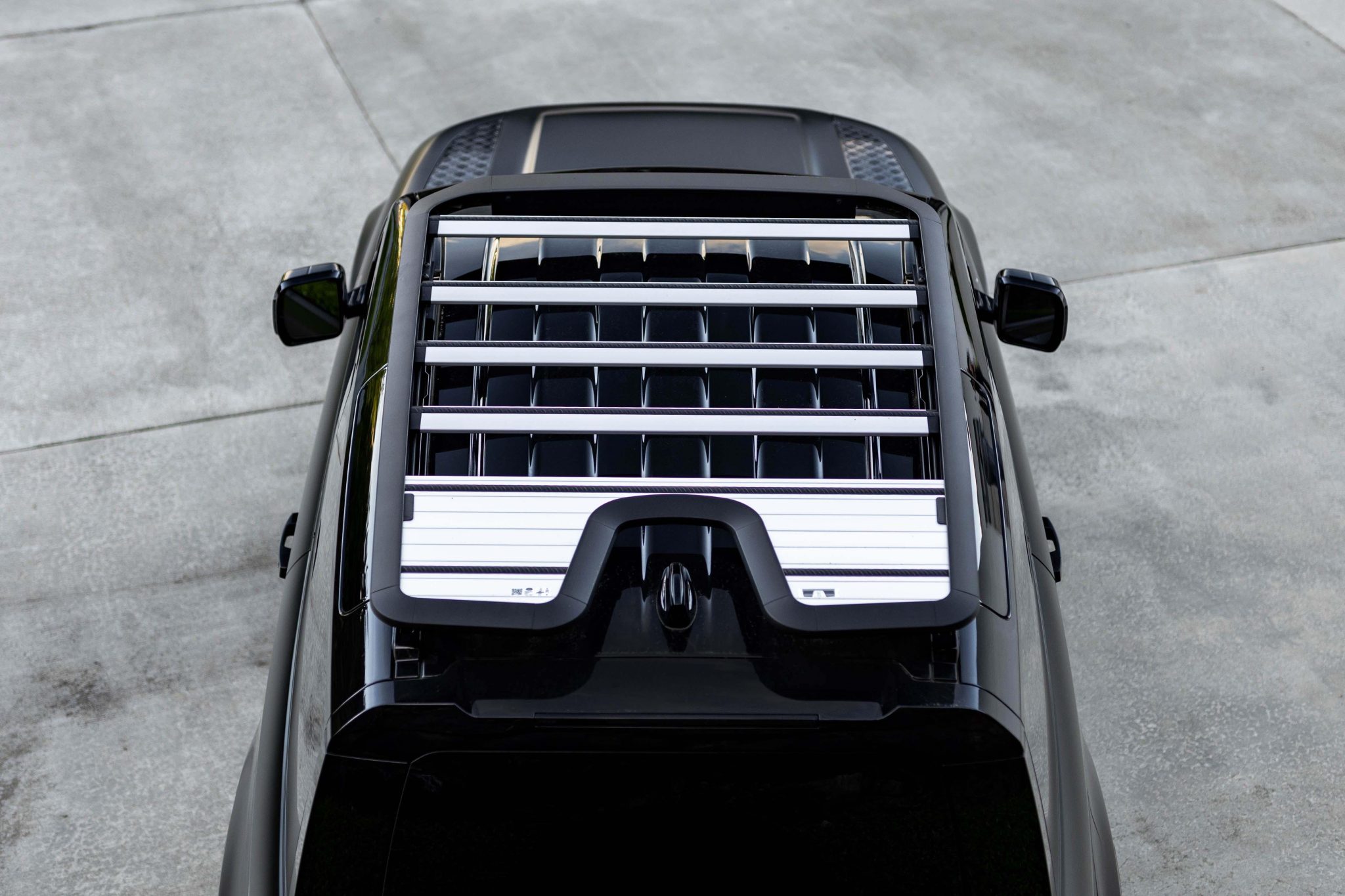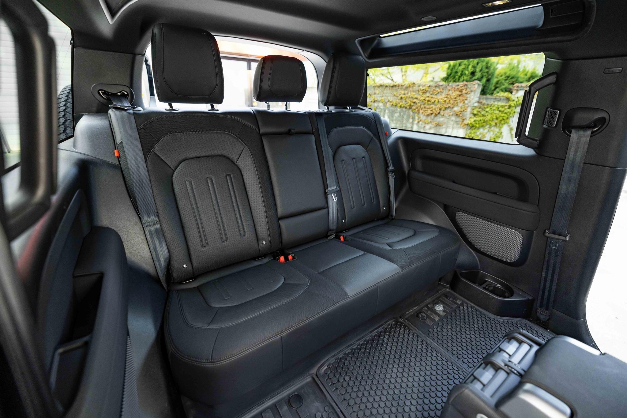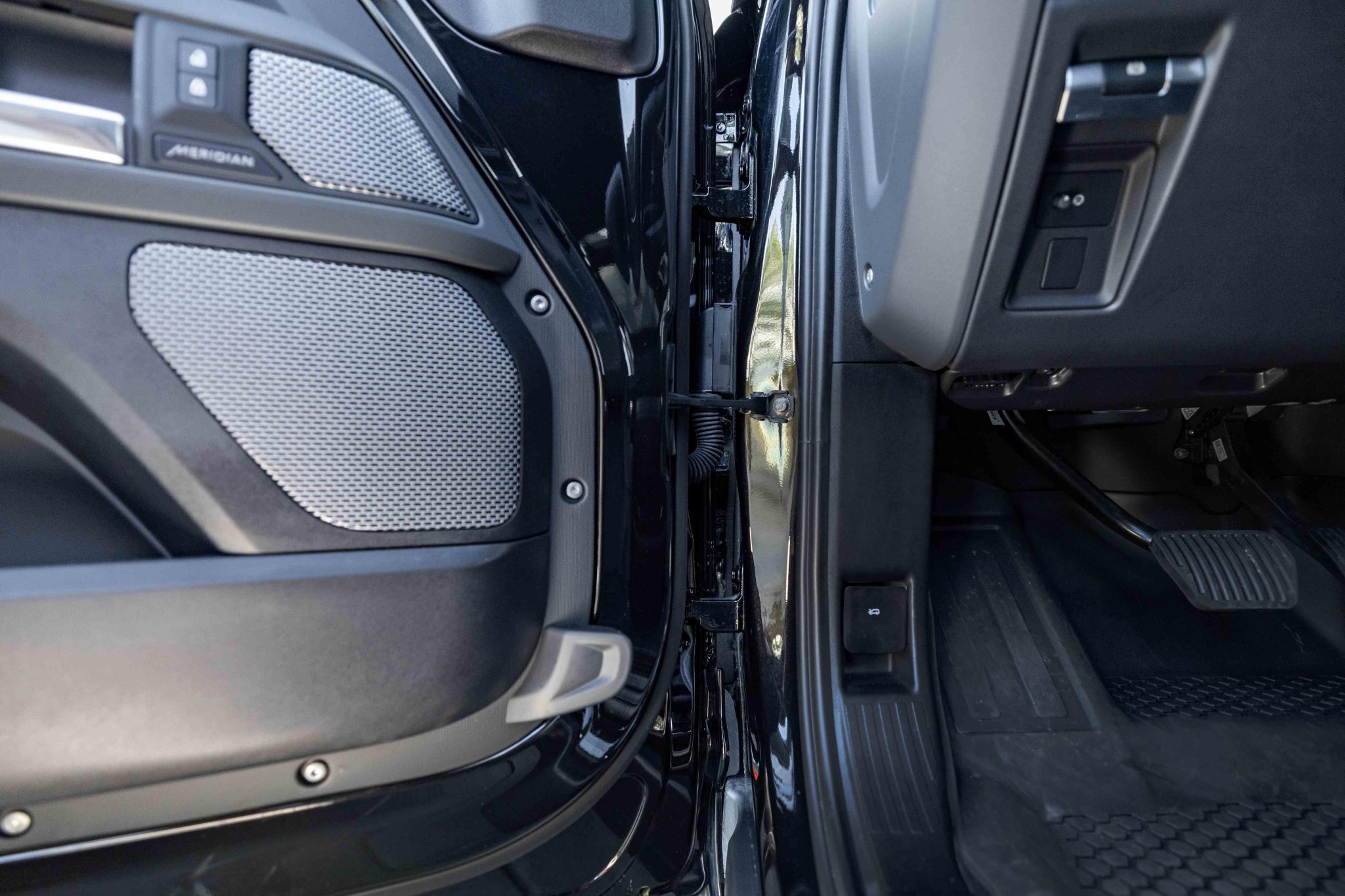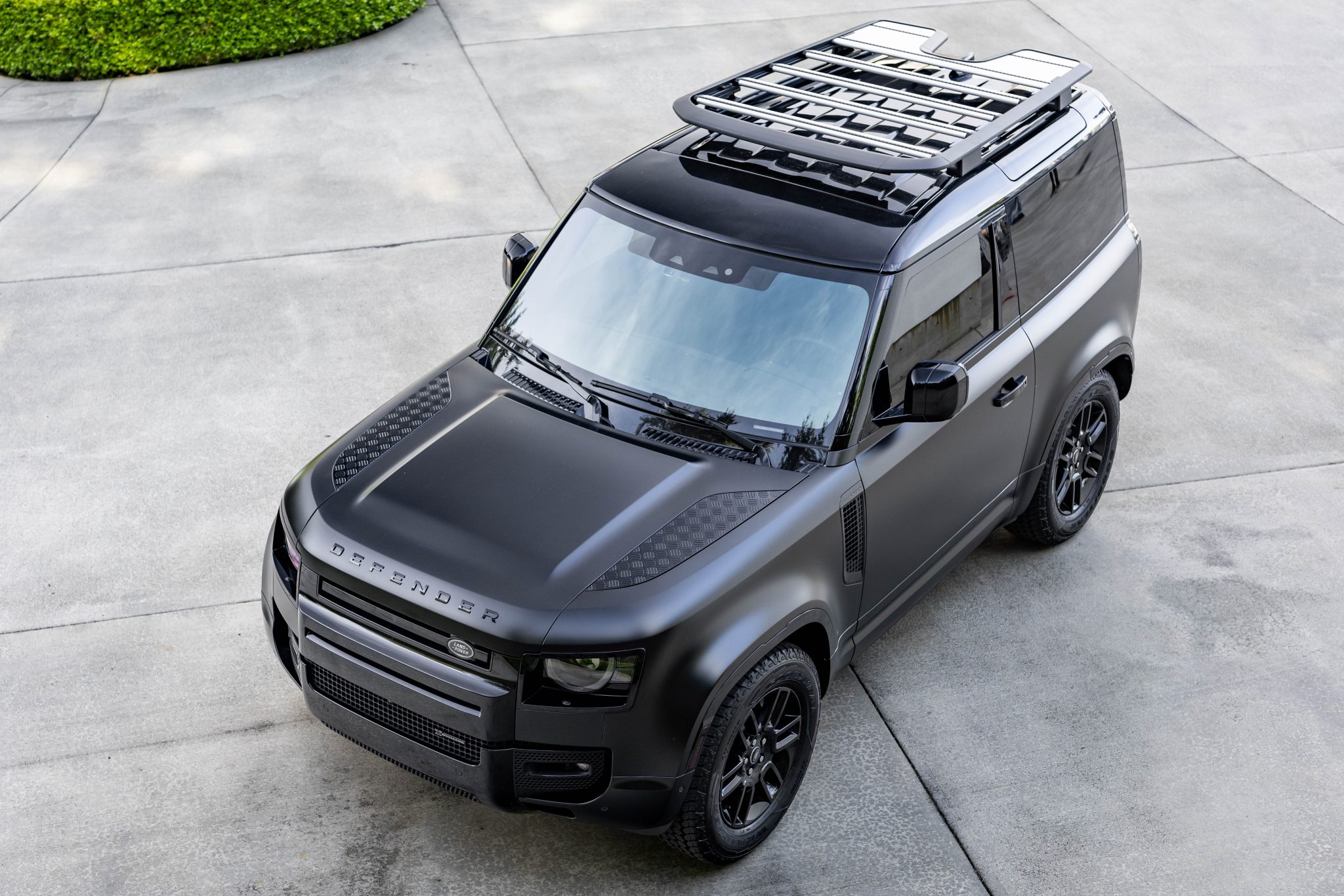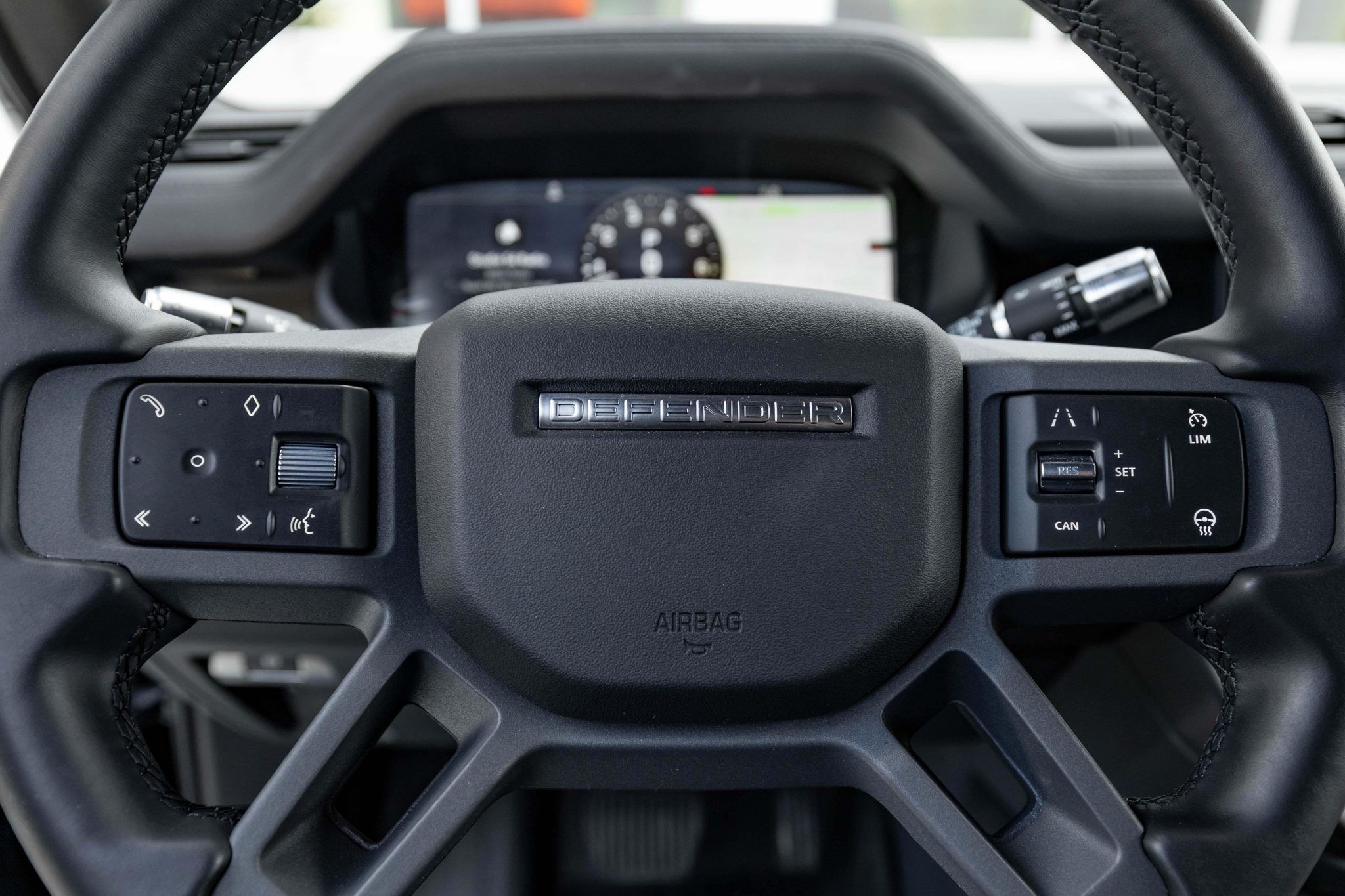 This 2022 Land Rover Defender 90 X-Dynamic S is a black-on-black example powered by a turbocharged and supercharged 3.0L inline-six linked to an eight-speed automatic transmission, a dual-range transfer case, and a 48-volt mild hybrid system. Equipment includes the Cold Climate, Air Suspension, and Extended Black Exterior packages, 19″ wheels, LED headlights, a roof rack, a 3D surround camera system, dual-zone climate control, heated front seats, a Meridian Sound System, PIVI Pro infotainment with navigation, and BlackVue front and rear-facing cameras.