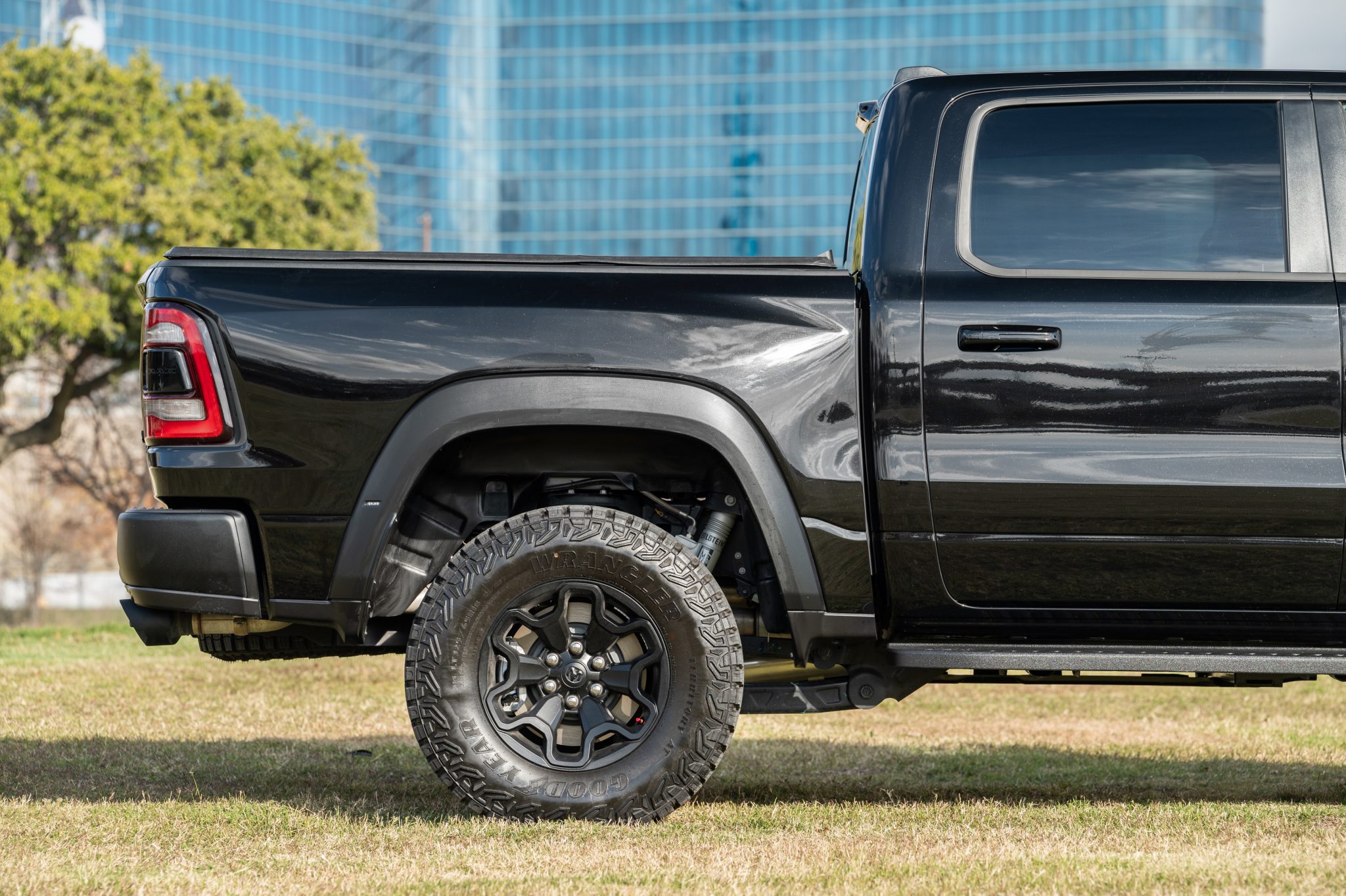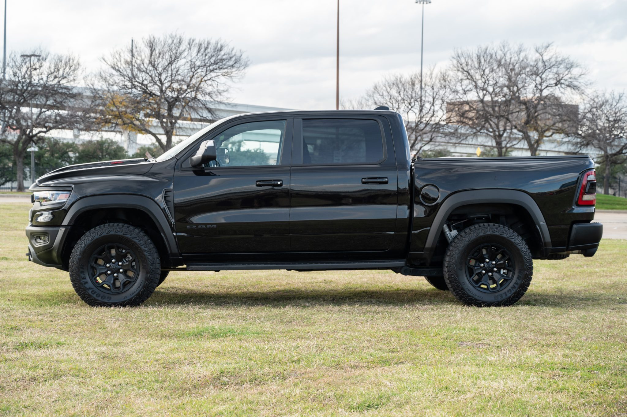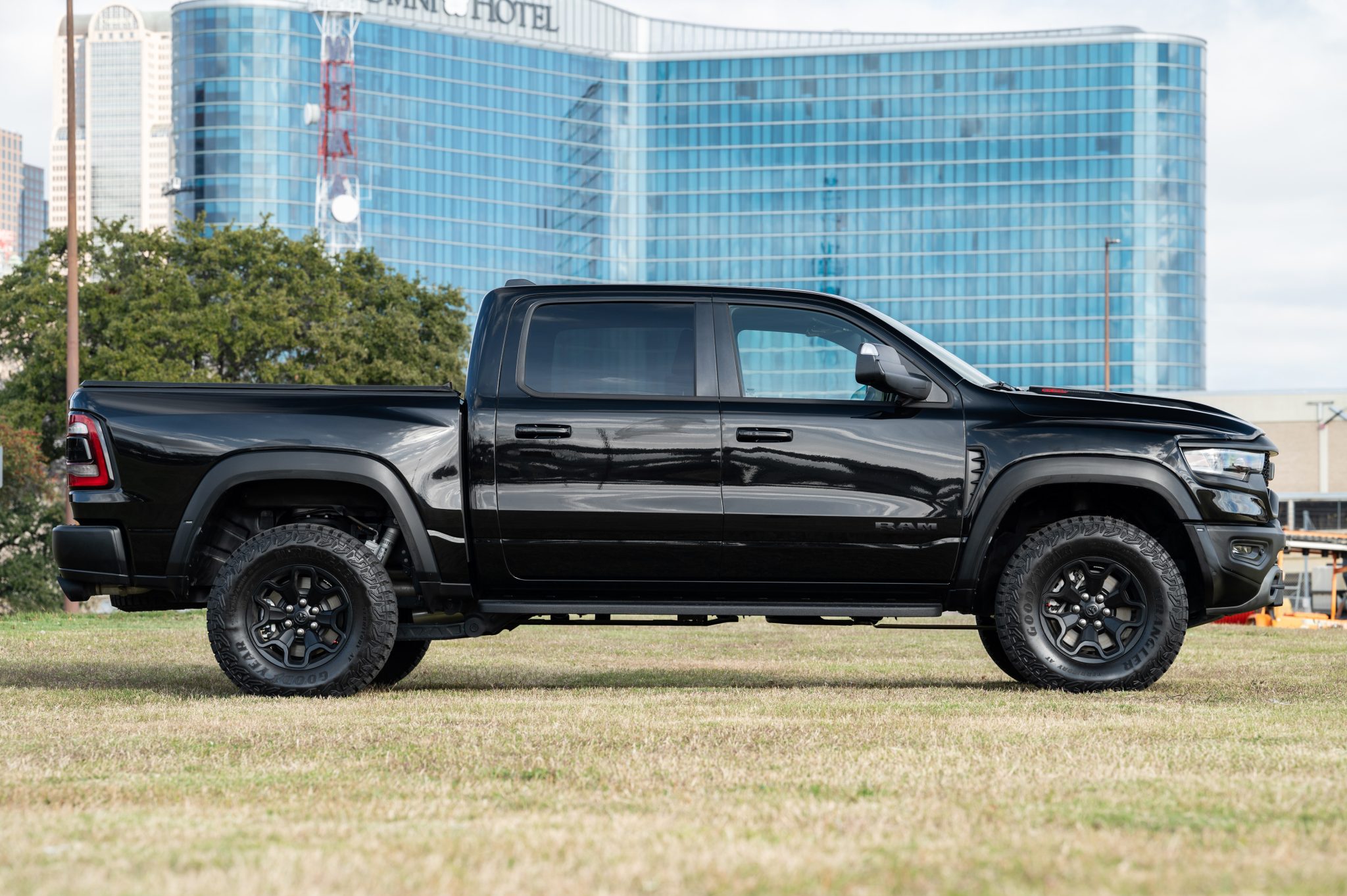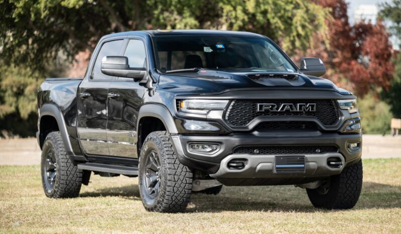 This 2022 Ram 1500 TRX Crew Cab  is powered by a supercharged 6.2-liter Hemi V8 that sends a factory-rated 702 horsepower to all four wheels via an eight-speed automatic transmission, a two-speed transfer case, and an electronically locking rear differential. Finished in Diamond Black Crystal Pearl-Coat over black leather upholstery, the truck is further equipped with the Trailer Tow and TRX Level 2 Equipment groups in addition to a dual-pane panoramic sunroof, a tri-fold tonneau cover, power-folding towing mirrors, Mopar off-road-style running boards, 18″ wheels, dual-valve Bilstein shocks, and an engine block heater. This TRX has 4,900 miles