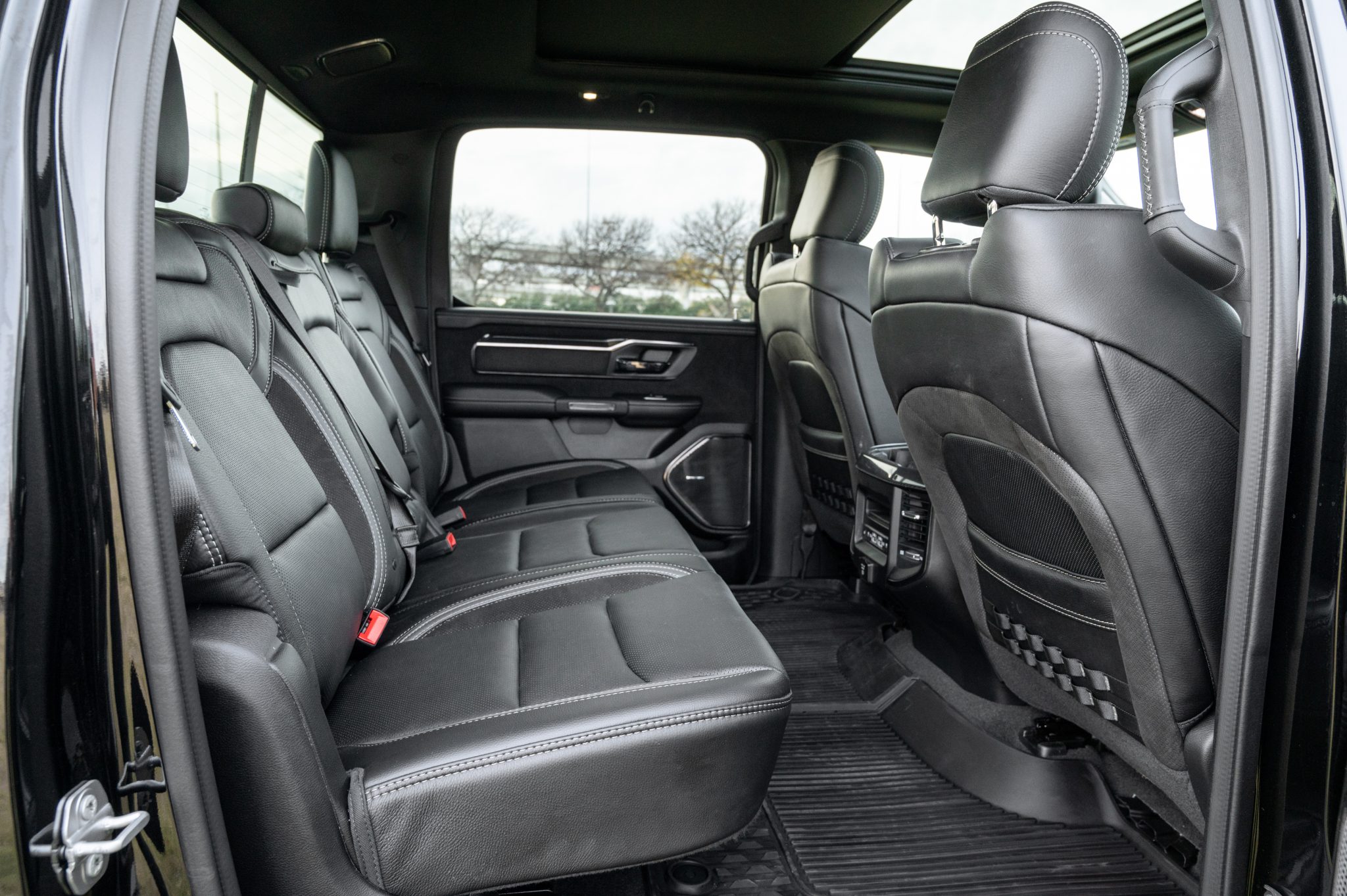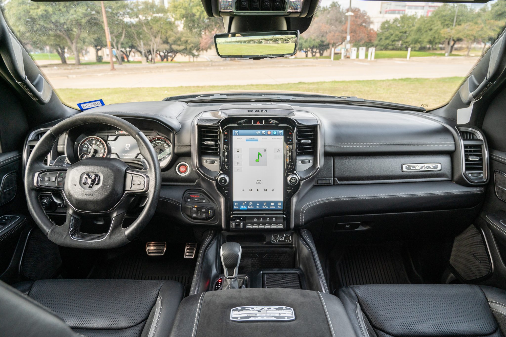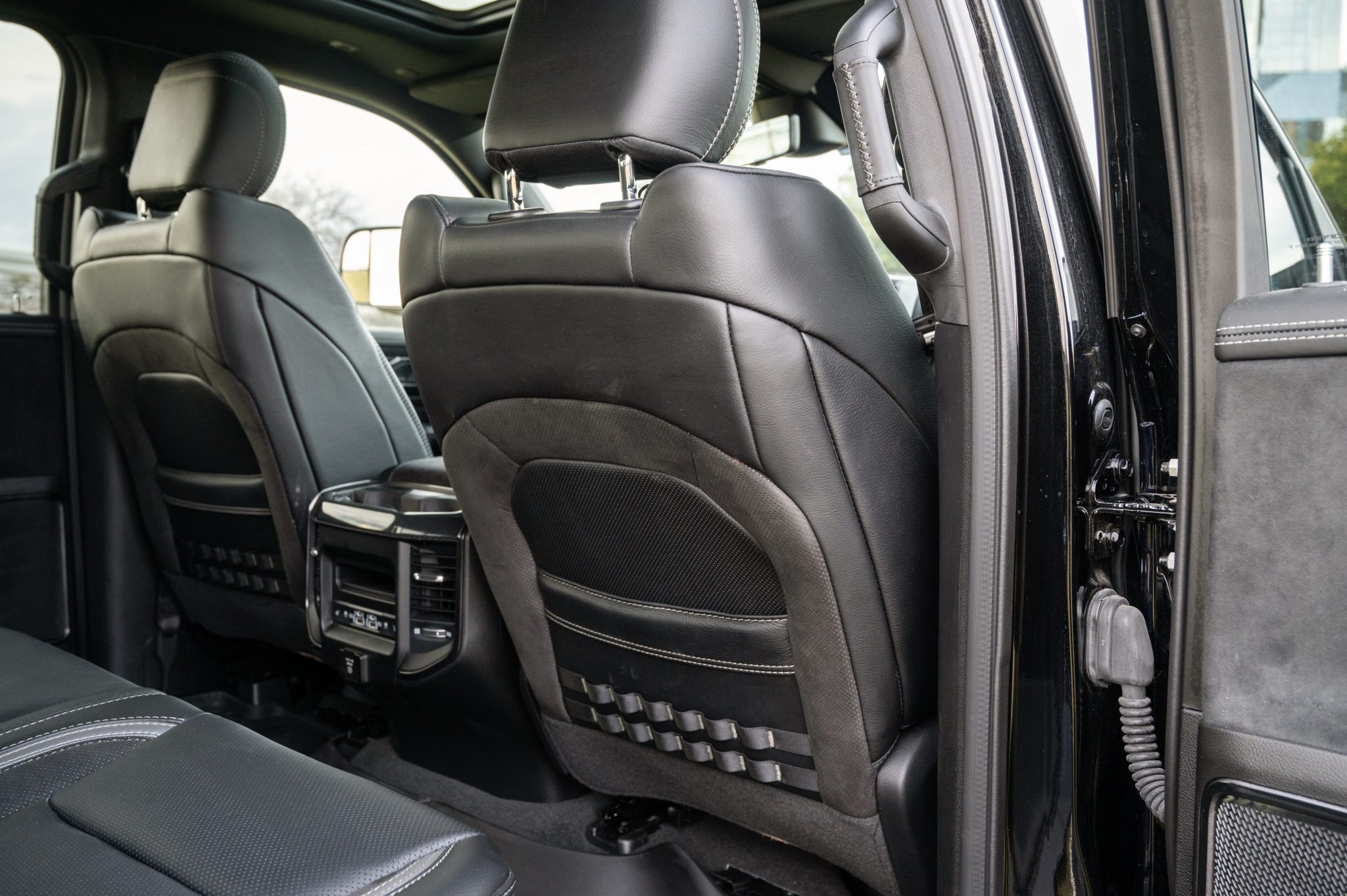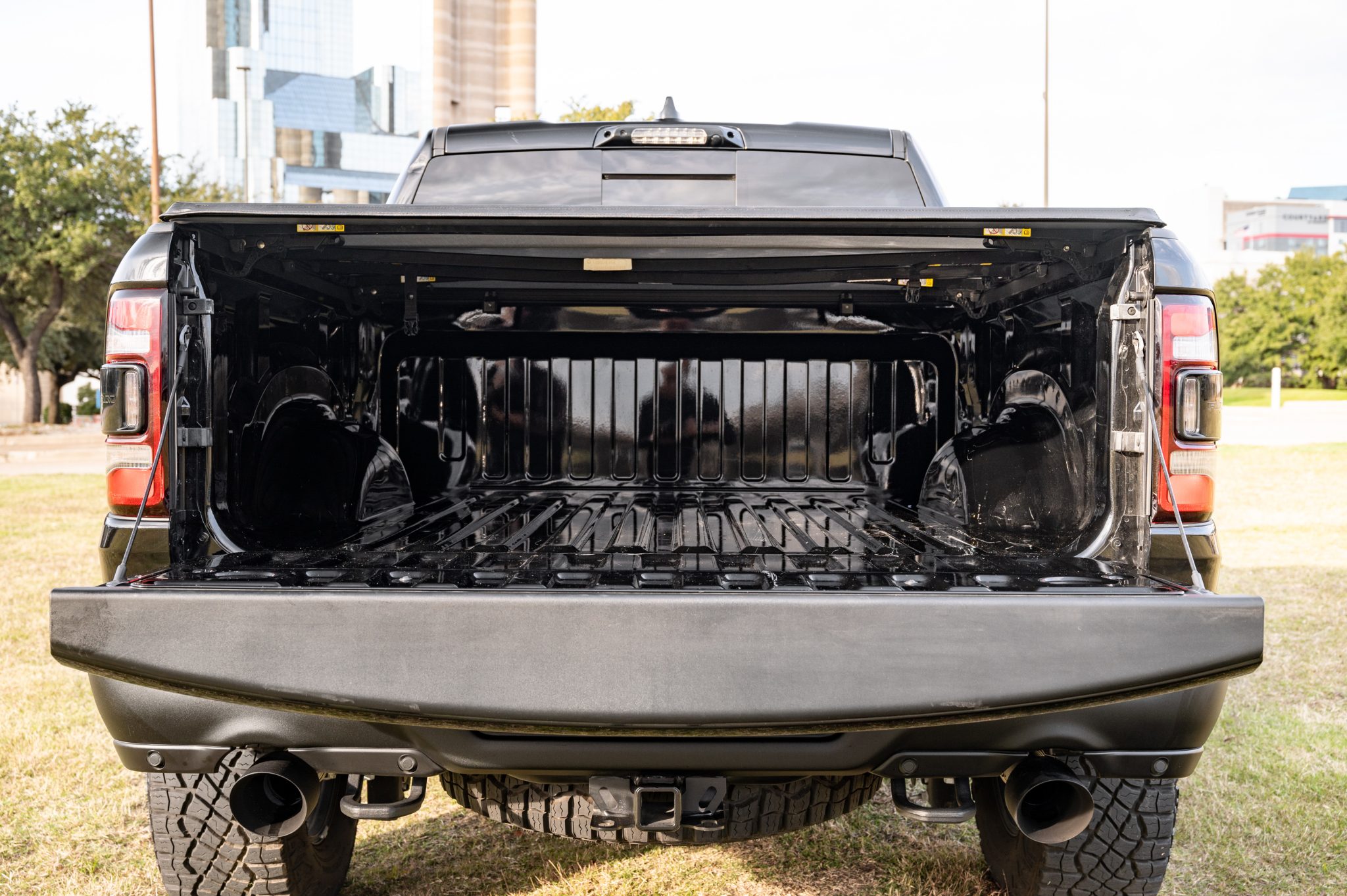 This 2022 Ram 1500 TRX Crew Cab  is powered by a supercharged 6.2-liter Hemi V8 that sends a factory-rated 702 horsepower to all four wheels via an eight-speed automatic transmission, a two-speed transfer case, and an electronically locking rear differential. Finished in Diamond Black Crystal Pearl-Coat over black leather upholstery, the truck is further equipped with the Trailer Tow and TRX Level 2 Equipment groups in addition to a dual-pane panoramic sunroof, a tri-fold tonneau cover, power-folding towing mirrors, Mopar off-road-style running boards, 18″ wheels, dual-valve Bilstein shocks, and an engine block heater. This TRX has 4,900 miles
